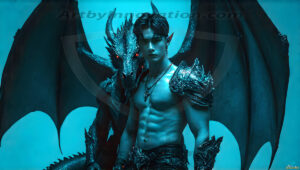 ByjeffAI-generated hot male demons with dark wings and glowing eyes — handsome, dangerous, and seductive from the ruins of hell.
