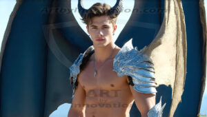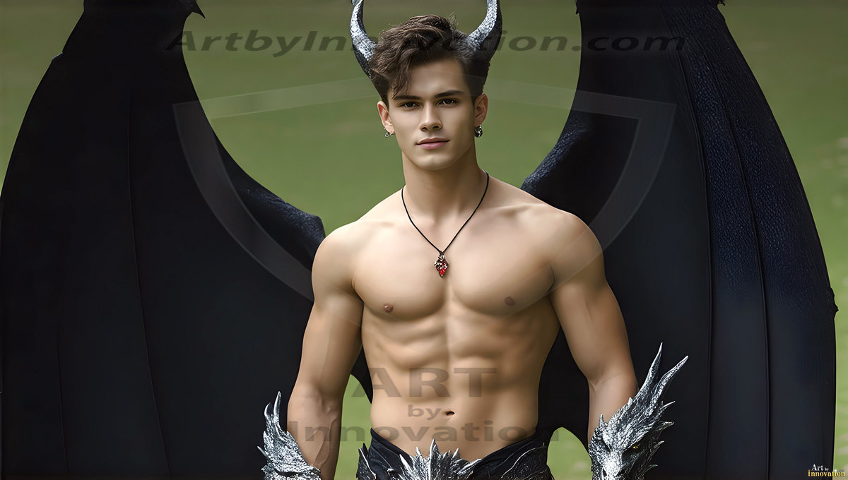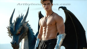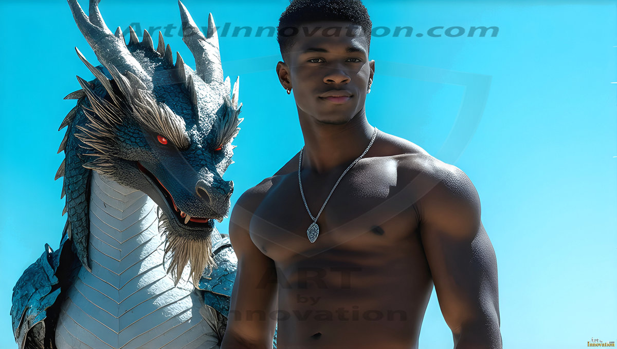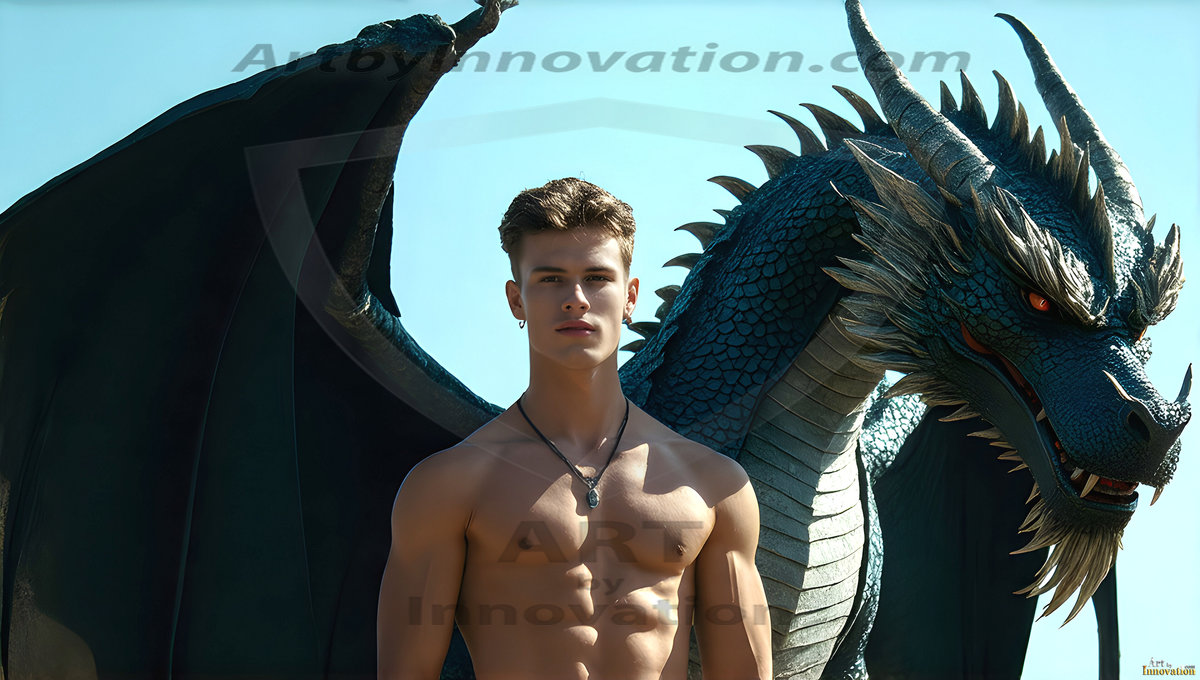 Standing before you is a prince and his dragon. This AI-generated collection features handsome, shirtless young princes with muscular physiques alongside their magnificent dragons — from the obsidian-scaled Bahamut with silver wings, to golden dragons sleeping in ancient caves. Each image blends the beauty of the male form with the raw majesty of dragonkind, set against breathtaking fantasy backdrops. Created using Flux.1, ComfyUI, Stable Diffusion, and refined with Adobe Photoshop by © Jeff Dupler | Art by Innovation | https://www.artbyinnovation.com