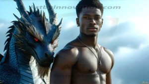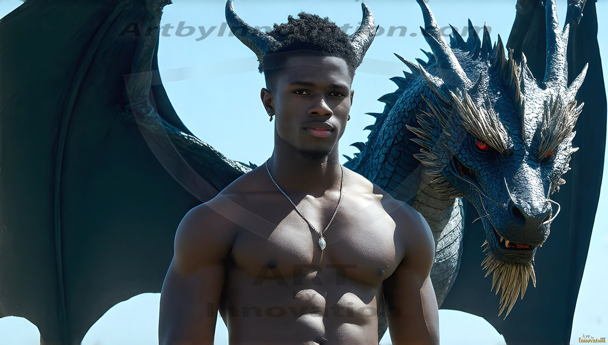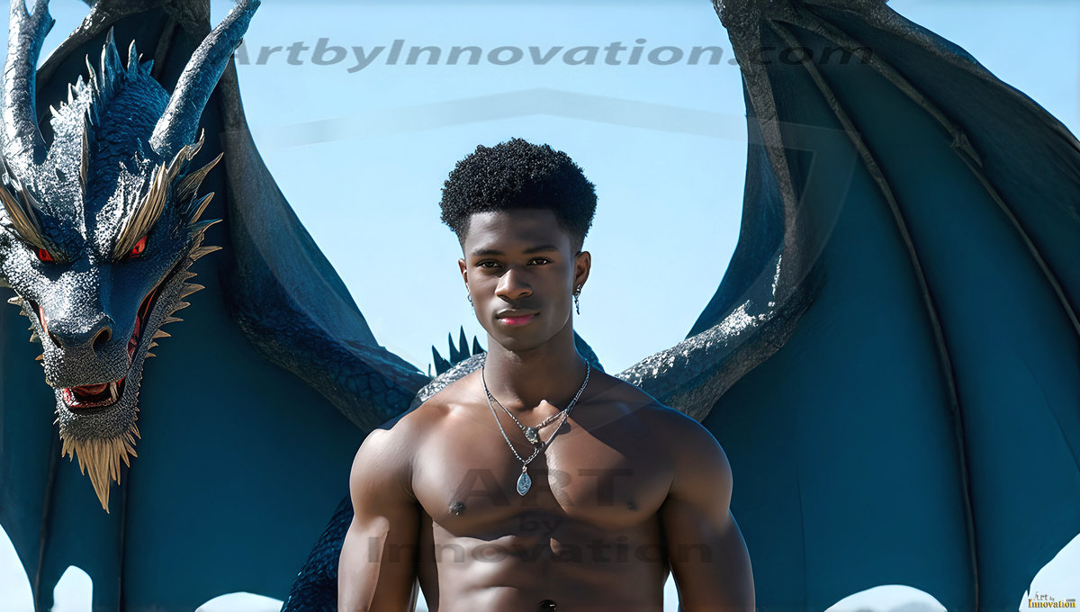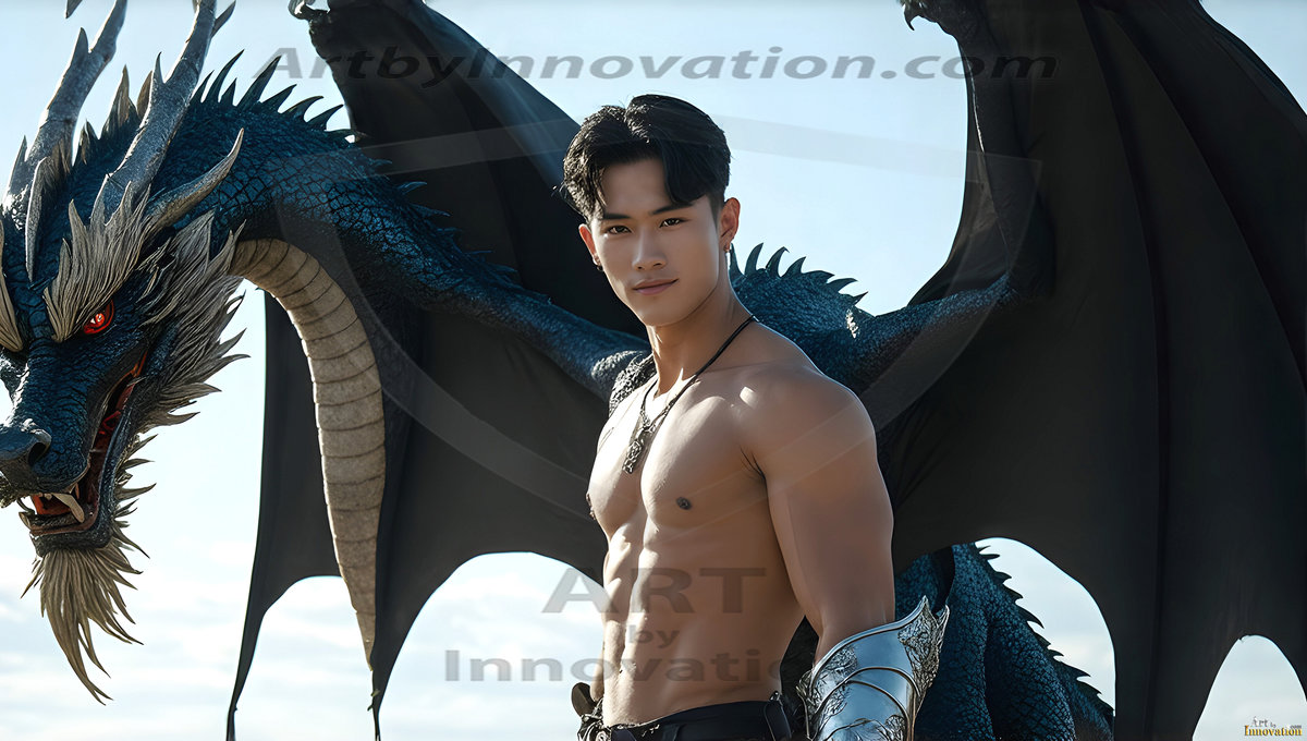 Standing before you is a prince and his dragon. This AI-generated collection features handsome, shirtless young princes with muscular physiques alongside their magnificent dragons — from the obsidian-scaled Bahamut with silver wings, to golden dragons sleeping in ancient caves. Each image blends the beauty of the male form with the raw majesty of dragonkind, set against breathtaking fantasy backdrops. Created using Flux.1, ComfyUI, Stable Diffusion, and refined with Adobe Photoshop by © Jeff Dupler | Art by Innovation | https://www.artbyinnovation.com