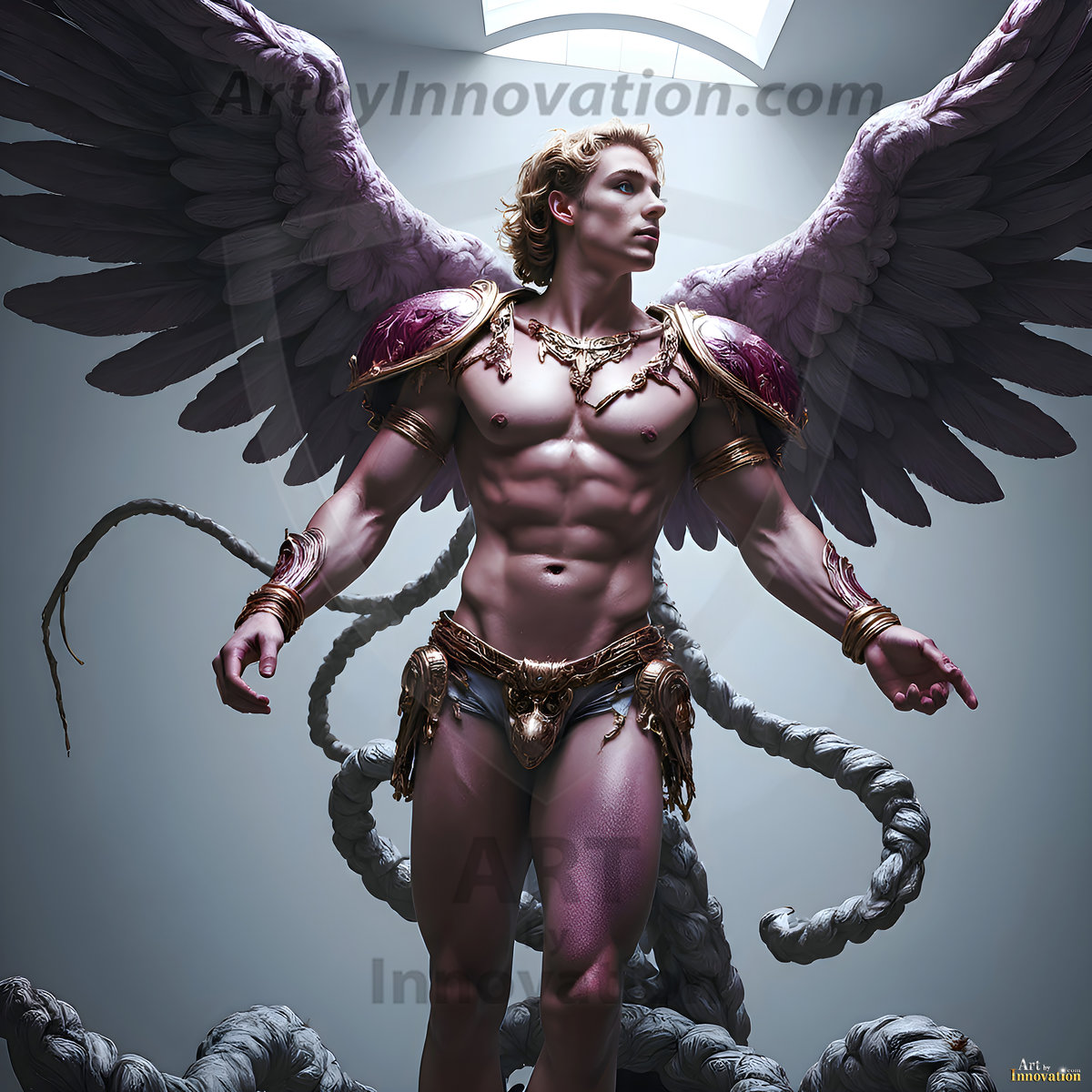 Standing before you is a prince and his dragon. This AI-generated collection features handsome, shirtless young princes with muscular physiques alongside their magnificent dragons — from the obsidian-scaled Bahamut with silver wings, to golden dragons sleeping in ancient caves. Each image blends the beauty of the male form with the raw majesty of dragonkind, set…