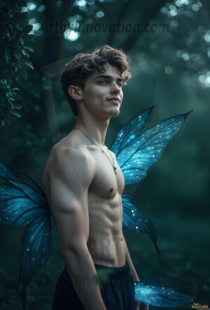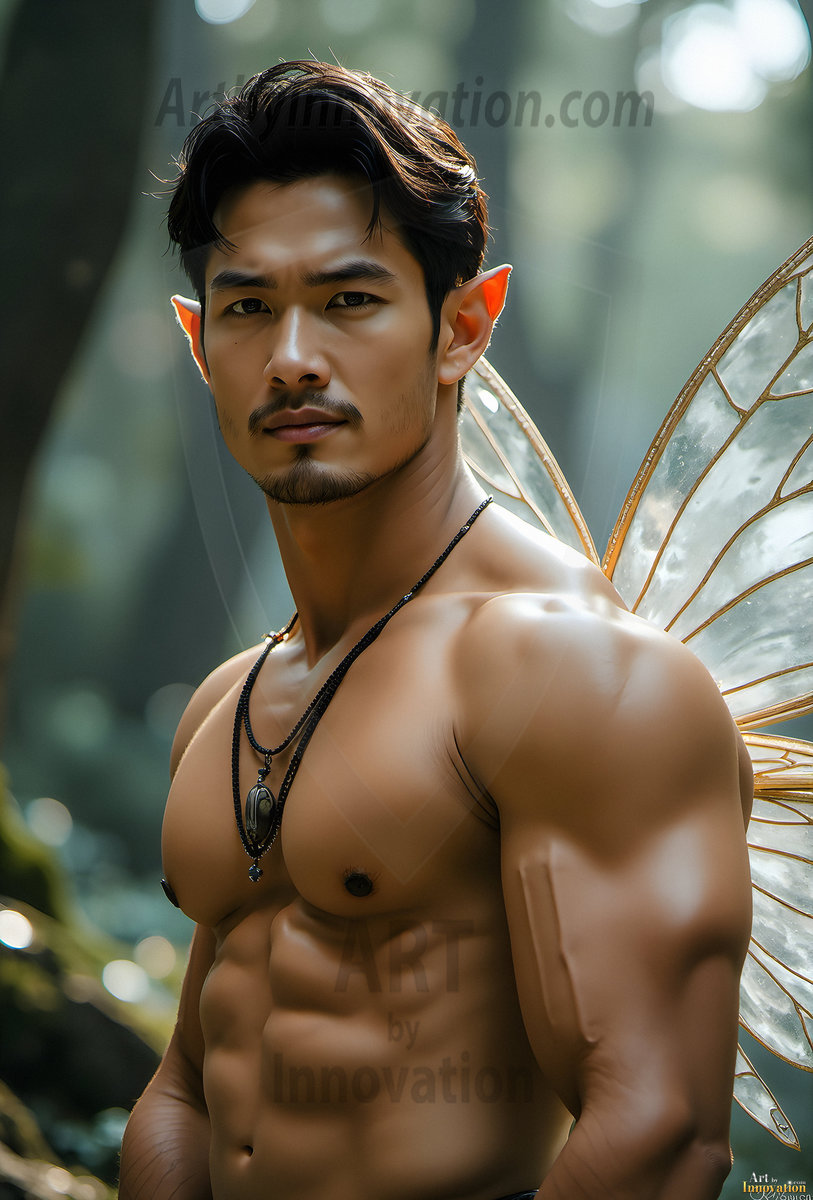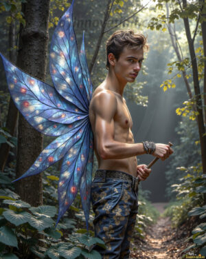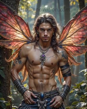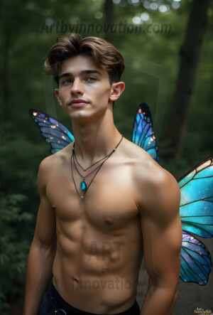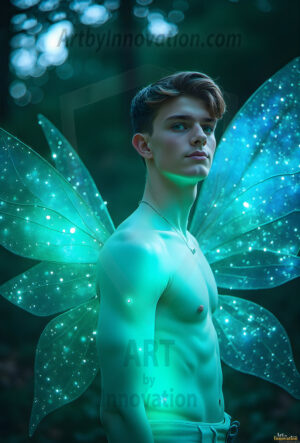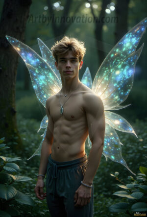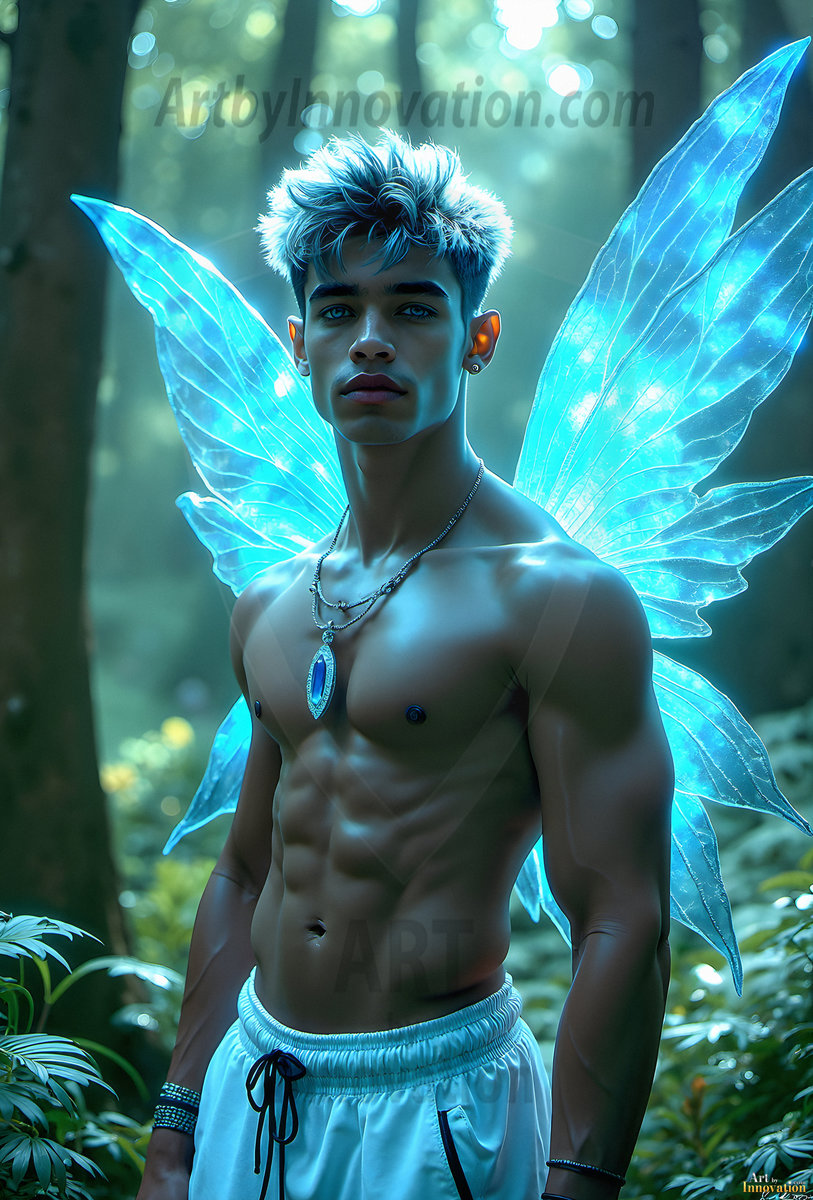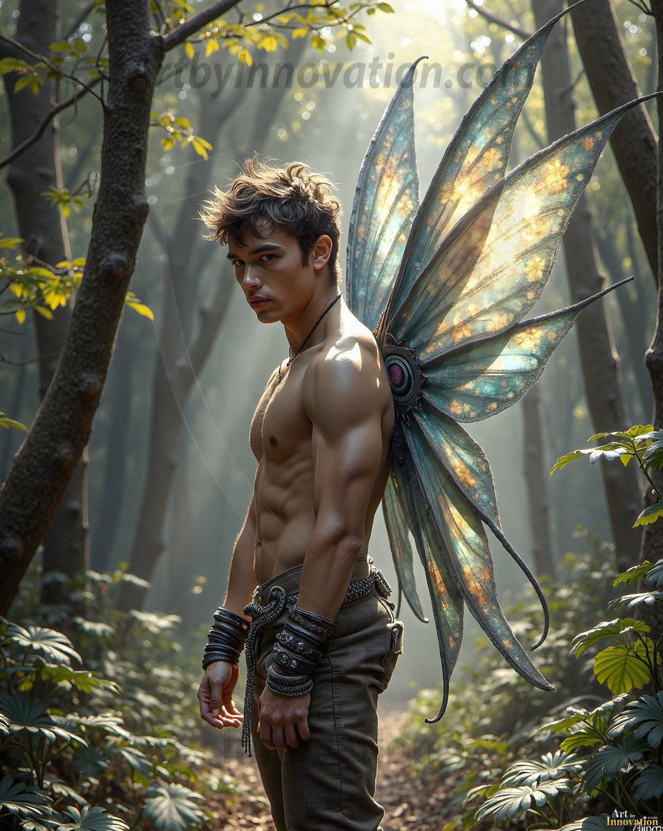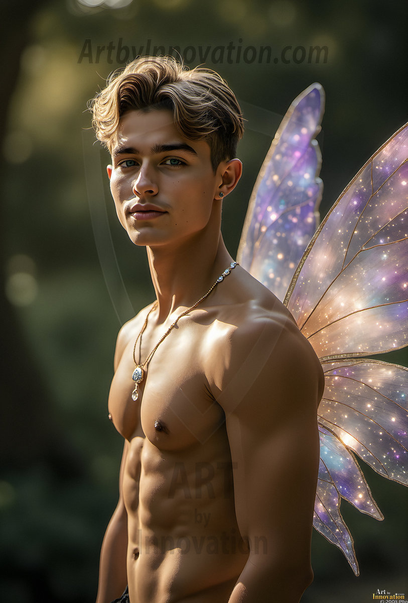 Capturing the pristine and elusive male fairy — brought to life through the power of AI. Imagine a realm where handsome young men possess enormous shimmering crystal wings, vibrant and radiant, capturing and reflecting the light of the environment in a mesmerizing way. Set in mysterious enchanted forests, each fairy exudes an otherworldly beauty and elegance that blurs the line between fantasy and reality. Created using Flux.1, ComfyUI, and Stable Diffusion by © Jeff Dupler | Art by Innovation | https://www.artbyinnovation.com