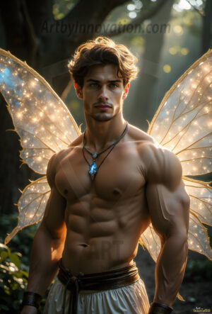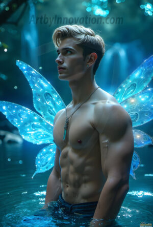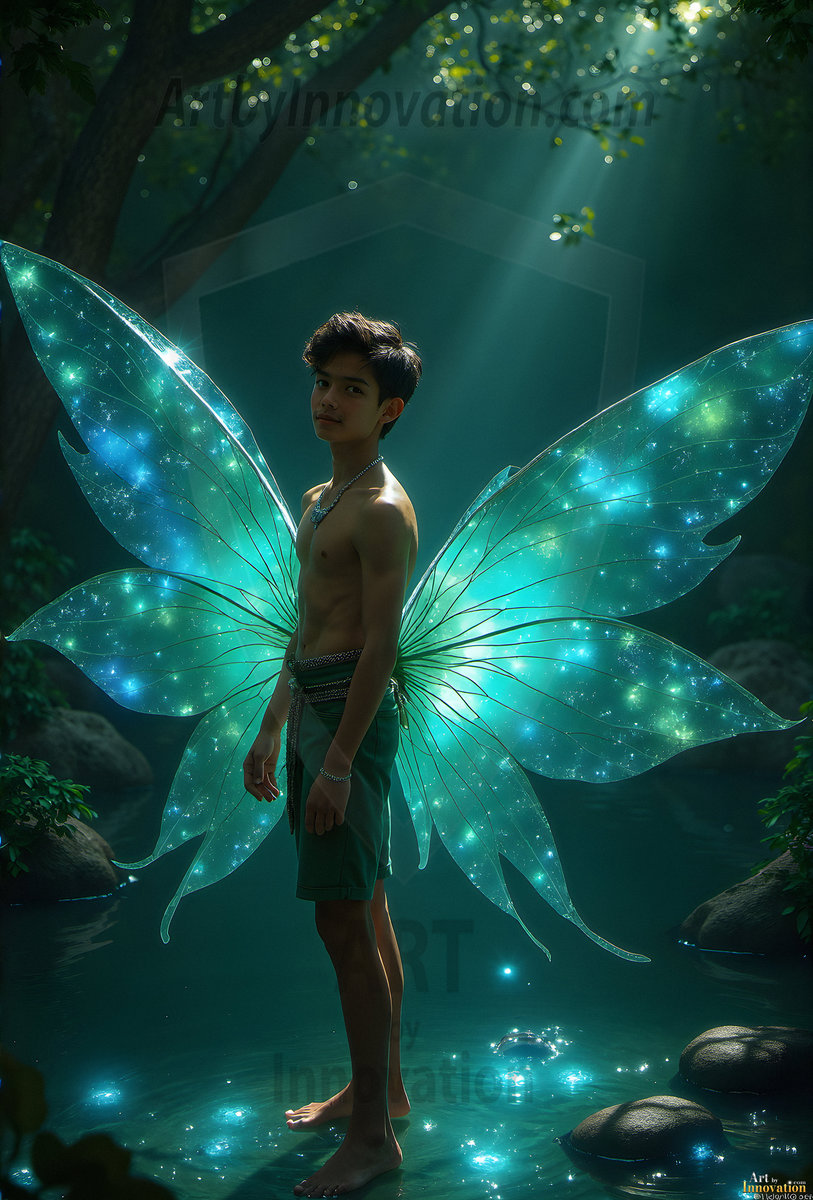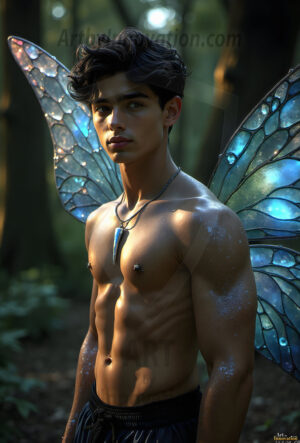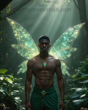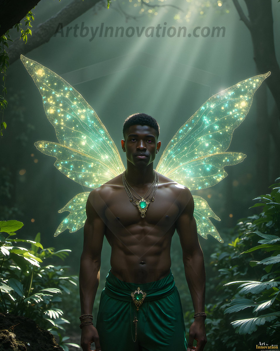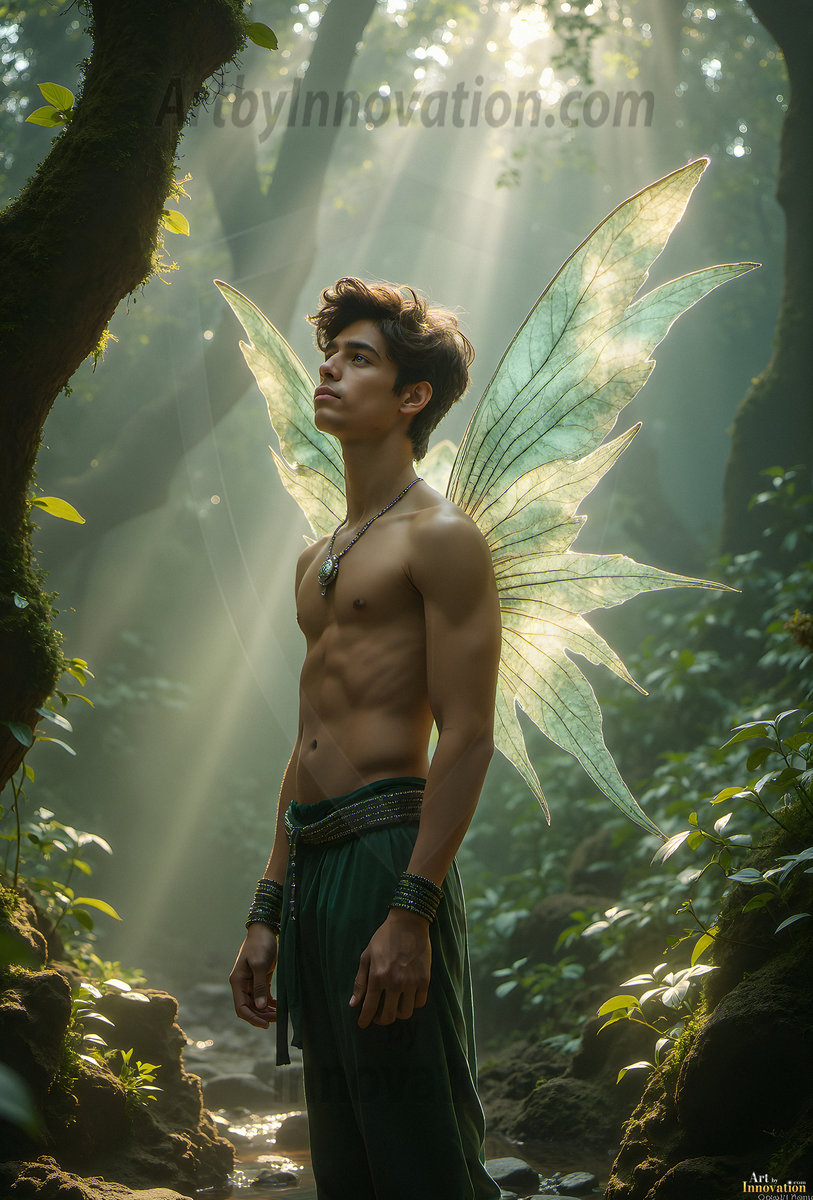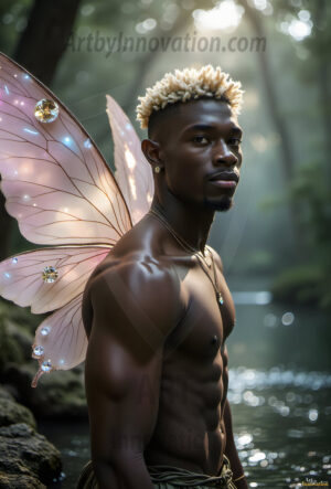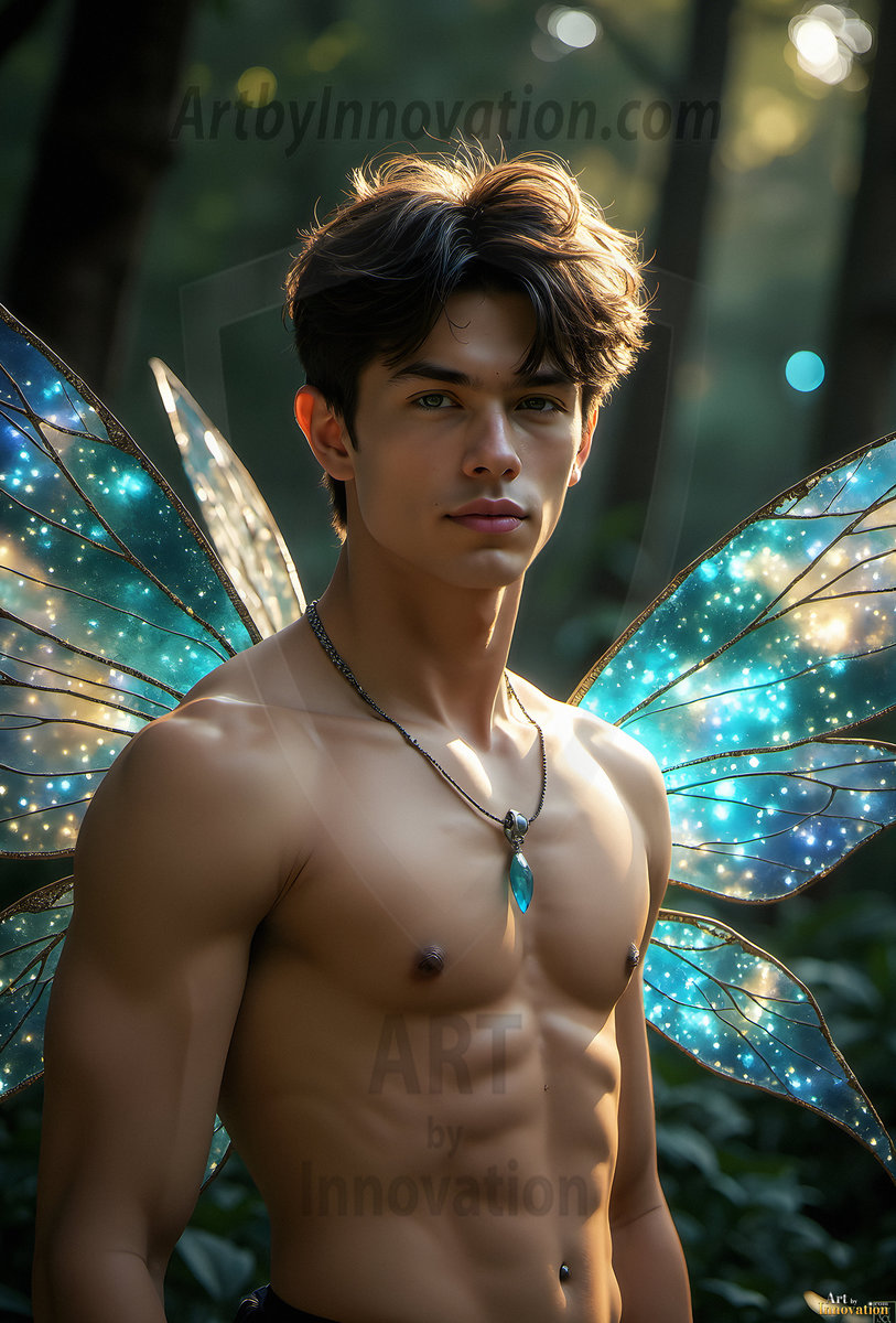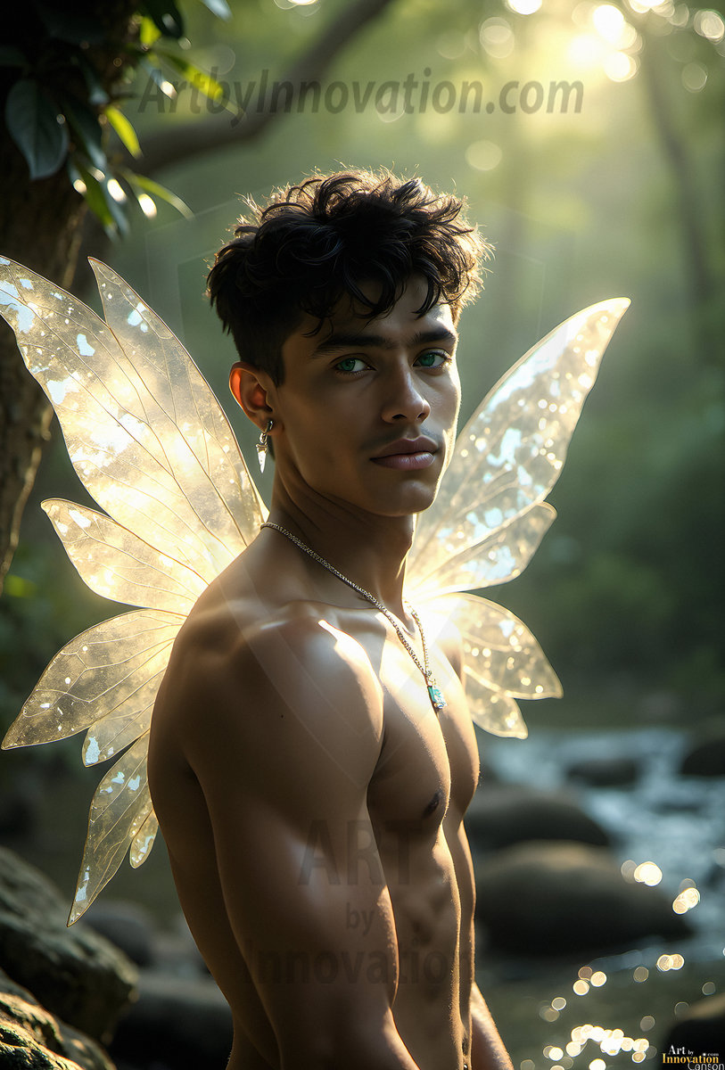 Capturing the pristine and elusive male fairy — brought to life through the power of AI. Imagine a realm where handsome young men possess enormous shimmering crystal wings, vibrant and radiant, capturing and reflecting the light of the environment in a mesmerizing way. Set in mysterious enchanted forests, each fairy exudes an otherworldly beauty and elegance that blurs the line between fantasy and reality. Created using Flux.1, ComfyUI, and Stable Diffusion by © Jeff Dupler | Art by Innovation | https://www.artbyinnovation.com