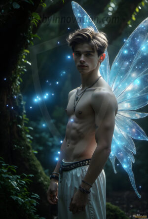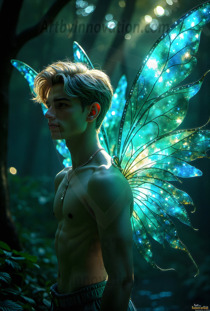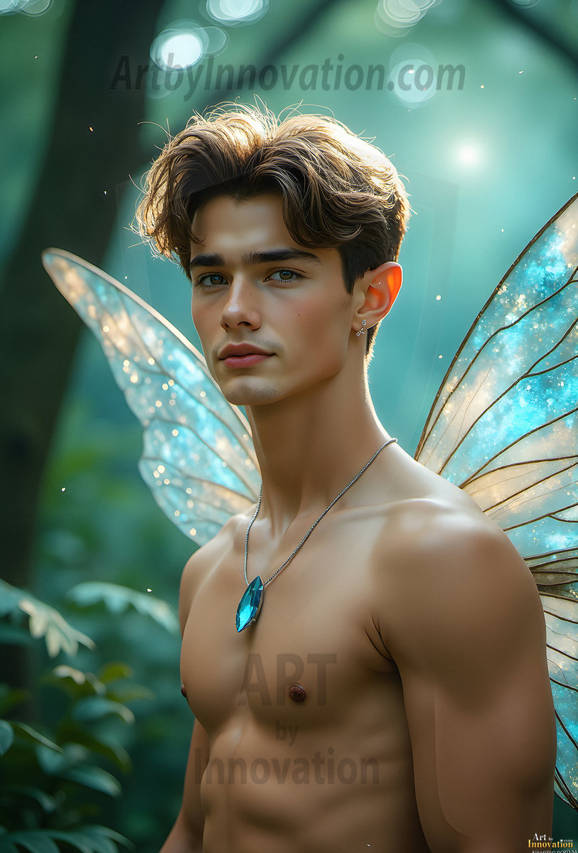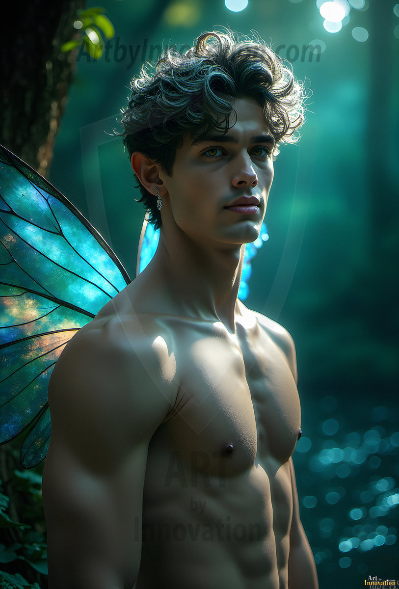 Capturing the pristine and elusive male fairy — brought to life through the power of AI. Imagine a realm where handsome young men possess enormous shimmering crystal wings, vibrant and radiant, capturing and reflecting the light of the environment in a mesmerizing way. Set in mysterious enchanted forests, each fairy exudes an otherworldly beauty and elegance that blurs the line between fantasy and reality. Created using Flux.1, ComfyUI, and Stable Diffusion by © Jeff Dupler | Art by Innovation | https://www.artbyinnovation.com