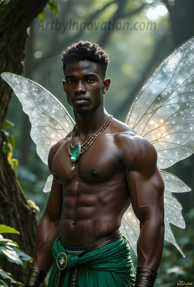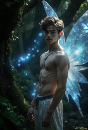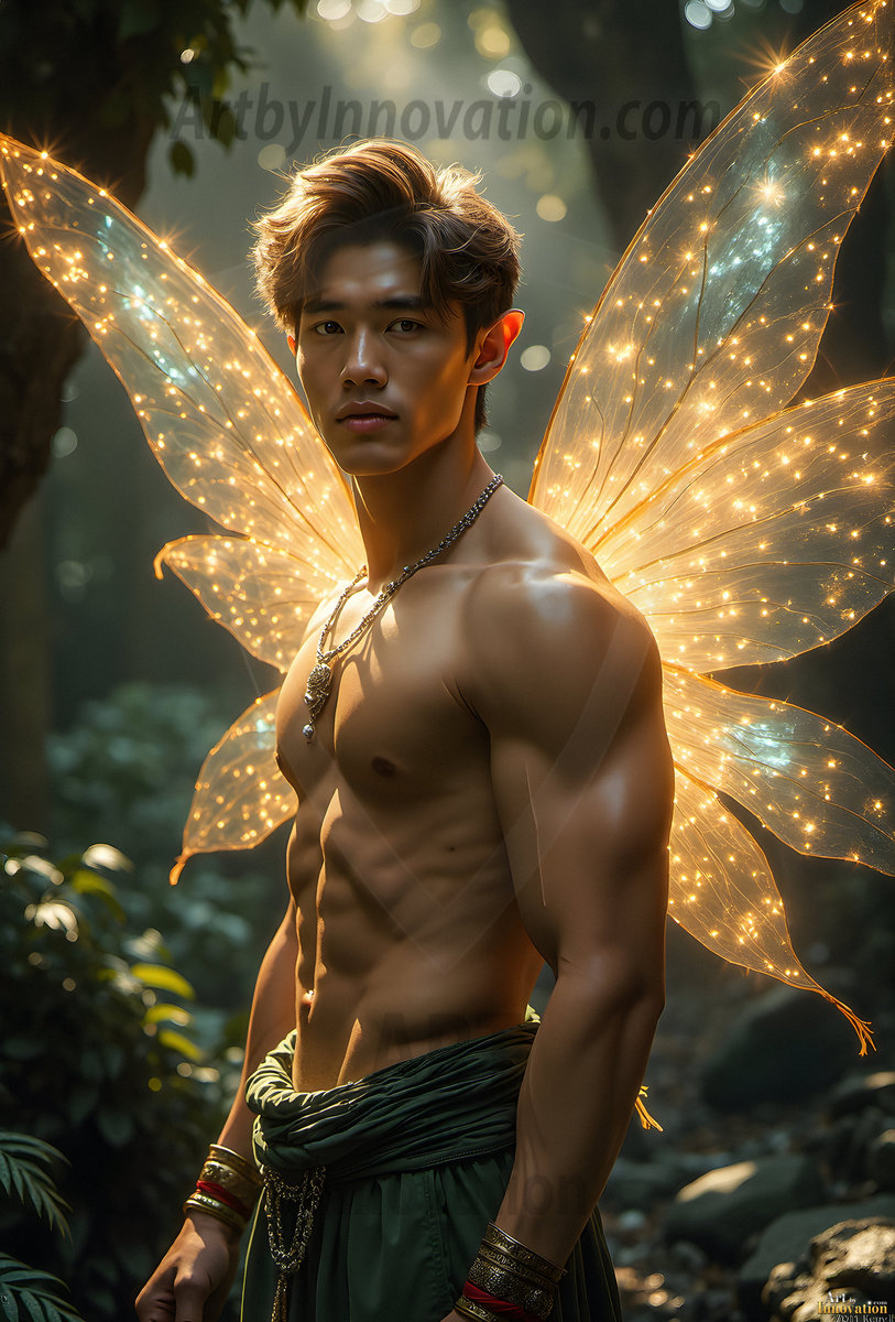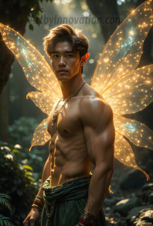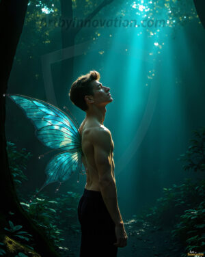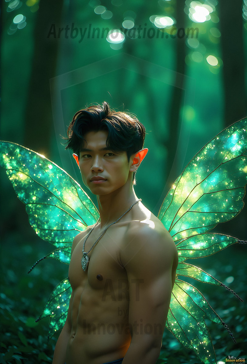 Capturing the pristine and elusive male fairy — brought to life through the power of AI. Imagine a realm where handsome young men possess enormous shimmering crystal wings, vibrant and radiant, capturing and reflecting the light of the environment in a mesmerizing way. Set in mysterious enchanted forests, each fairy exudes an otherworldly beauty and elegance that blurs the line between fantasy and reality. Created using Flux.1, ComfyUI, and Stable Diffusion by © Jeff Dupler | Art by Innovation | https://www.artbyinnovation.com