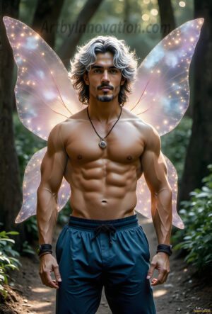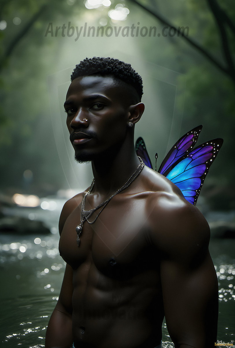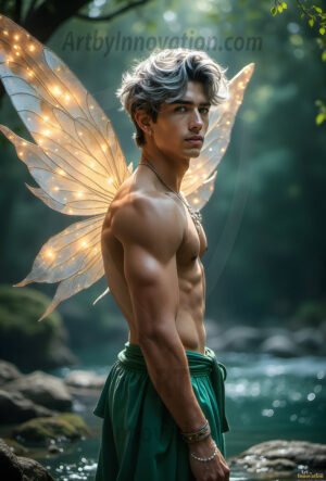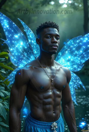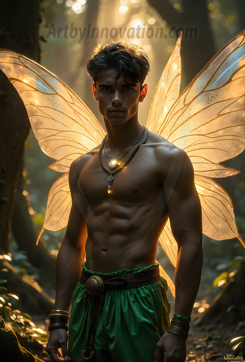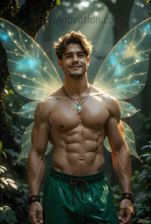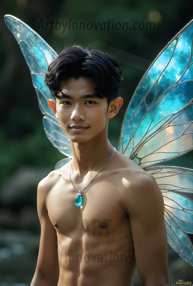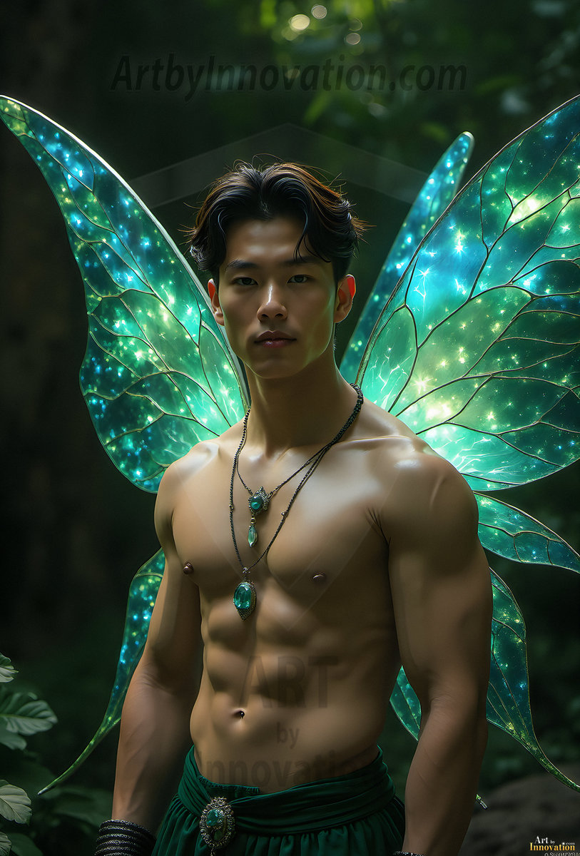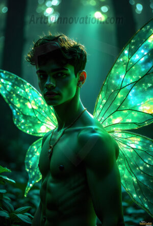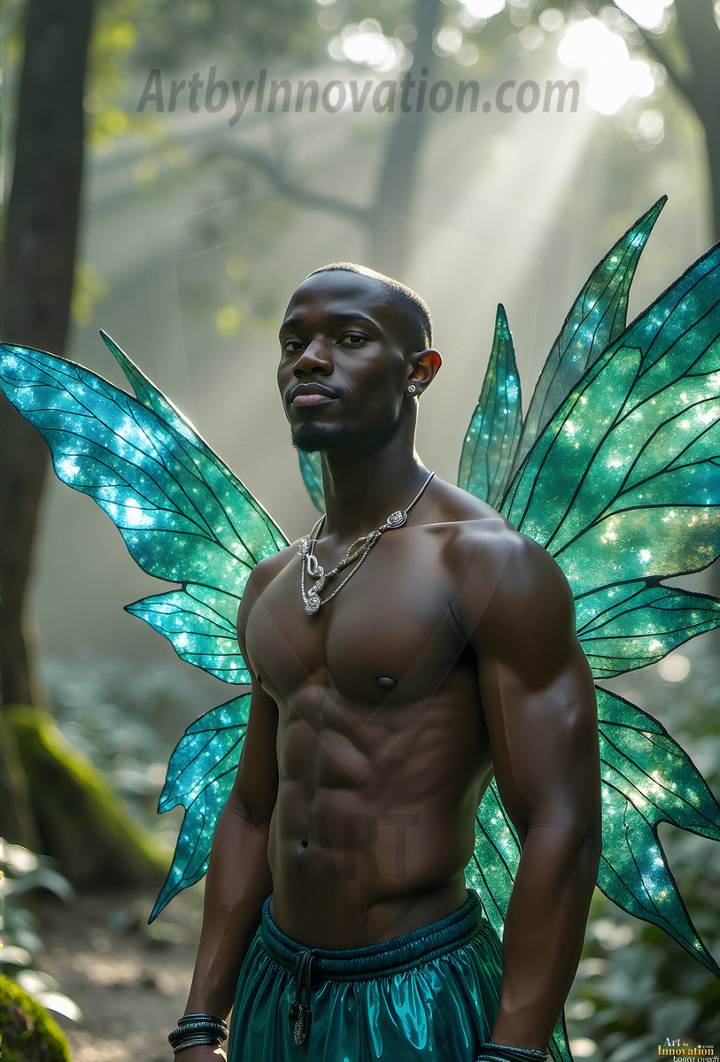 Capturing the pristine and elusive male fairy — brought to life through the power of AI. Imagine a realm where handsome young men possess enormous shimmering crystal wings, vibrant and radiant, capturing and reflecting the light of the environment in a mesmerizing way. Set in mysterious enchanted forests, each fairy exudes an otherworldly beauty and elegance that blurs the line between fantasy and reality. Created using Flux.1, ComfyUI, and Stable Diffusion by © Jeff Dupler | Art by Innovation | https://www.artbyinnovation.com
