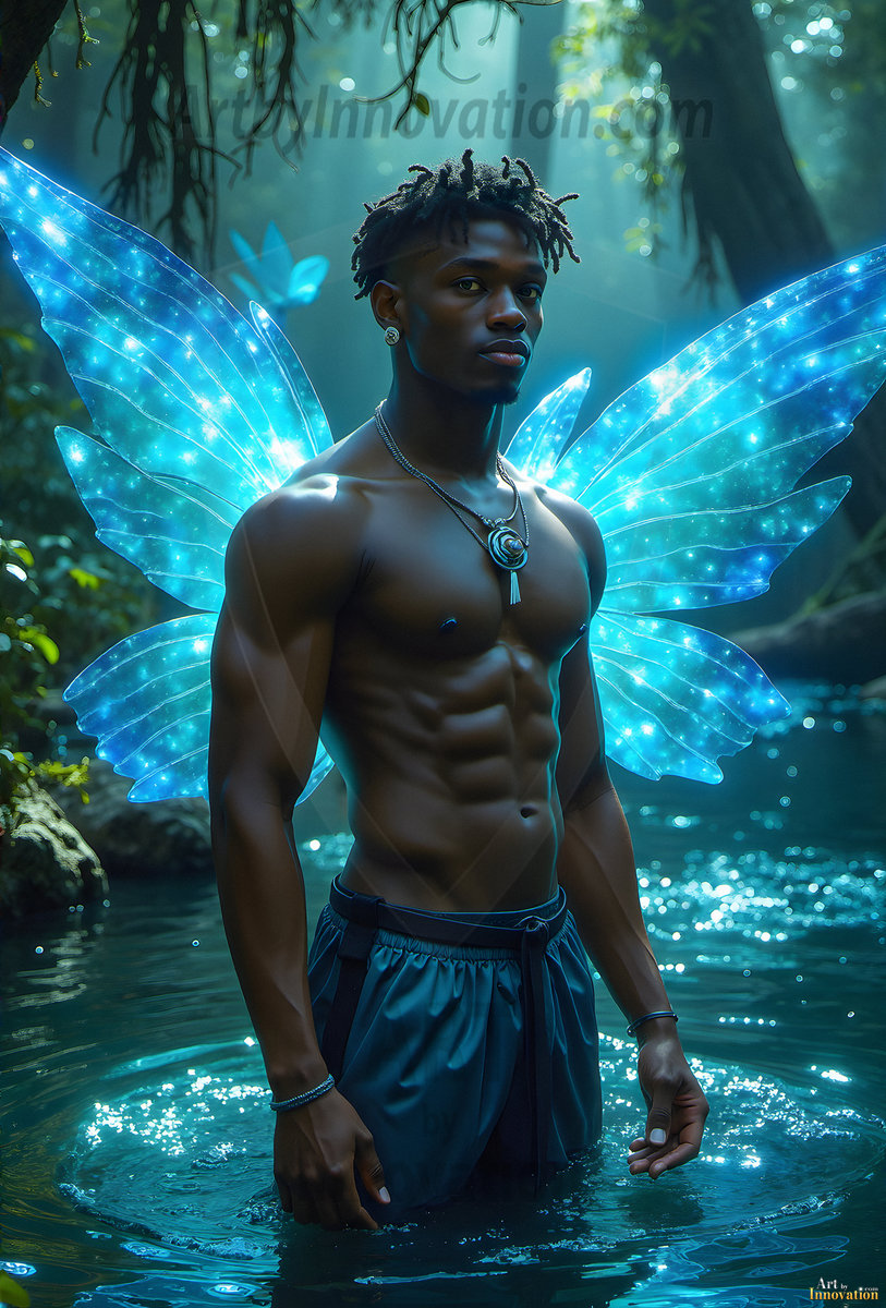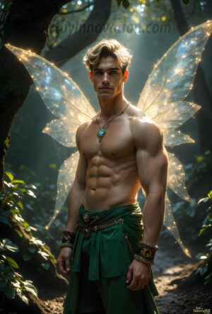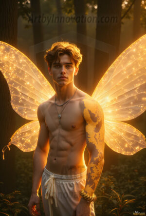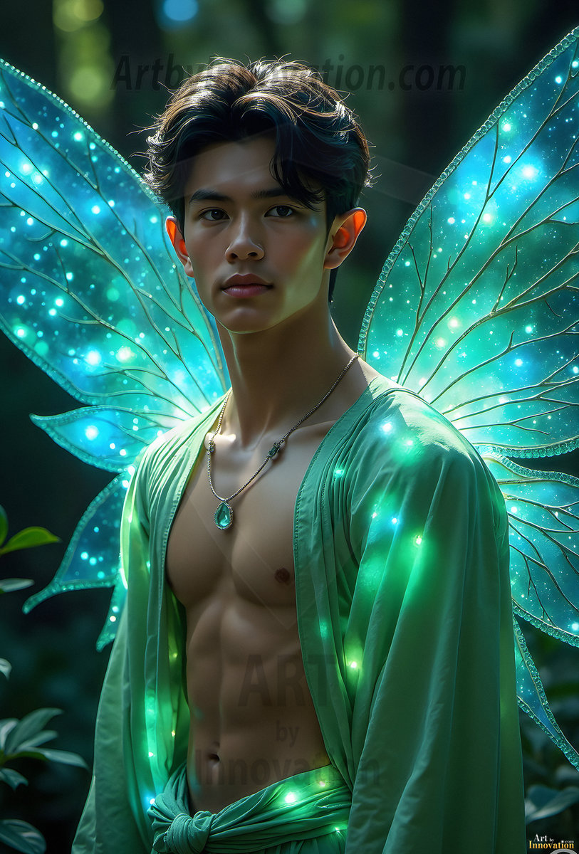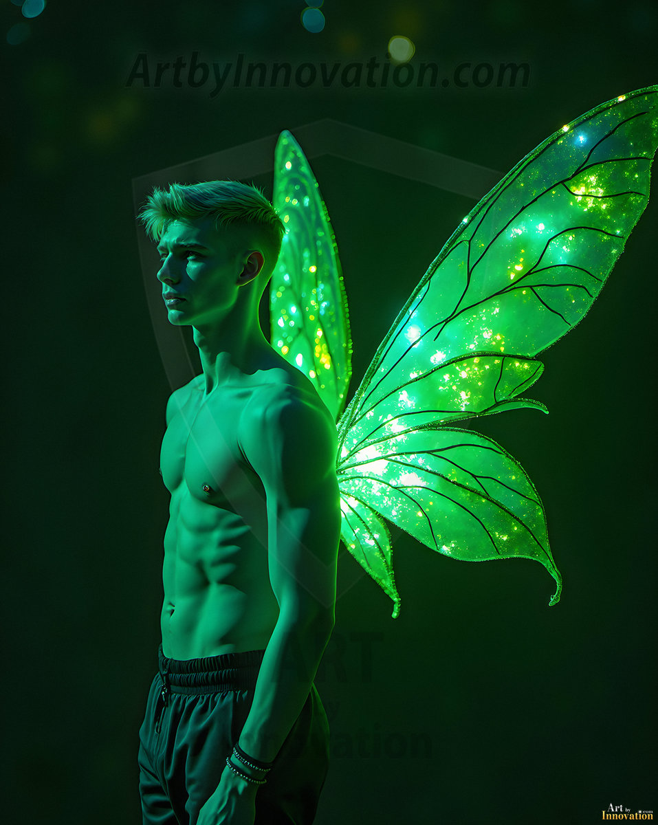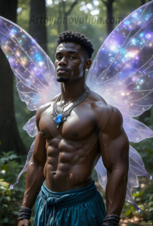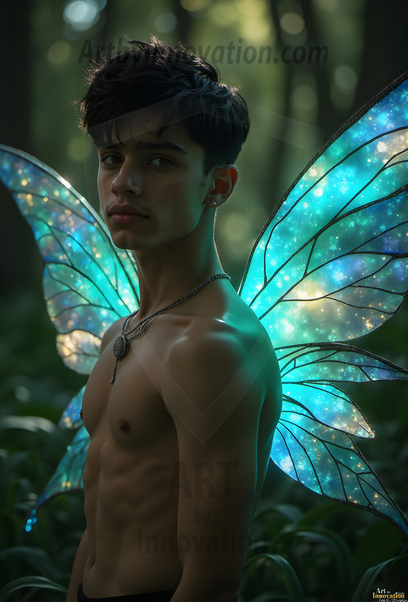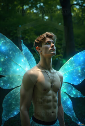 Capturing the pristine and elusive male fairy — brought to life through the power of AI. Imagine a realm where handsome young men possess enormous shimmering crystal wings, vibrant and radiant, capturing and reflecting the light of the environment in a mesmerizing way. Set in mysterious enchanted forests, each fairy exudes an otherworldly beauty and elegance that blurs the line between fantasy and reality. Created using Flux.1, ComfyUI, and Stable Diffusion by © Jeff Dupler | Art by Innovation | https://www.artbyinnovation.com