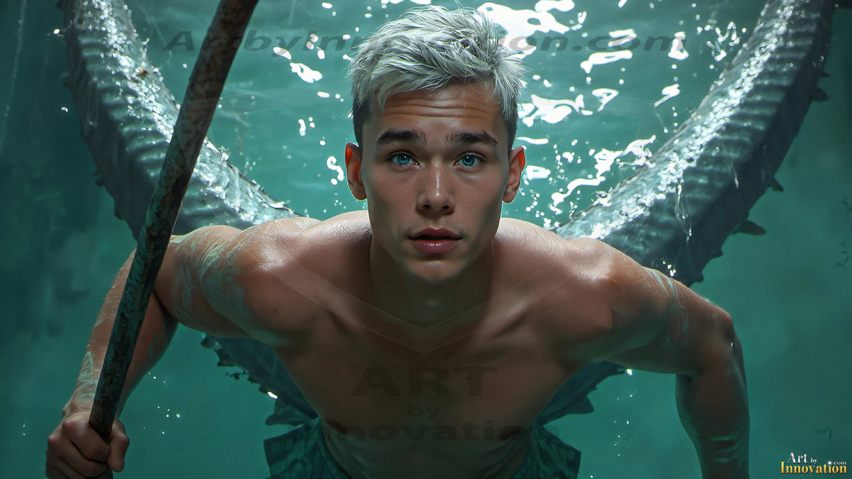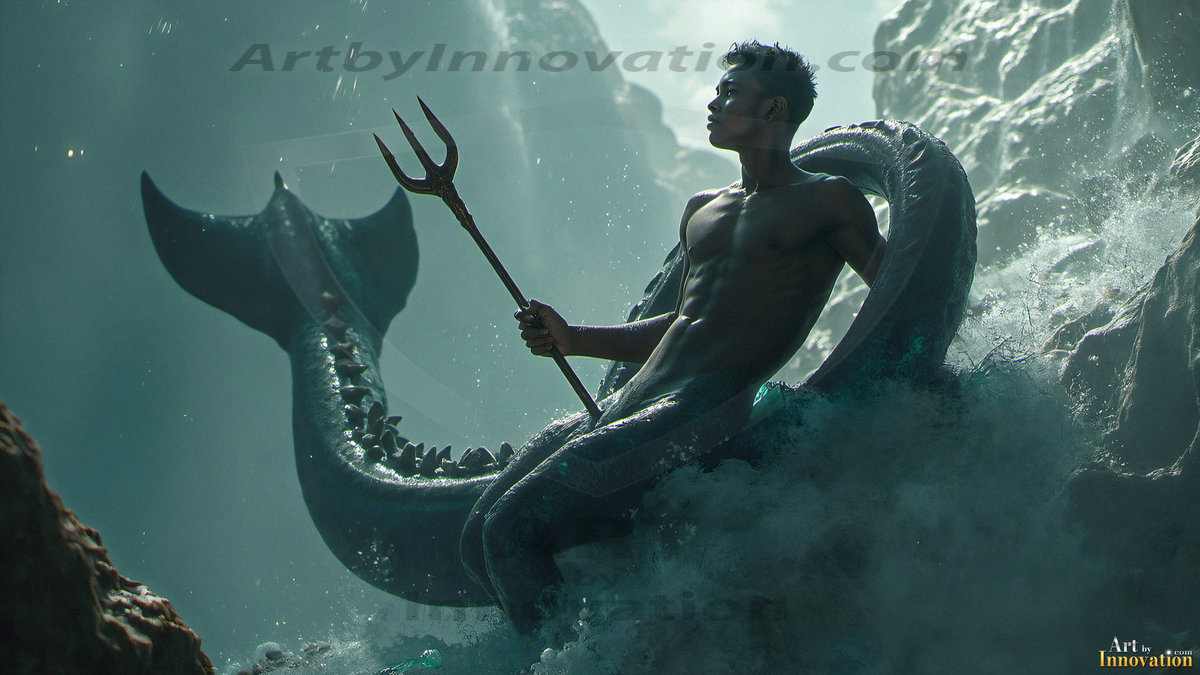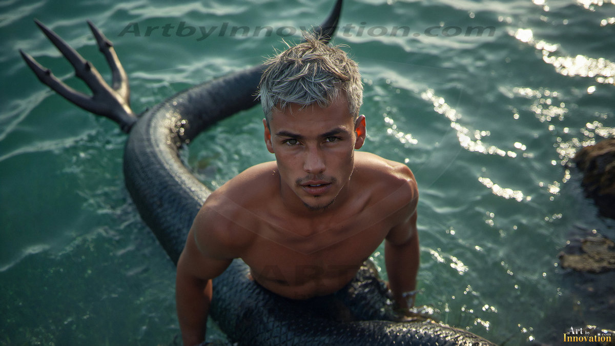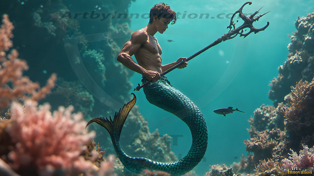Rise from the depths with the Warriors of the Sea. This AI-generated mermen art collection features handsome warriors from all walks of life — shirtless men with shimmering obsidian fish tails, tridents in hand, set against stormy ocean backdrops and breathtaking vibrant coral reefs. Featuring diverse body types and ethnicities, from lean and athletic to powerfully muscular, each image captures the raw beauty and fierce power of the male merman. Created using Flux.1, Midjourney, ComfyUI, and refined with Adobe Photoshop by © Jeff Dupler | Art by Innovation | https://www.artbyinnovation.com