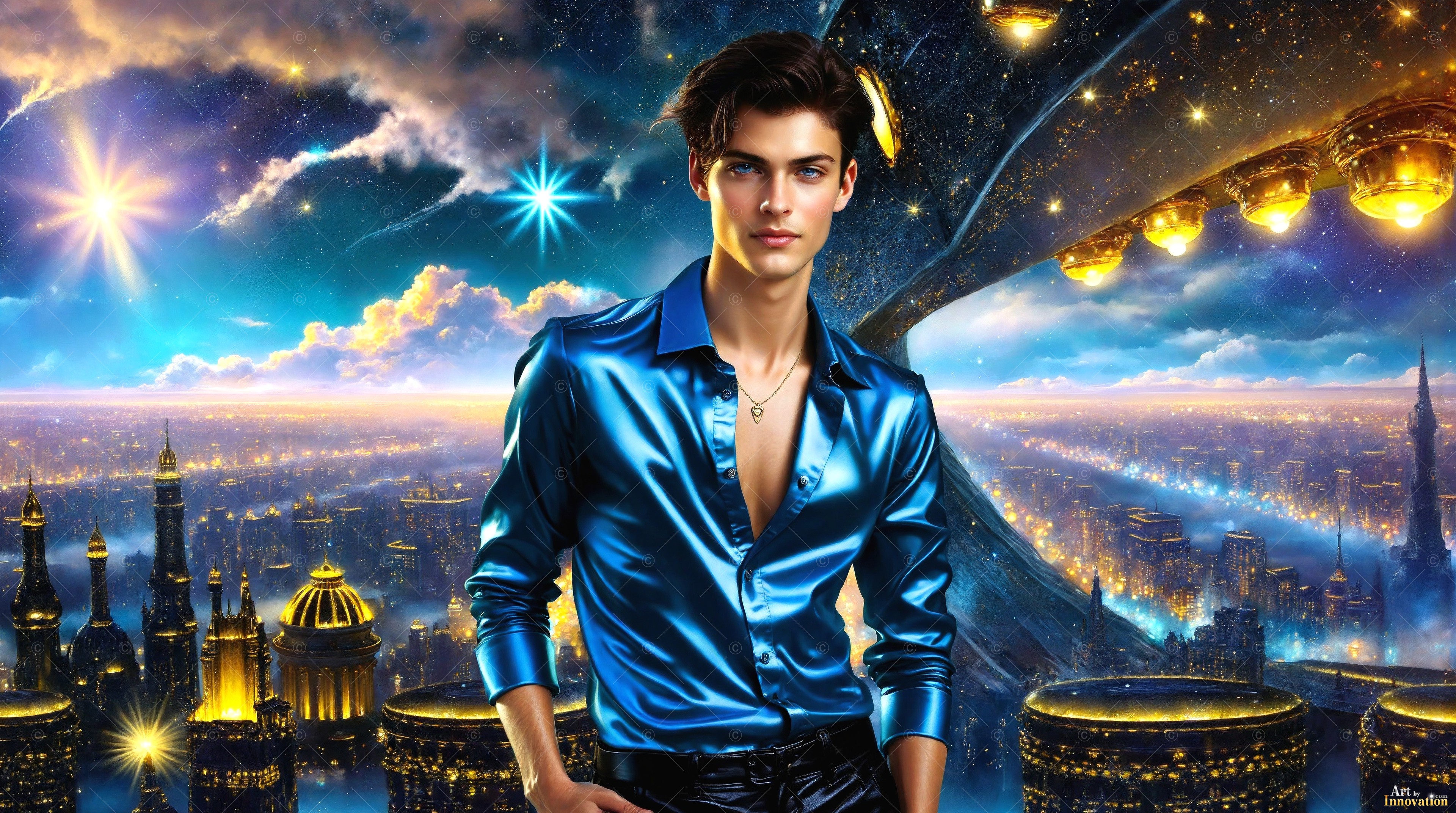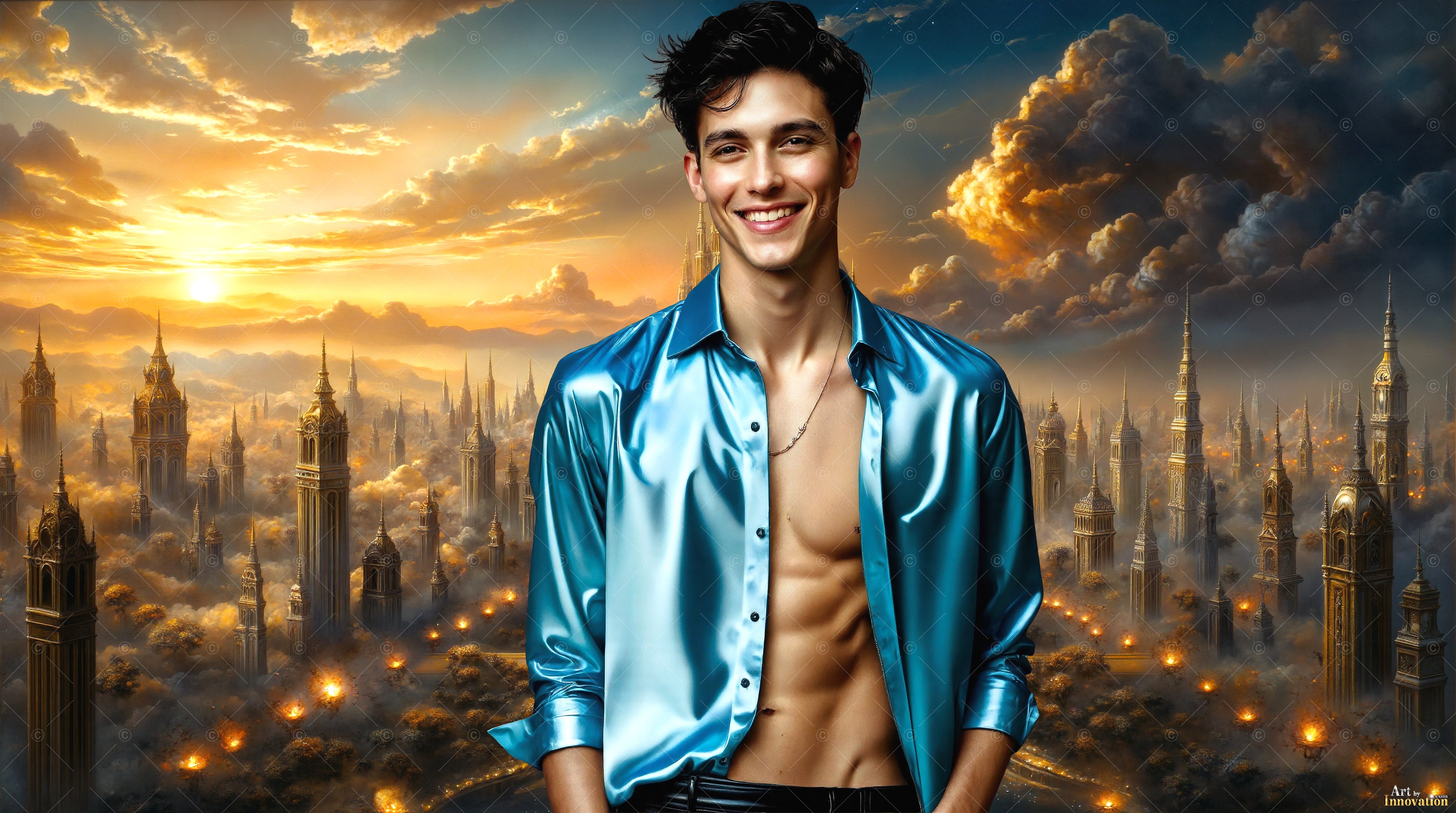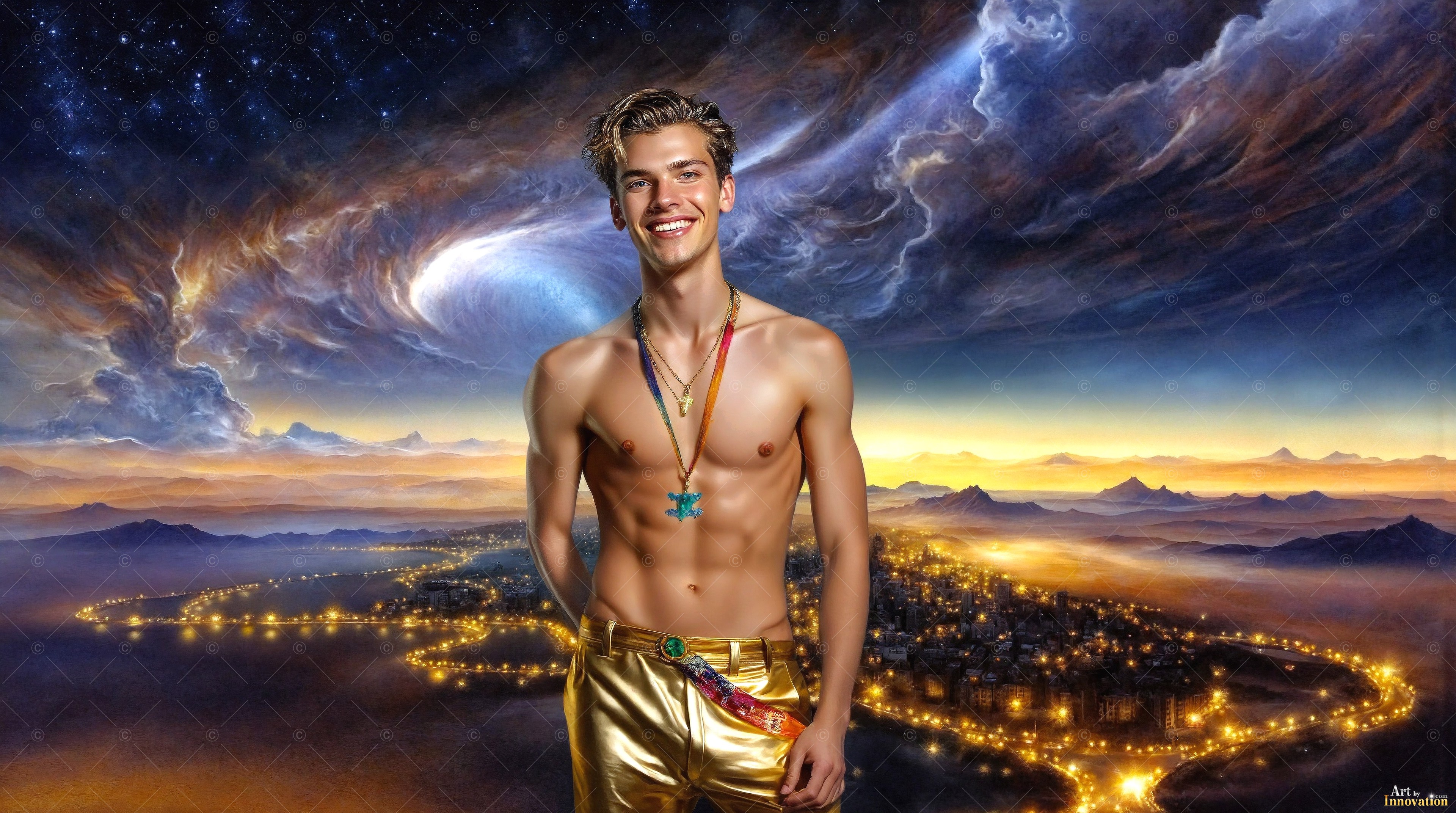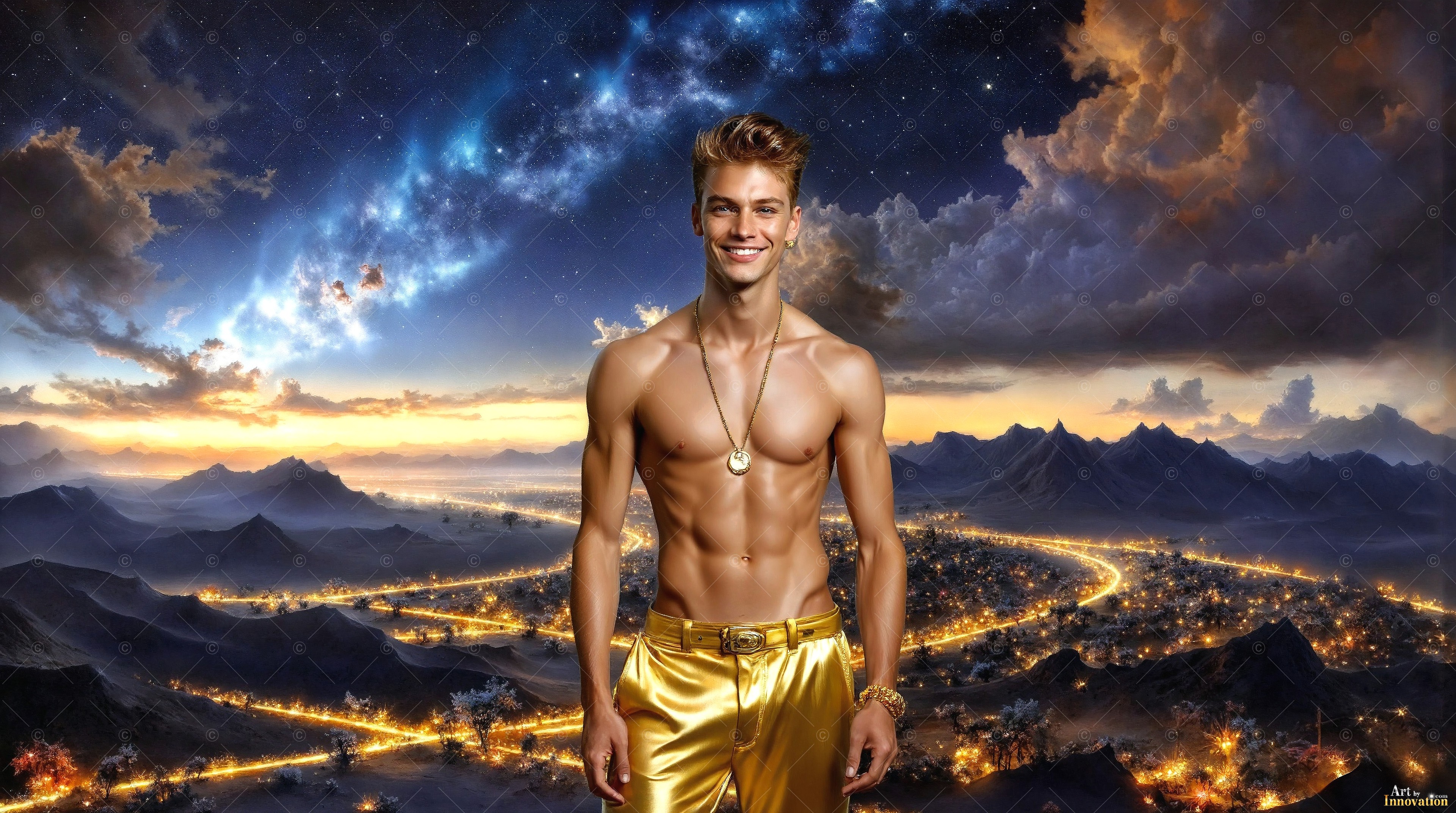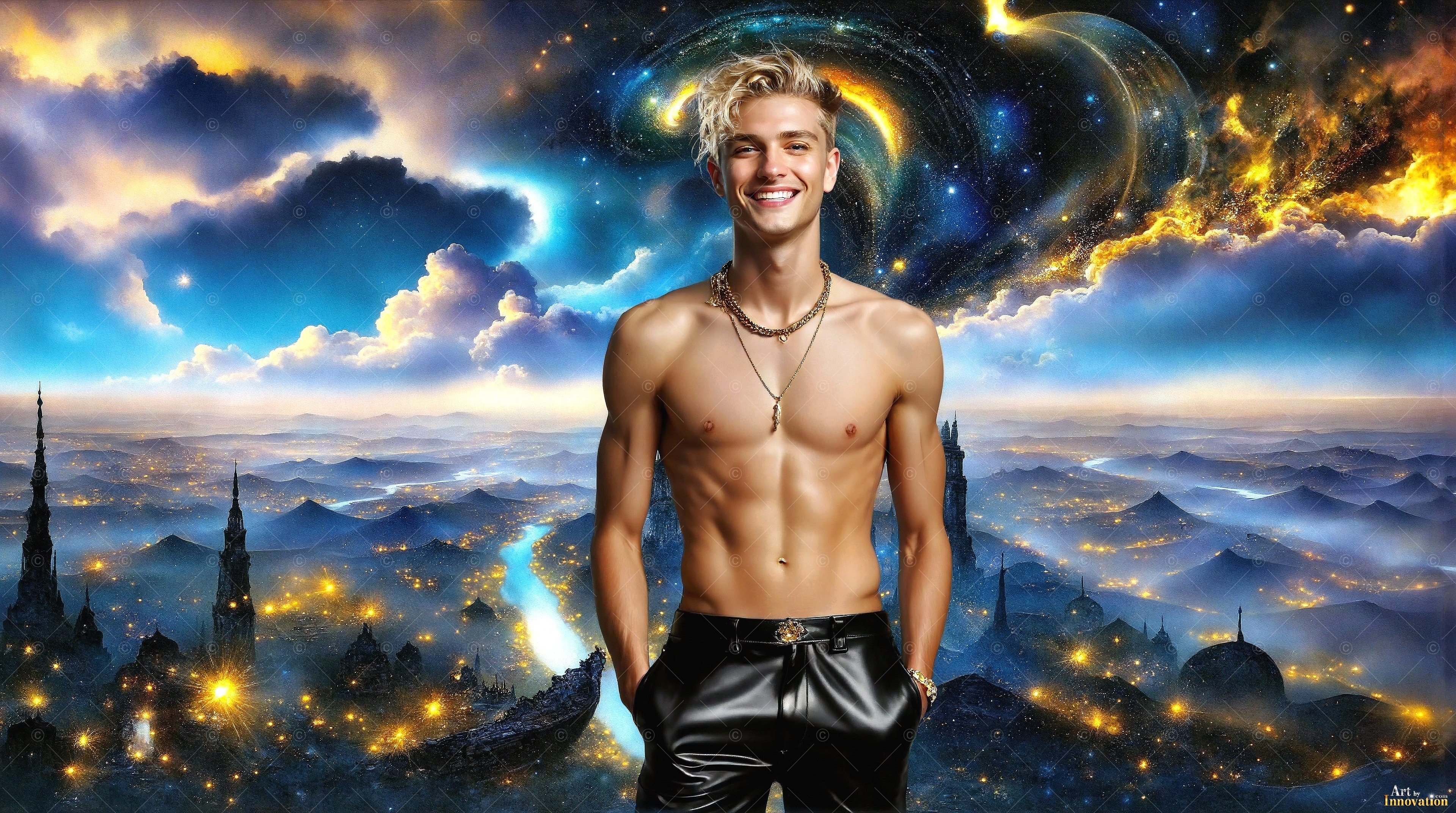 ByJDThe Beautiful Young Men of the Golden City, is a collection of AI generated images of sexy, glamorous, handsome guys in the heavens. In this fantasy photograph of a young men in their 20’s, on a balcony, overlooking a large golden city in the heavens. Generated to be as realistic as possible, in this this fantasy setting, with todays technology. Wearing jeans, an unbuttoned, vibrant, long-sleeve, button down shirt. The subject is enjoying a beautiful day outdoors. The mystical, galactic landscape, and the vibrant cosmic canopies, every detail, from the texture of the clouds, to the magnificent, majestic gothic architecture of the golden city, is crafted to create an atmosphere of reverence and divine glory. With a breathtaking scene of Salar de Uyuni at sunset, offering warm golden hour lighting. The heavenly landscape evokes a sense of freedom and tranquility, that is expresses through his facial features and smile, as day turns to night. The heavenly landscape evokes a sense of mysterious black space and light, with a vast galaxy that almost covers the image, the stars and constellations sparkle bright, in dark blue sky. On occasion the earth can be seen floating in the sky.