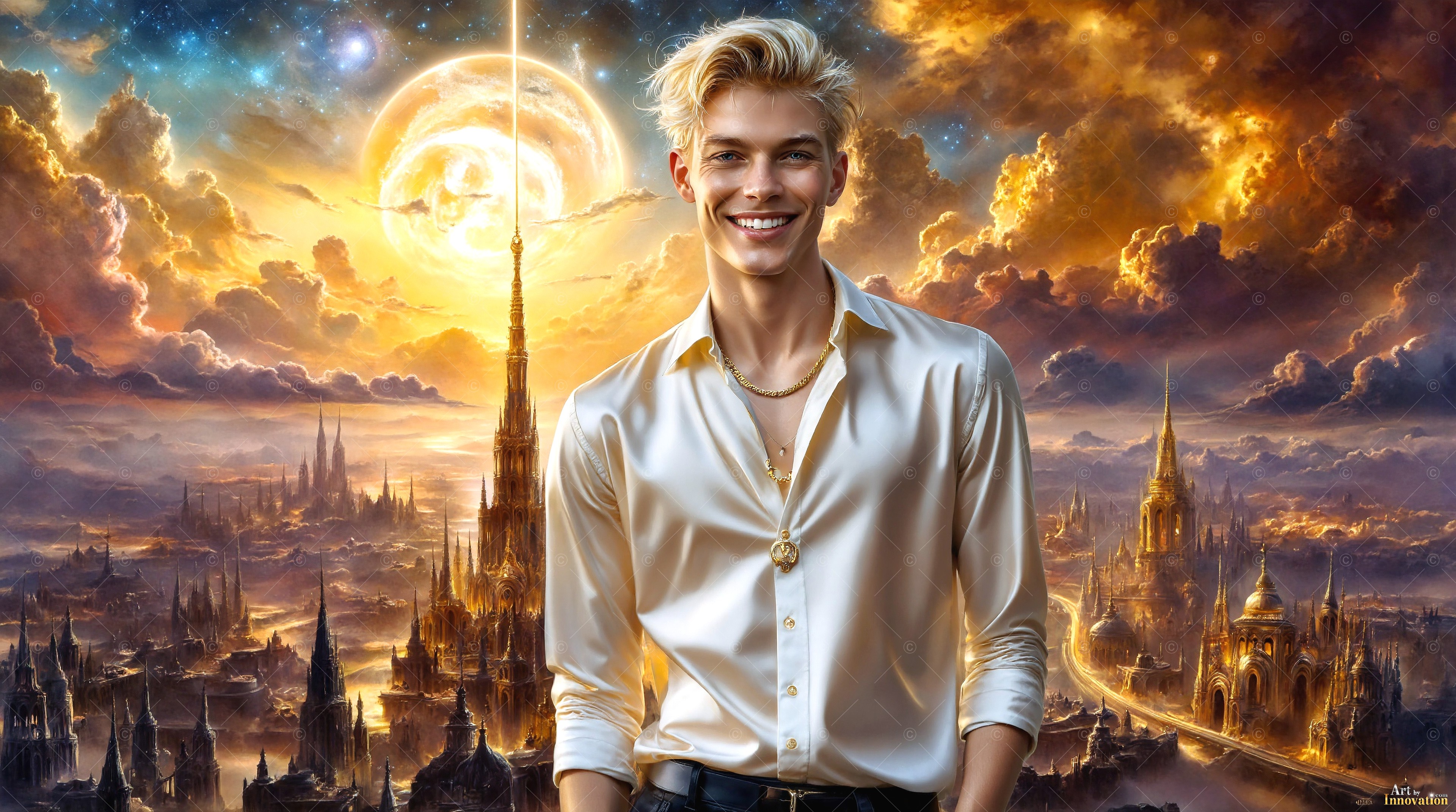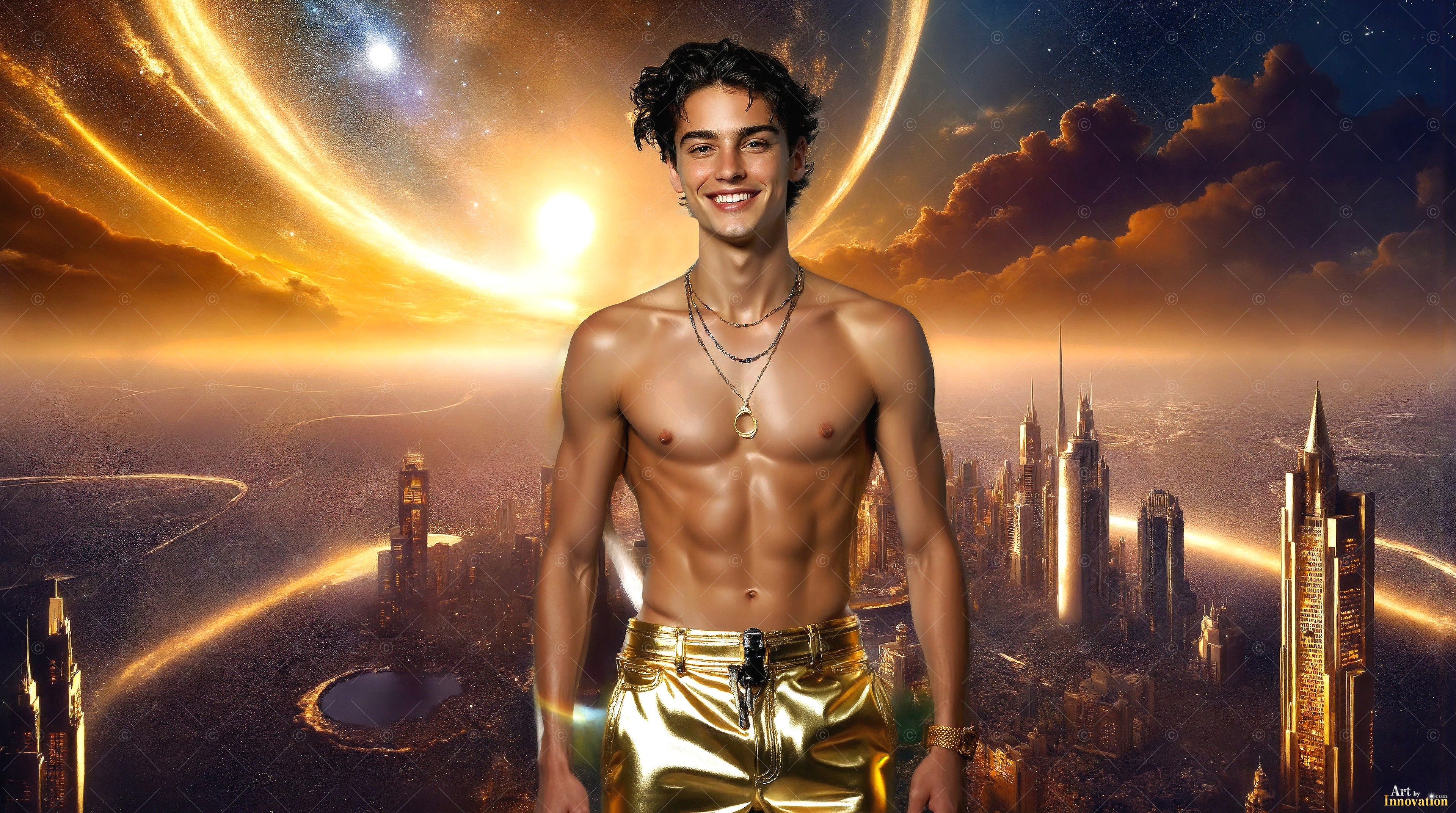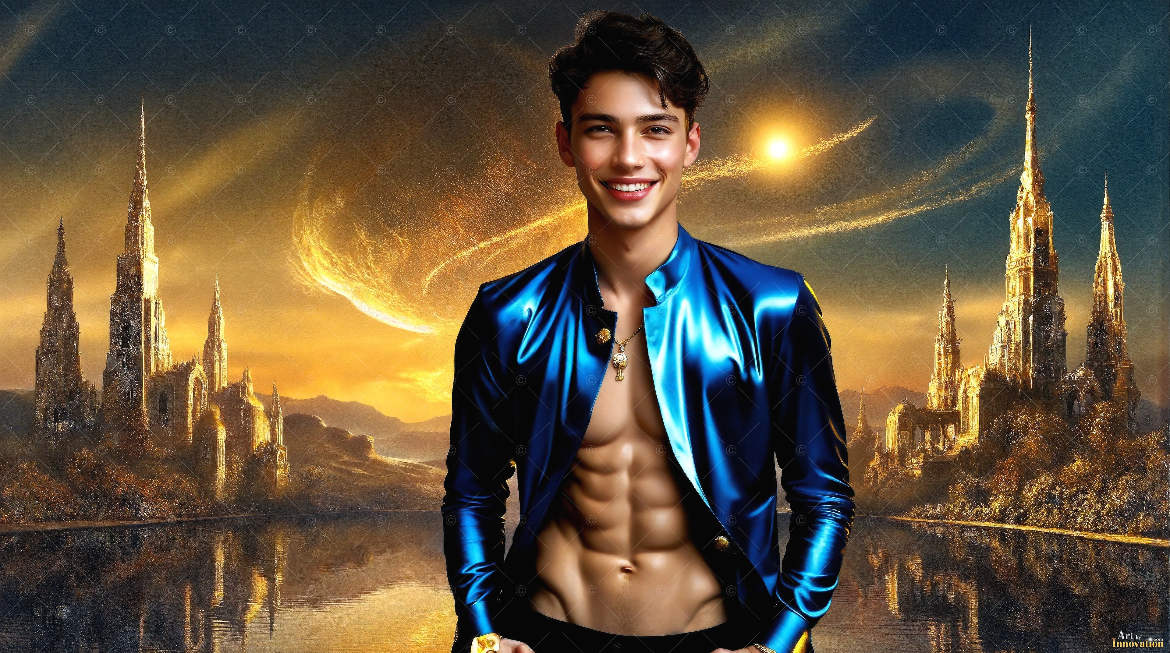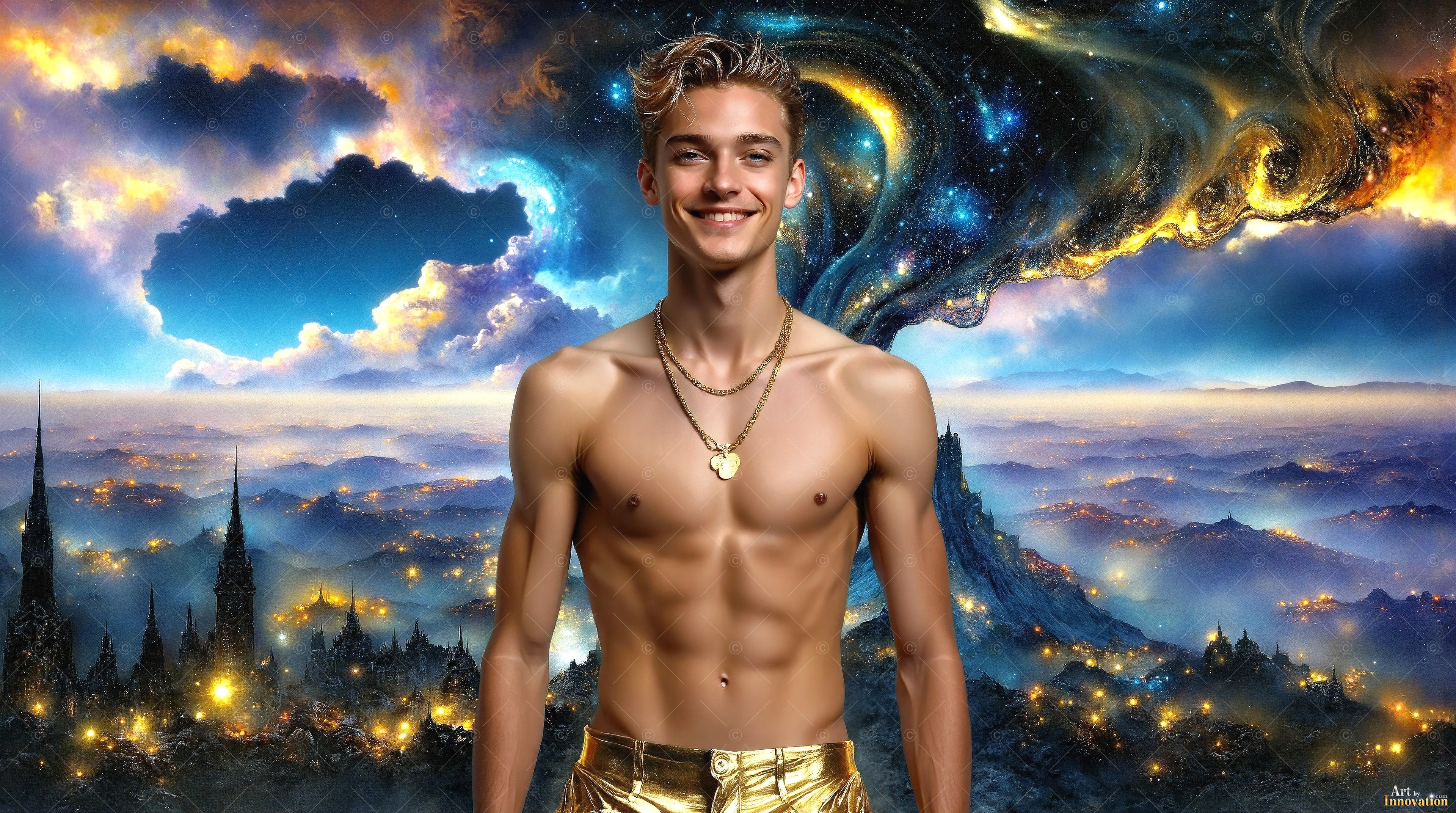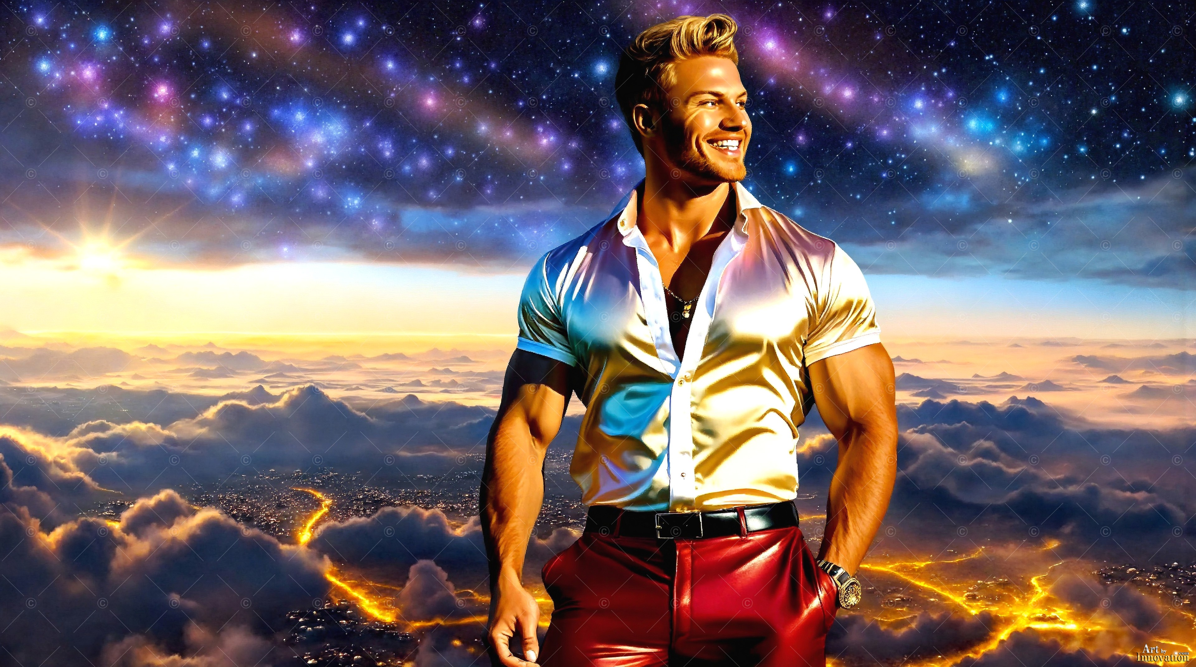 ByJDThe Beautiful Young Men of the Golden City, is a collection of AI generated images of sexy, glamorous, handsome guys in the heavens. In this fantasy photograph of a young men in their 20’s, on a balcony, overlooking a large golden city in the heavens. Generated to be as realistic as possible, in this this fantasy setting, with todays technology. Wearing jeans, an unbuttoned, vibrant, long-sleeve, button down shirt. The subject is enjoying a beautiful day outdoors. The mystical, galactic landscape, and the vibrant cosmic canopies, every detail, from the texture of the clouds, to the magnificent, majestic gothic architecture of the golden city, is crafted to create an atmosphere of reverence and divine glory. With a breathtaking scene of Salar de Uyuni at sunset, offering warm golden hour lighting. The heavenly landscape evokes a sense of freedom and tranquility, that is expresses through his facial features and smile, as day turns to night. The heavenly landscape evokes a sense of mysterious black space and light, with a vast galaxy that almost covers the image, the stars and constellations sparkle bright, in dark blue sky. On occasion the earth can be seen floating in the sky.