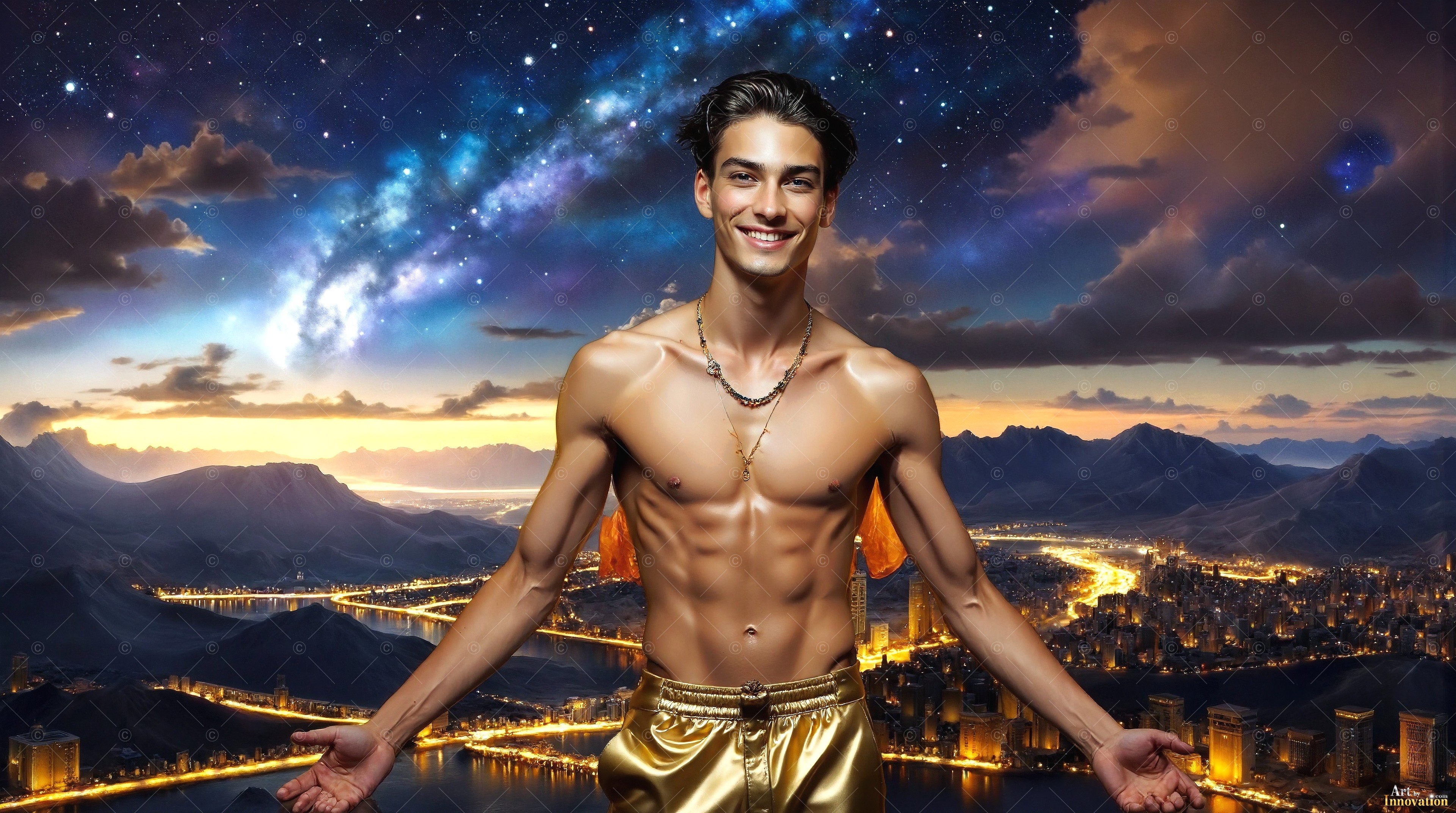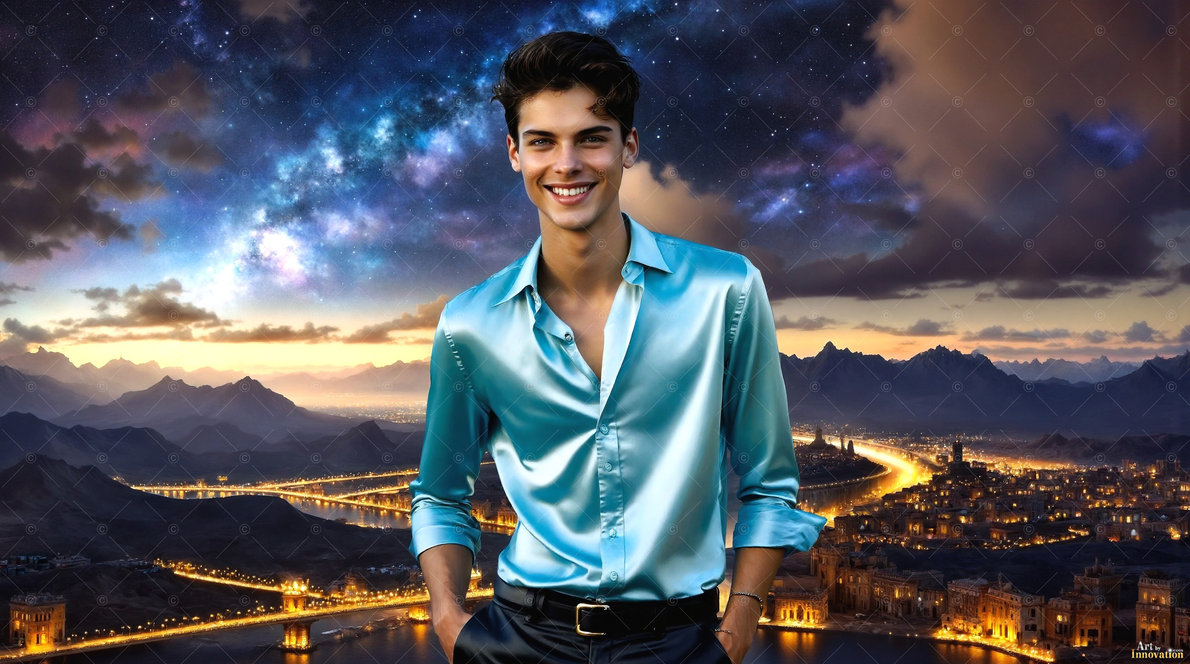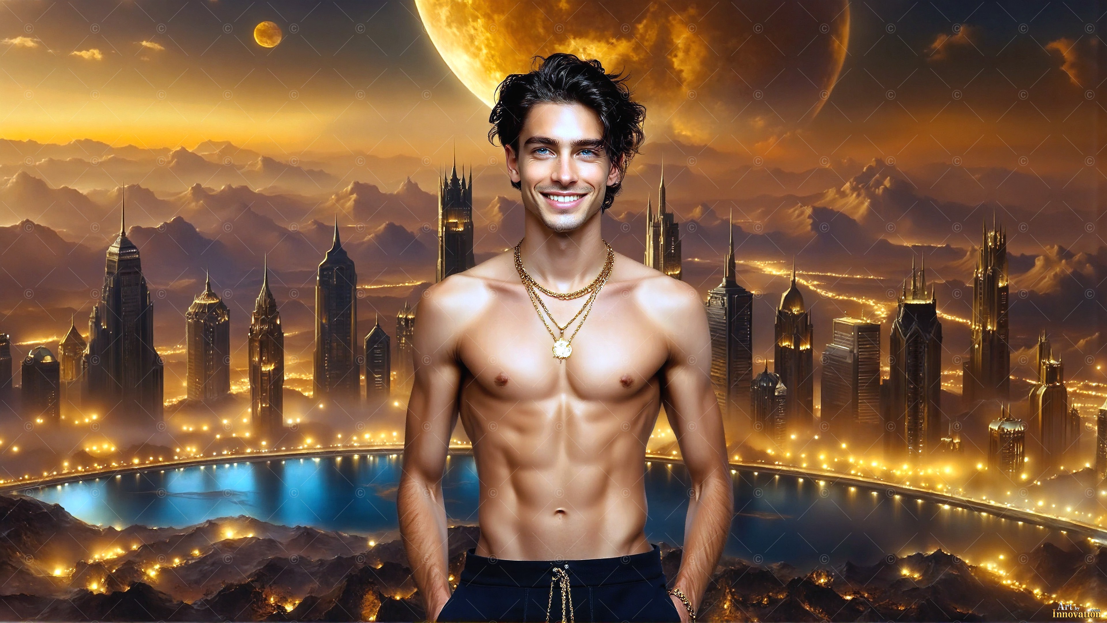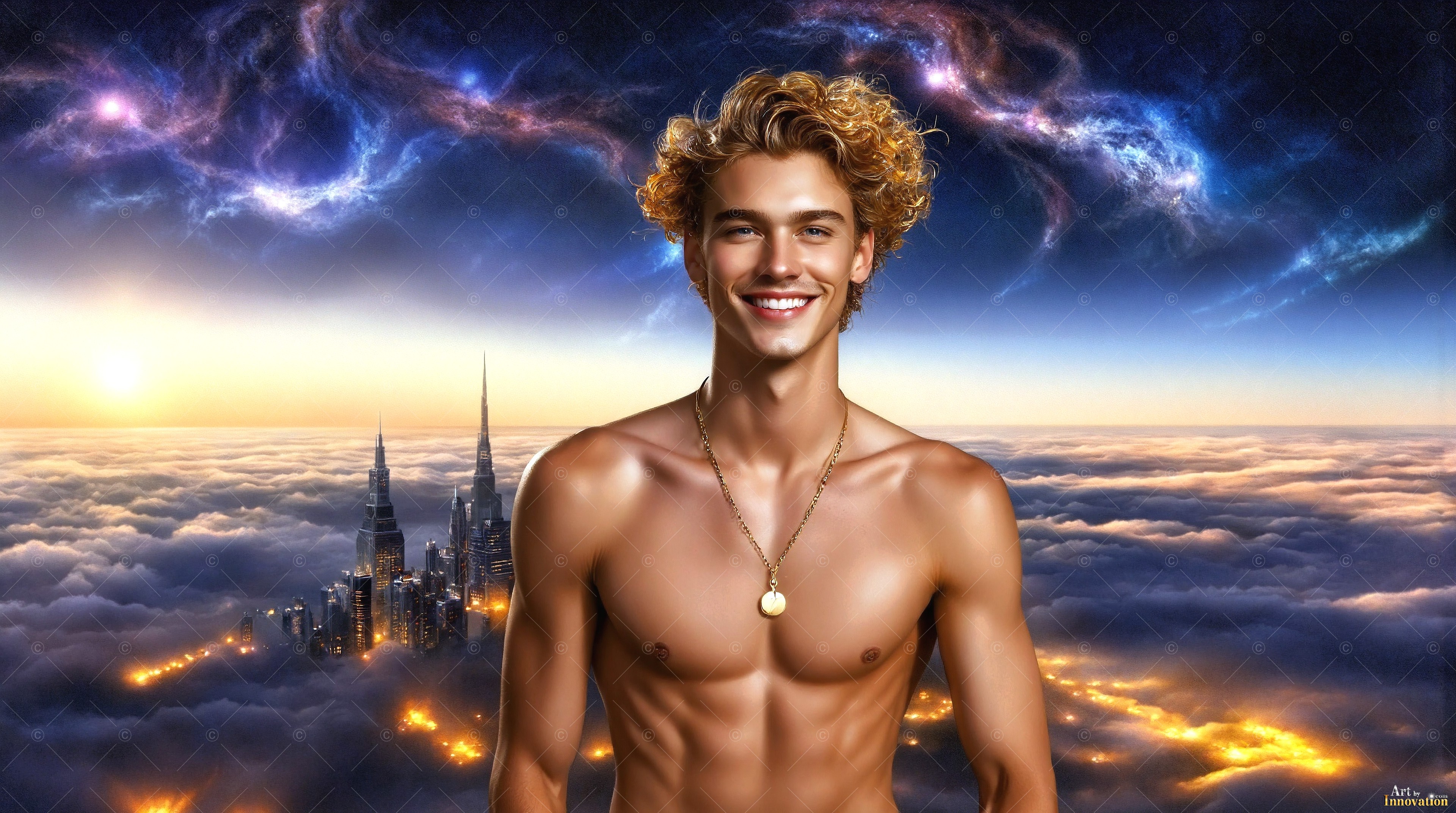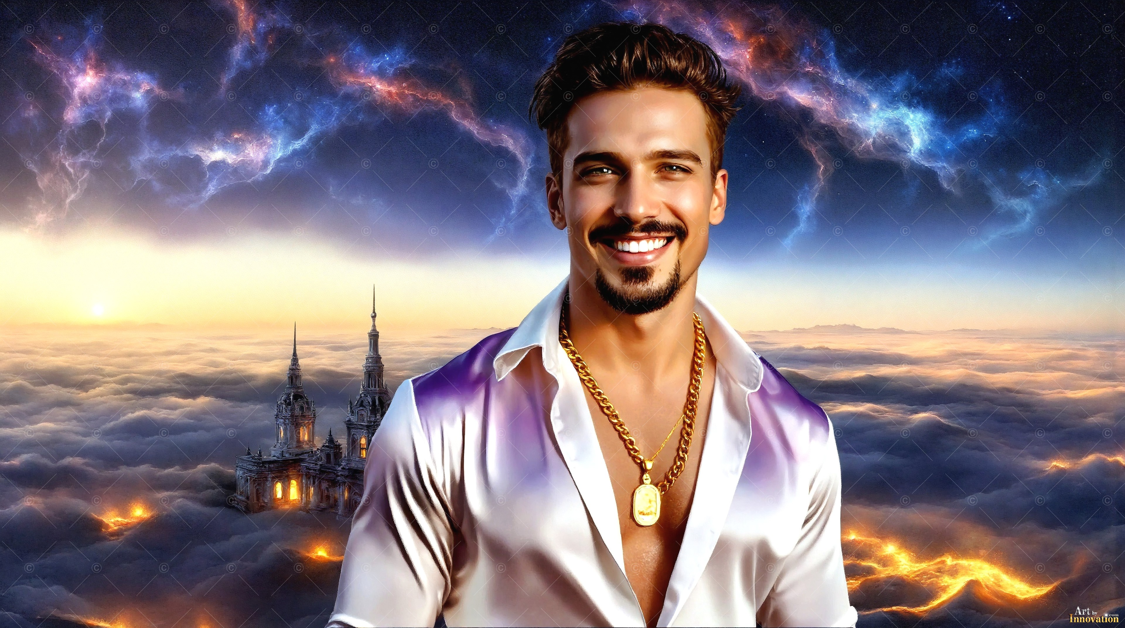 ByJDThe Beautiful Young Men of the Golden City, is a collection of AI generated images of sexy, glamorous, handsome guys in the heavens. In this fantasy photograph of a young men in their 20’s, on a balcony, overlooking a large golden city in the heavens. Generated to be as realistic as possible, in this this fantasy setting, with todays technology. Wearing jeans, an unbuttoned, vibrant, long-sleeve, button down shirt. The subject is enjoying a beautiful day outdoors. The mystical, galactic landscape, and the vibrant cosmic canopies, every detail, from the texture of the clouds, to the magnificent, majestic gothic architecture of the golden city, is crafted to create an atmosphere of reverence and divine glory. With a breathtaking scene of Salar de Uyuni at sunset, offering warm golden hour lighting. The heavenly landscape evokes a sense of freedom and tranquility, that is expresses through his facial features and smile, as day turns to night. The heavenly landscape evokes a sense of mysterious black space and light, with a vast galaxy that almost covers the image, the stars and constellations sparkle bright, in dark blue sky. On occasion the earth can be seen floating in the sky.