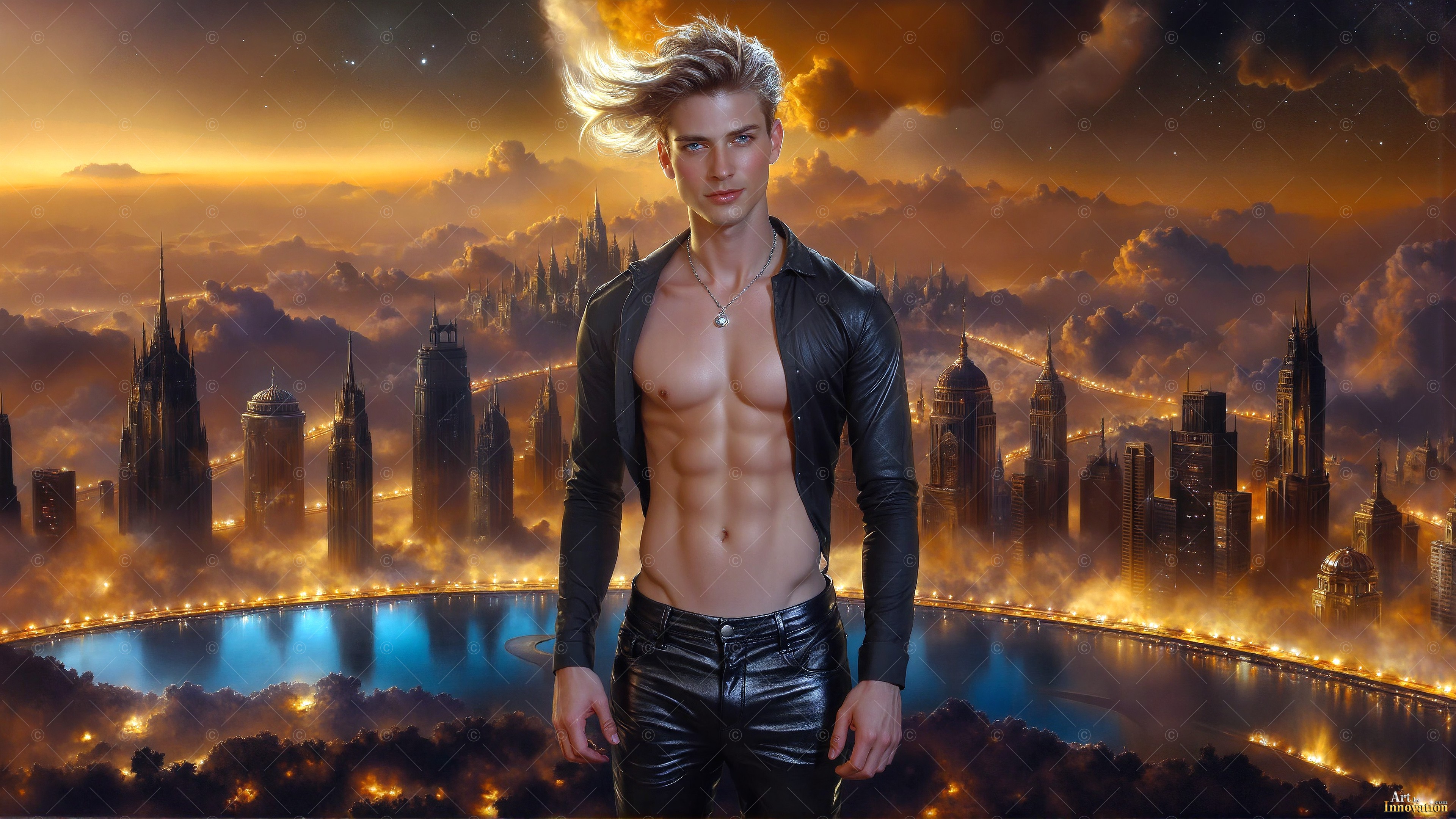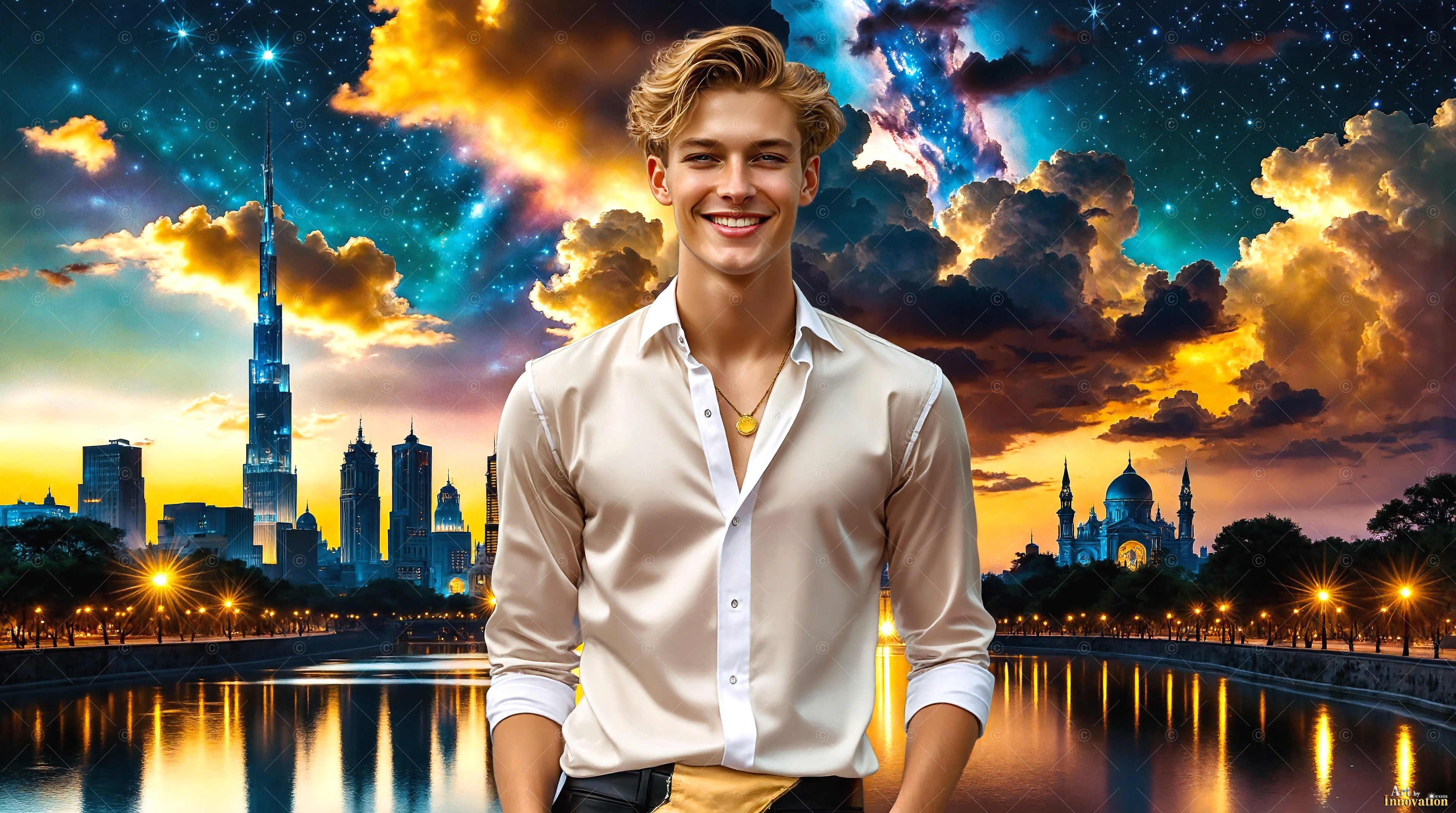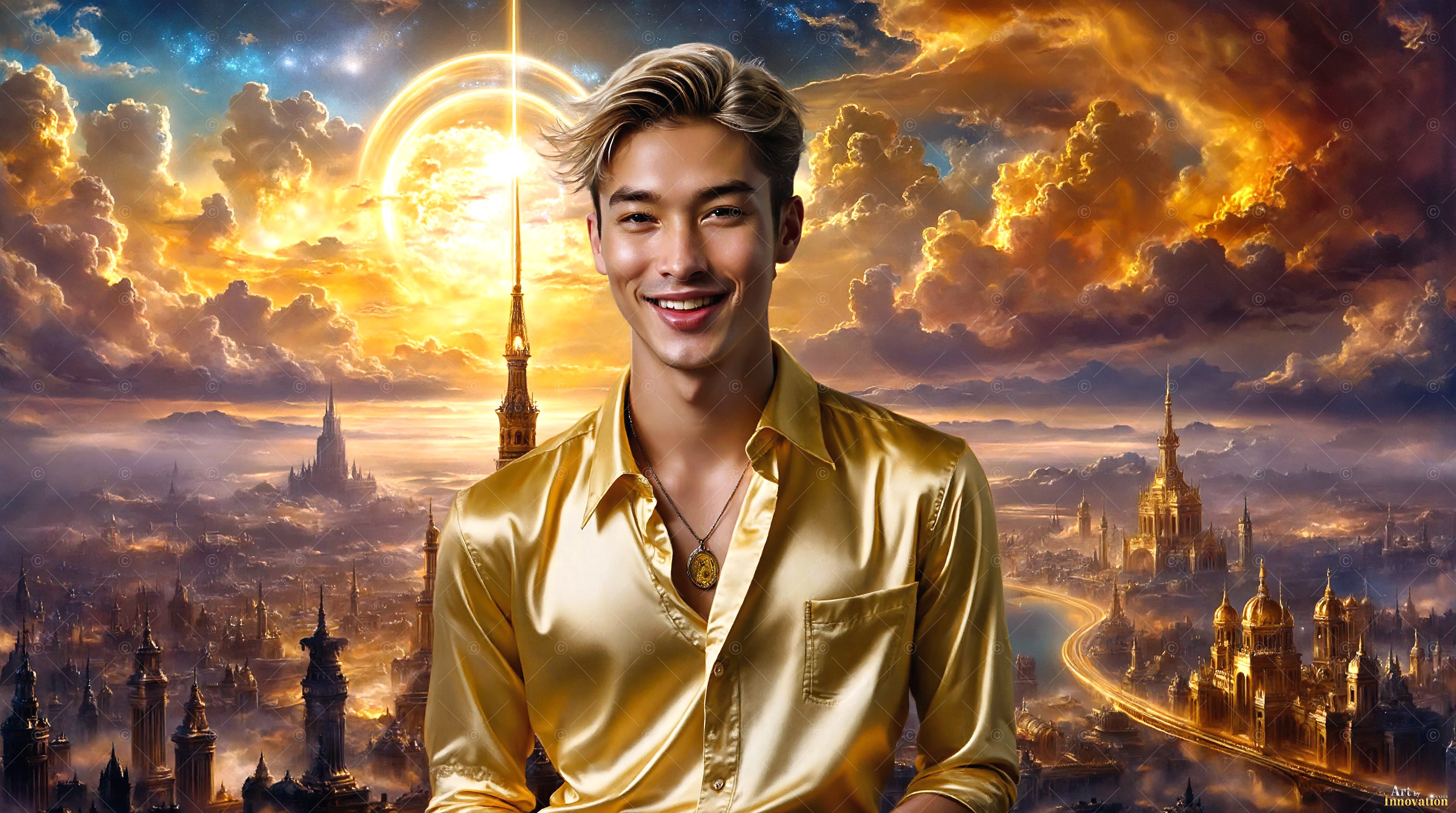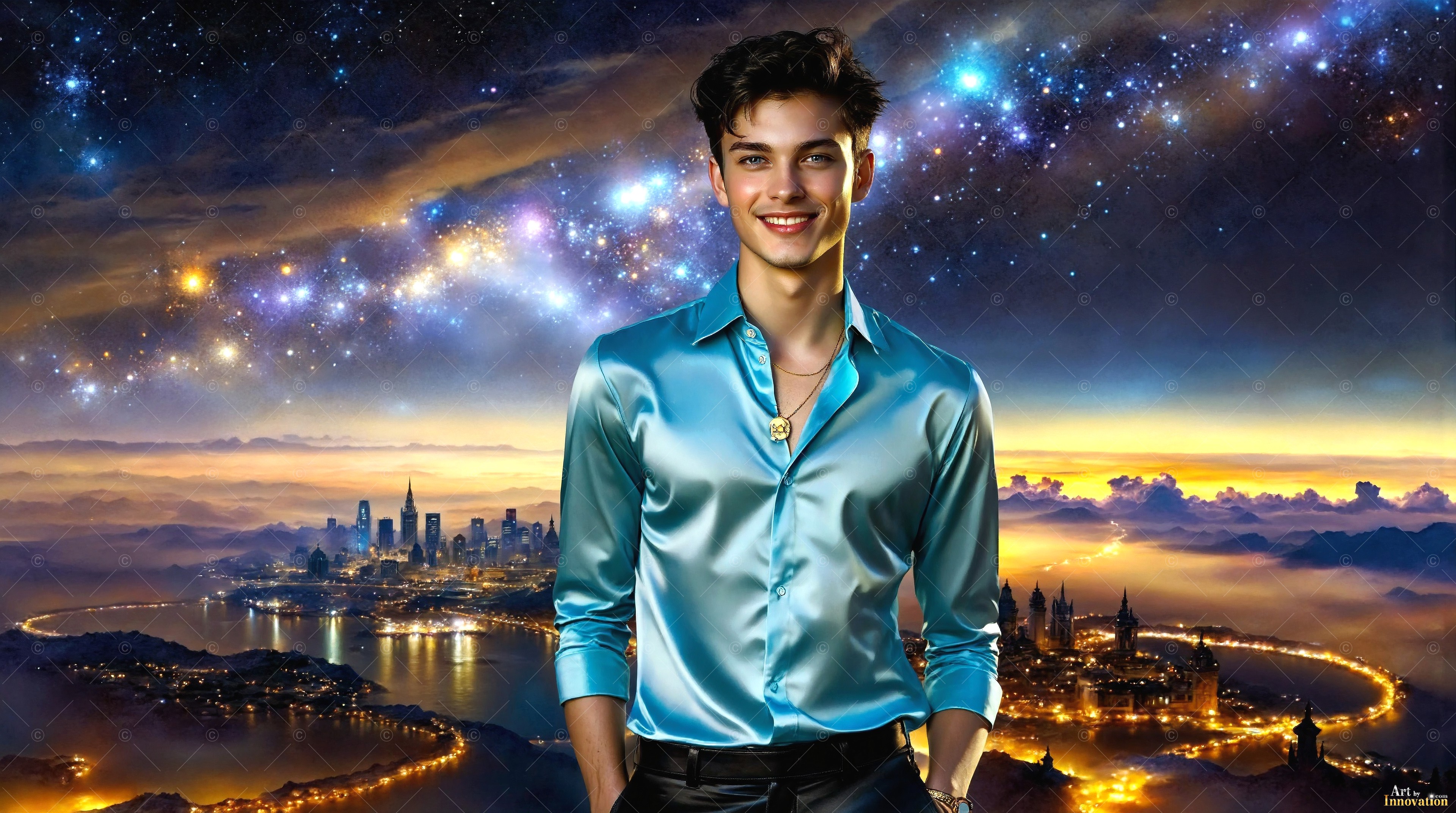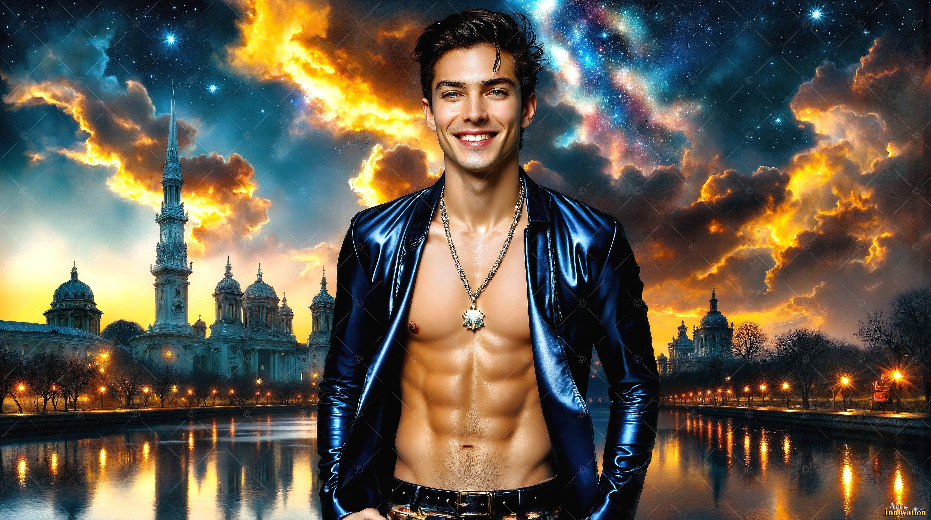 ByJDThe Beautiful Young Men of the Golden City, is a collection of AI generated images of sexy, glamorous, handsome guys in the heavens. In this fantasy photograph of a young men in their 20’s, on a balcony, overlooking a large golden city in the heavens. Generated to be as realistic as possible, in this this fantasy setting, with todays technology. Wearing jeans, an unbuttoned, vibrant, long-sleeve, button down shirt. The subject is enjoying a beautiful day outdoors. The mystical, galactic landscape, and the vibrant cosmic canopies, every detail, from the texture of the clouds, to the magnificent, majestic gothic architecture of the golden city, is crafted to create an atmosphere of reverence and divine glory. With a breathtaking scene of Salar de Uyuni at sunset, offering warm golden hour lighting. The heavenly landscape evokes a sense of freedom and tranquility, that is expresses through his facial features and smile, as day turns to night. The heavenly landscape evokes a sense of mysterious black space and light, with a vast galaxy that almost covers the image, the stars and constellations sparkle bright, in dark blue sky. On occasion the earth can be seen floating in the sky.