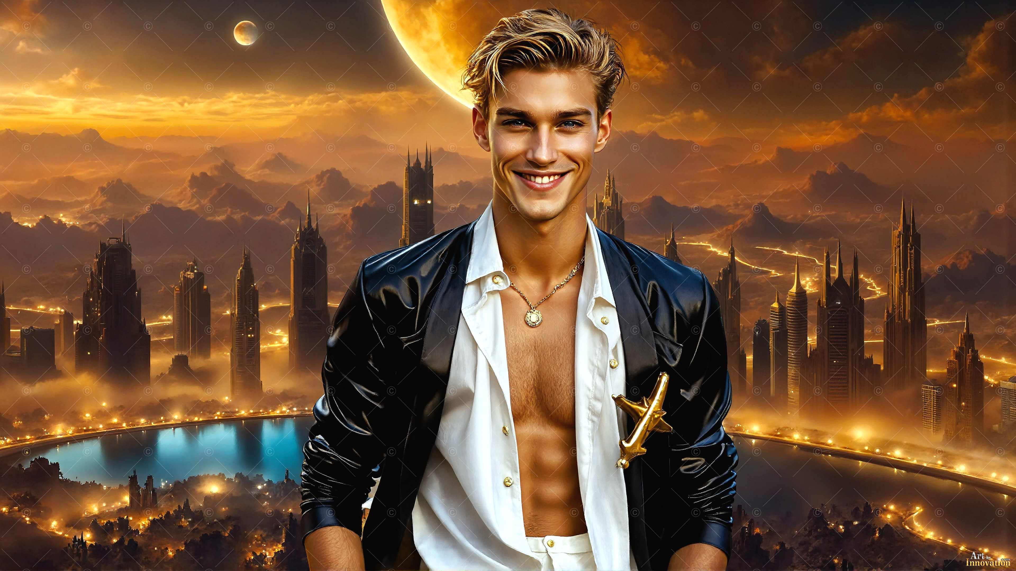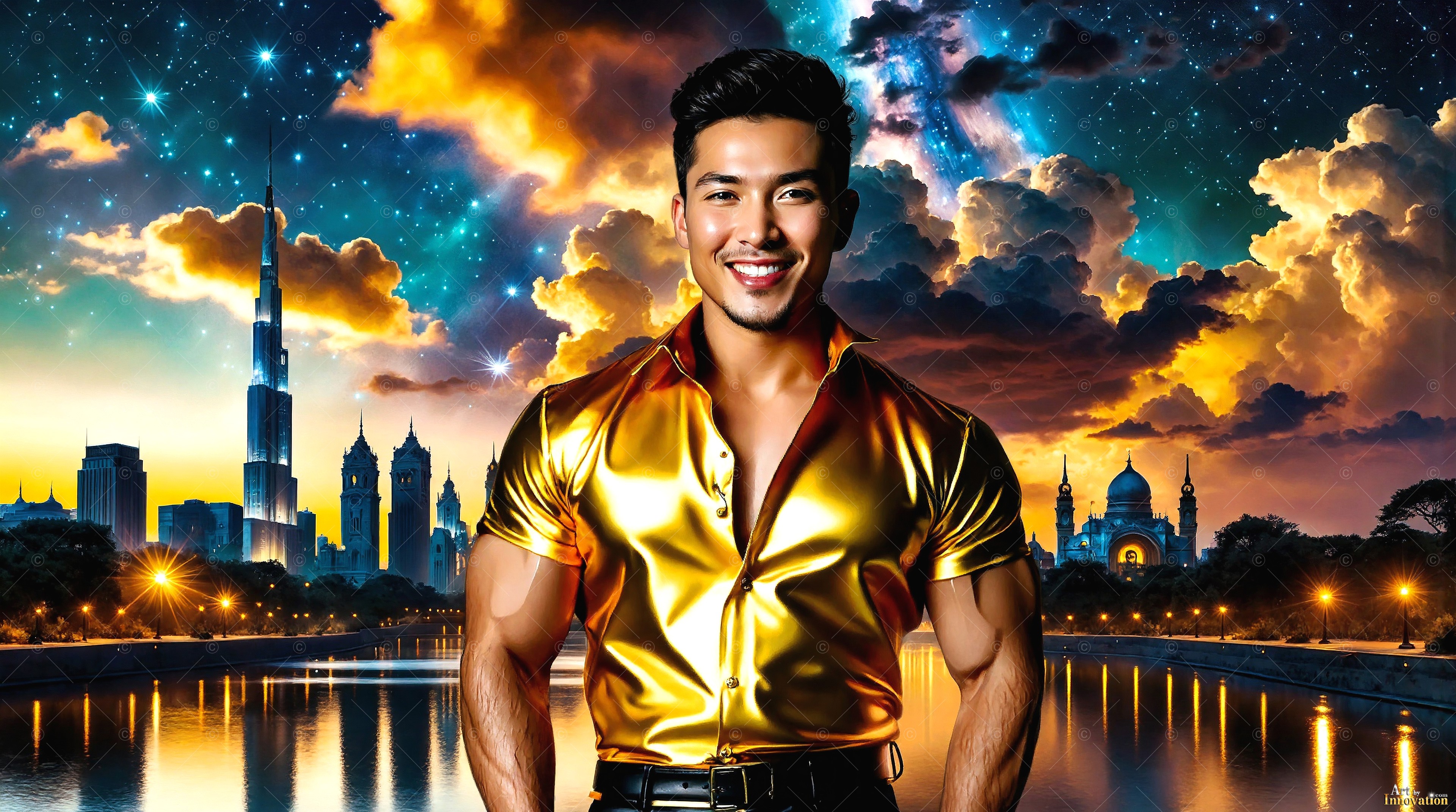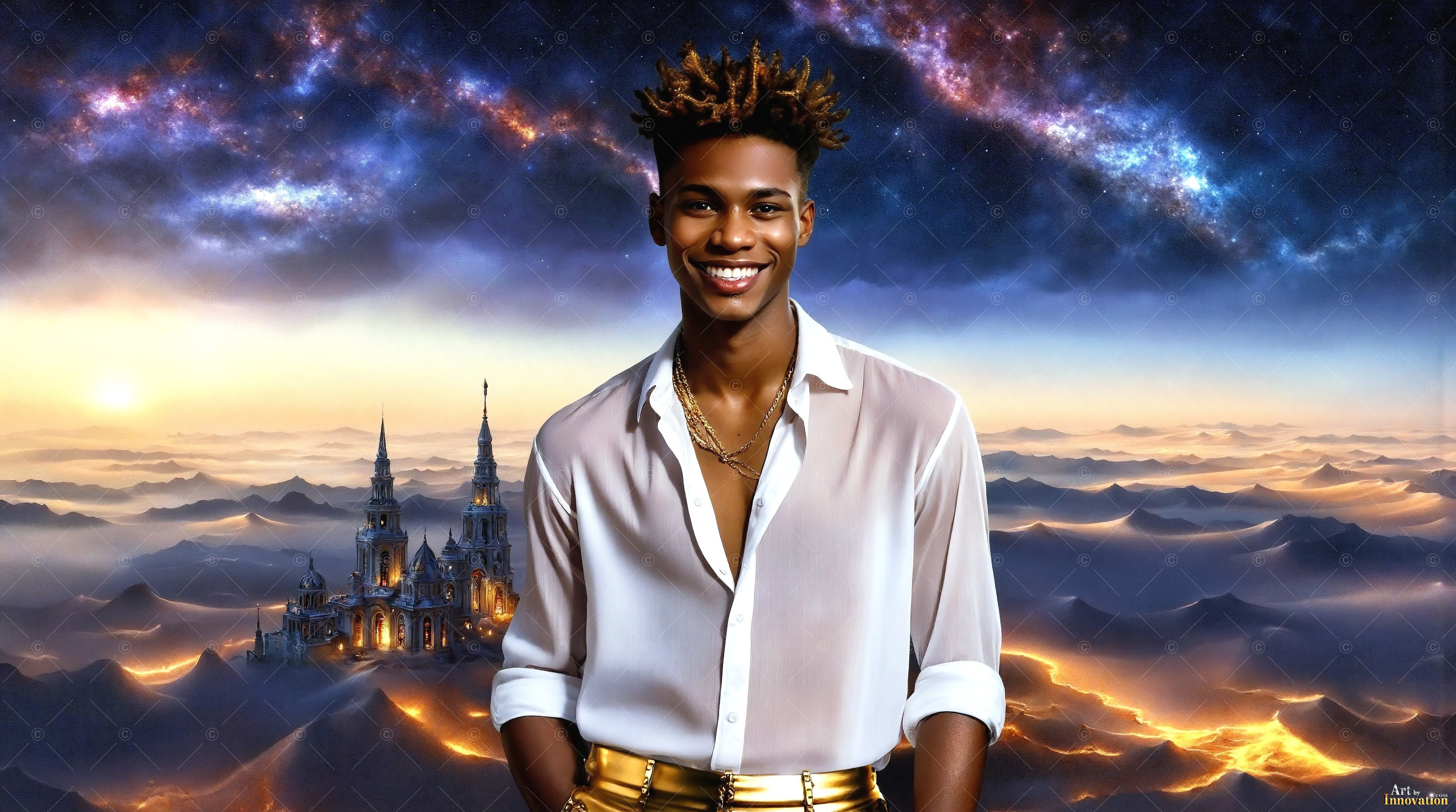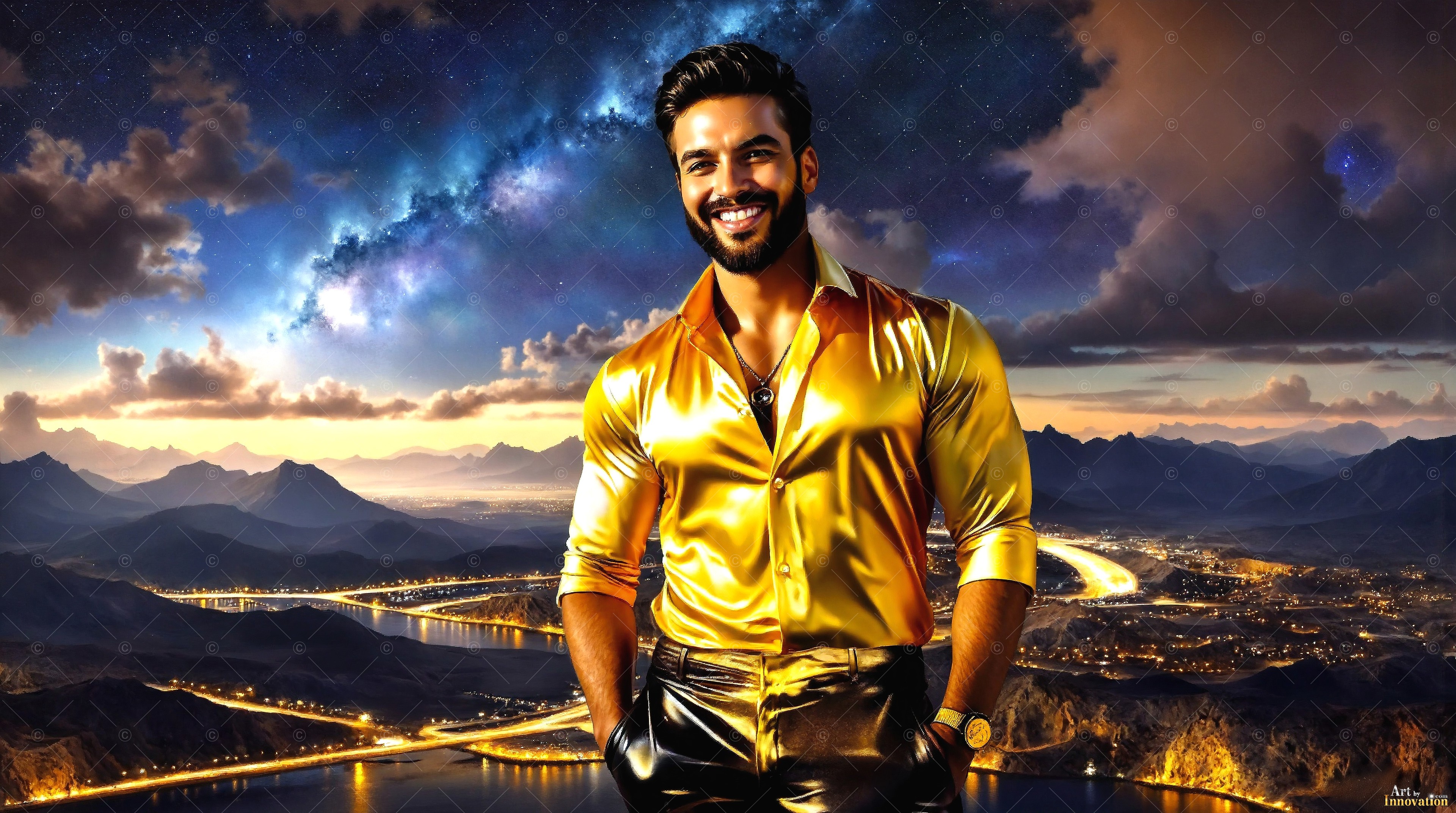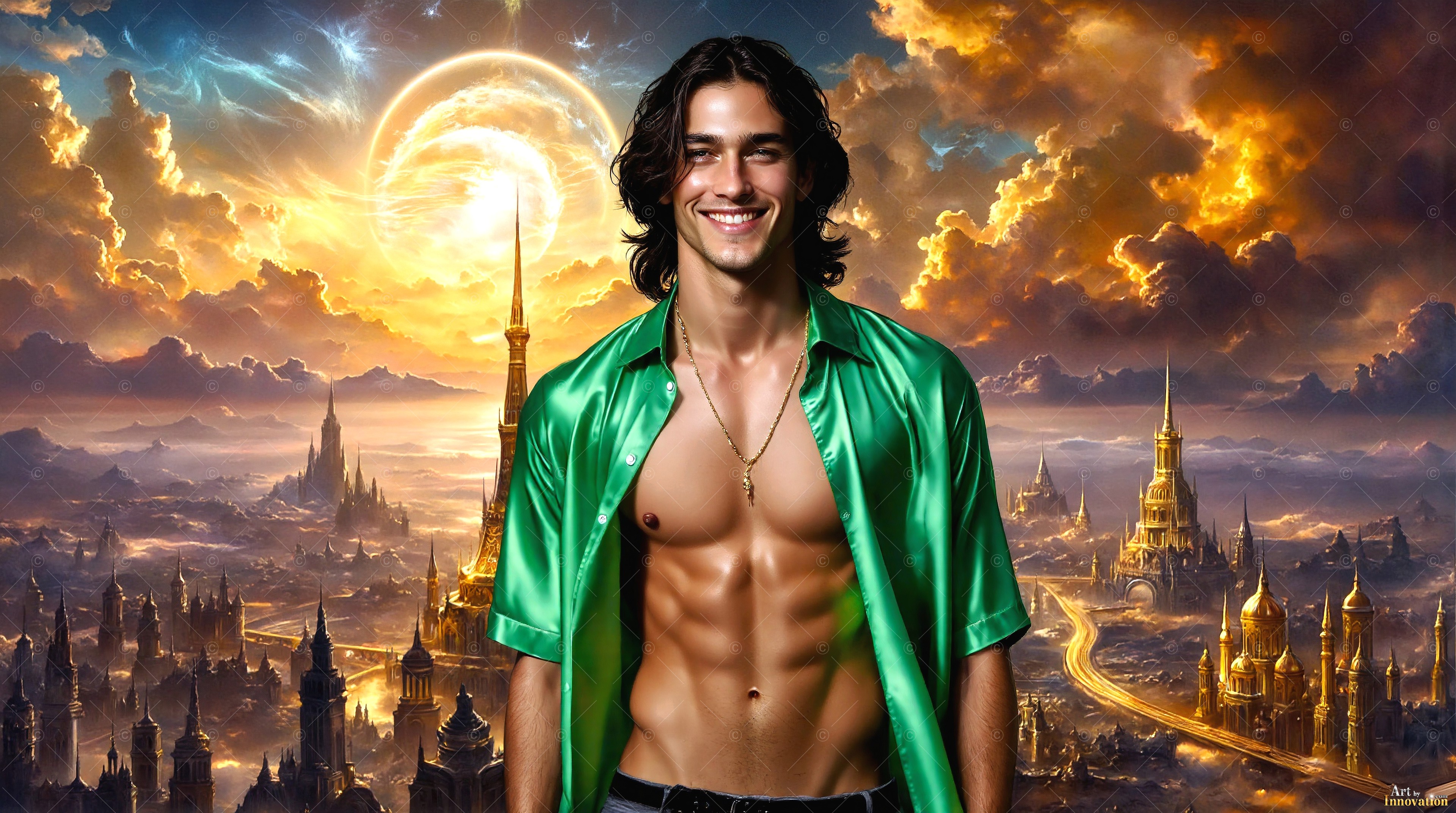 ByJDThe Beautiful Young Men of the Golden City, is a collection of AI generated images of sexy, glamorous, handsome guys in the heavens. In this fantasy photograph of a young men in their 20’s, on a balcony, overlooking a large golden city in the heavens. Generated to be as realistic as possible, in this this fantasy setting, with todays technology. Wearing jeans, an unbuttoned, vibrant, long-sleeve, button down shirt. The subject is enjoying a beautiful day outdoors. The mystical, galactic landscape, and the vibrant cosmic canopies, every detail, from the texture of the clouds, to the magnificent, majestic gothic architecture of the golden city, is crafted to create an atmosphere of reverence and divine glory. With a breathtaking scene of Salar de Uyuni at sunset, offering warm golden hour lighting. The heavenly landscape evokes a sense of freedom and tranquility, that is expresses through his facial features and smile, as day turns to night. The heavenly landscape evokes a sense of mysterious black space and light, with a vast galaxy that almost covers the image, the stars and constellations sparkle bright, in dark blue sky. On occasion the earth can be seen floating in the sky.