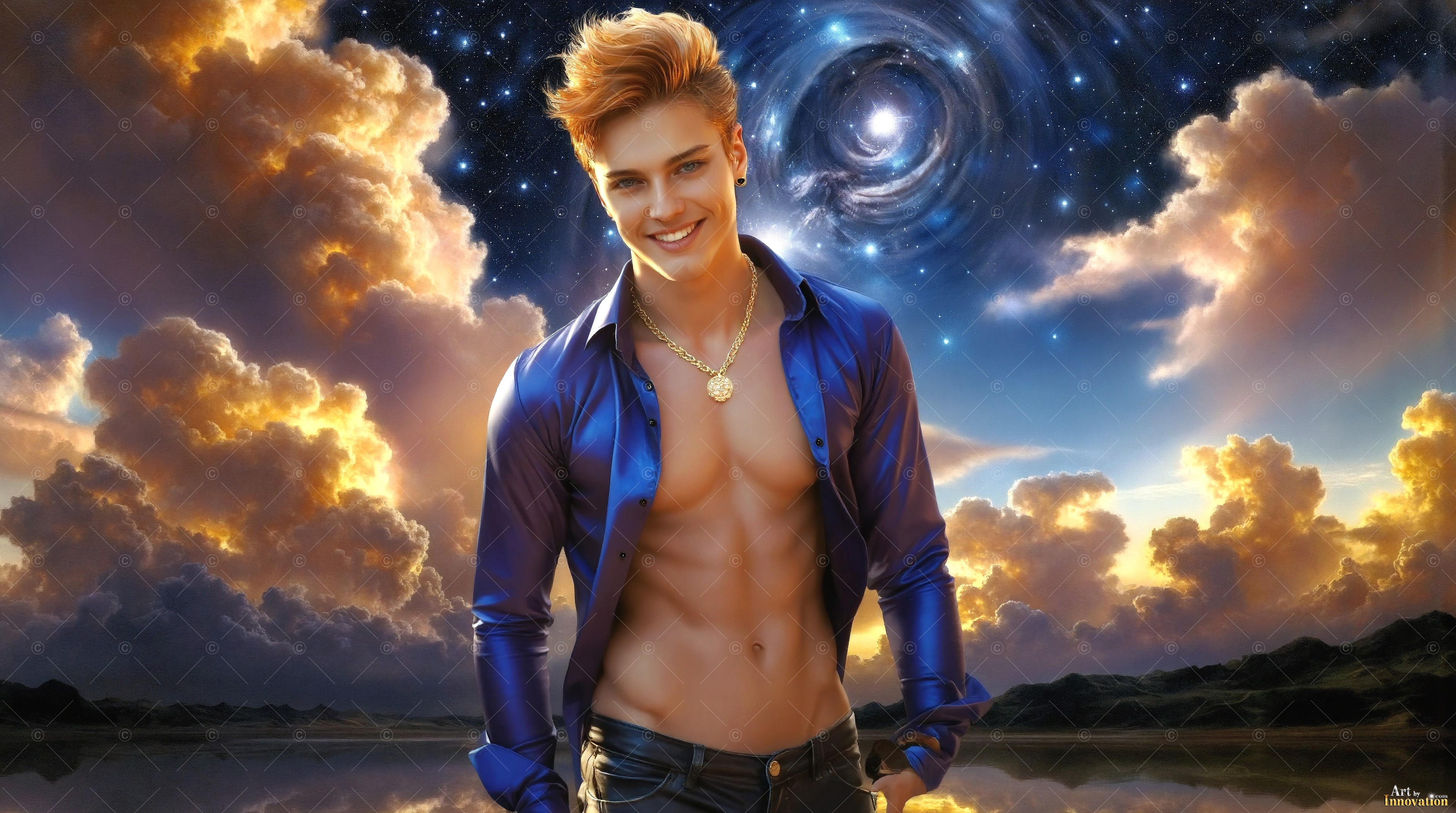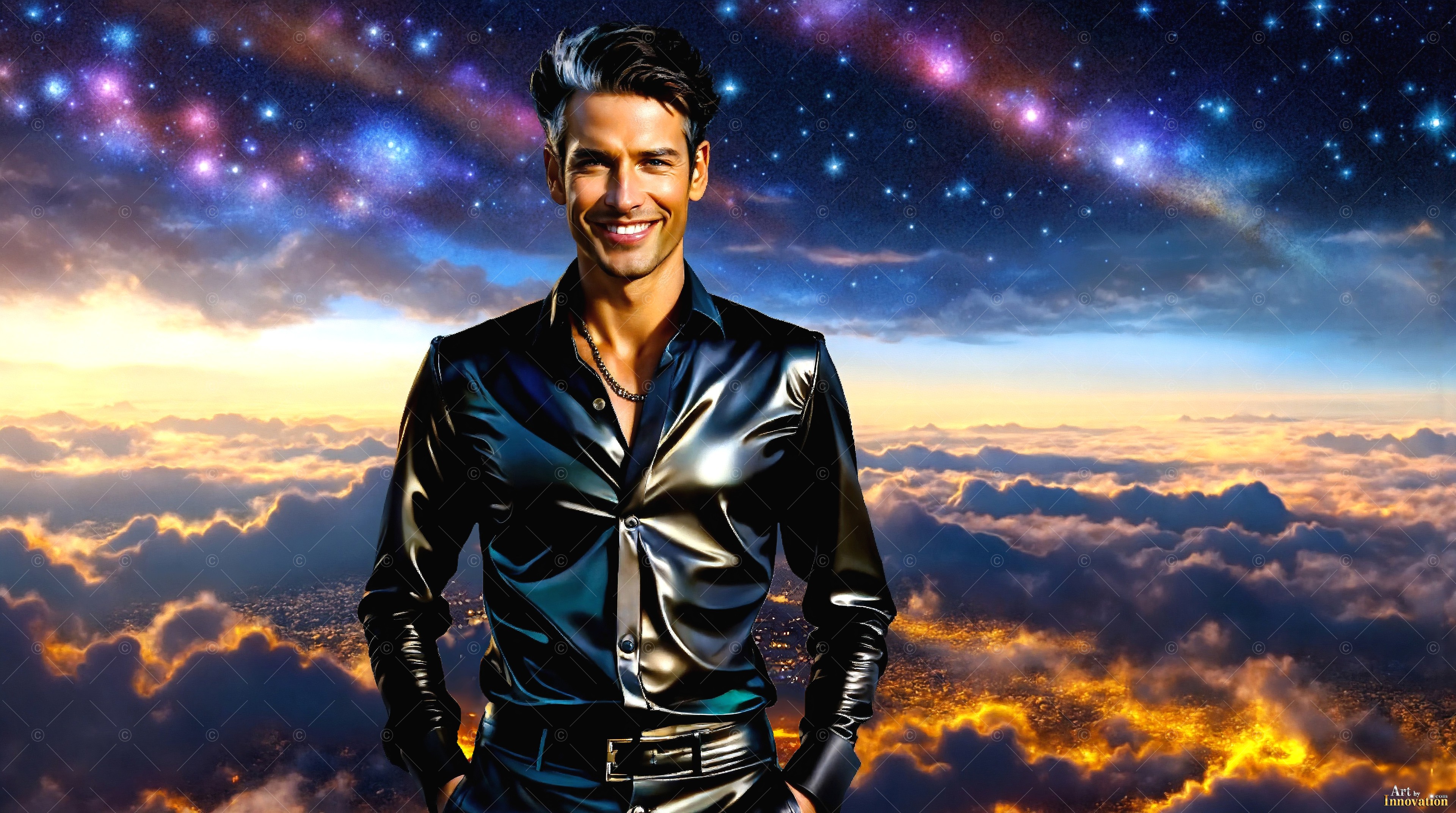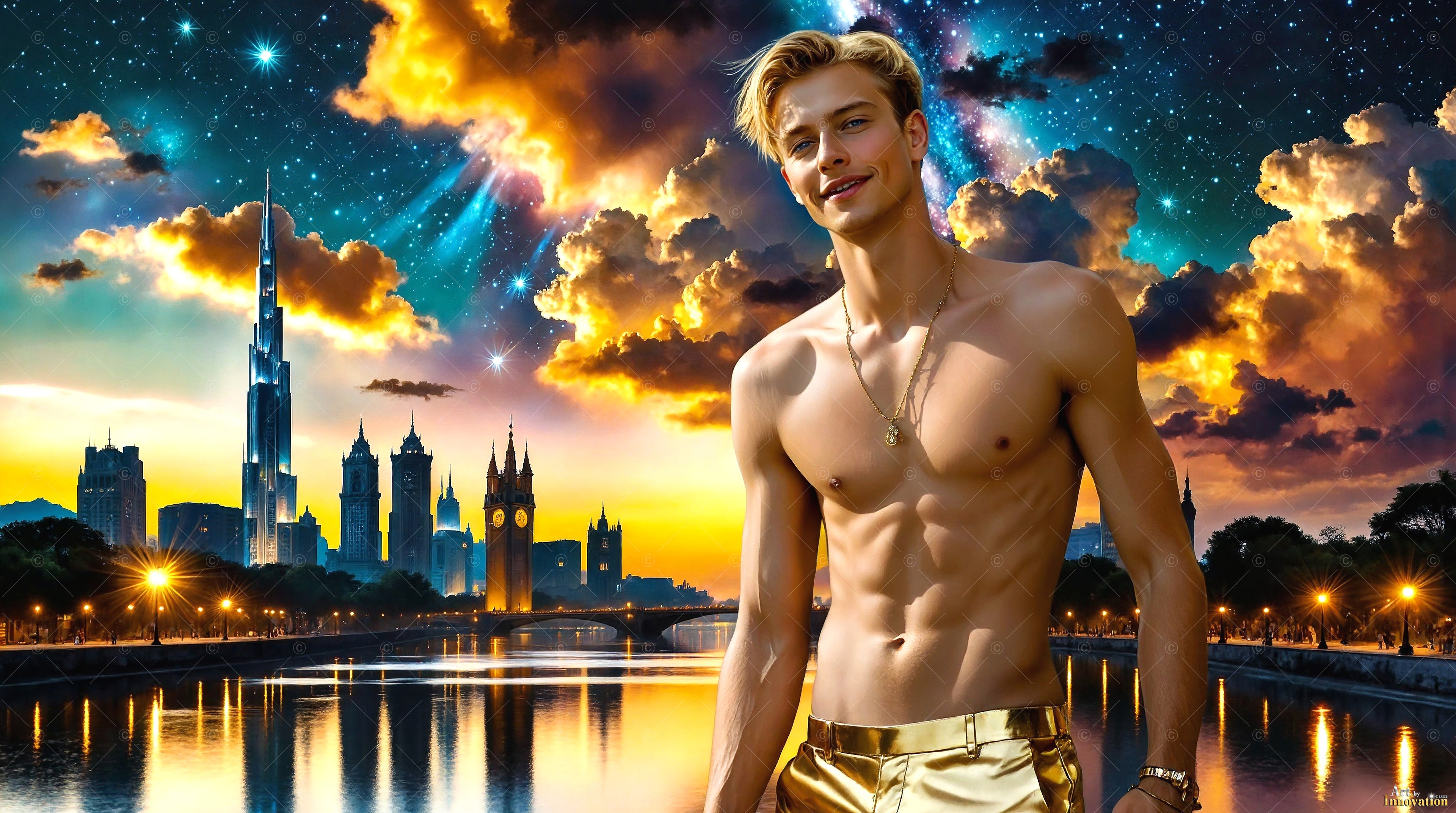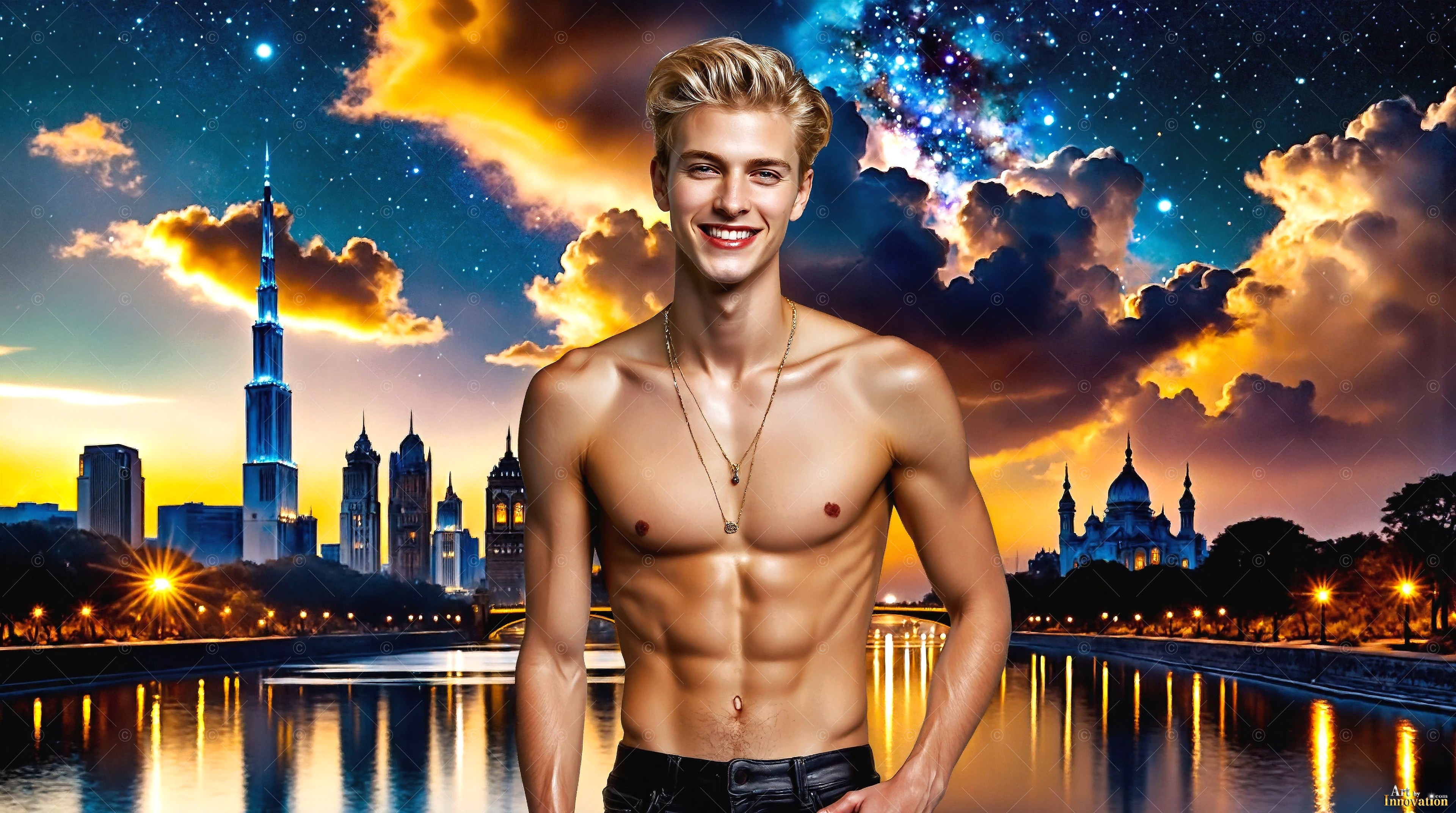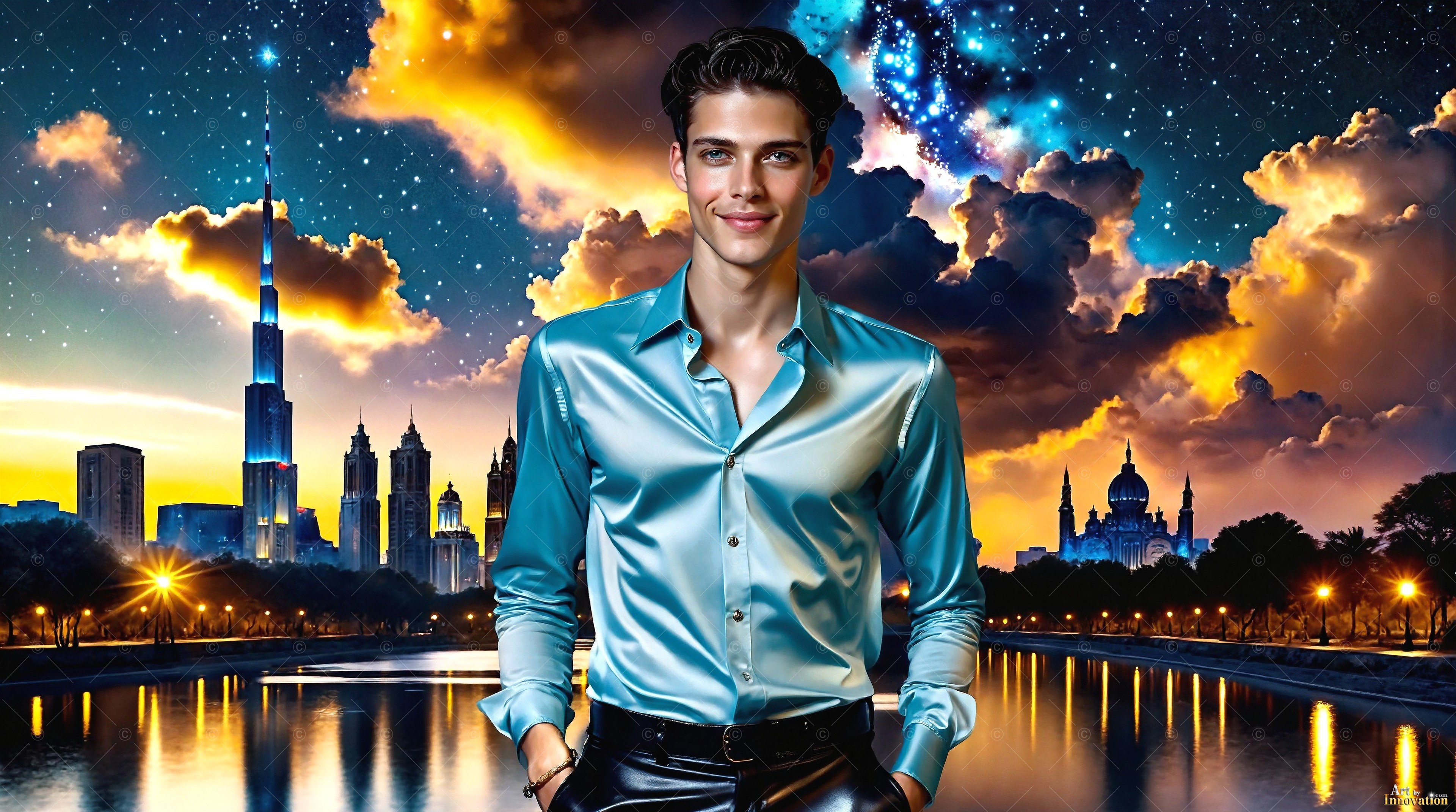 ByJDThe Beautiful Young Men of the Golden City, is a collection of AI generated images of sexy, glamorous, handsome guys in the heavens. In this fantasy photograph of a young men in their 20’s, on a balcony, overlooking a large golden city in the heavens. Generated to be as realistic as possible, in this this fantasy setting, with todays technology. Wearing jeans, an unbuttoned, vibrant, long-sleeve, button down shirt. The subject is enjoying a beautiful day outdoors. The mystical, galactic landscape, and the vibrant cosmic canopies, every detail, from the texture of the clouds, to the magnificent, majestic gothic architecture of the golden city, is crafted to create an atmosphere of reverence and divine glory. With a breathtaking scene of Salar de Uyuni at sunset, offering warm golden hour lighting. The heavenly landscape evokes a sense of freedom and tranquility, that is expresses through his facial features and smile, as day turns to night. The heavenly landscape evokes a sense of mysterious black space and light, with a vast galaxy that almost covers the image, the stars and constellations sparkle bright, in dark blue sky. On occasion the earth can be seen floating in the sky.