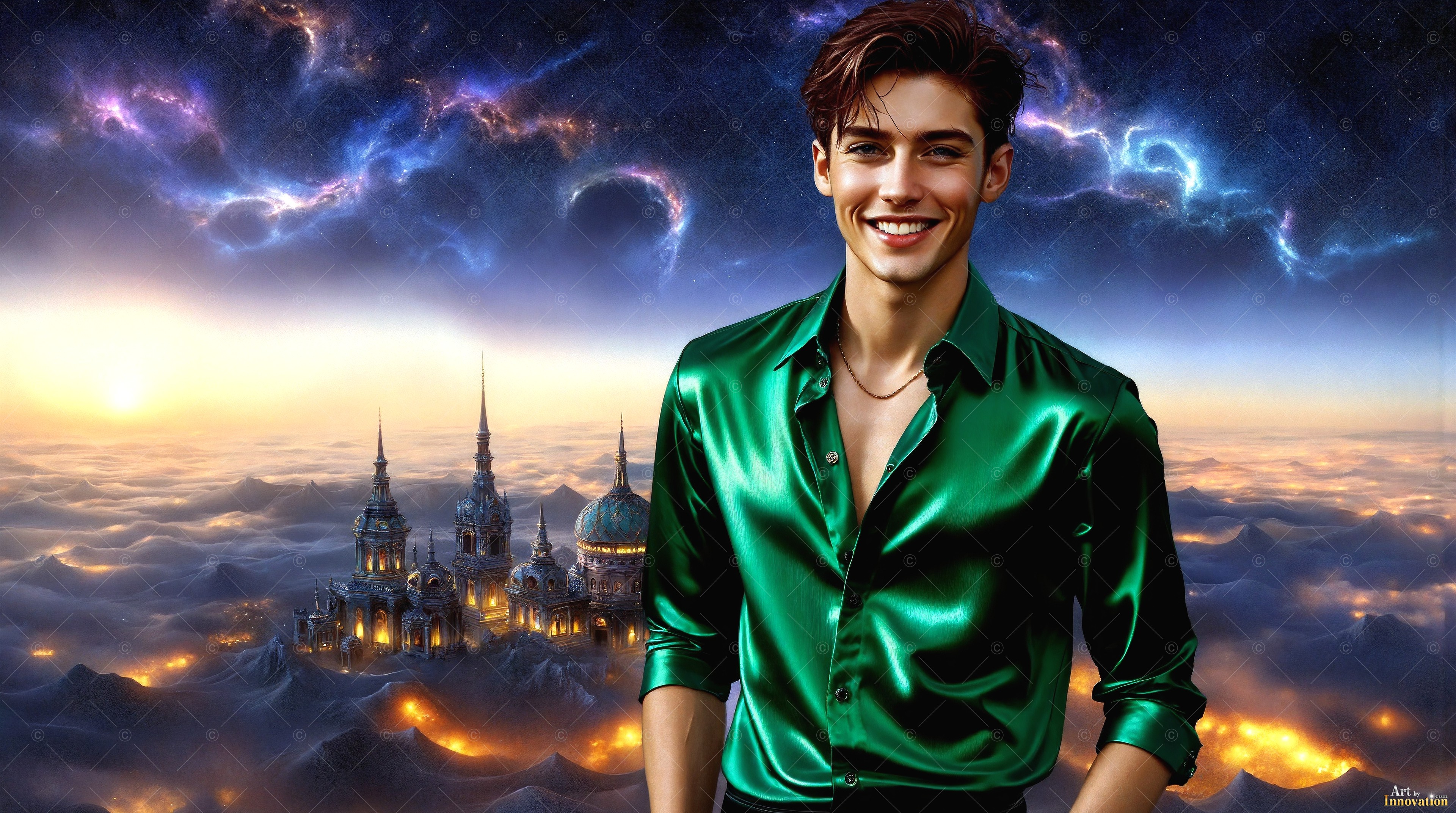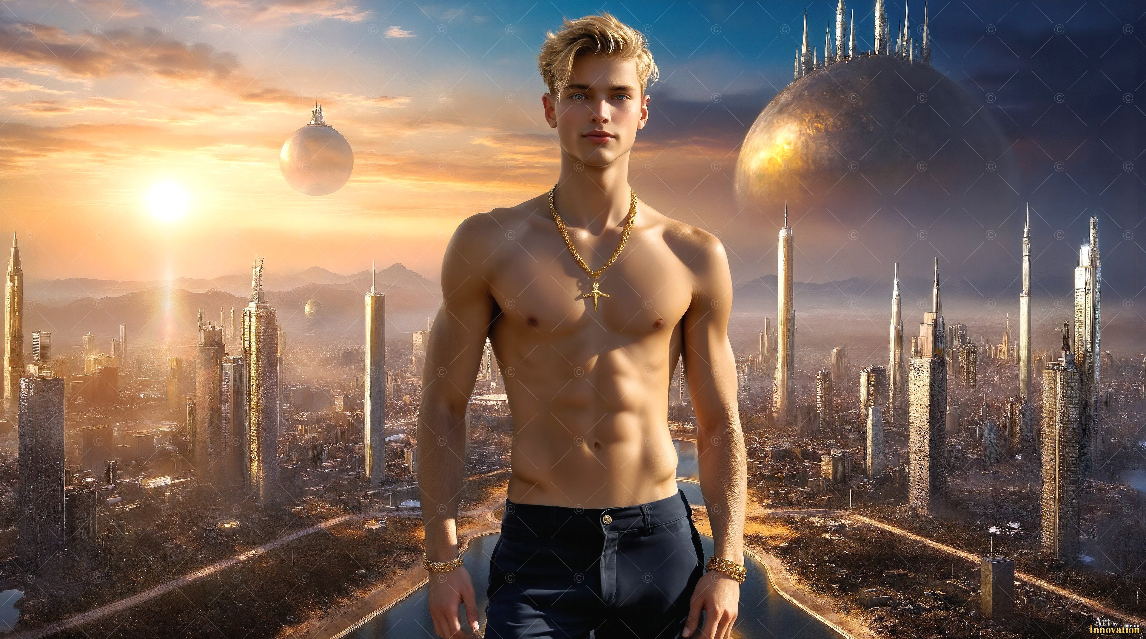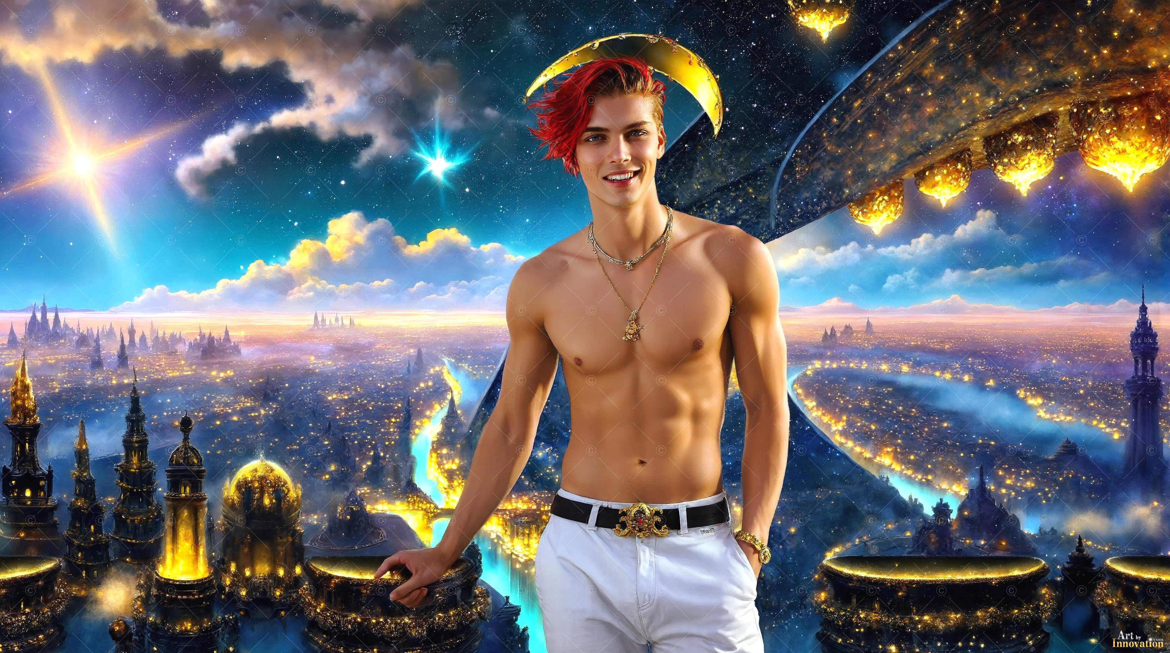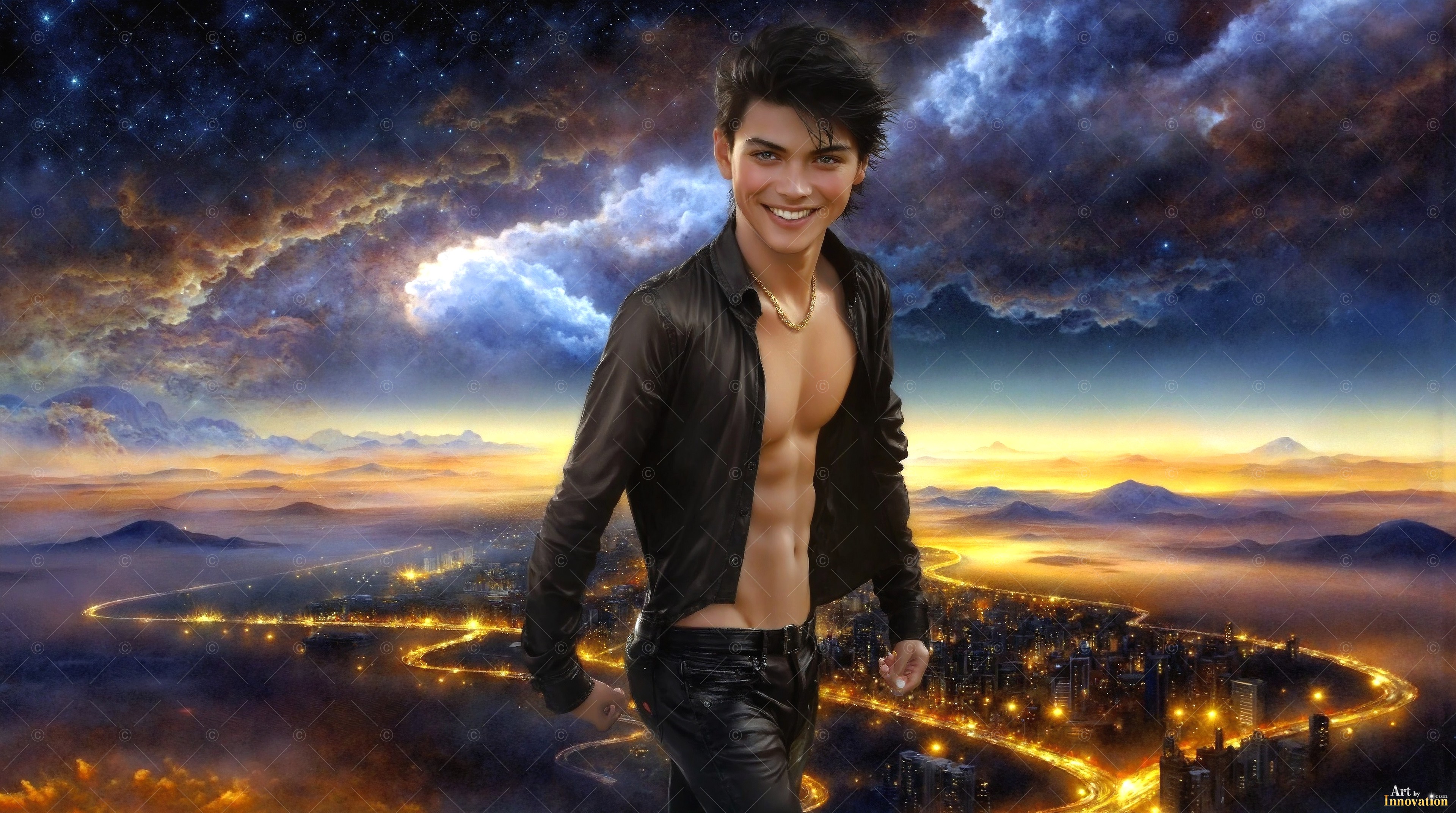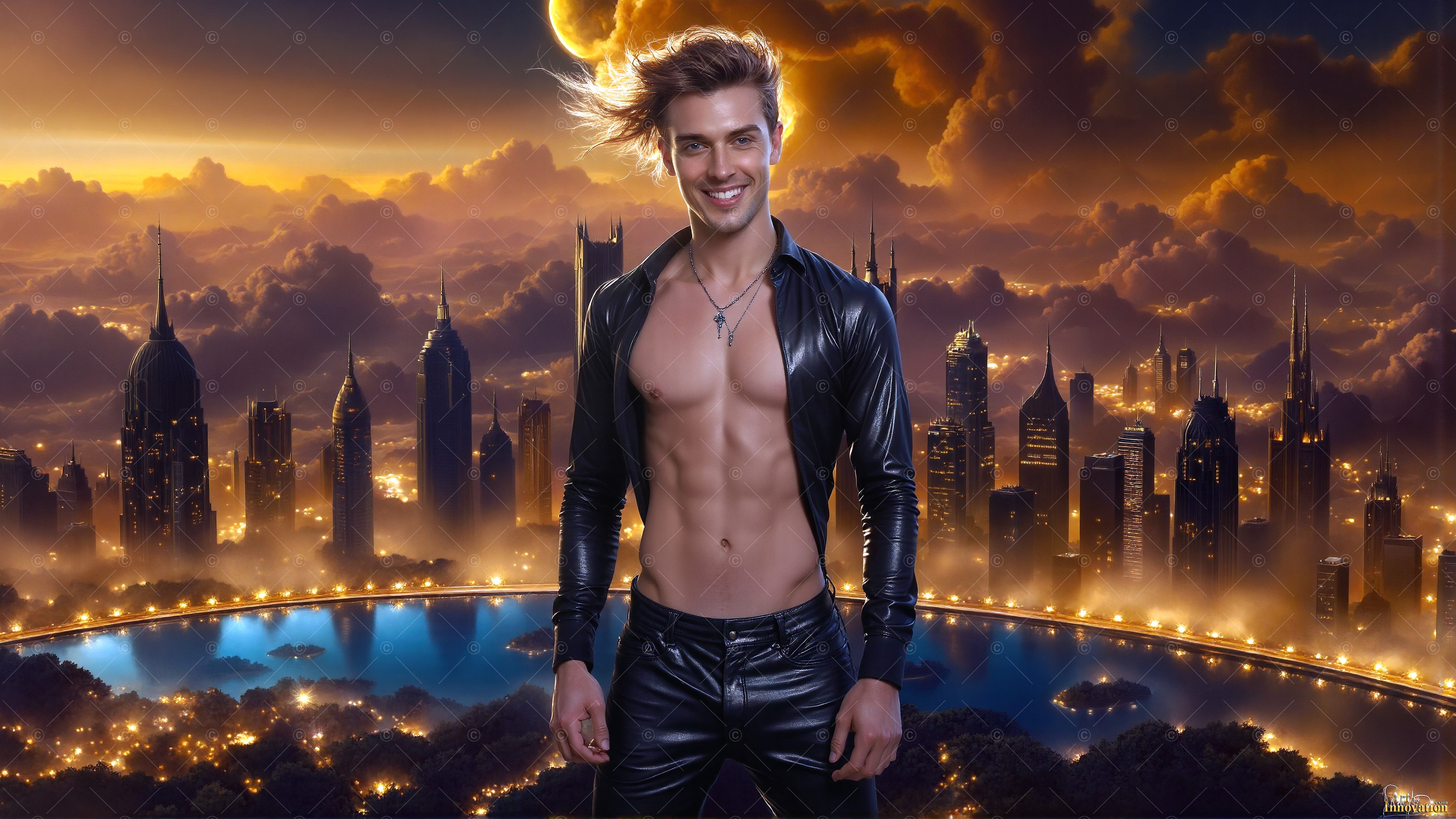 ByJDThe Beautiful Young Men of the Golden City, is a collection of AI generated images of sexy, glamorous, handsome guys in the heavens. In this fantasy photograph of a young men in their 20’s, on a balcony, overlooking a large golden city in the heavens. Generated to be as realistic as possible, in this this fantasy setting, with todays technology. Wearing jeans, an unbuttoned, vibrant, long-sleeve, button down shirt. The subject is enjoying a beautiful day outdoors. The mystical, galactic landscape, and the vibrant cosmic canopies, every detail, from the texture of the clouds, to the magnificent, majestic gothic architecture of the golden city, is crafted to create an atmosphere of reverence and divine glory. With a breathtaking scene of Salar de Uyuni at sunset, offering warm golden hour lighting. The heavenly landscape evokes a sense of freedom and tranquility, that is expresses through his facial features and smile, as day turns to night. The heavenly landscape evokes a sense of mysterious black space and light, with a vast galaxy that almost covers the image, the stars and constellations sparkle bright, in dark blue sky. On occasion the earth can be seen floating in the sky.