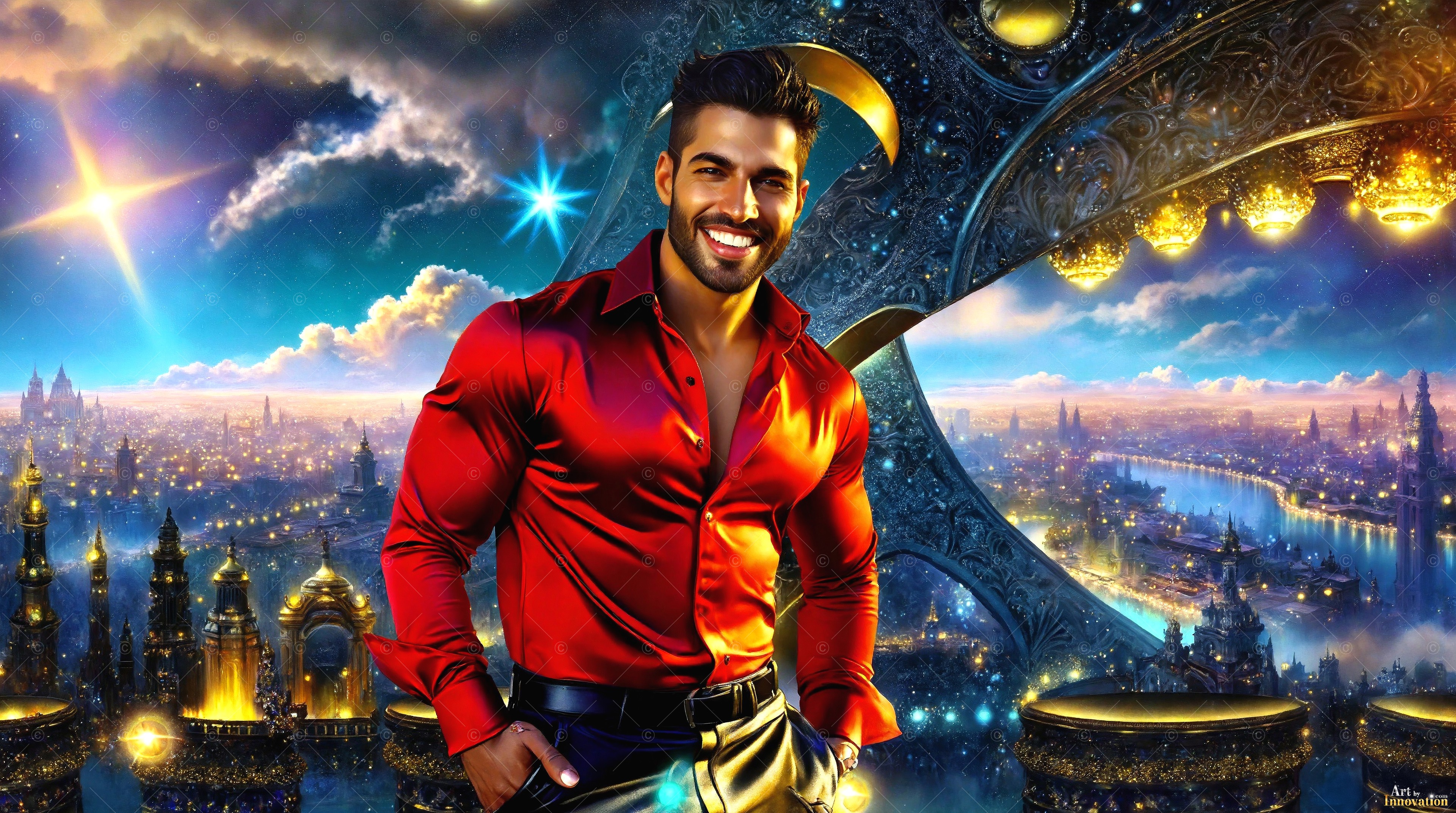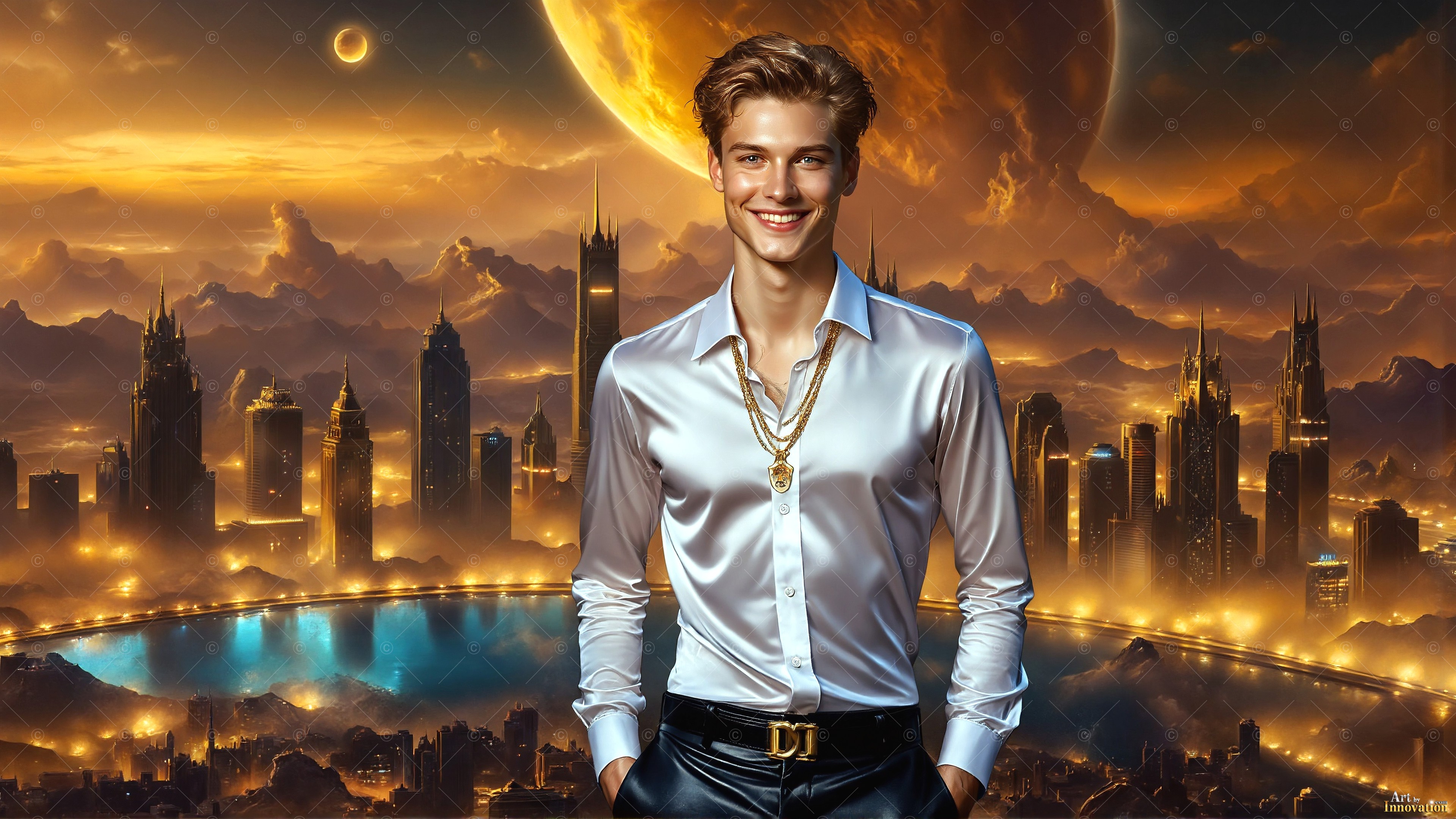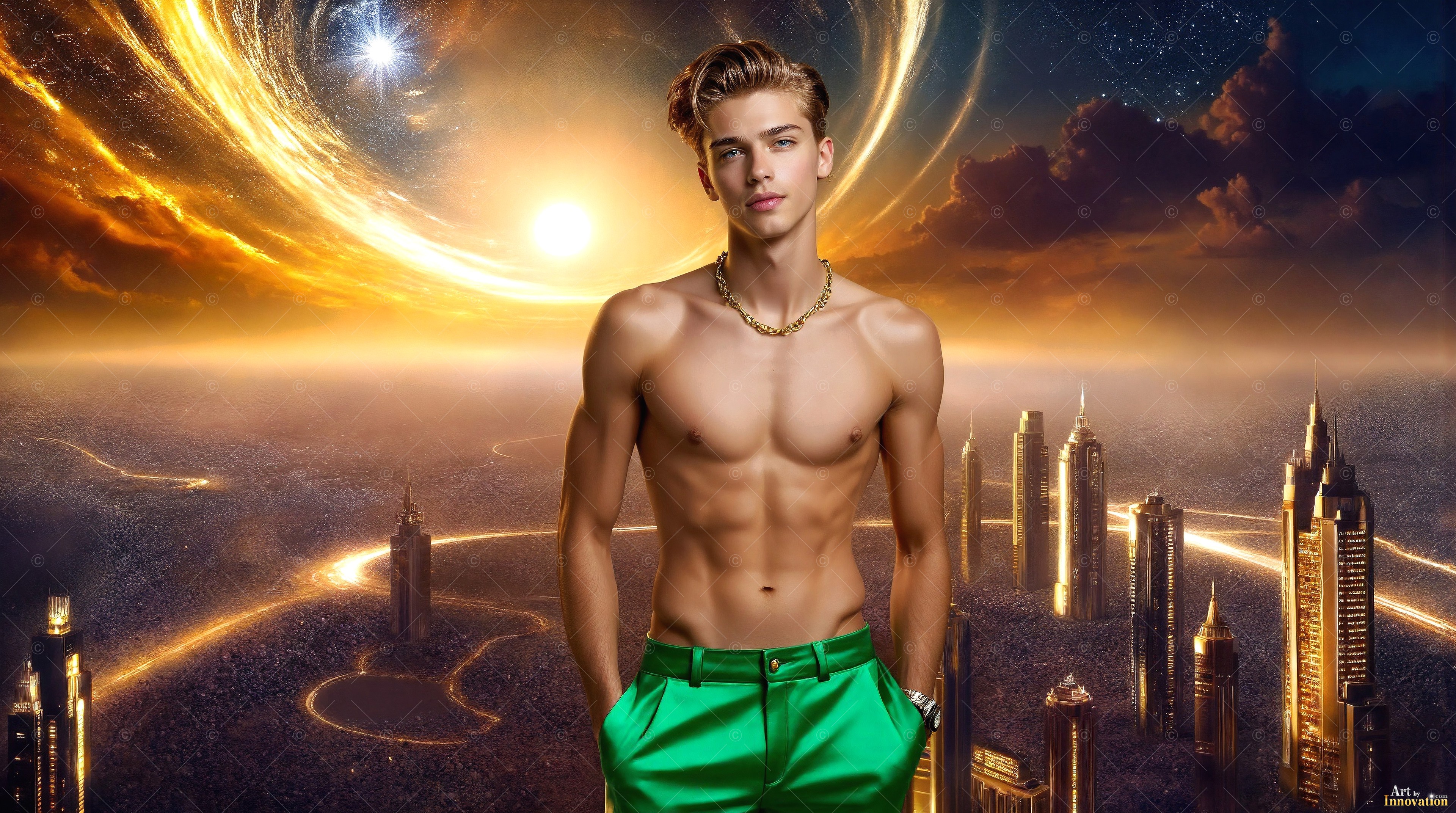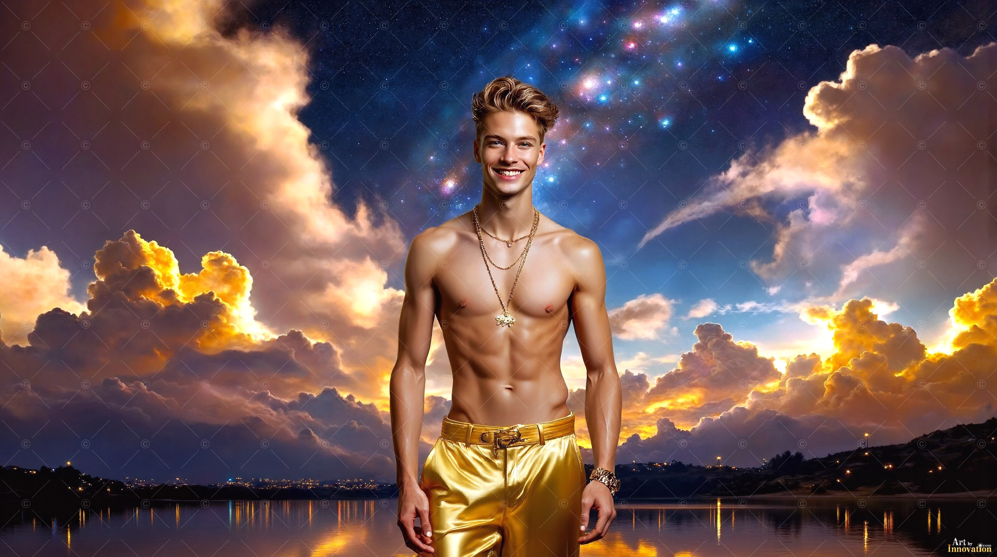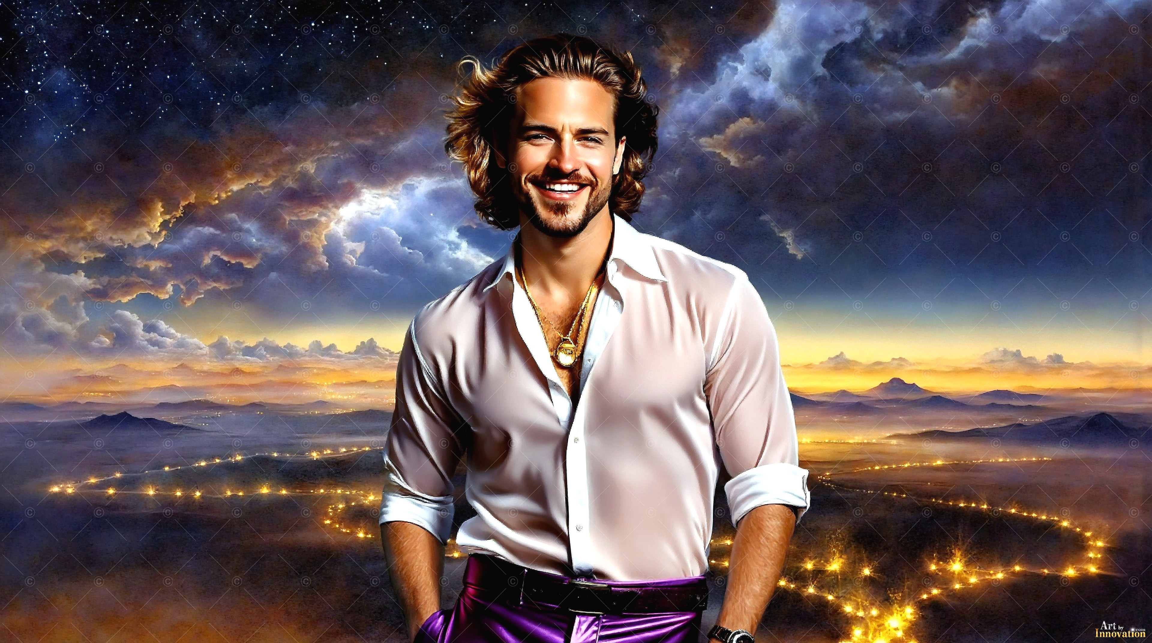 ByJDThe Beautiful Young Men of the Golden City, is a collection of AI generated images of sexy, glamorous, handsome guys in the heavens. In this fantasy photograph of a young men in their 20’s, on a balcony, overlooking a large golden city in the heavens. Generated to be as realistic as possible, in this this fantasy setting, with todays technology. Wearing jeans, an unbuttoned, vibrant, long-sleeve, button down shirt. The subject is enjoying a beautiful day outdoors. The mystical, galactic landscape, and the vibrant cosmic canopies, every detail, from the texture of the clouds, to the magnificent, majestic gothic architecture of the golden city, is crafted to create an atmosphere of reverence and divine glory. With a breathtaking scene of Salar de Uyuni at sunset, offering warm golden hour lighting. The heavenly landscape evokes a sense of freedom and tranquility, that is expresses through his facial features and smile, as day turns to night. The heavenly landscape evokes a sense of mysterious black space and light, with a vast galaxy that almost covers the image, the stars and constellations sparkle bright, in dark blue sky. On occasion the earth can be seen floating in the sky.