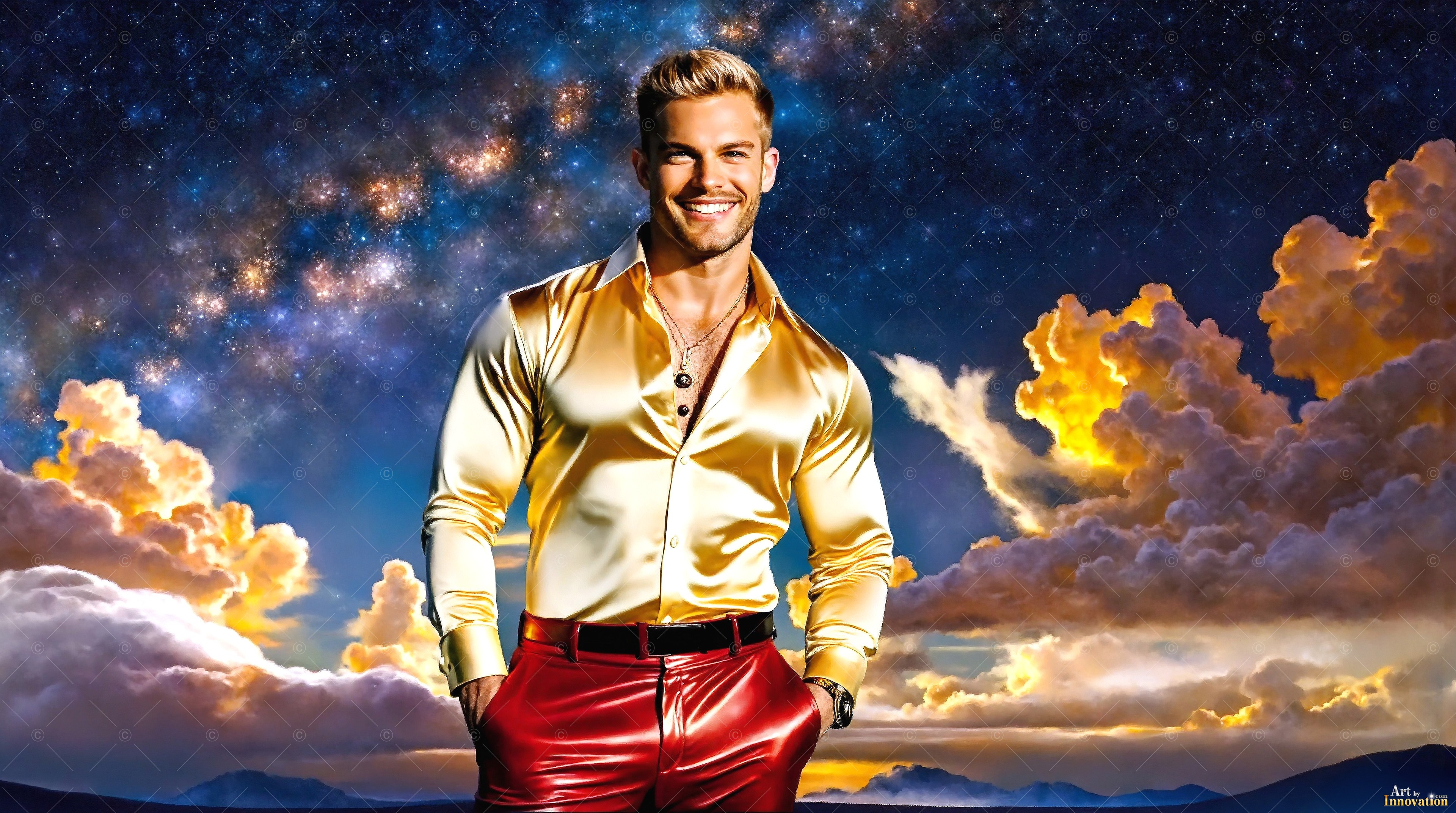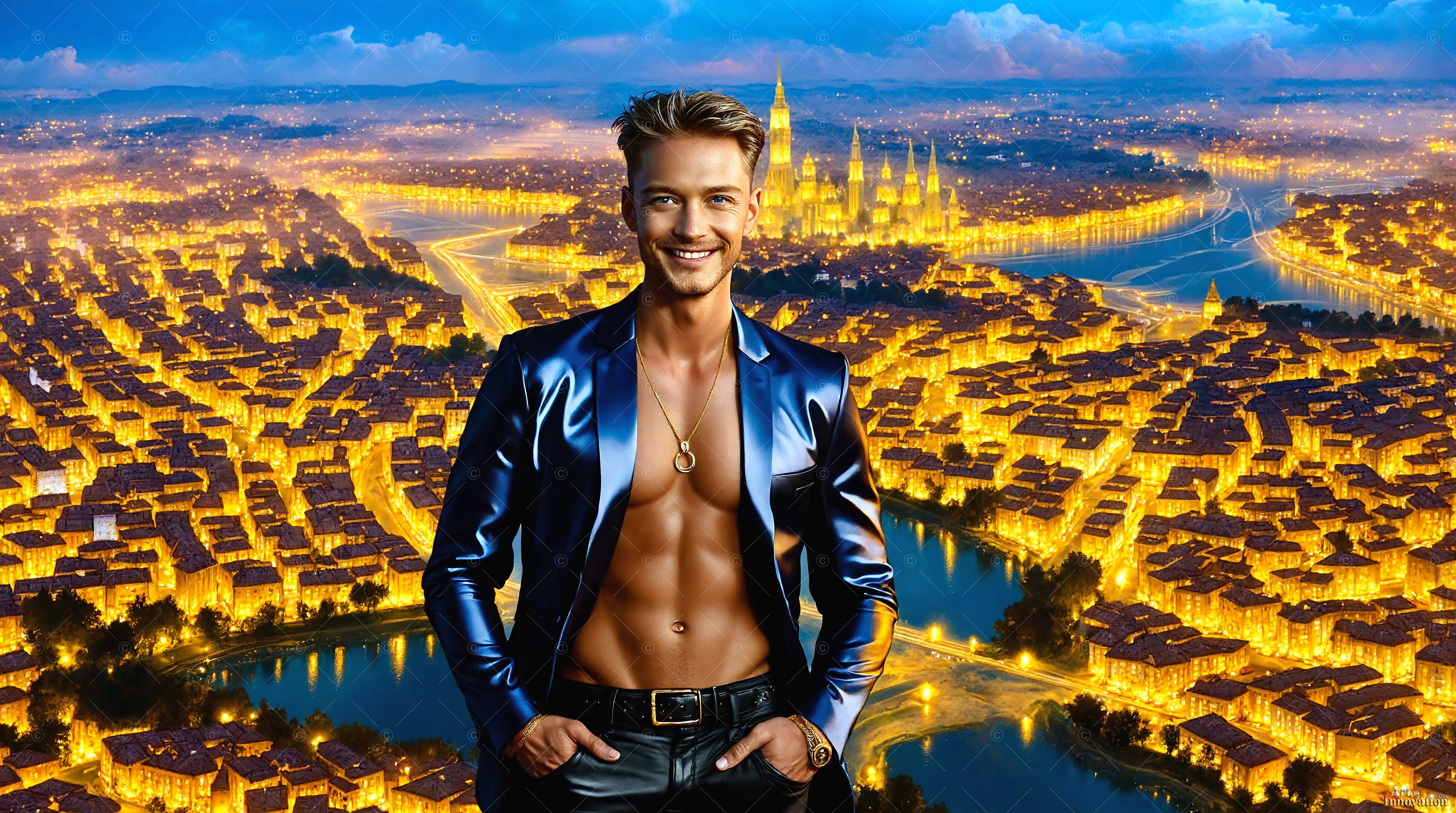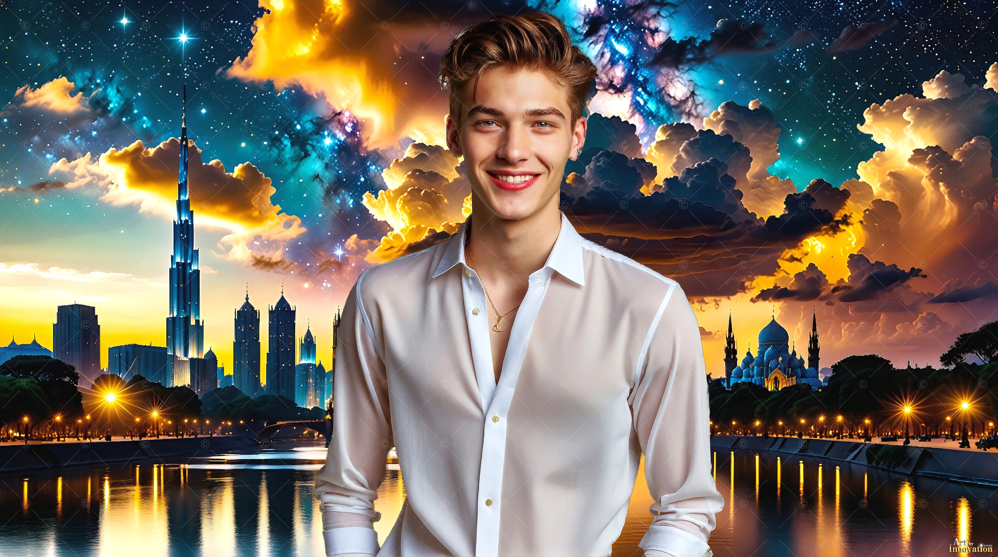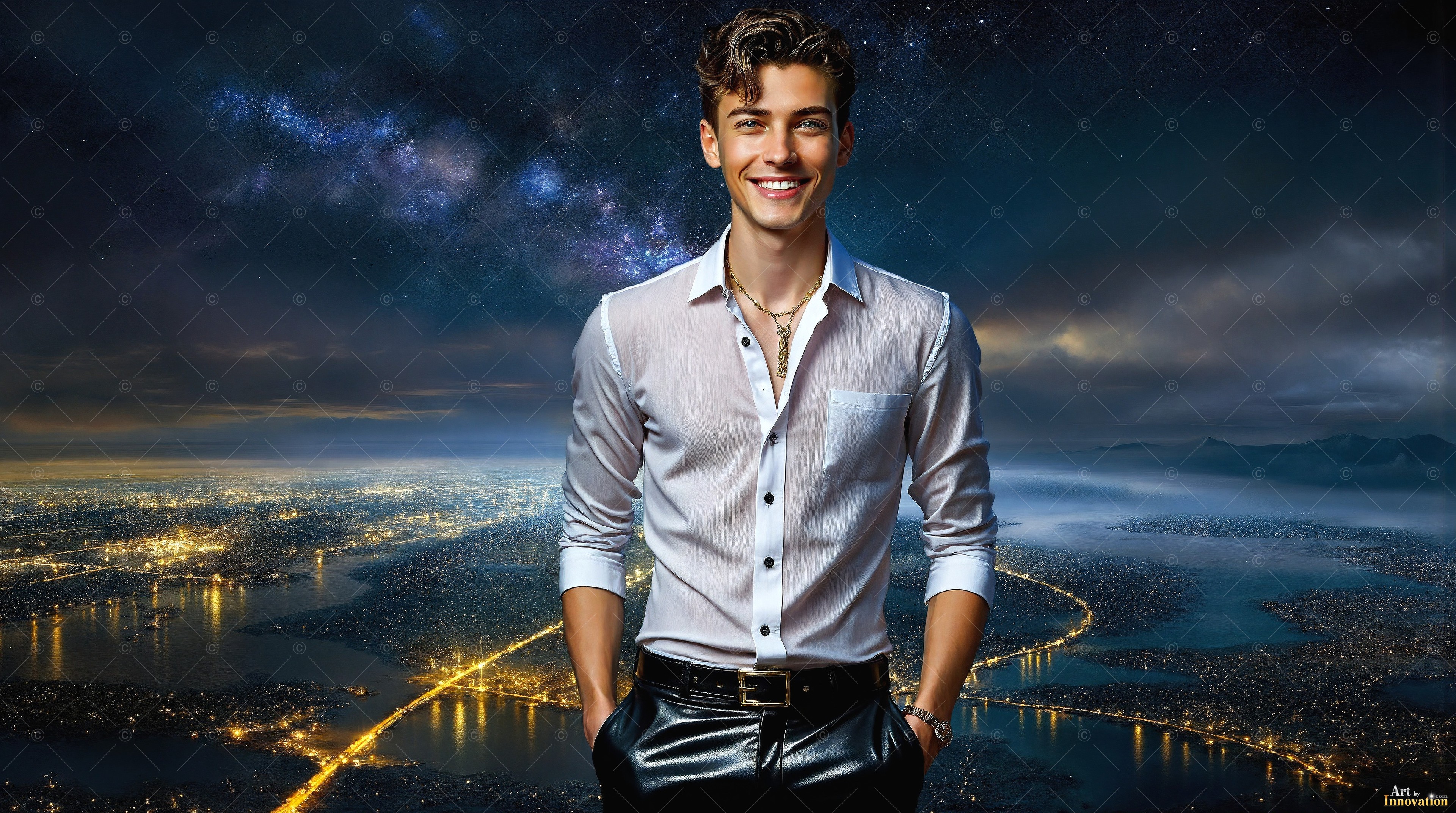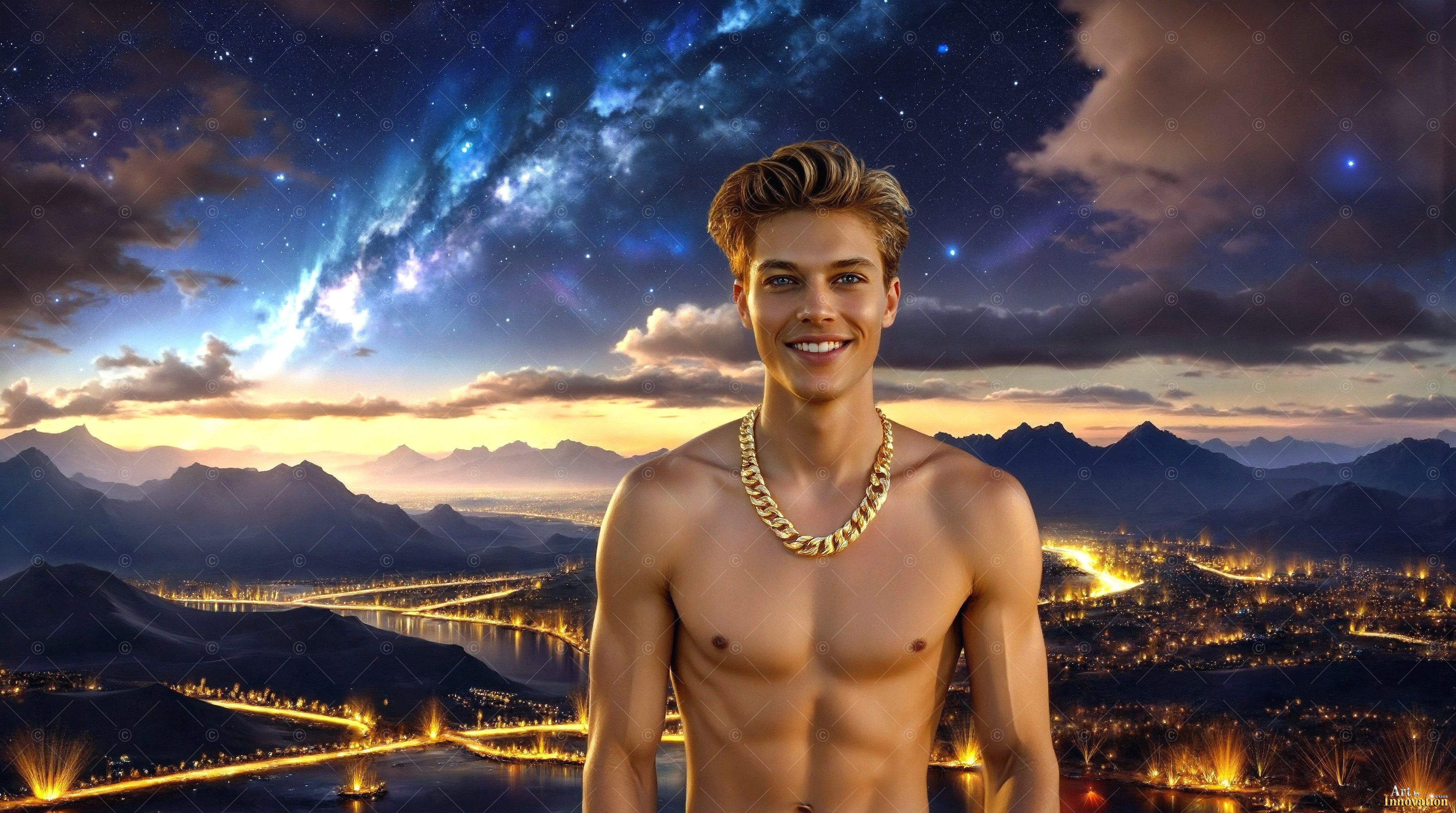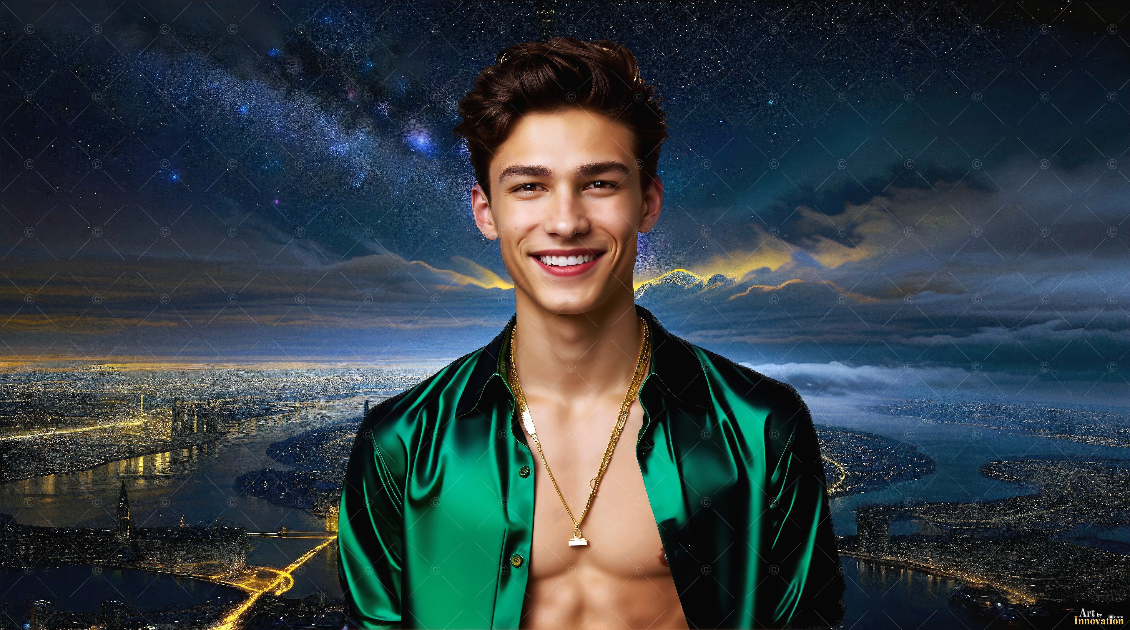 ByJDThe Beautiful Young Men of the Golden City, is a collection of AI generated images of sexy, glamorous, handsome guys in the heavens. In this fantasy photograph of a young men in their 20’s, on a balcony, overlooking a large golden city in the heavens. Generated to be as realistic as possible, in this this fantasy setting, with todays technology. Wearing jeans, an unbuttoned, vibrant, long-sleeve, button down shirt. The subject is enjoying a beautiful day outdoors. The mystical, galactic landscape, and the vibrant cosmic canopies, every detail, from the texture of the clouds, to the magnificent, majestic gothic architecture of the golden city, is crafted to create an atmosphere of reverence and divine glory. With a breathtaking scene of Salar de Uyuni at sunset, offering warm golden hour lighting. The heavenly landscape evokes a sense of freedom and tranquility, that is expresses through his facial features and smile, as day turns to night. The heavenly landscape evokes a sense of mysterious black space and light, with a vast galaxy that almost covers the image, the stars and constellations sparkle bright, in dark blue sky. On occasion the earth can be seen floating in the sky.