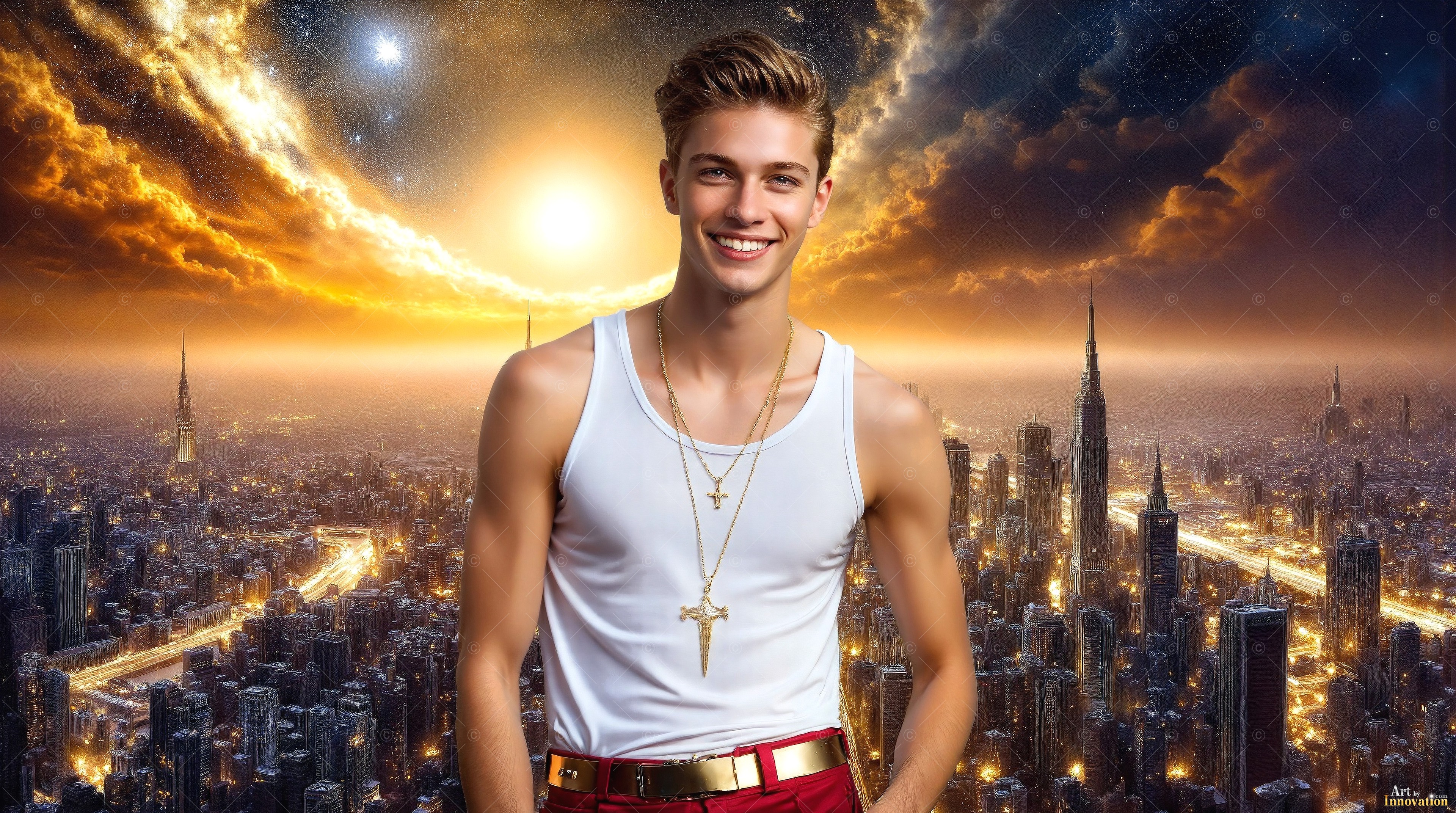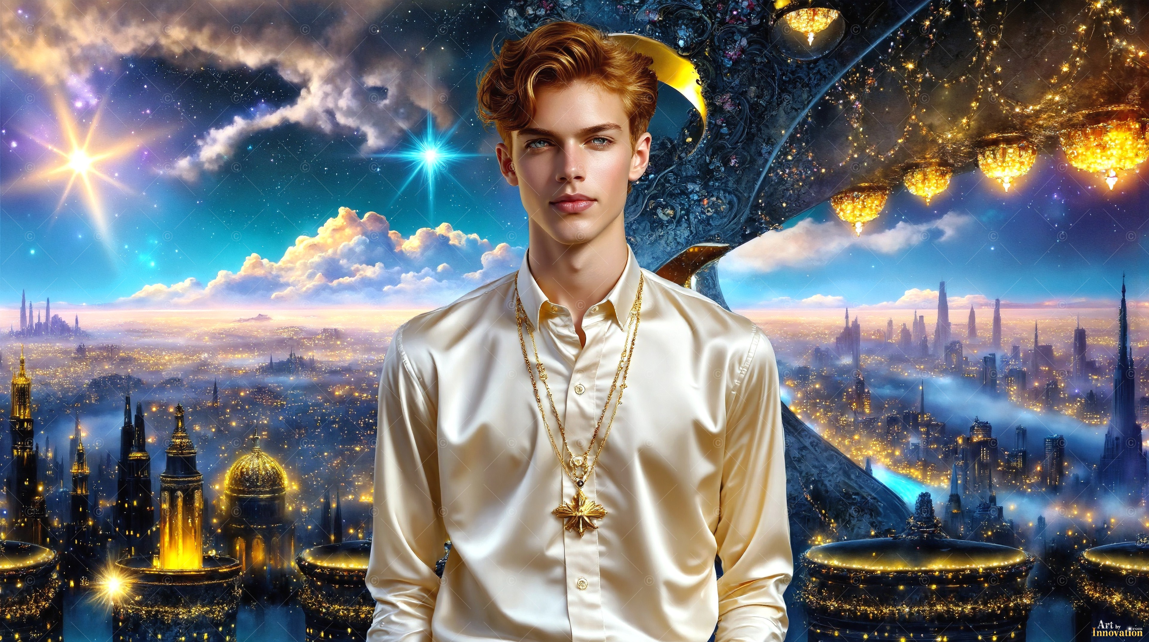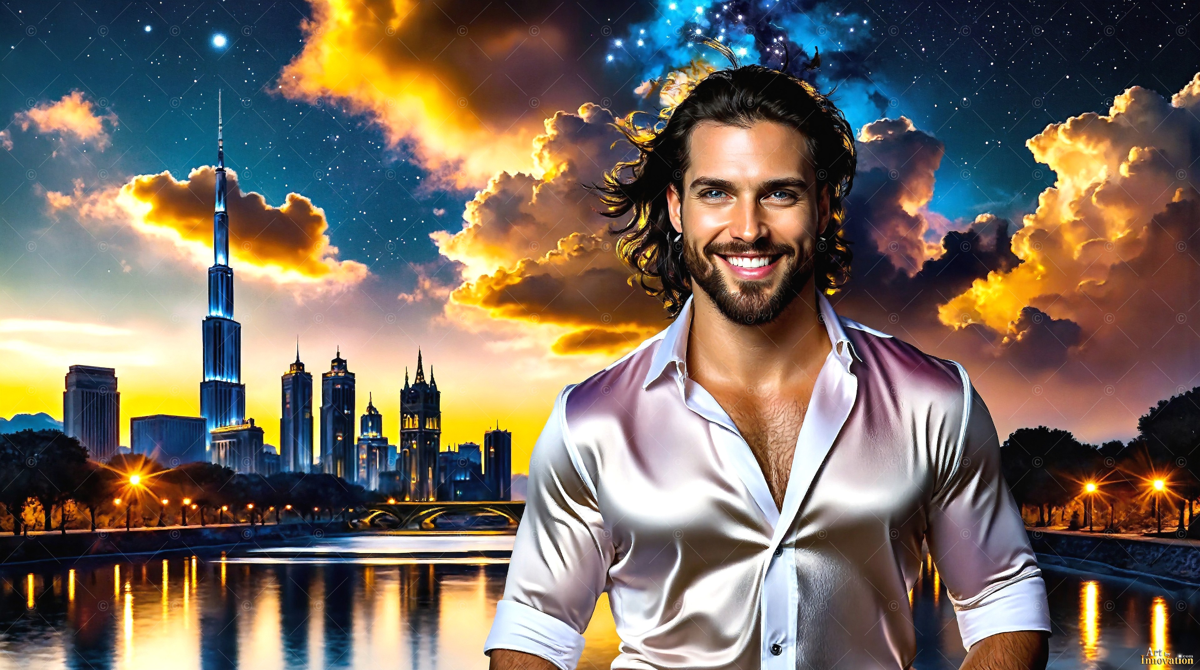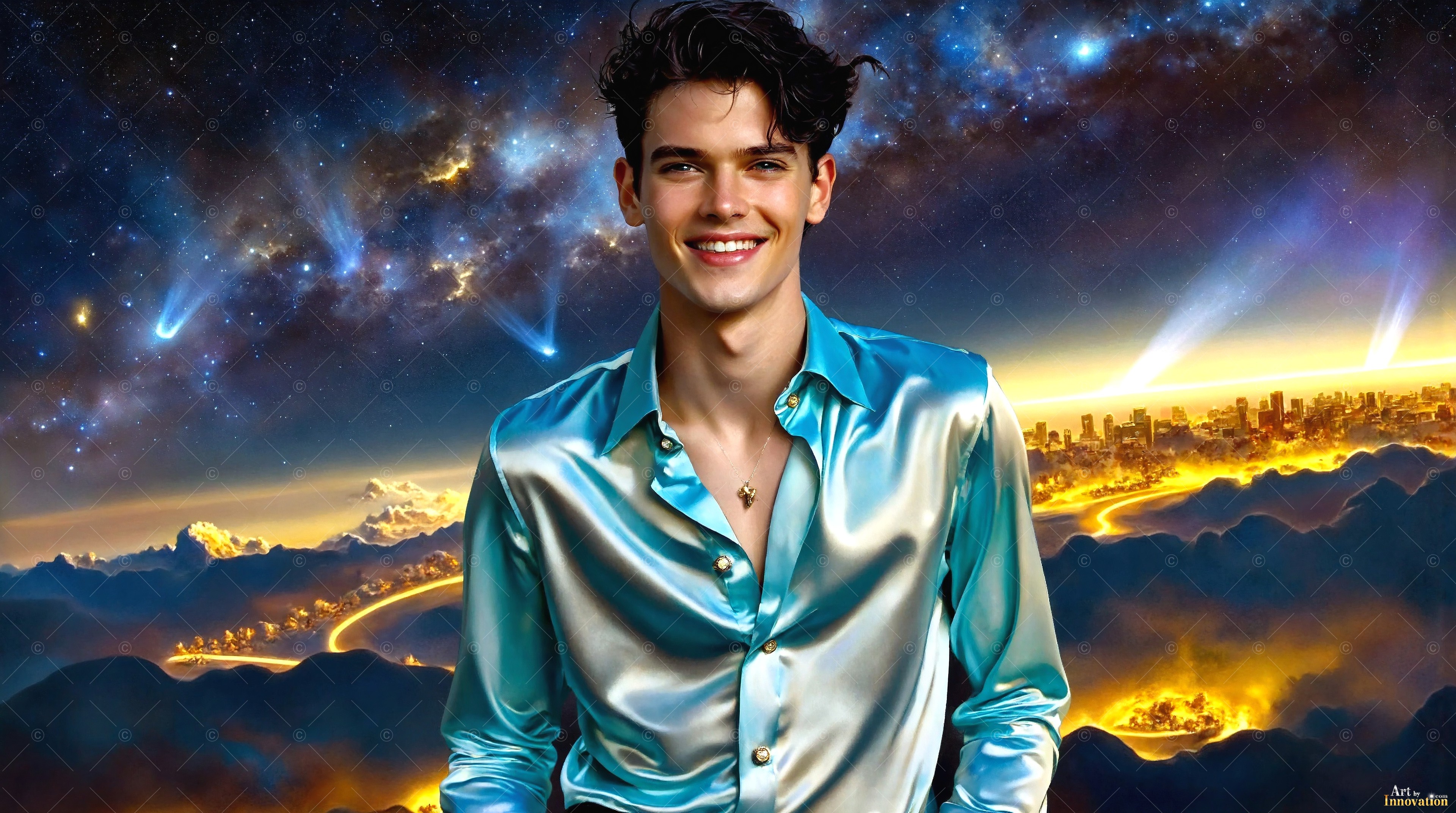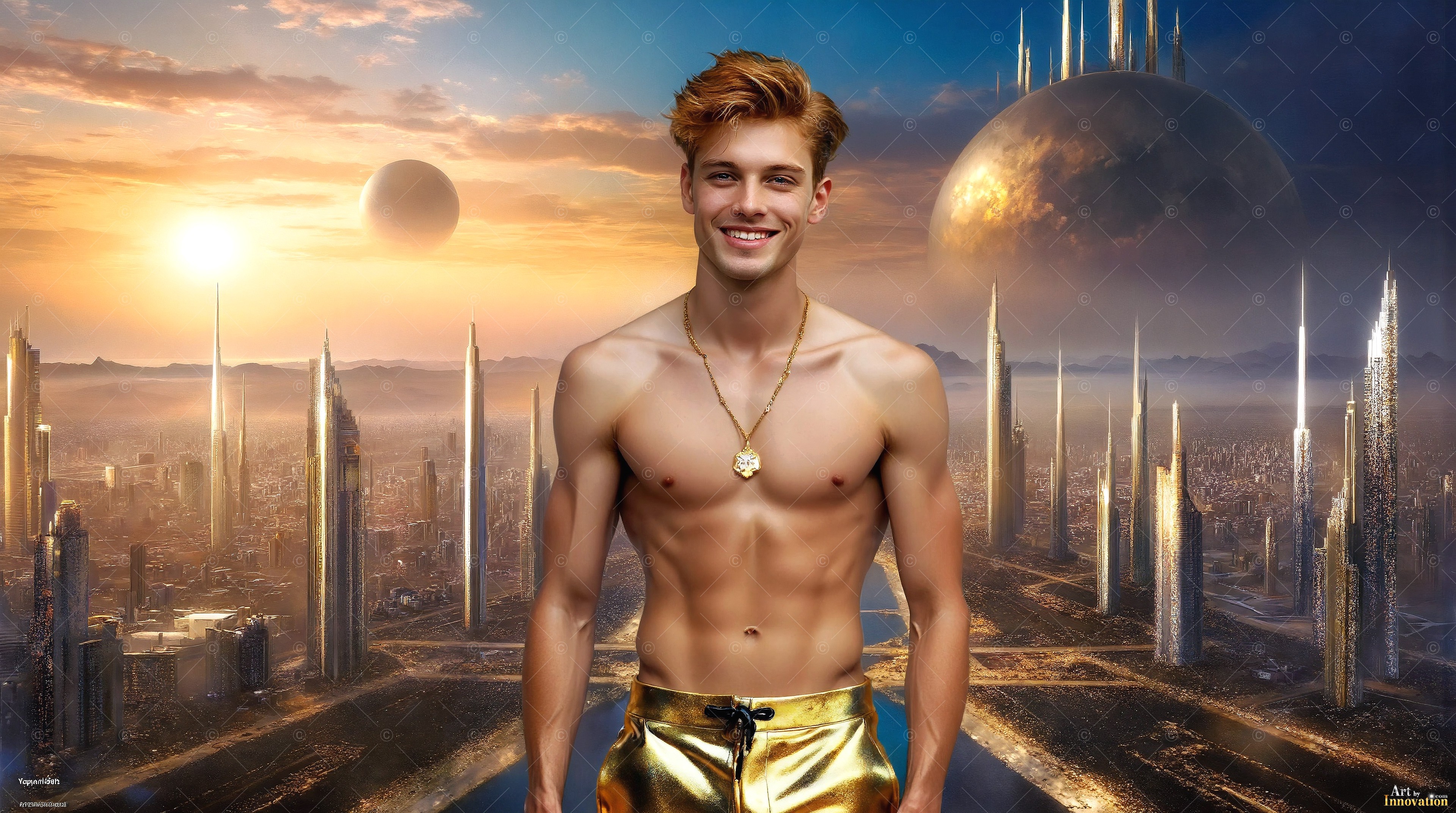 ByJDThe Beautiful Young Men of the Golden City, is a collection of AI generated images of sexy, glamorous, handsome guys in the heavens. In this fantasy photograph of a young men in their 20’s, on a balcony, overlooking a large golden city in the heavens. Generated to be as realistic as possible, in this this fantasy setting, with todays technology. Wearing jeans, an unbuttoned, vibrant, long-sleeve, button down shirt. The subject is enjoying a beautiful day outdoors. The mystical, galactic landscape, and the vibrant cosmic canopies, every detail, from the texture of the clouds, to the magnificent, majestic gothic architecture of the golden city, is crafted to create an atmosphere of reverence and divine glory. With a breathtaking scene of Salar de Uyuni at sunset, offering warm golden hour lighting. The heavenly landscape evokes a sense of freedom and tranquility, that is expresses through his facial features and smile, as day turns to night. The heavenly landscape evokes a sense of mysterious black space and light, with a vast galaxy that almost covers the image, the stars and constellations sparkle bright, in dark blue sky. On occasion the earth can be seen floating in the sky.