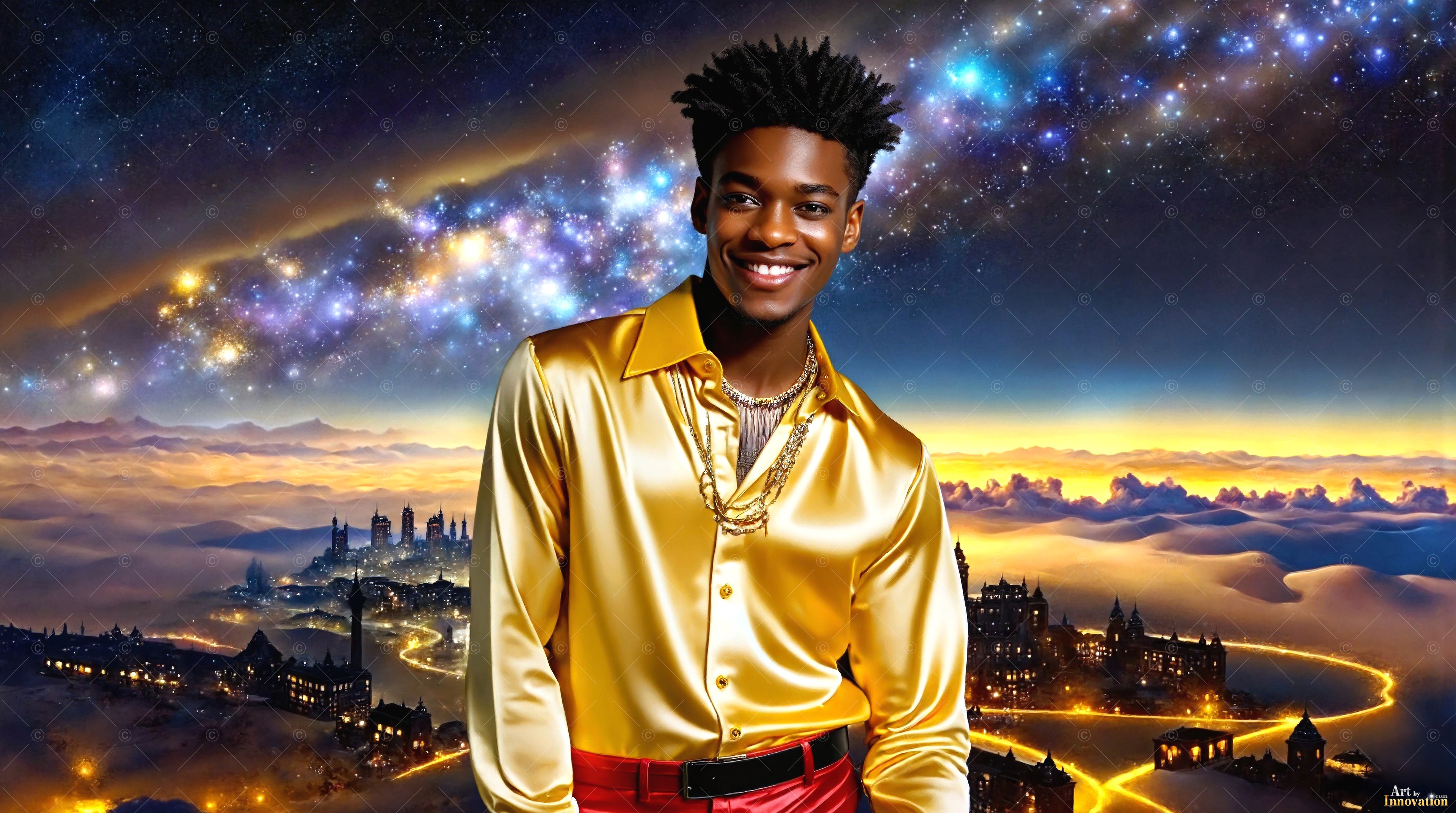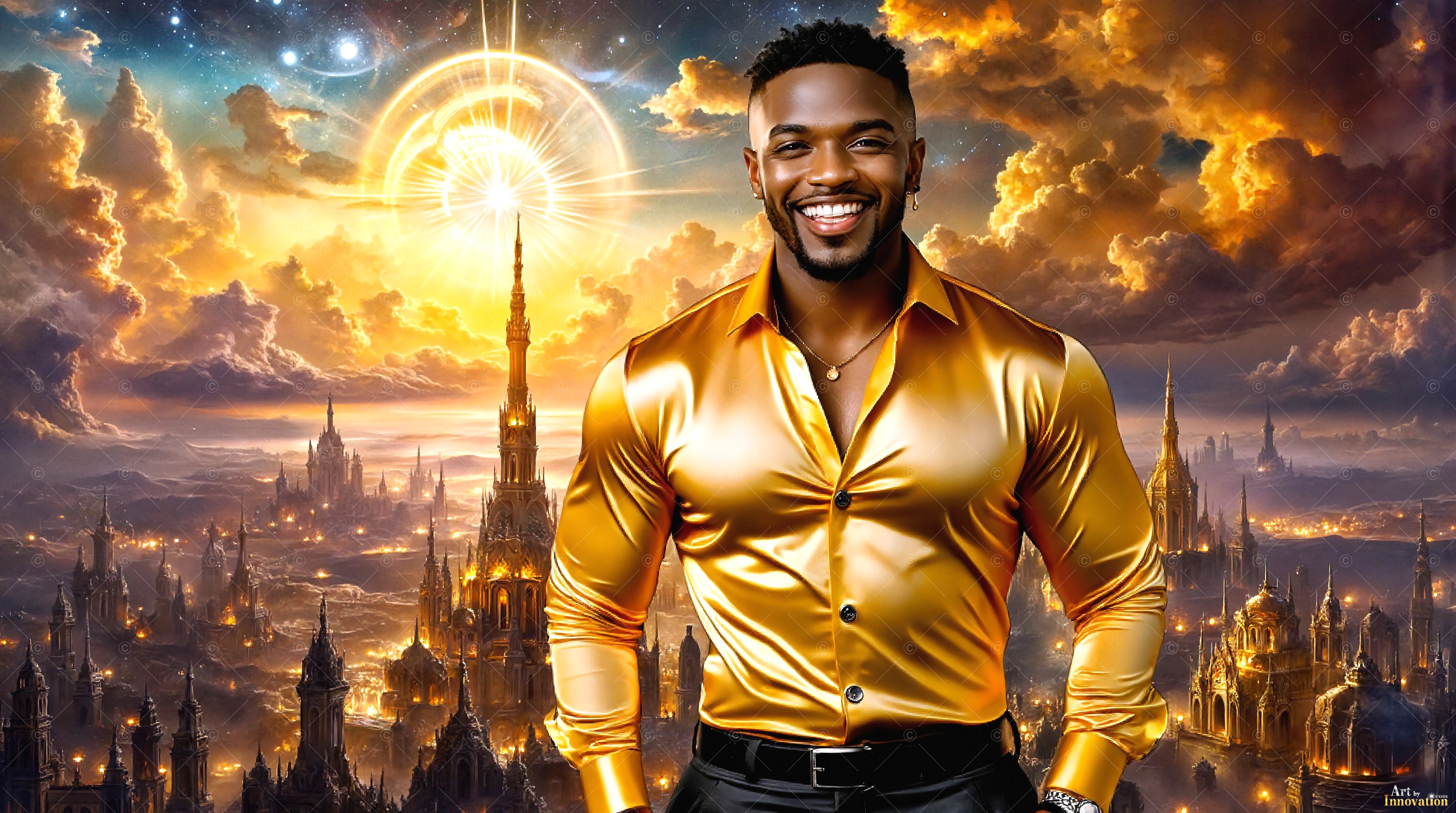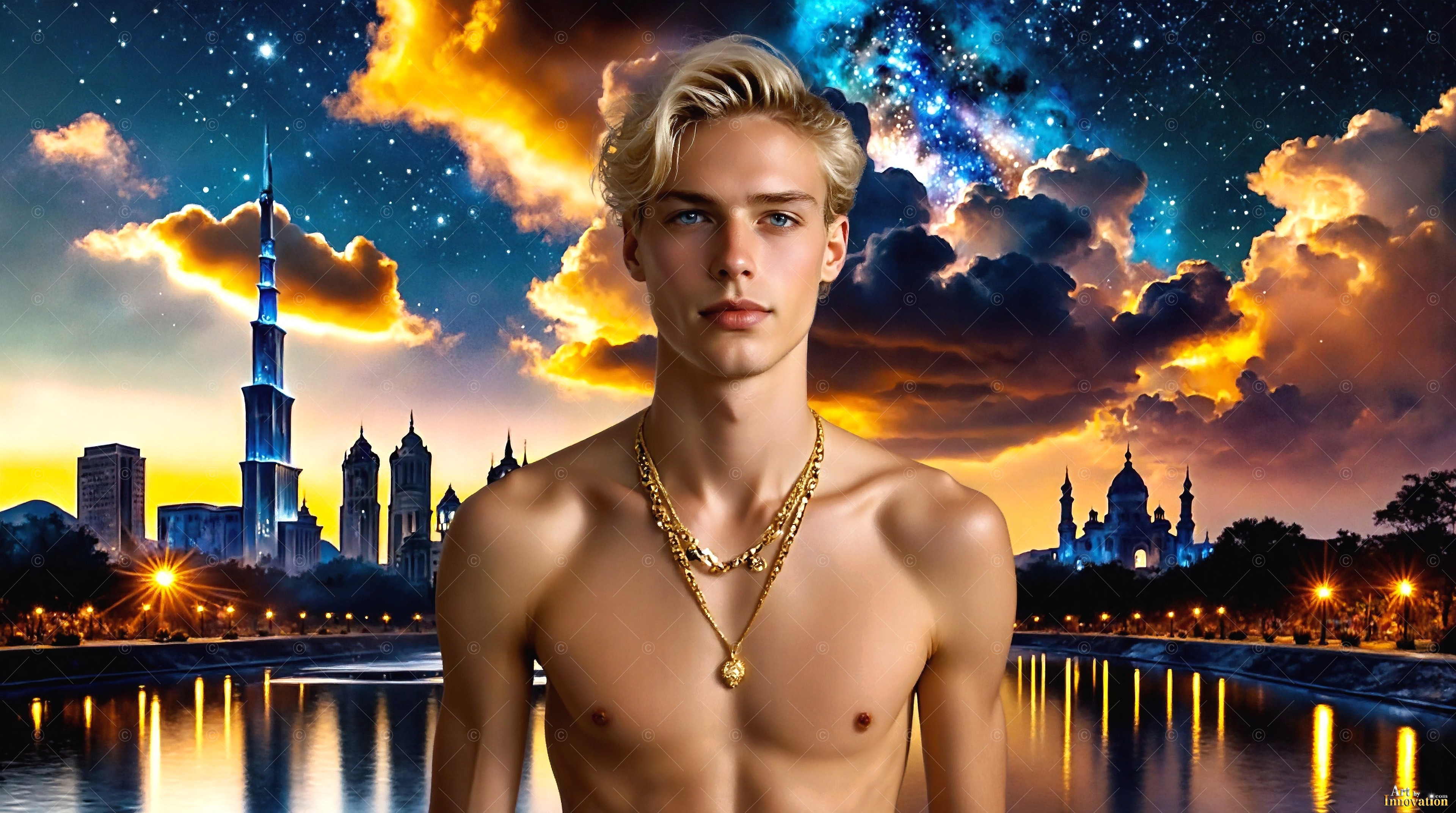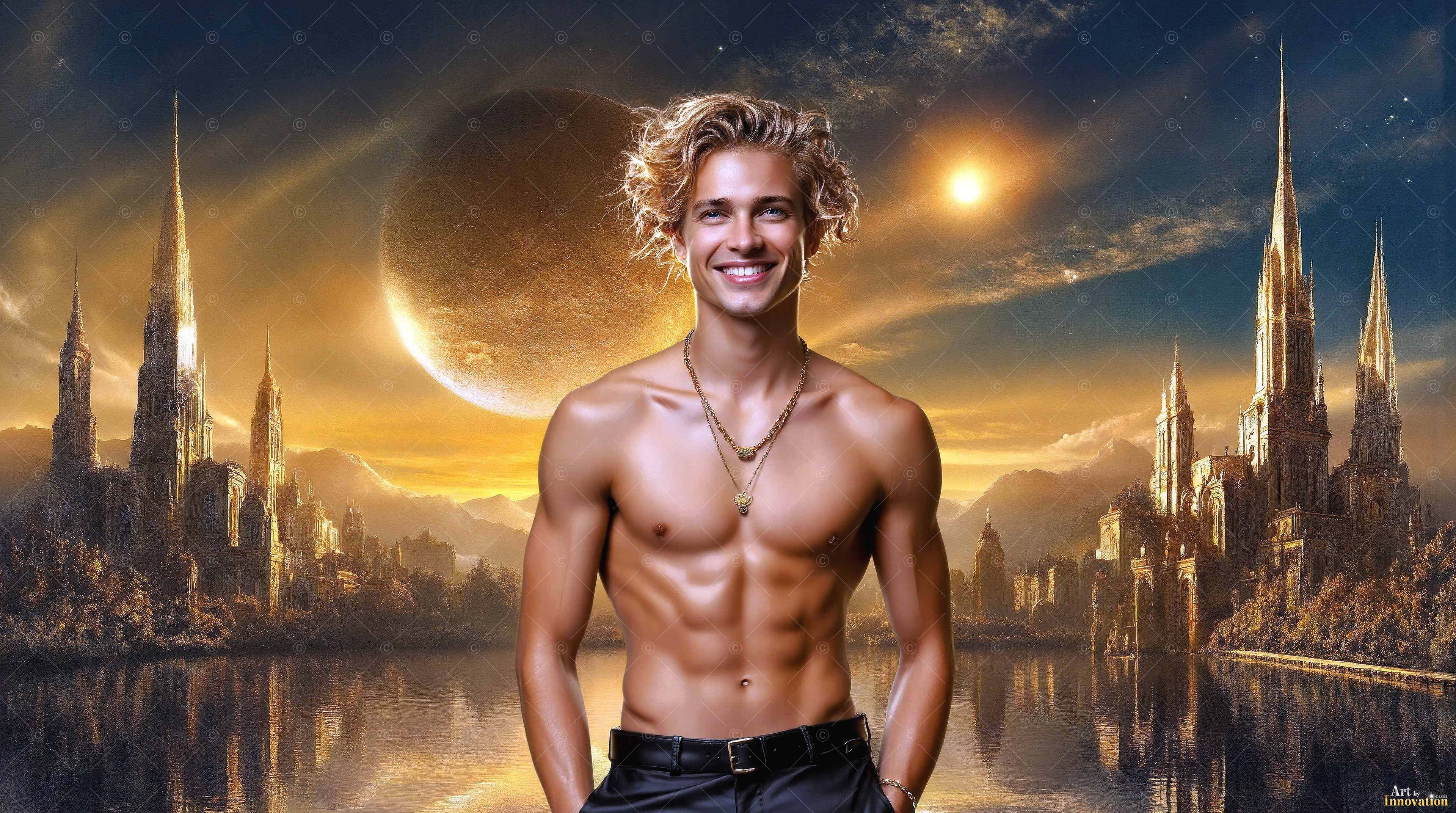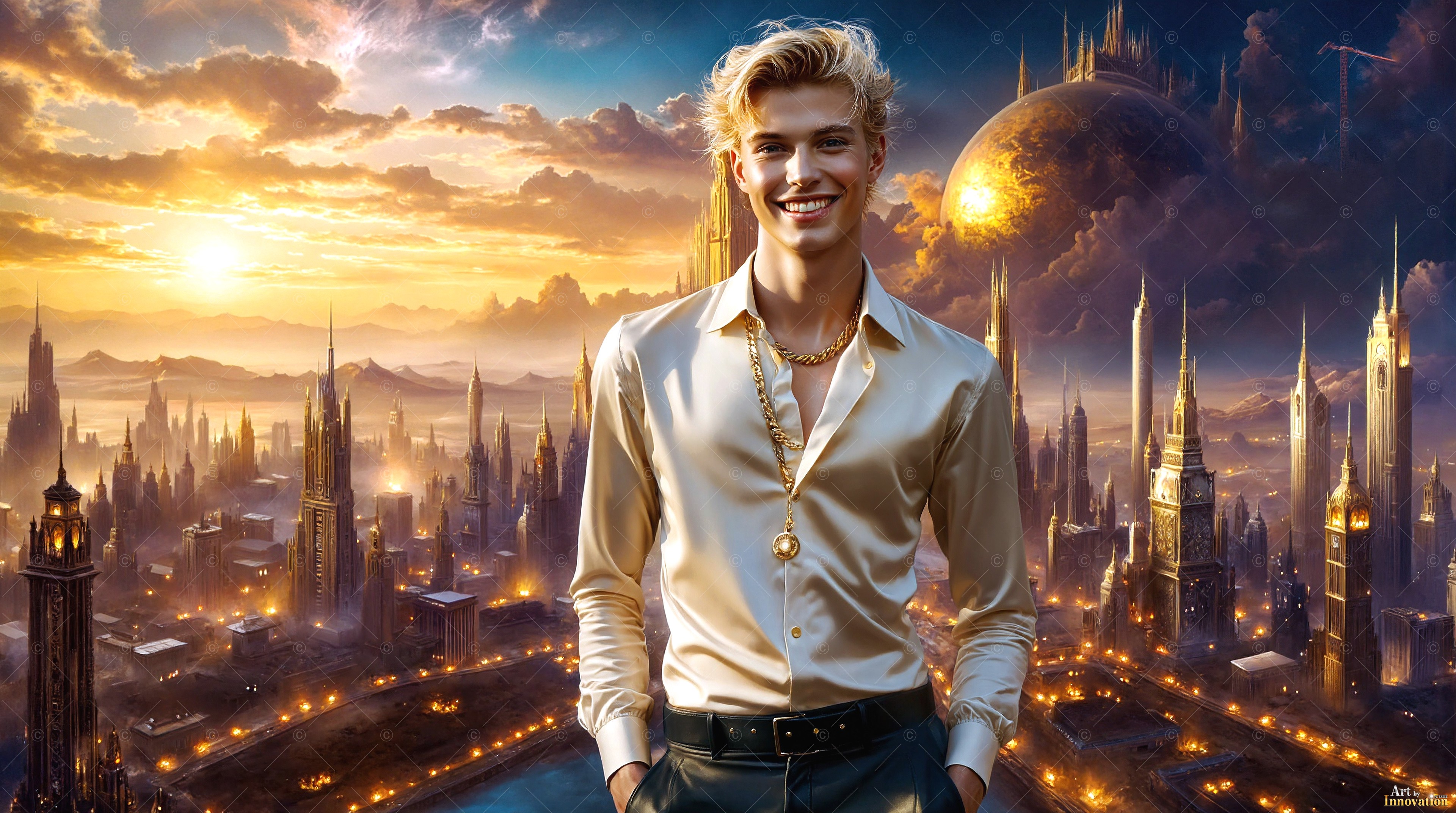 ByJDThe Beautiful Young Men of the Golden City, is a collection of AI generated images of sexy, glamorous, handsome guys in the heavens. In this fantasy photograph of a young men in their 20’s, on a balcony, overlooking a large golden city in the heavens. Generated to be as realistic as possible, in this this fantasy setting, with todays technology. Wearing jeans, an unbuttoned, vibrant, long-sleeve, button down shirt. The subject is enjoying a beautiful day outdoors. The mystical, galactic landscape, and the vibrant cosmic canopies, every detail, from the texture of the clouds, to the magnificent, majestic gothic architecture of the golden city, is crafted to create an atmosphere of reverence and divine glory. With a breathtaking scene of Salar de Uyuni at sunset, offering warm golden hour lighting. The heavenly landscape evokes a sense of freedom and tranquility, that is expresses through his facial features and smile, as day turns to night. The heavenly landscape evokes a sense of mysterious black space and light, with a vast galaxy that almost covers the image, the stars and constellations sparkle bright, in dark blue sky. On occasion the earth can be seen floating in the sky.