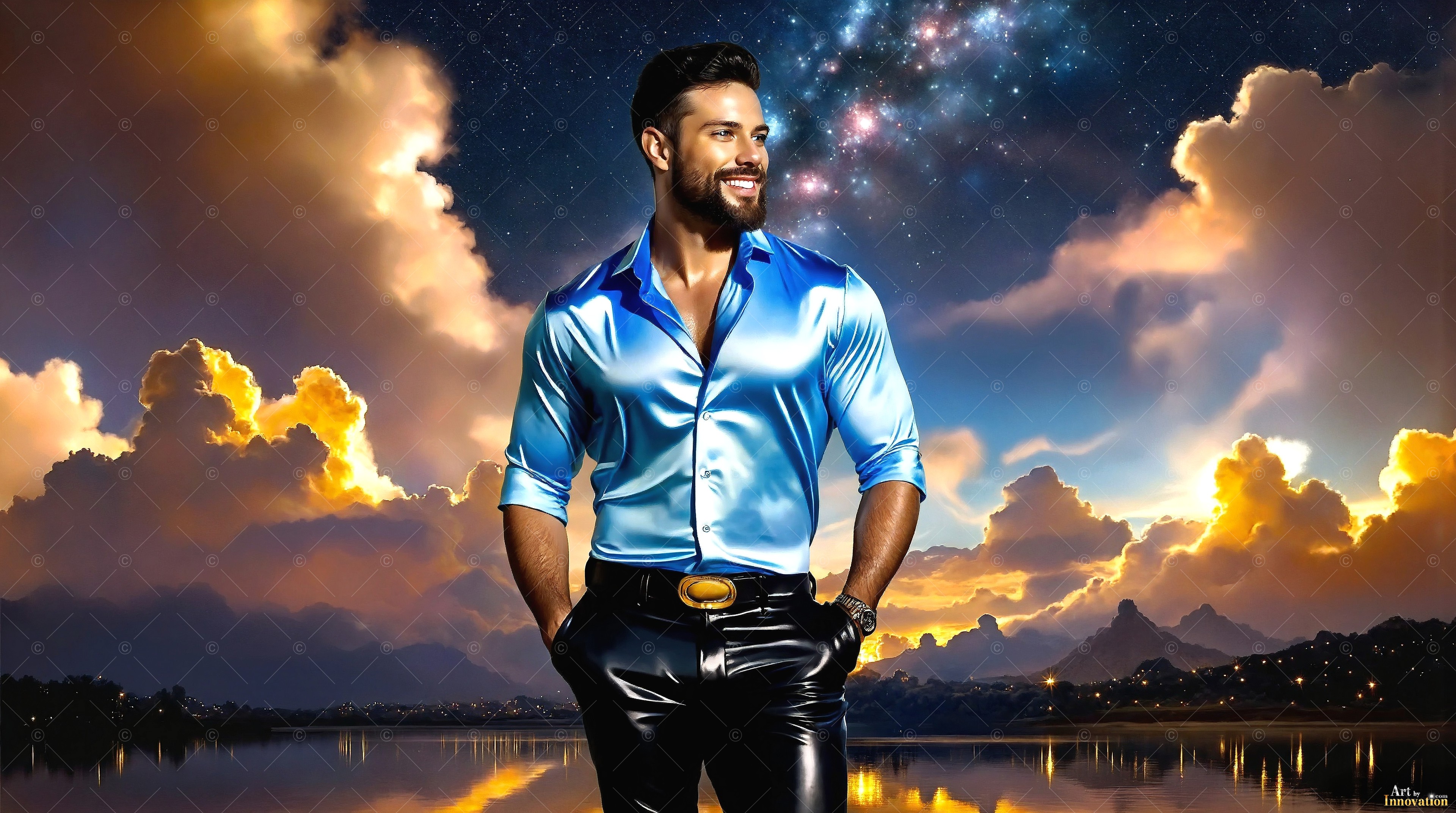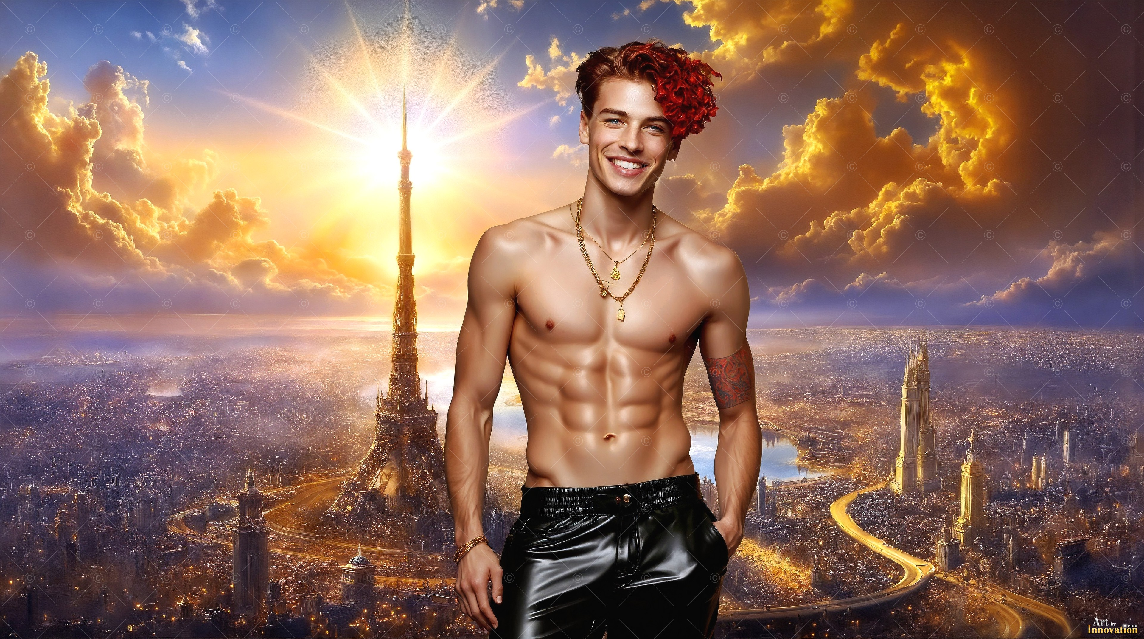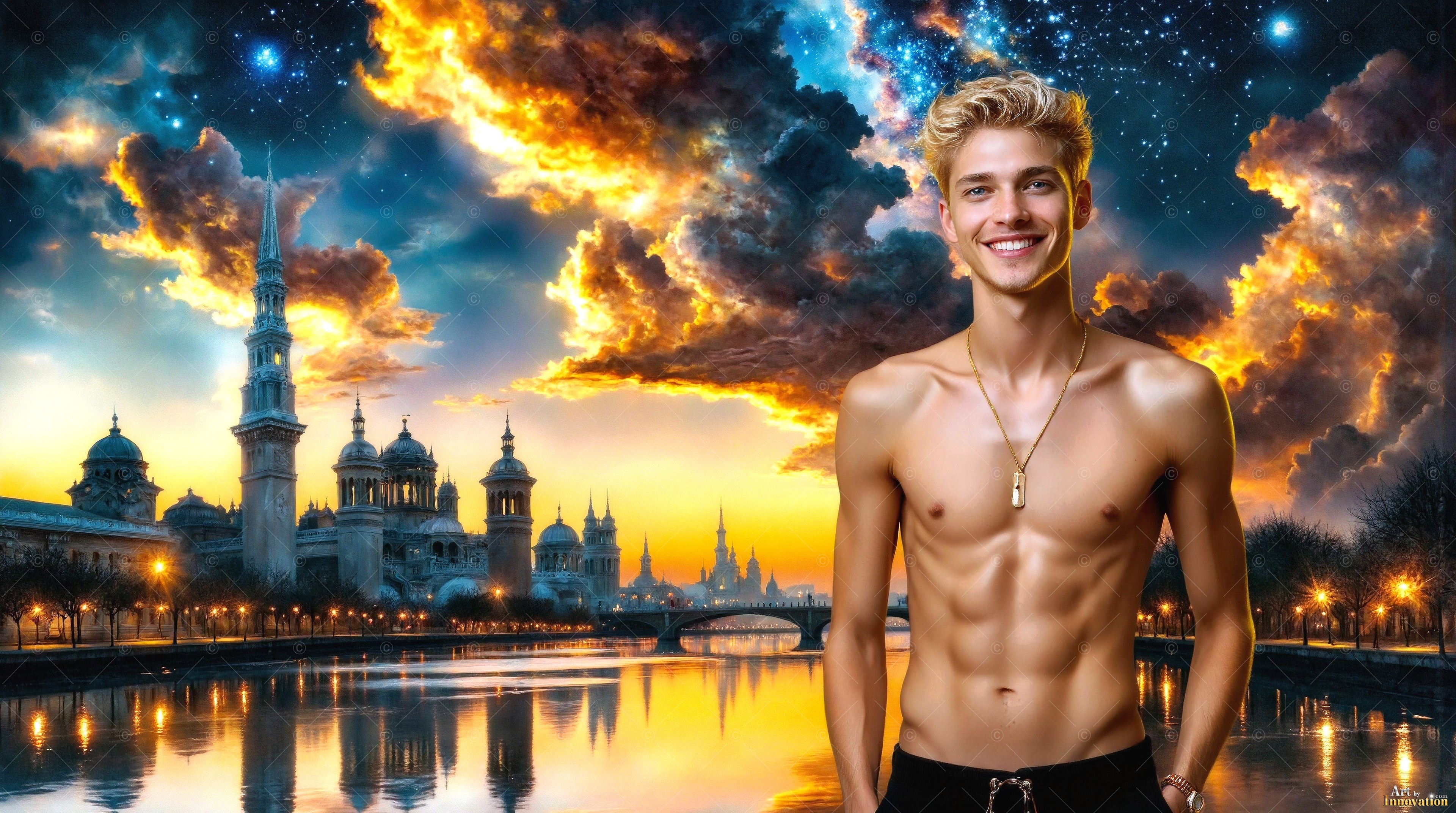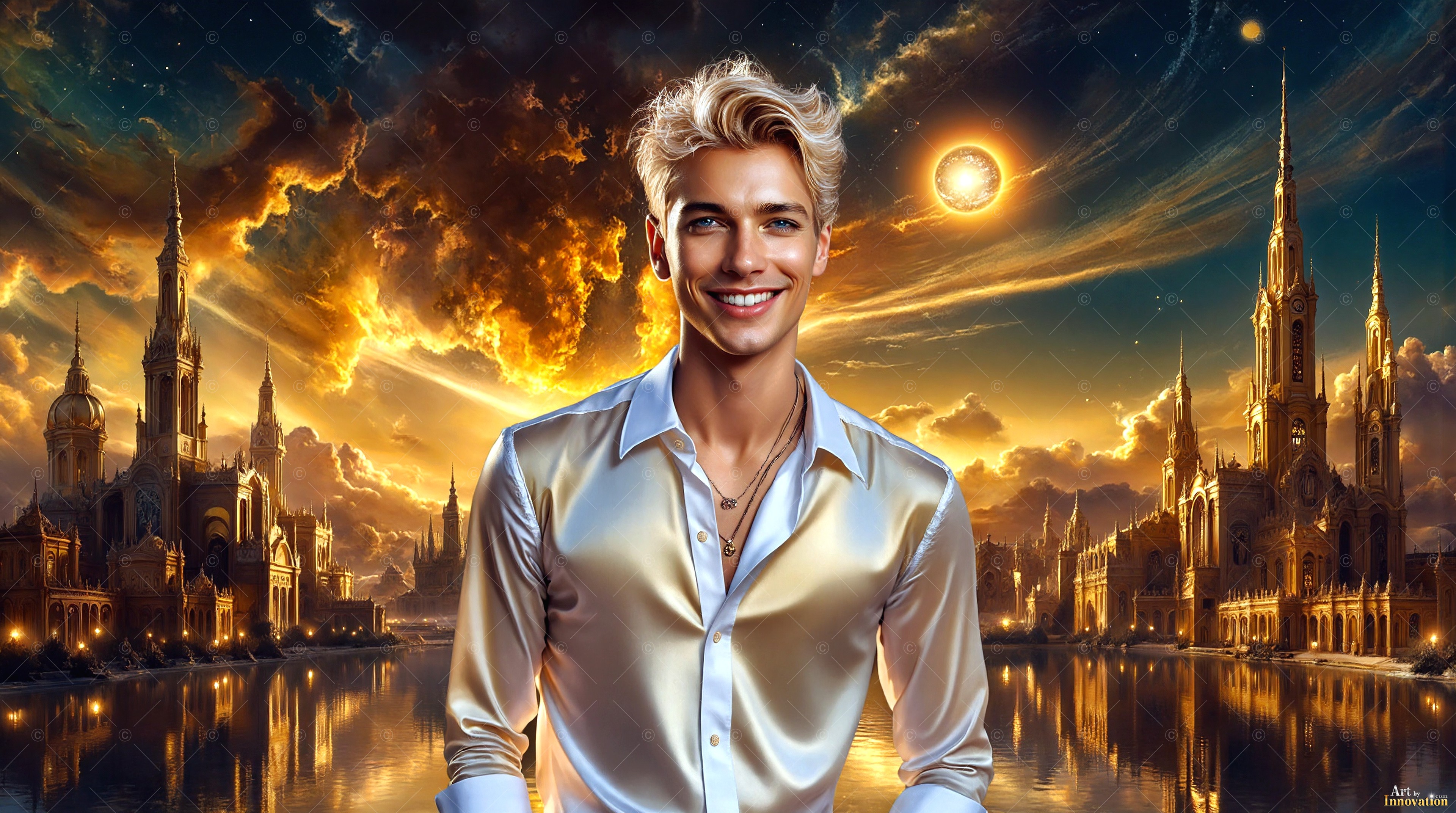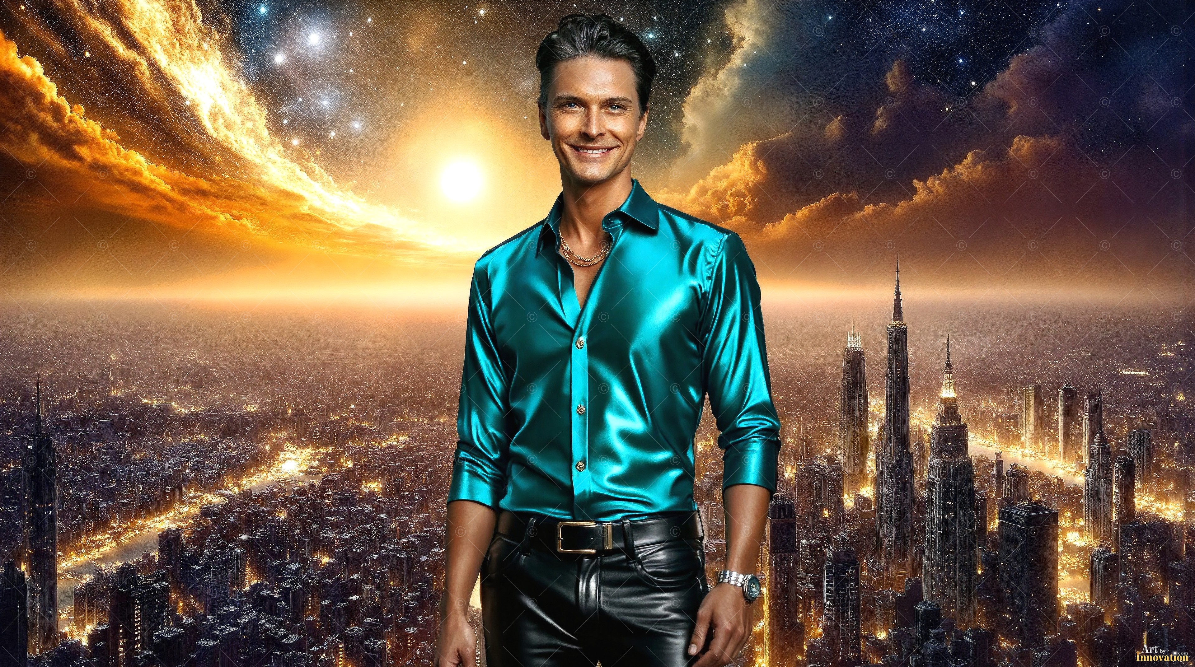ByJDThe Beautiful Young Men of the Golden City, is a collection of AI generated images of sexy, glamorous, handsome guys in the heavens. In this fantasy photograph of a young men in their 20’s, on a balcony, overlooking a large golden city in the heavens. Generated to be as realistic as possible, in this this fantasy setting, with todays technology. Wearing jeans, an unbuttoned, vibrant, long-sleeve, button down shirt. The subject is enjoying a beautiful day outdoors. The mystical, galactic landscape, and the vibrant cosmic canopies, every detail, from the texture of the clouds, to the magnificent, majestic gothic architecture of the golden city, is crafted to create an atmosphere of reverence and divine glory. With a breathtaking scene of Salar de Uyuni at sunset, offering warm golden hour lighting. The heavenly landscape evokes a sense of freedom and tranquility, that is expresses through his facial features and smile, as day turns to night. The heavenly landscape evokes a sense of mysterious black space and light, with a vast galaxy that almost covers the image, the stars and constellations sparkle bright, in dark blue sky. On occasion the earth can be seen floating in the sky.