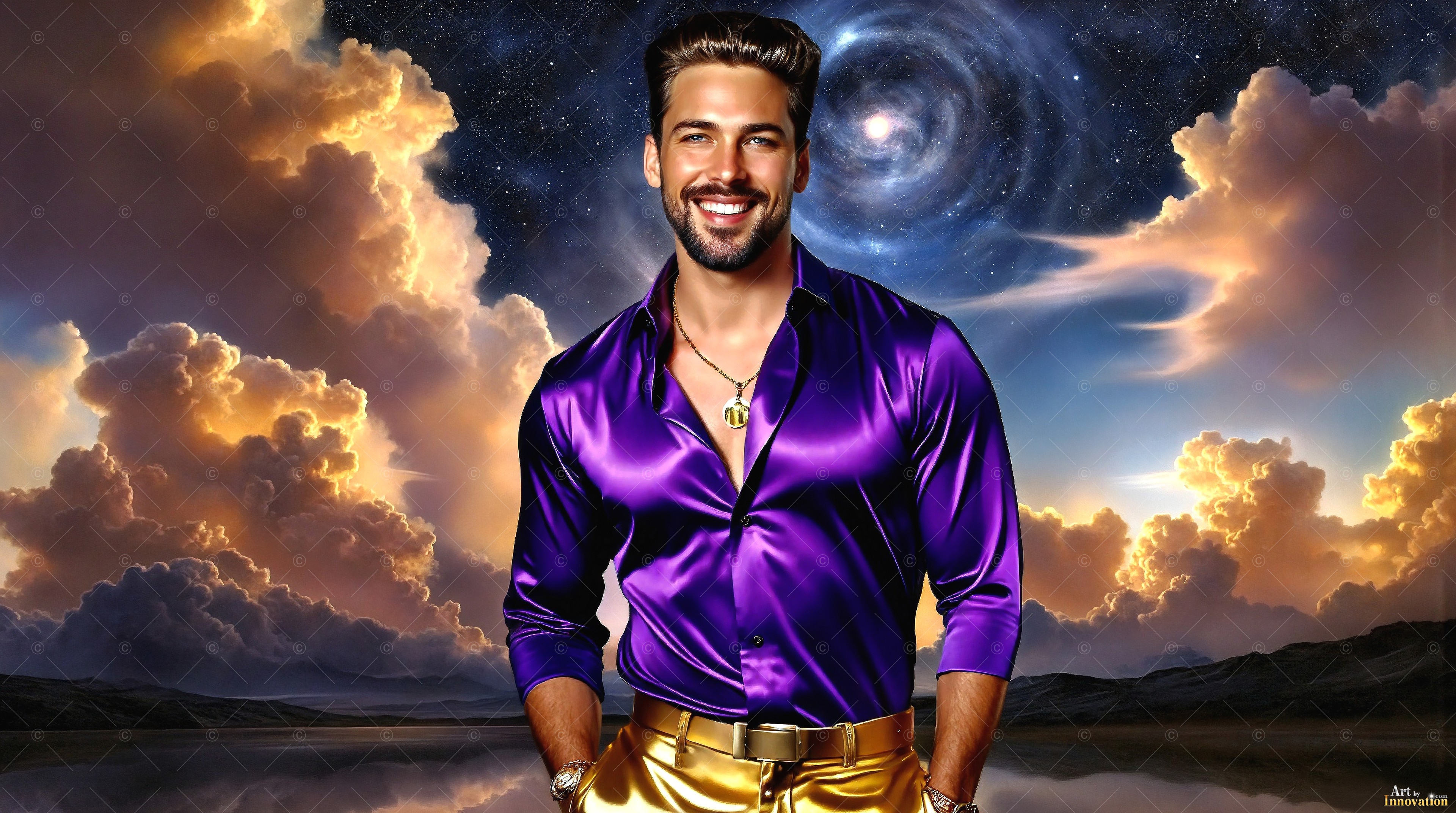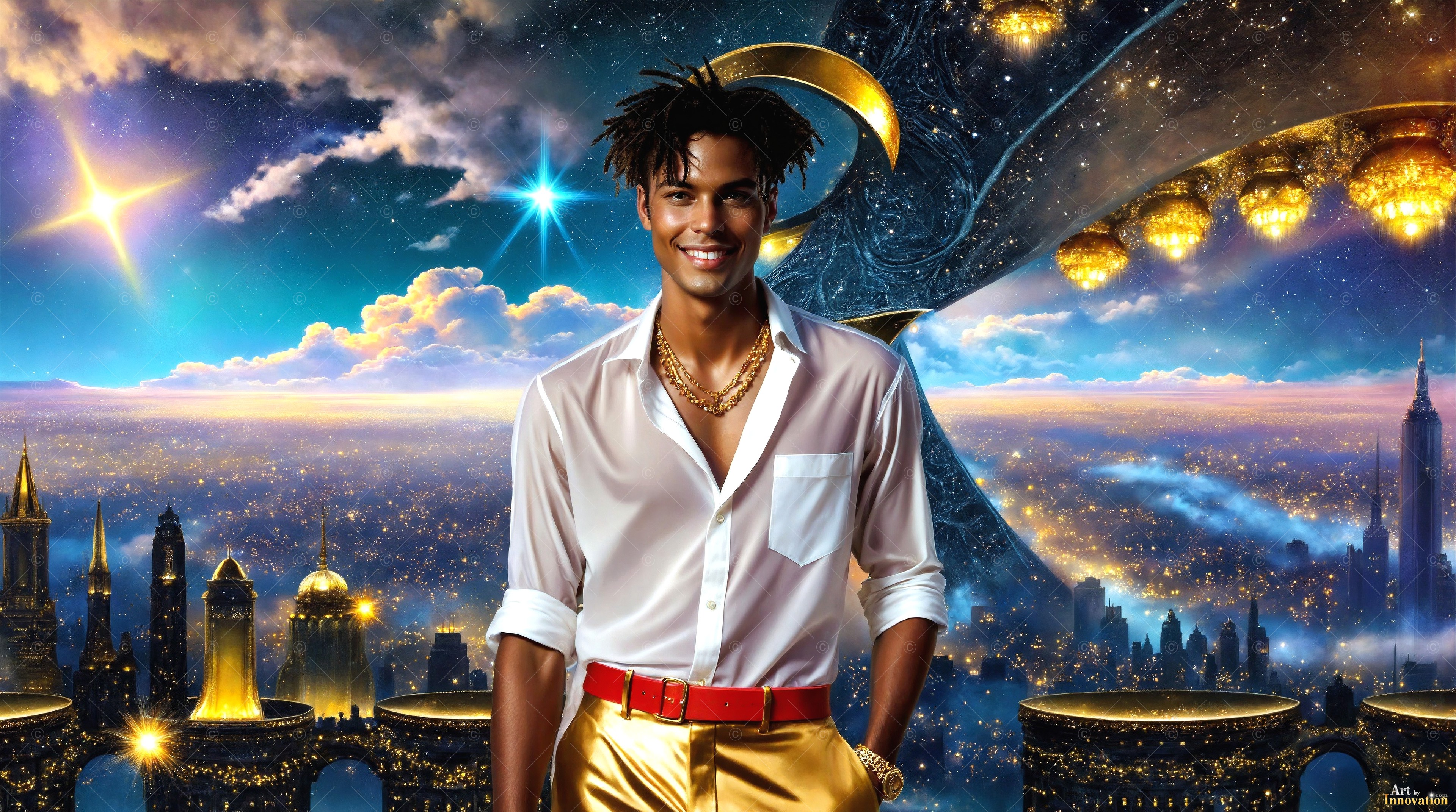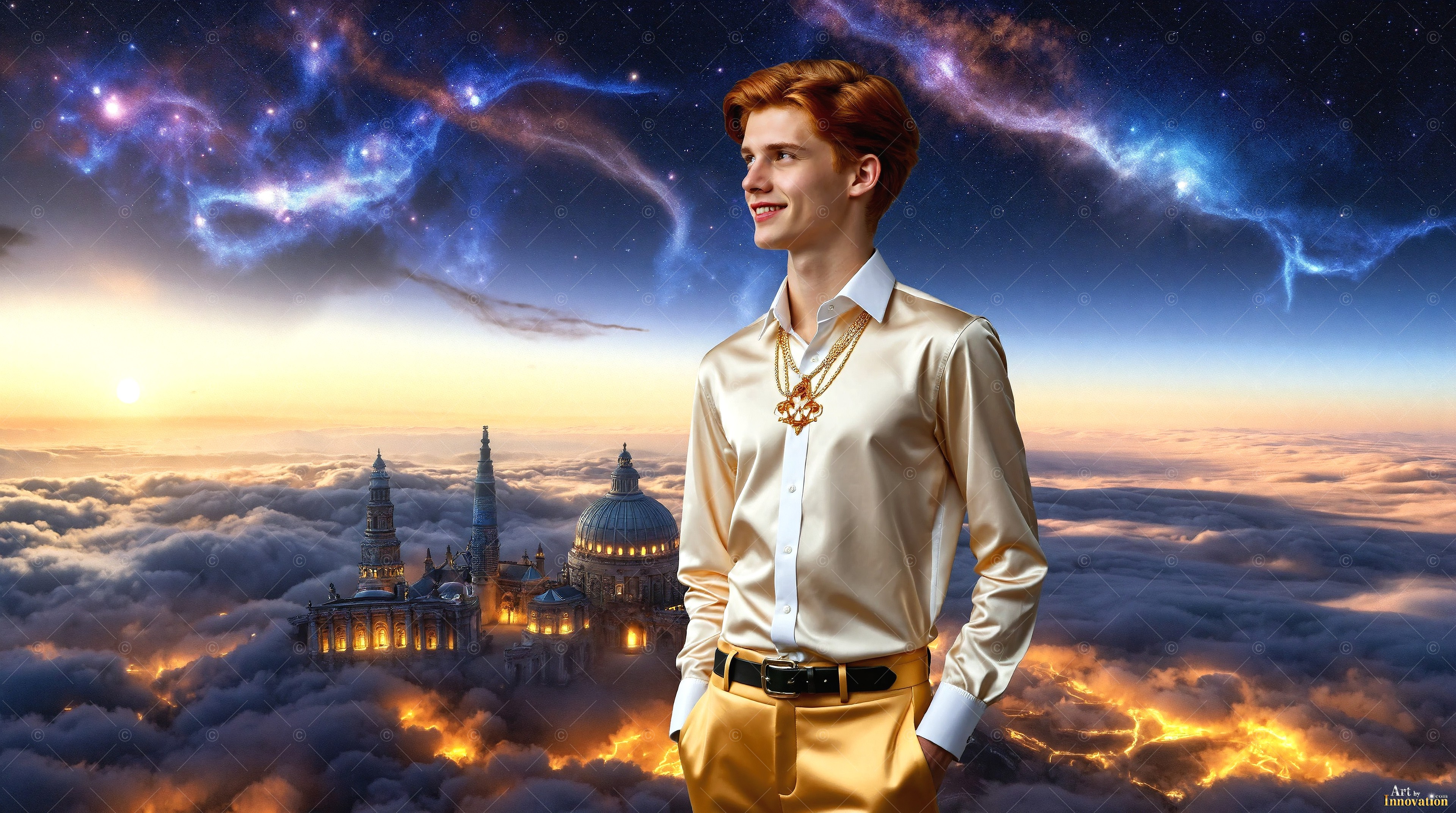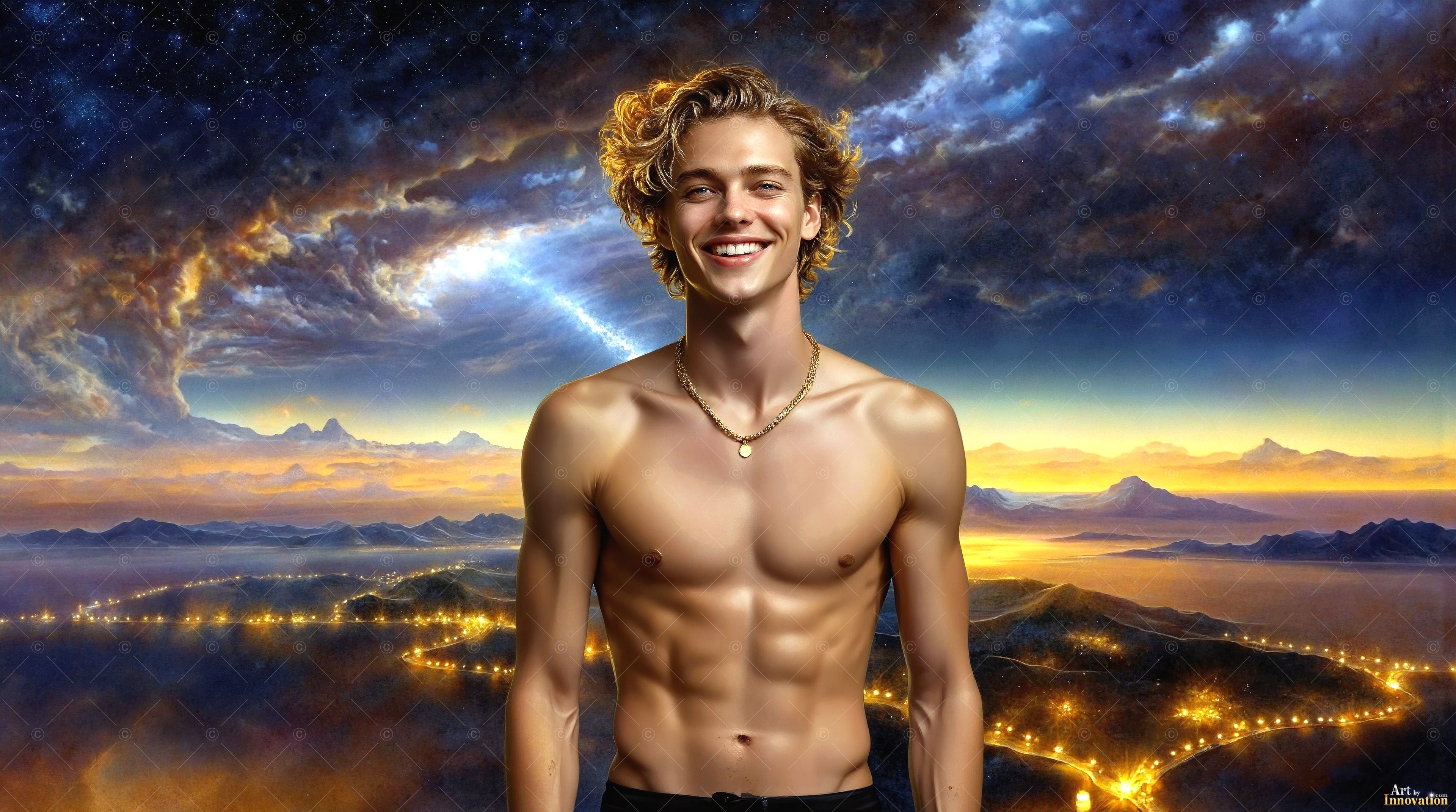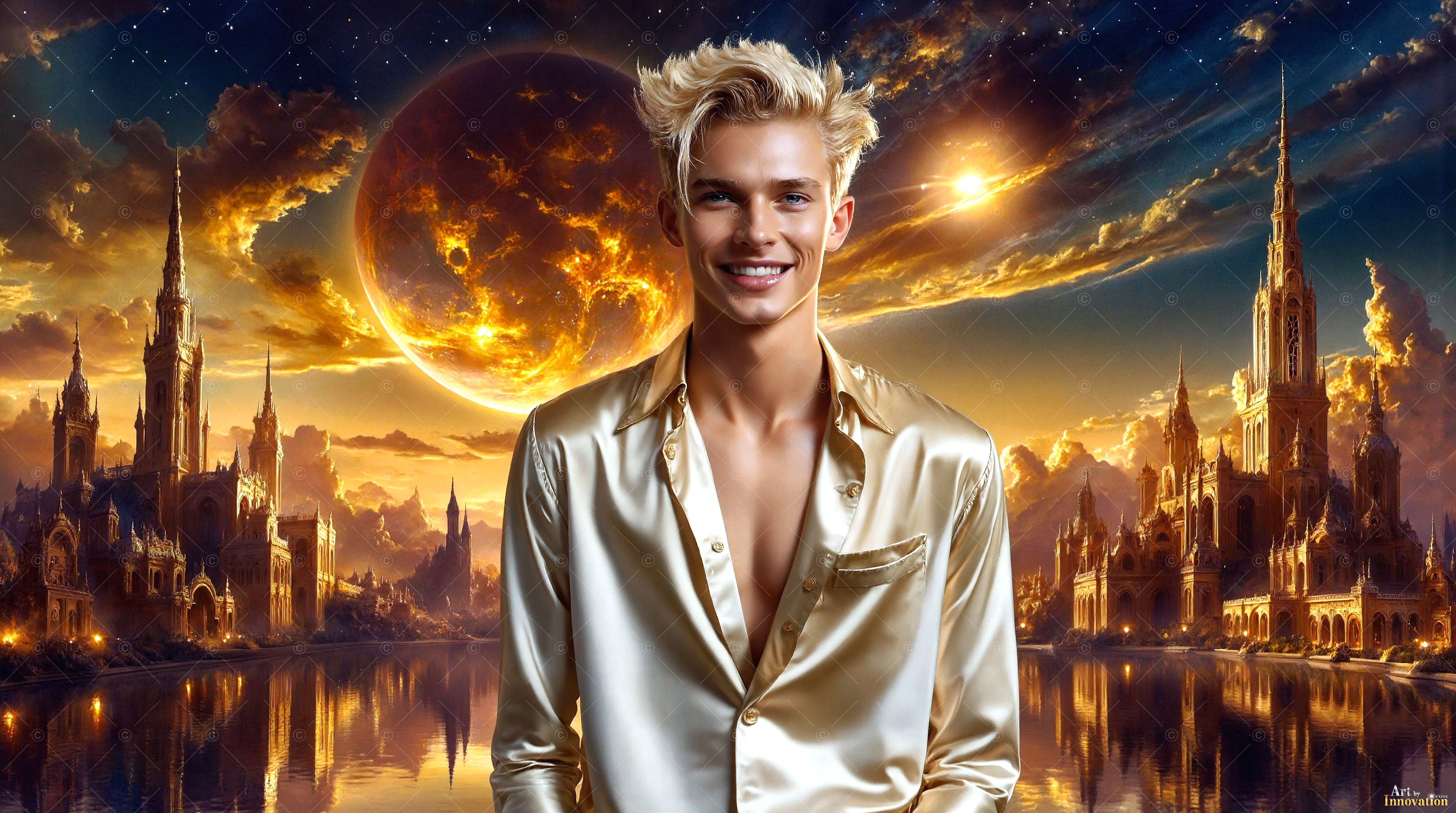 ByJDThe Beautiful Young Men of the Golden City, is a collection of AI generated images of sexy, glamorous, handsome guys in the heavens. In this fantasy photograph of a young men in their 20’s, on a balcony, overlooking a large golden city in the heavens. Generated to be as realistic as possible, in this this fantasy setting, with todays technology. Wearing jeans, an unbuttoned, vibrant, long-sleeve, button down shirt. The subject is enjoying a beautiful day outdoors. The mystical, galactic landscape, and the vibrant cosmic canopies, every detail, from the texture of the clouds, to the magnificent, majestic gothic architecture of the golden city, is crafted to create an atmosphere of reverence and divine glory. With a breathtaking scene of Salar de Uyuni at sunset, offering warm golden hour lighting. The heavenly landscape evokes a sense of freedom and tranquility, that is expresses through his facial features and smile, as day turns to night. The heavenly landscape evokes a sense of mysterious black space and light, with a vast galaxy that almost covers the image, the stars and constellations sparkle bright, in dark blue sky. On occasion the earth can be seen floating in the sky.