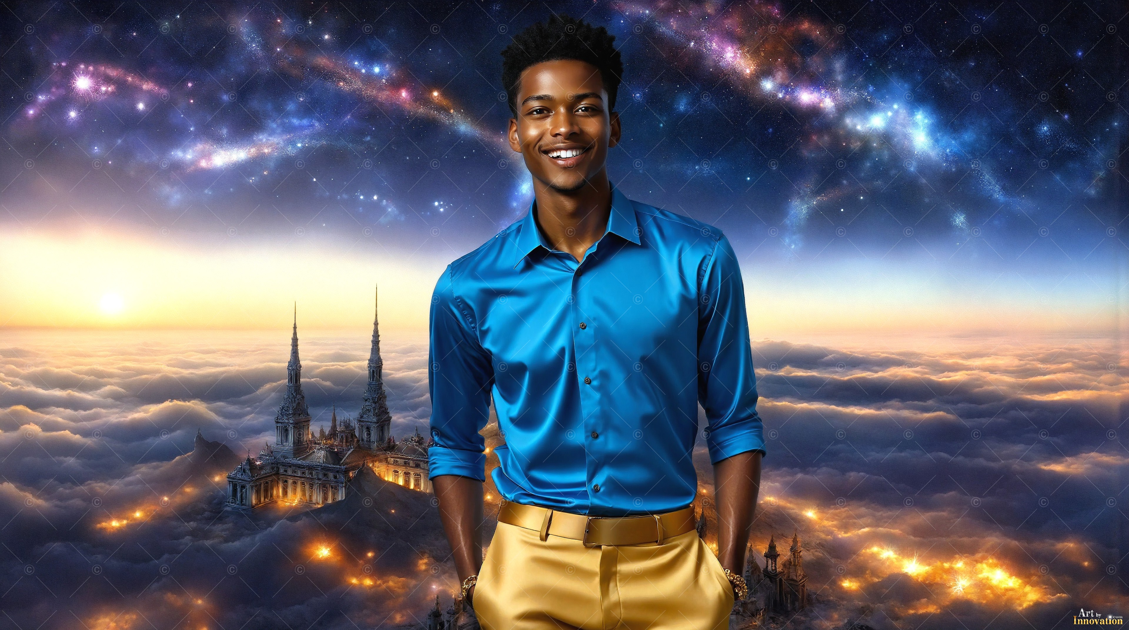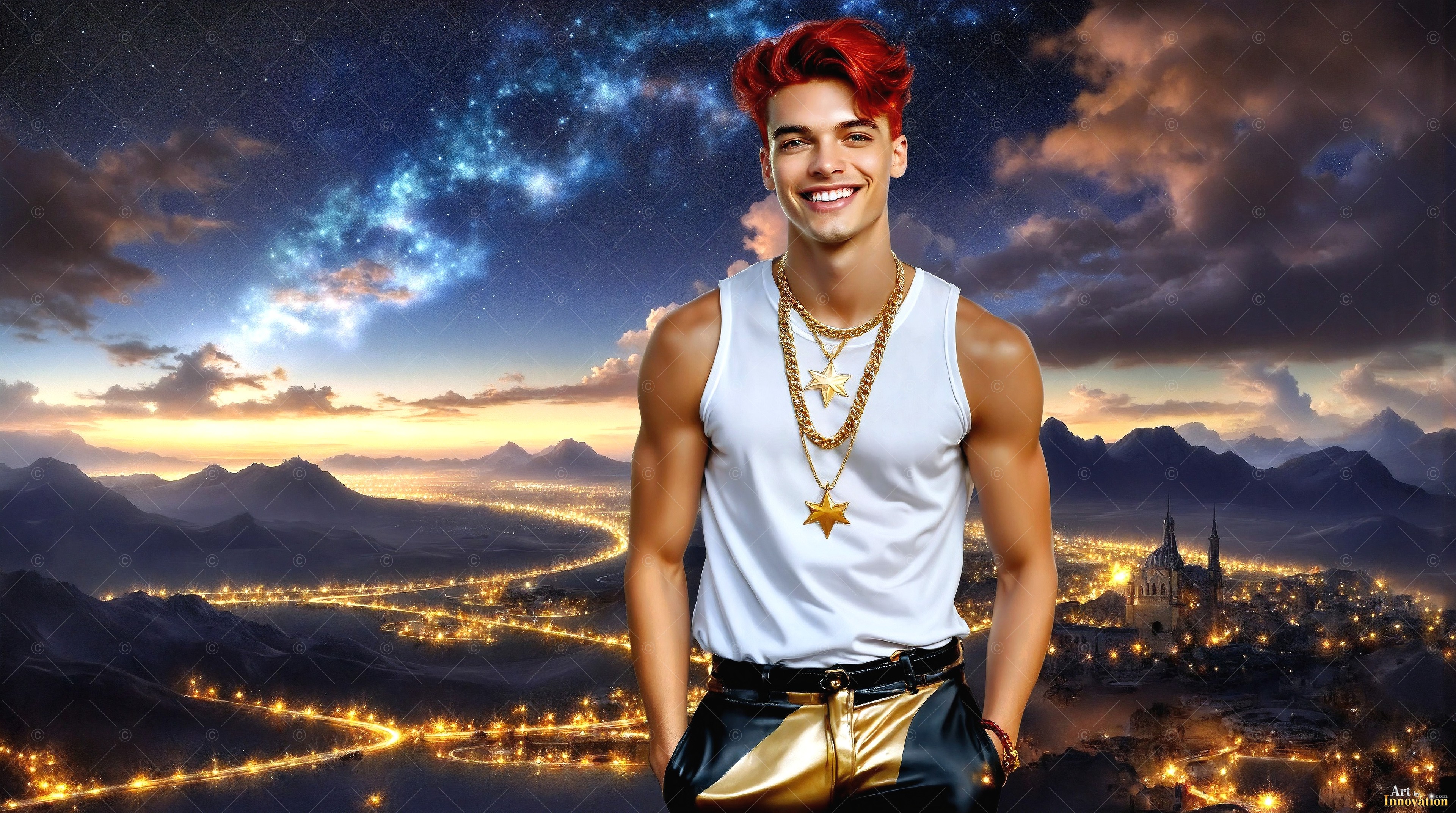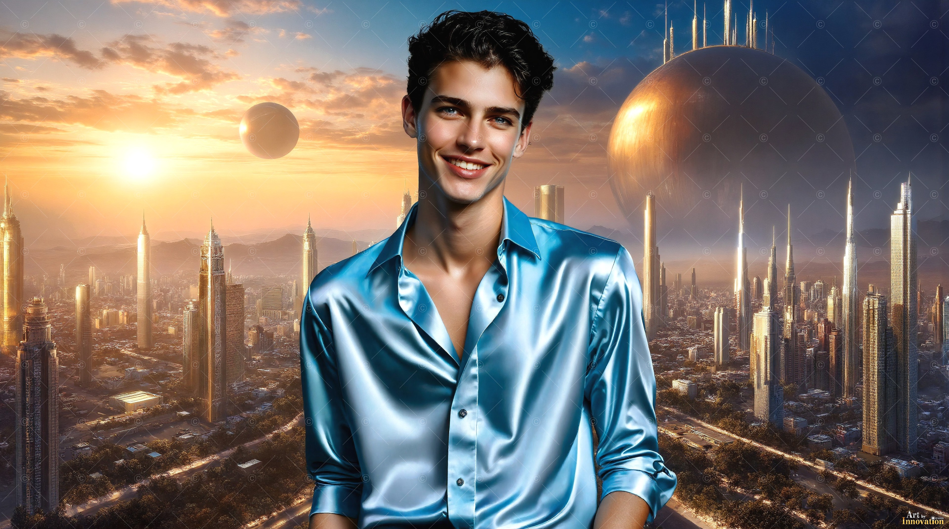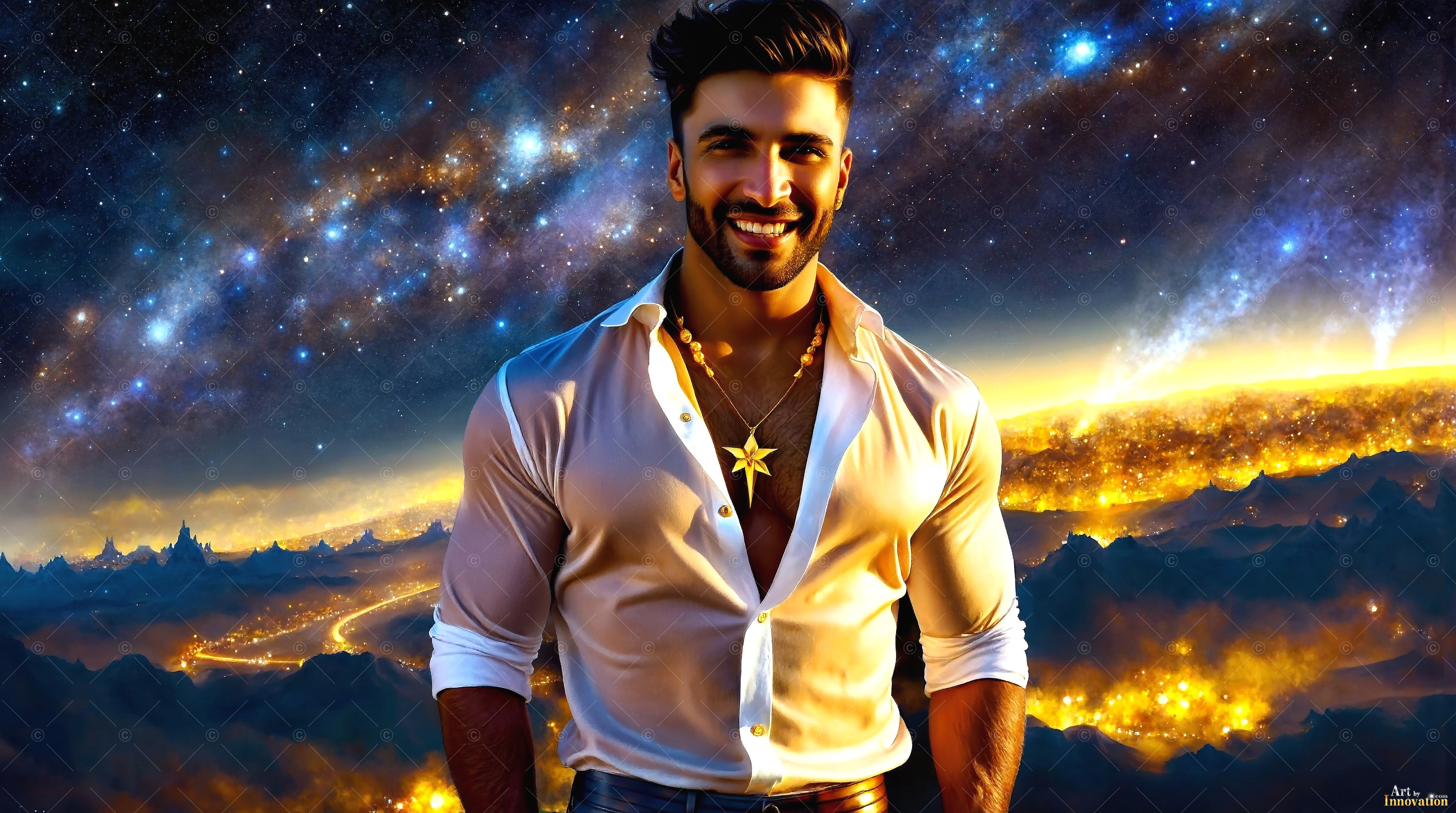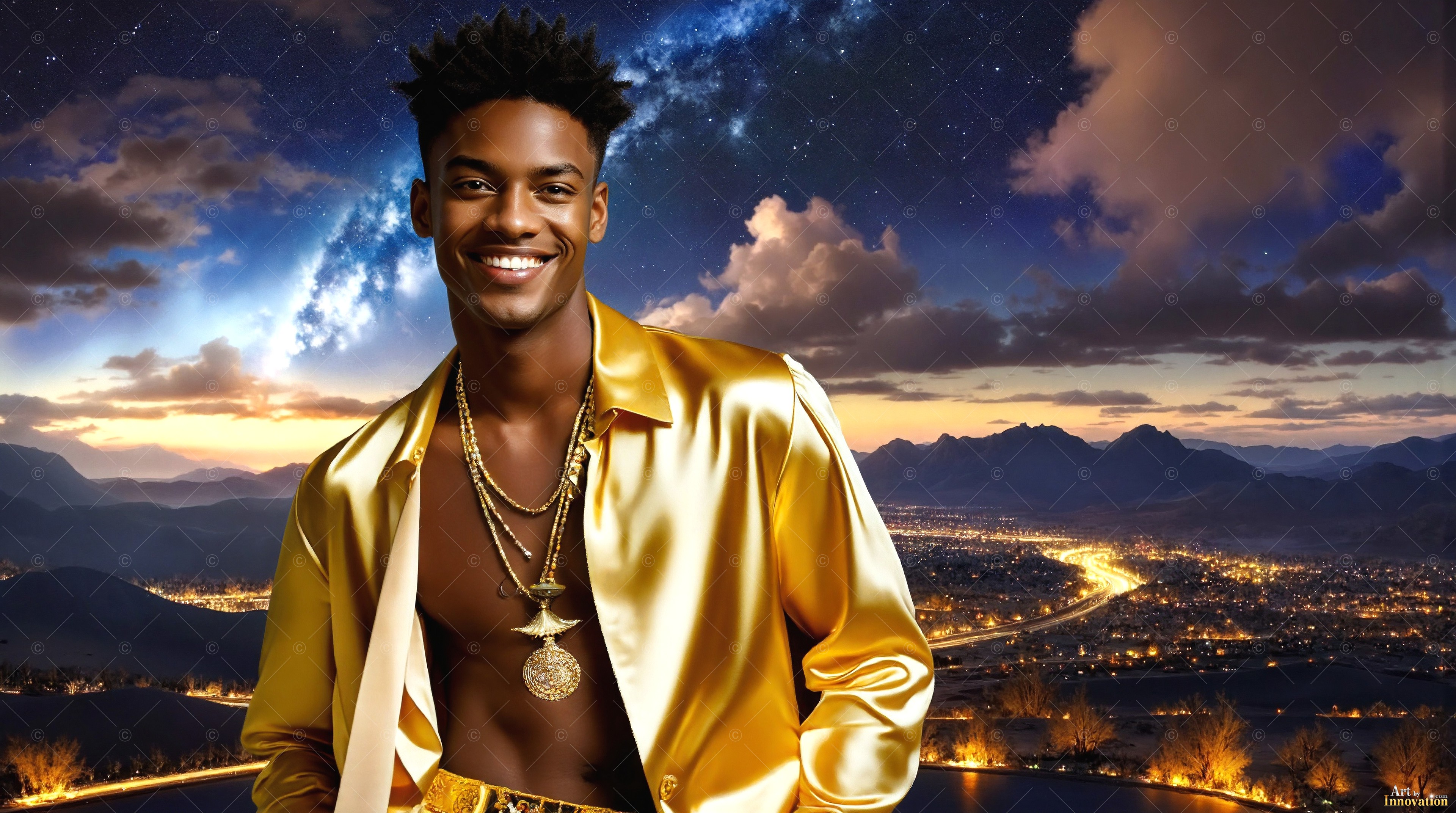 ByJDThe Beautiful Young Men of the Golden City, is a collection of AI generated images of sexy, glamorous, handsome guys in the heavens. In this fantasy photograph of a young men in their 20’s, on a balcony, overlooking a large golden city in the heavens. Generated to be as realistic as possible, in this this fantasy setting, with todays technology. Wearing jeans, an unbuttoned, vibrant, long-sleeve, button down shirt. The subject is enjoying a beautiful day outdoors. The mystical, galactic landscape, and the vibrant cosmic canopies, every detail, from the texture of the clouds, to the magnificent, majestic gothic architecture of the golden city, is crafted to create an atmosphere of reverence and divine glory. With a breathtaking scene of Salar de Uyuni at sunset, offering warm golden hour lighting. The heavenly landscape evokes a sense of freedom and tranquility, that is expresses through his facial features and smile, as day turns to night. The heavenly landscape evokes a sense of mysterious black space and light, with a vast galaxy that almost covers the image, the stars and constellations sparkle bright, in dark blue sky. On occasion the earth can be seen floating in the sky.
