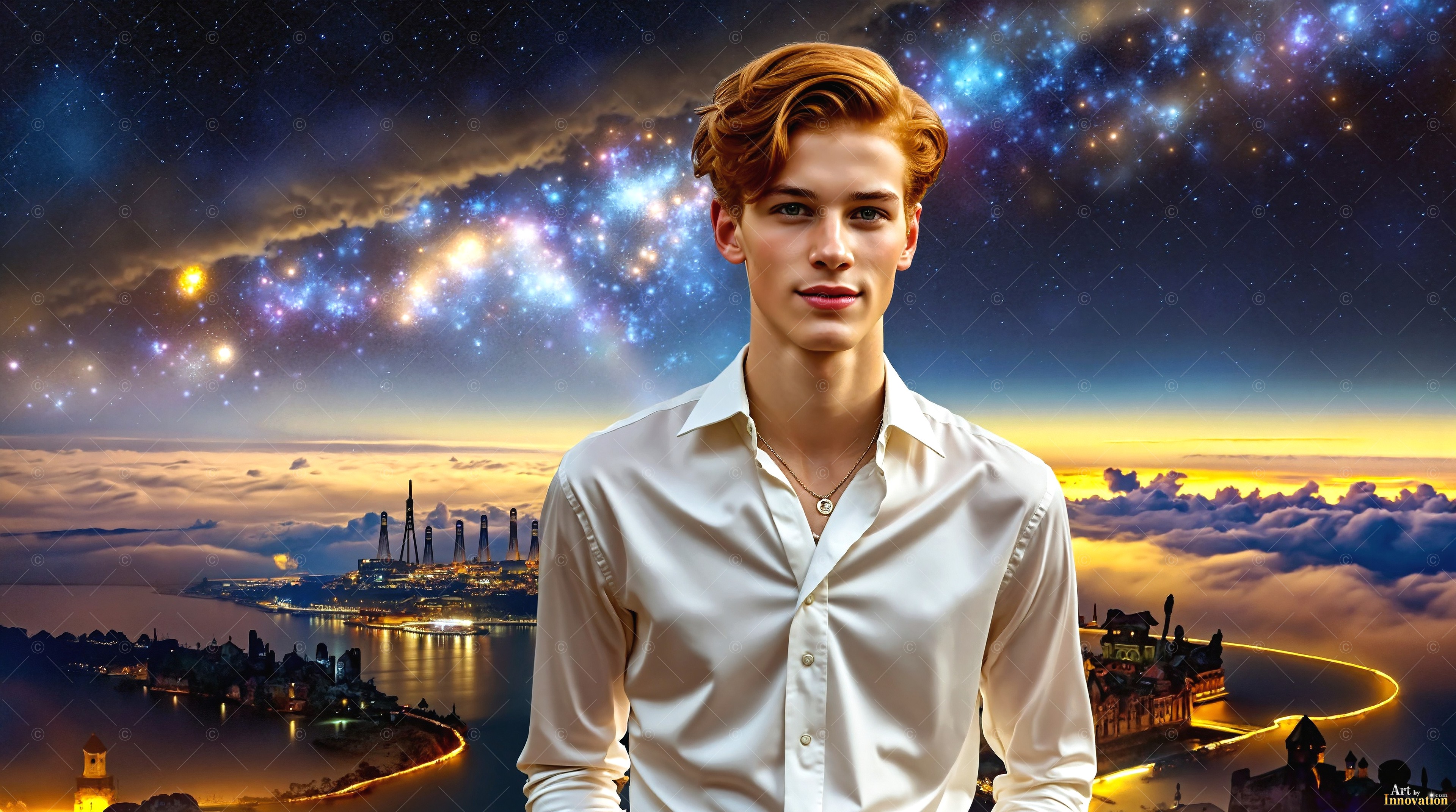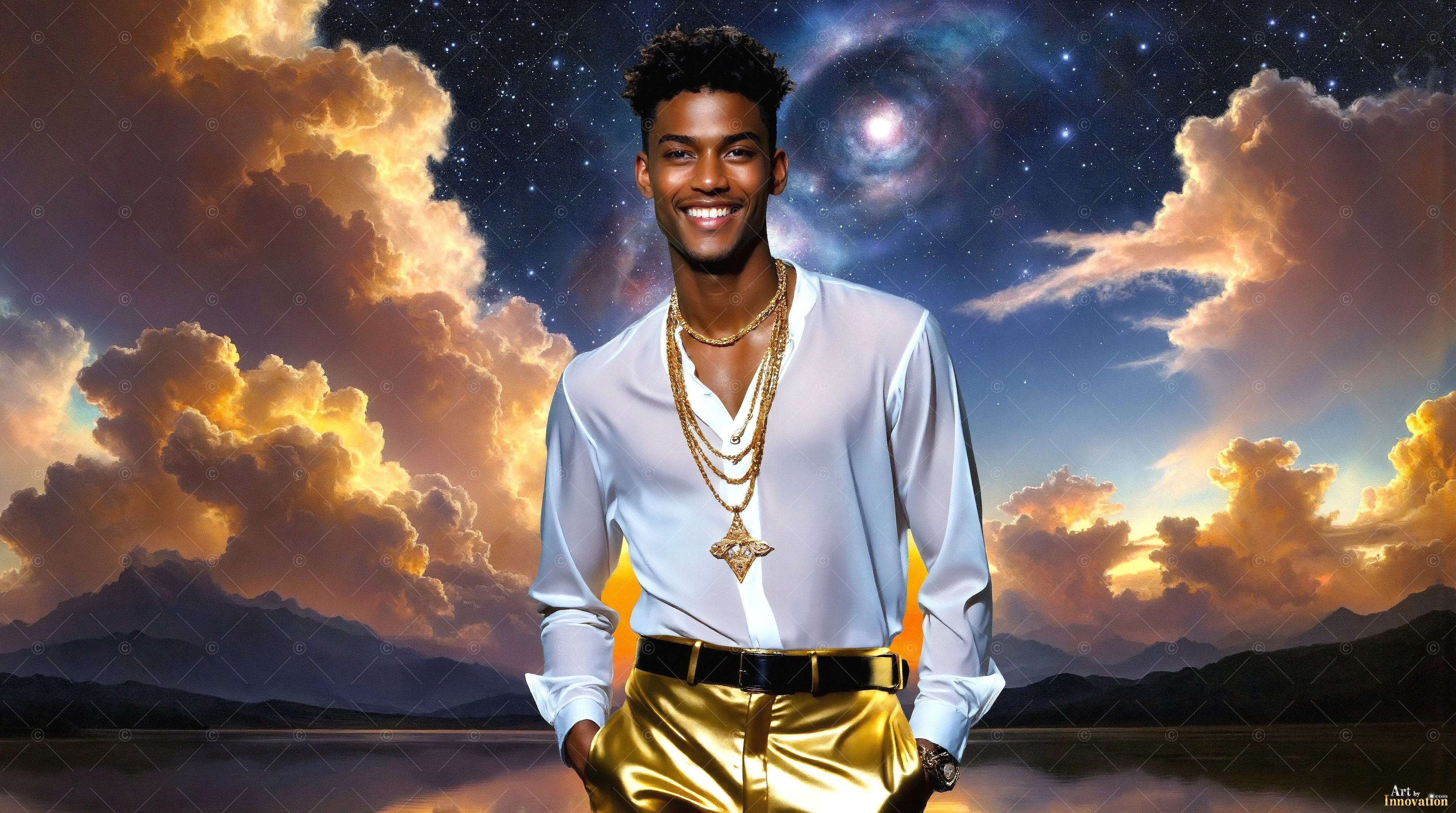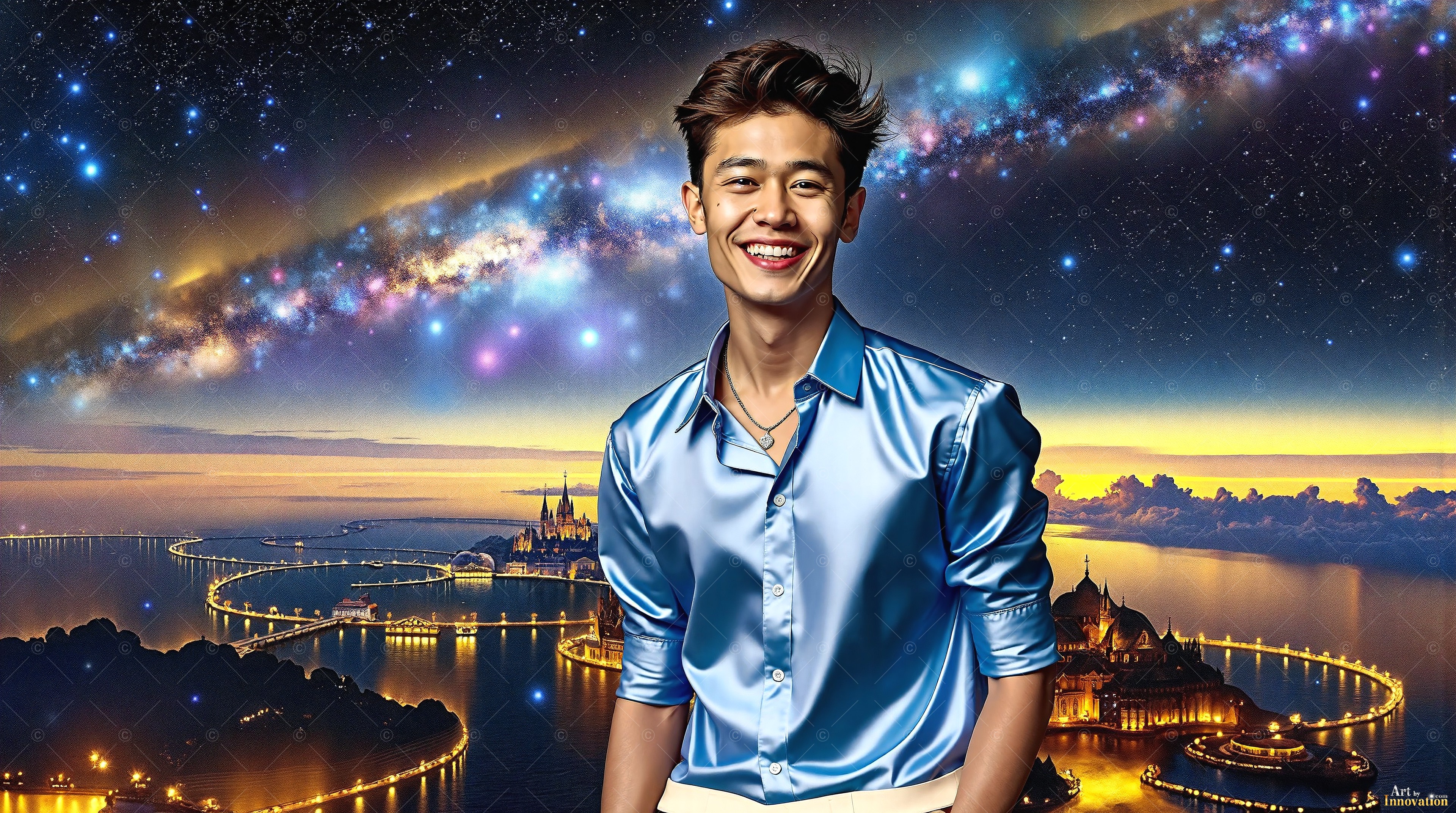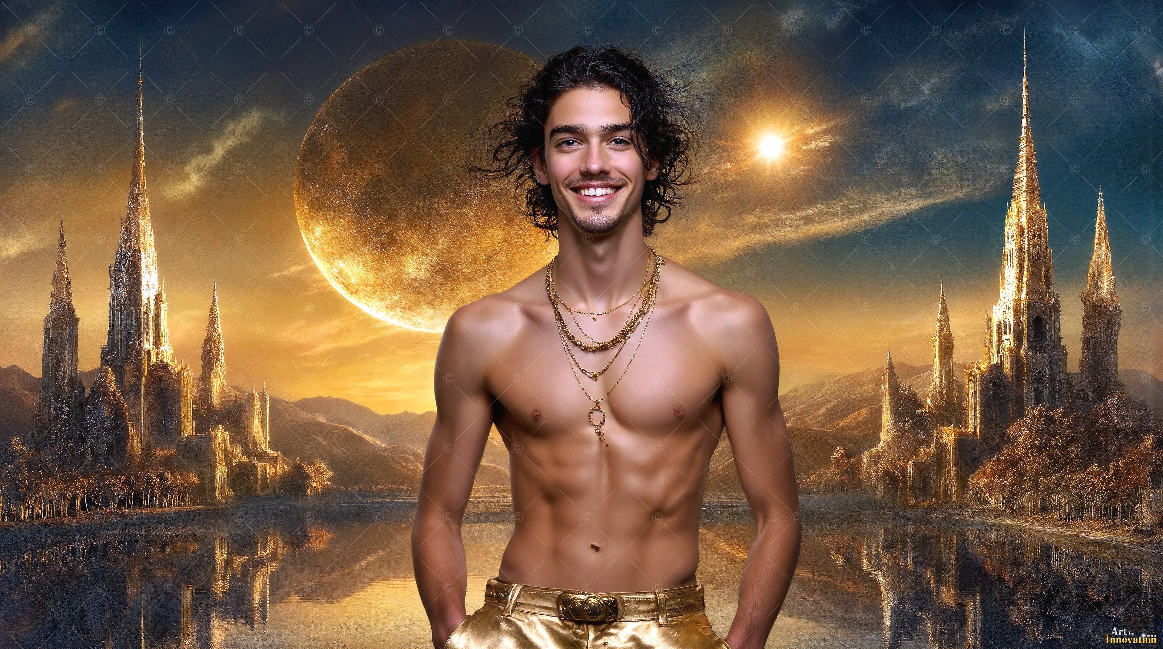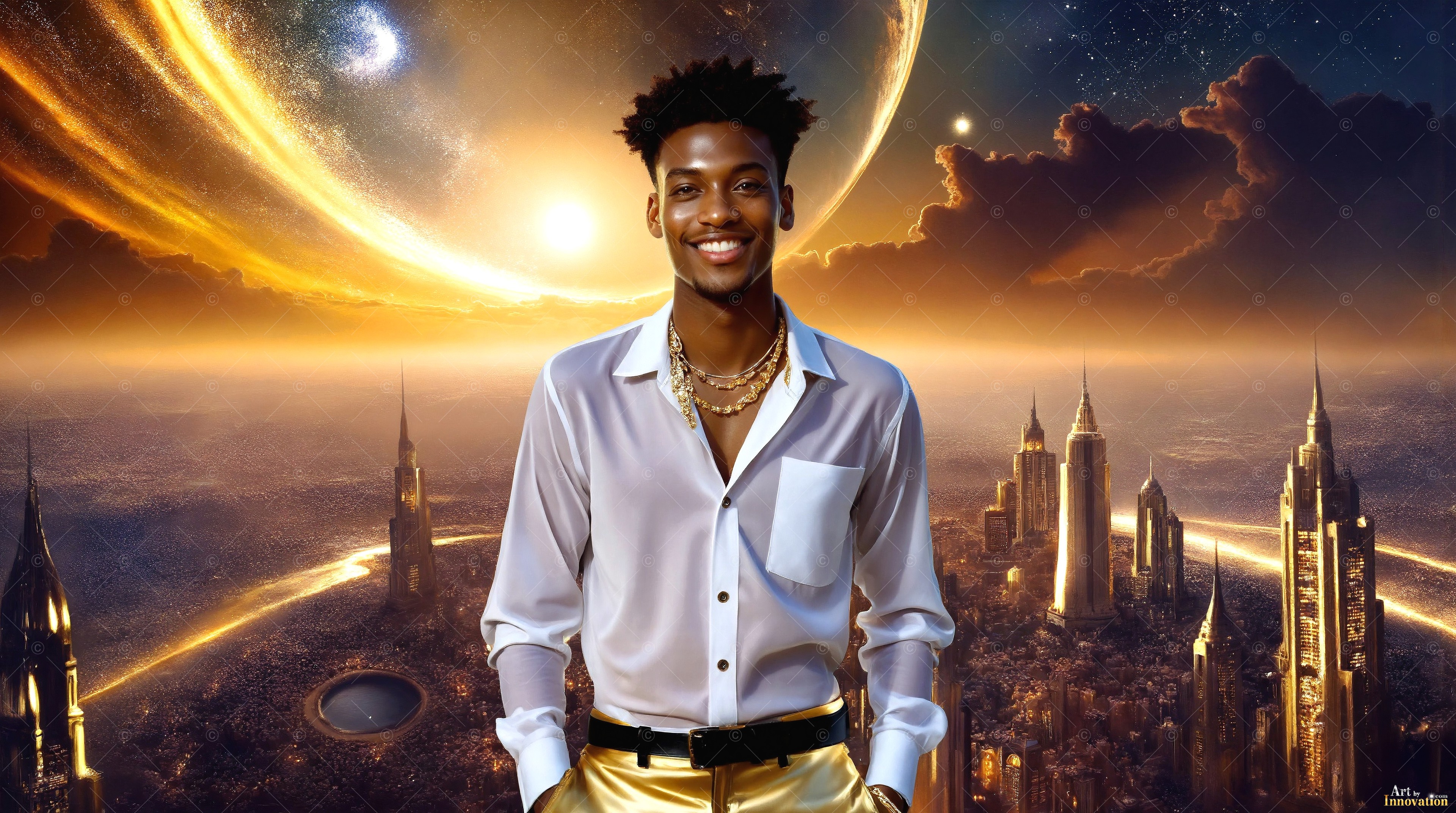 ByJDThe Beautiful Young Men of the Golden City, is a collection of AI generated images of sexy, glamorous, handsome guys in the heavens. In this fantasy photograph of a young men in their 20’s, on a balcony, overlooking a large golden city in the heavens. Generated to be as realistic as possible, in this this fantasy setting, with todays technology. Wearing jeans, an unbuttoned, vibrant, long-sleeve, button down shirt. The subject is enjoying a beautiful day outdoors. The mystical, galactic landscape, and the vibrant cosmic canopies, every detail, from the texture of the clouds, to the magnificent, majestic gothic architecture of the golden city, is crafted to create an atmosphere of reverence and divine glory. With a breathtaking scene of Salar de Uyuni at sunset, offering warm golden hour lighting. The heavenly landscape evokes a sense of freedom and tranquility, that is expresses through his facial features and smile, as day turns to night. The heavenly landscape evokes a sense of mysterious black space and light, with a vast galaxy that almost covers the image, the stars and constellations sparkle bright, in dark blue sky. On occasion the earth can be seen floating in the sky.