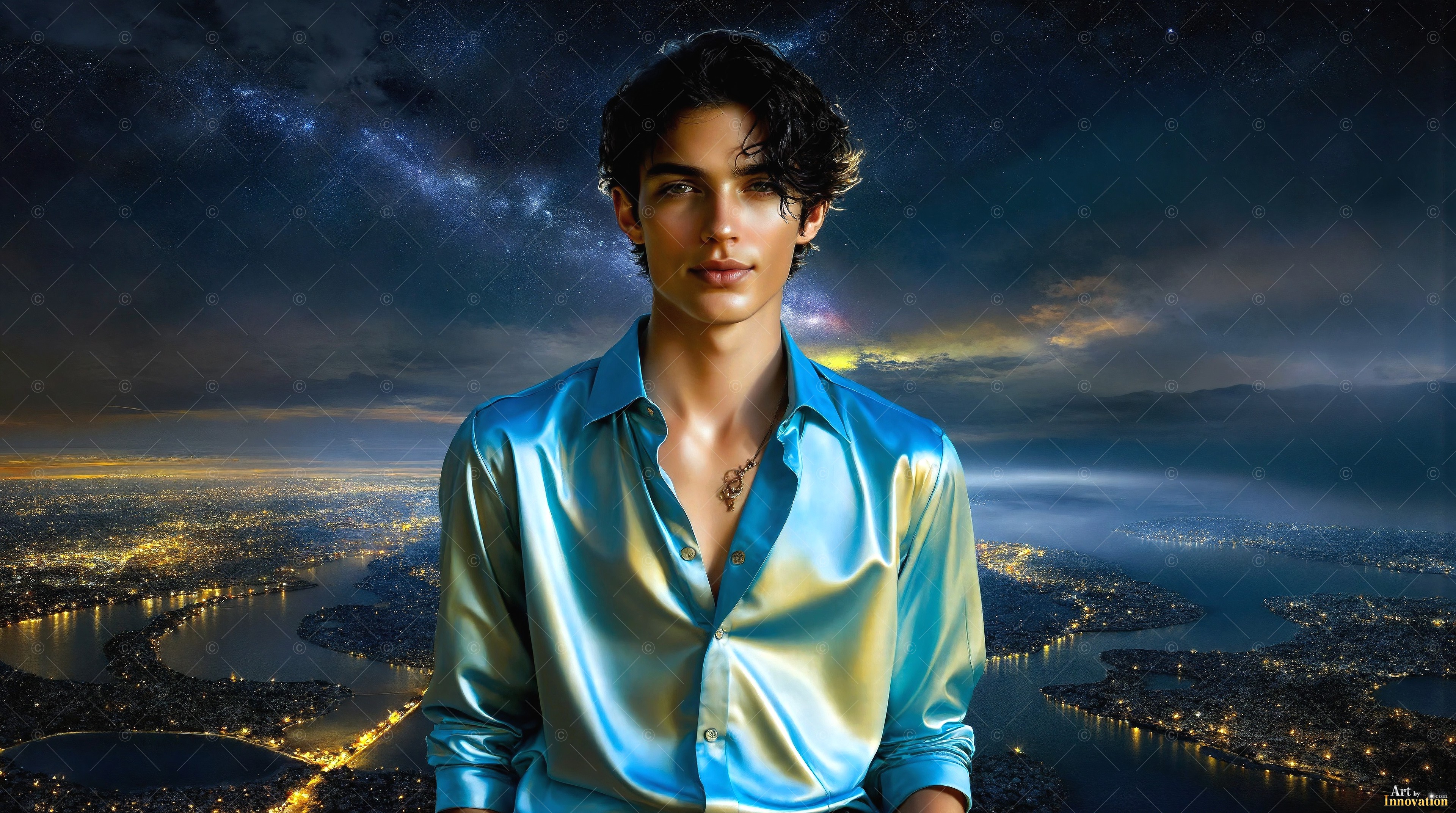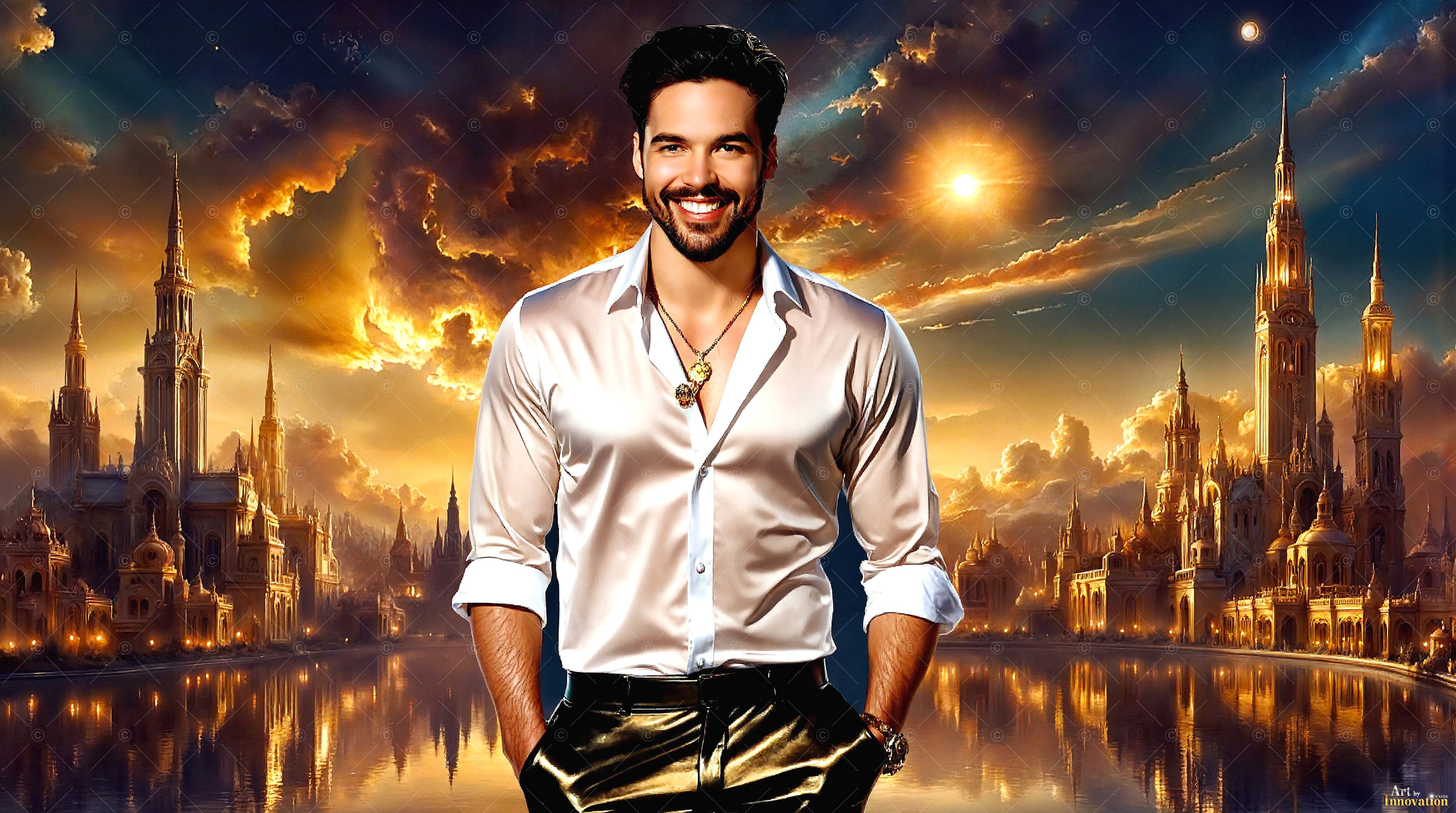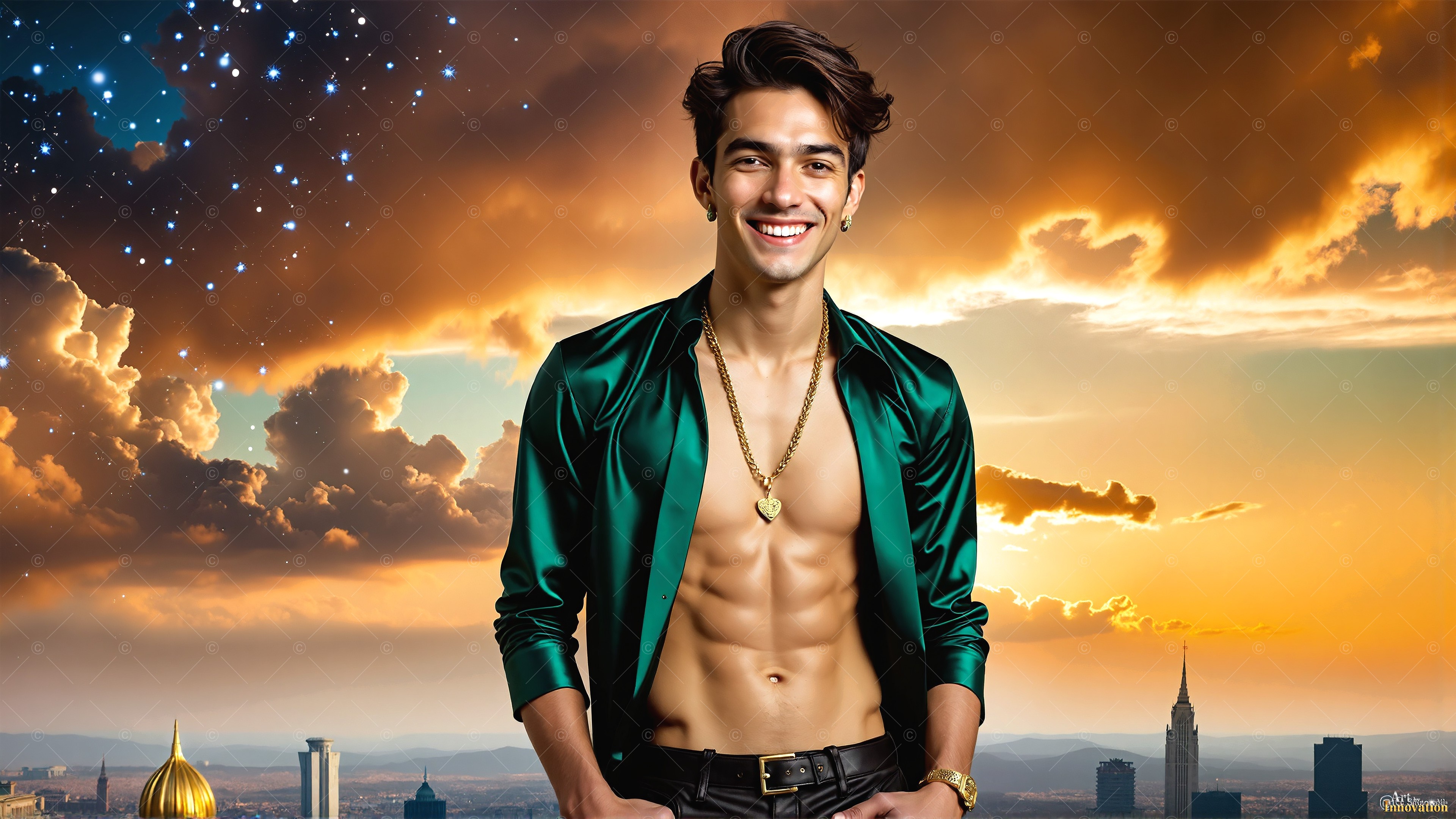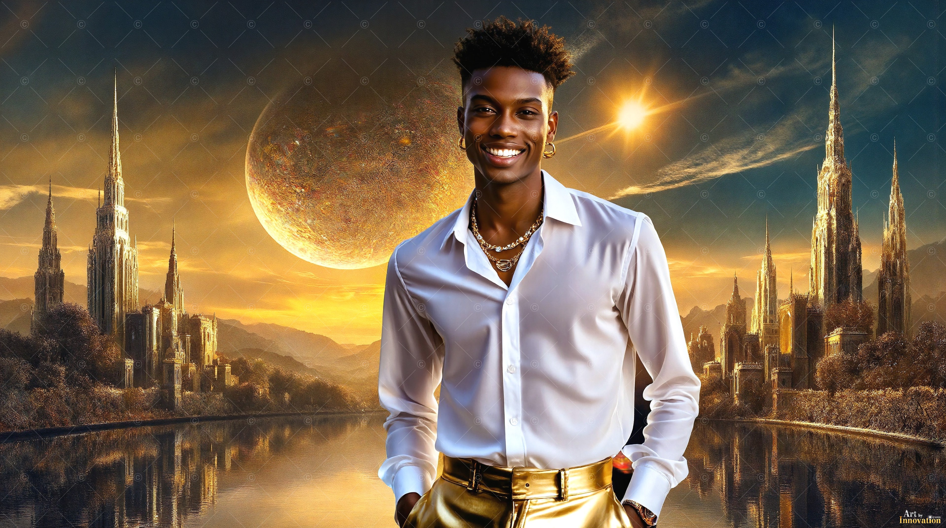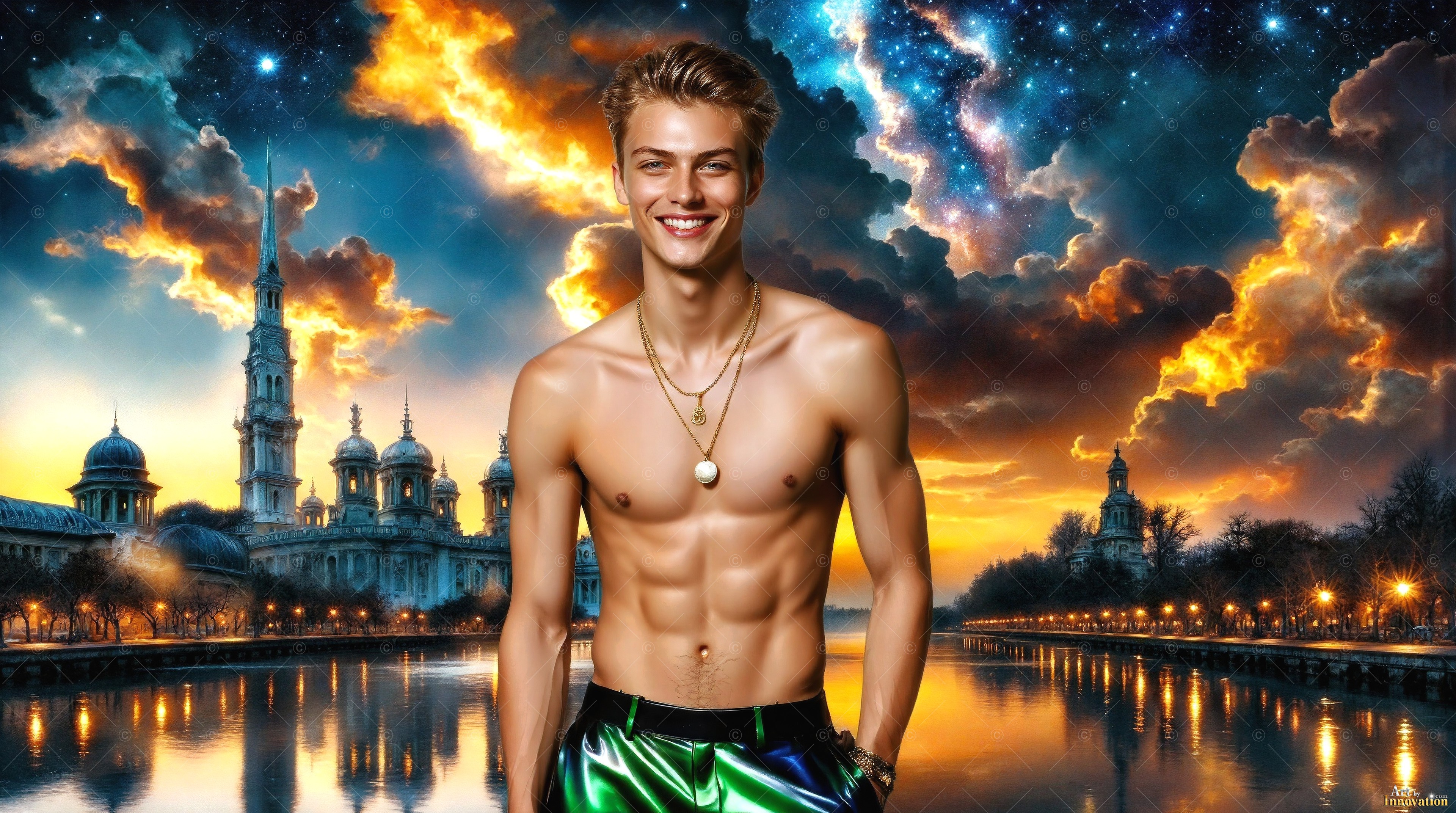 ByJDThe Beautiful Young Men of the Golden City, is a collection of AI generated images of sexy, glamorous, handsome guys in the heavens. In this fantasy photograph of a young men in their 20’s, on a balcony, overlooking a large golden city in the heavens. Generated to be as realistic as possible, in this this fantasy setting, with todays technology. Wearing jeans, an unbuttoned, vibrant, long-sleeve, button down shirt. The subject is enjoying a beautiful day outdoors. The mystical, galactic landscape, and the vibrant cosmic canopies, every detail, from the texture of the clouds, to the magnificent, majestic gothic architecture of the golden city, is crafted to create an atmosphere of reverence and divine glory. With a breathtaking scene of Salar de Uyuni at sunset, offering warm golden hour lighting. The heavenly landscape evokes a sense of freedom and tranquility, that is expresses through his facial features and smile, as day turns to night. The heavenly landscape evokes a sense of mysterious black space and light, with a vast galaxy that almost covers the image, the stars and constellations sparkle bright, in dark blue sky. On occasion the earth can be seen floating in the sky.