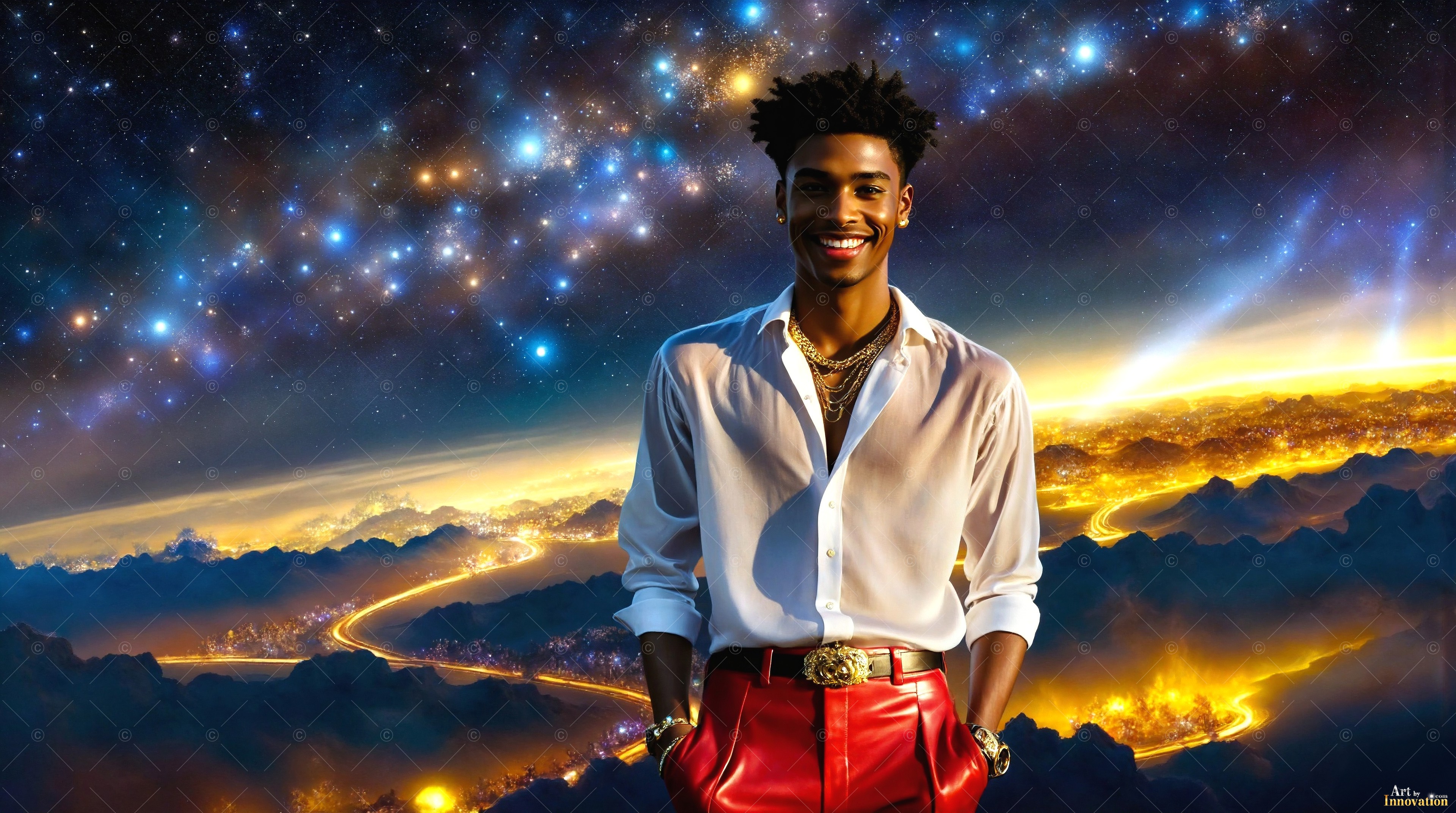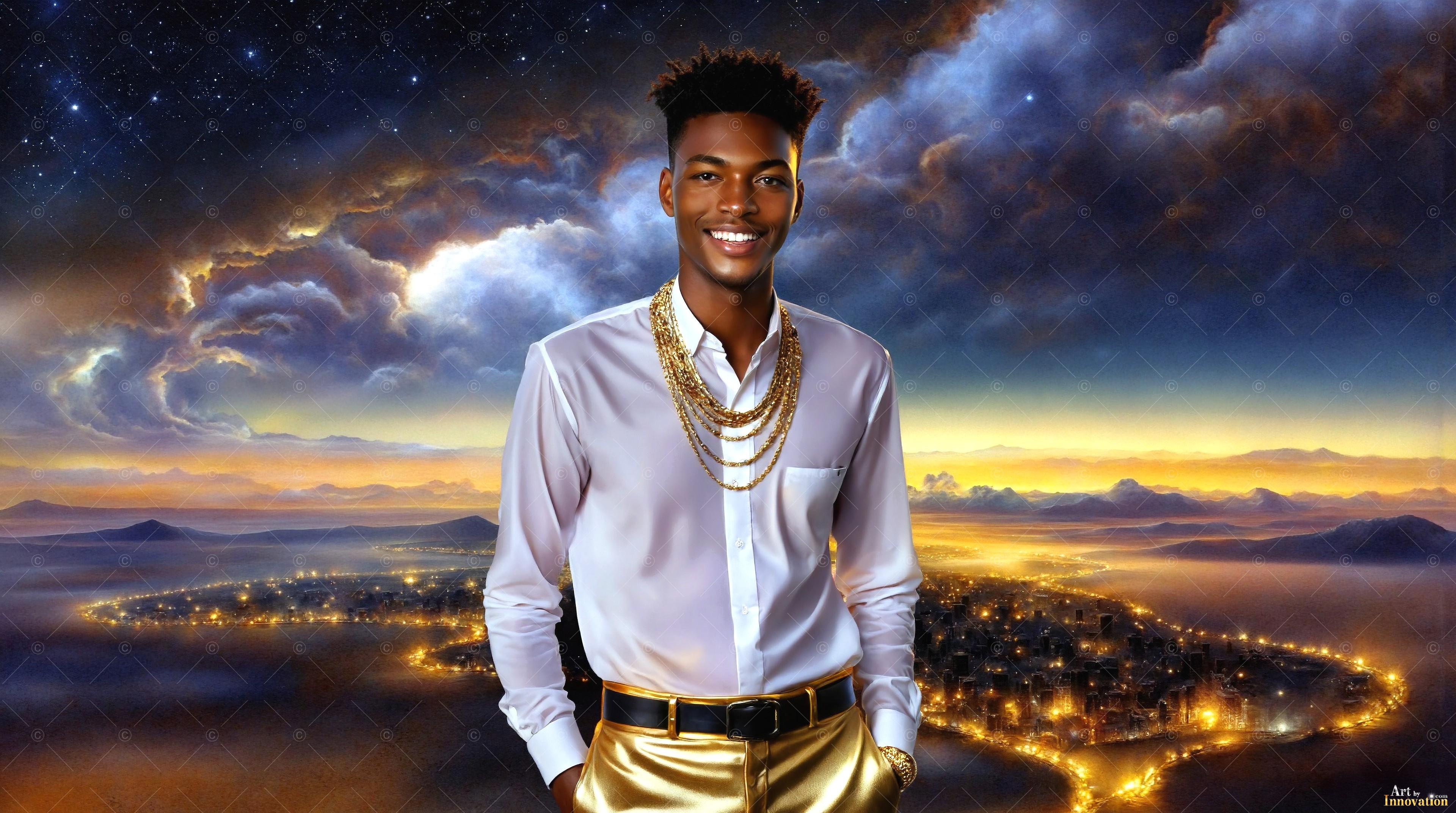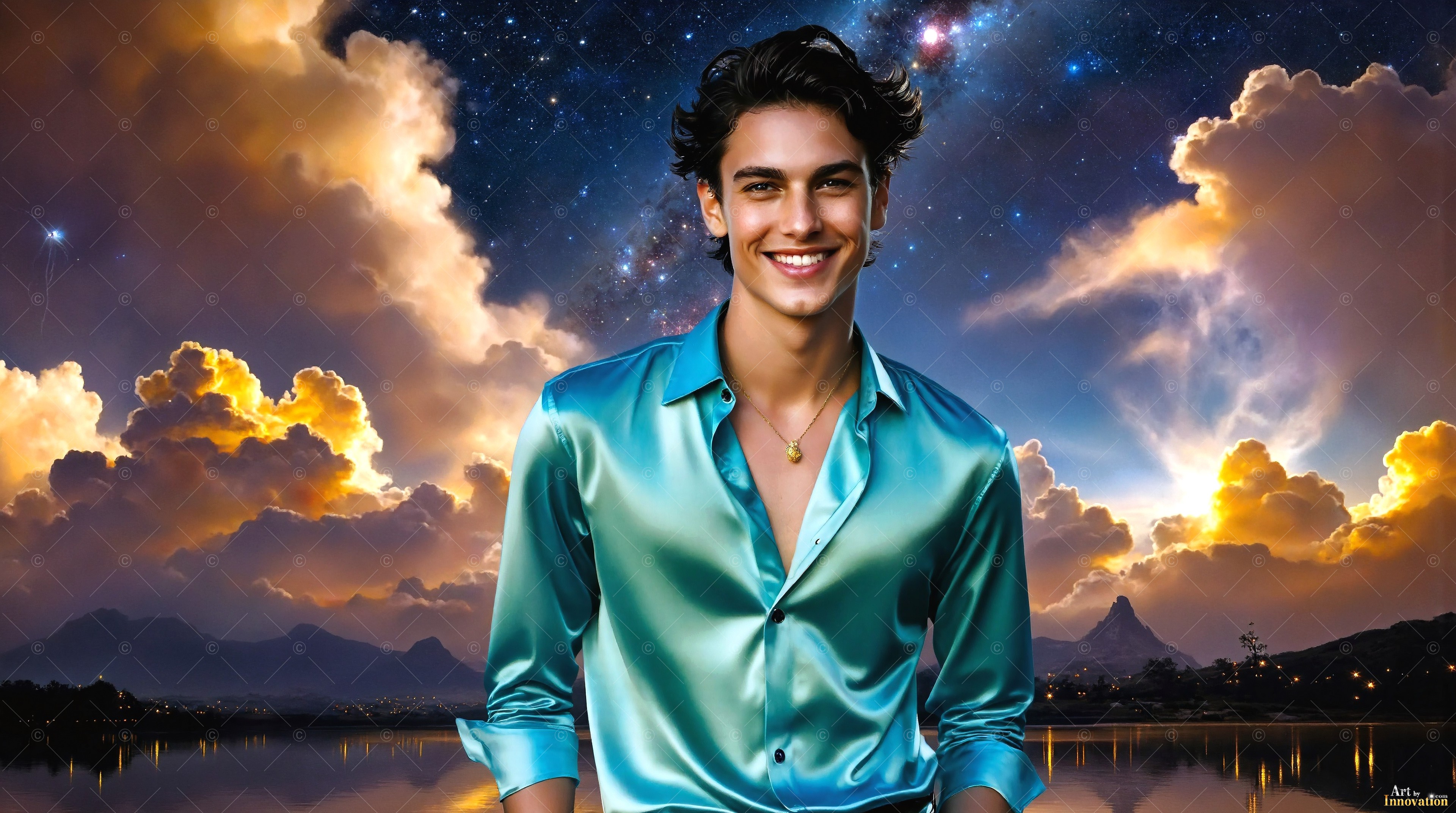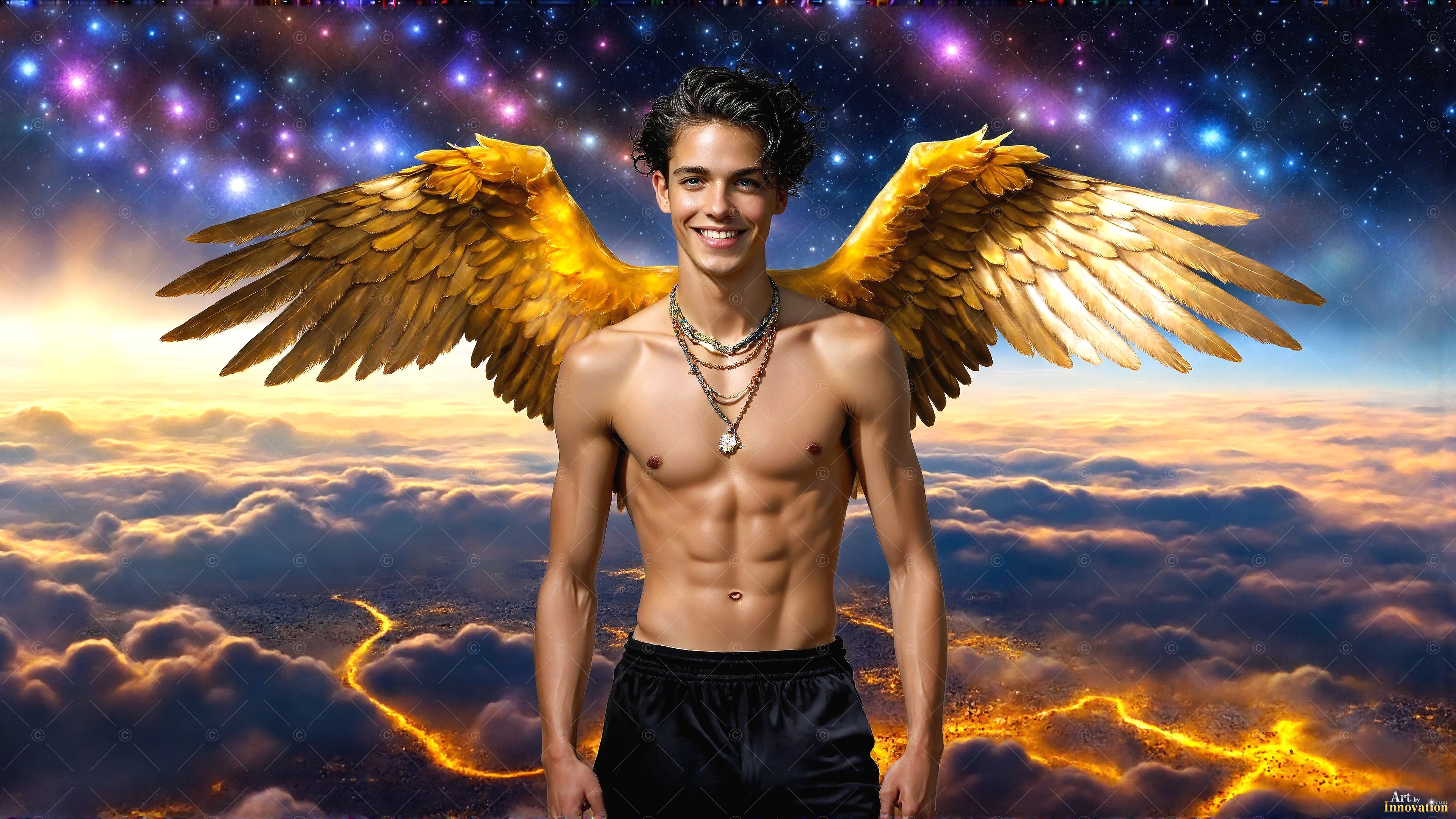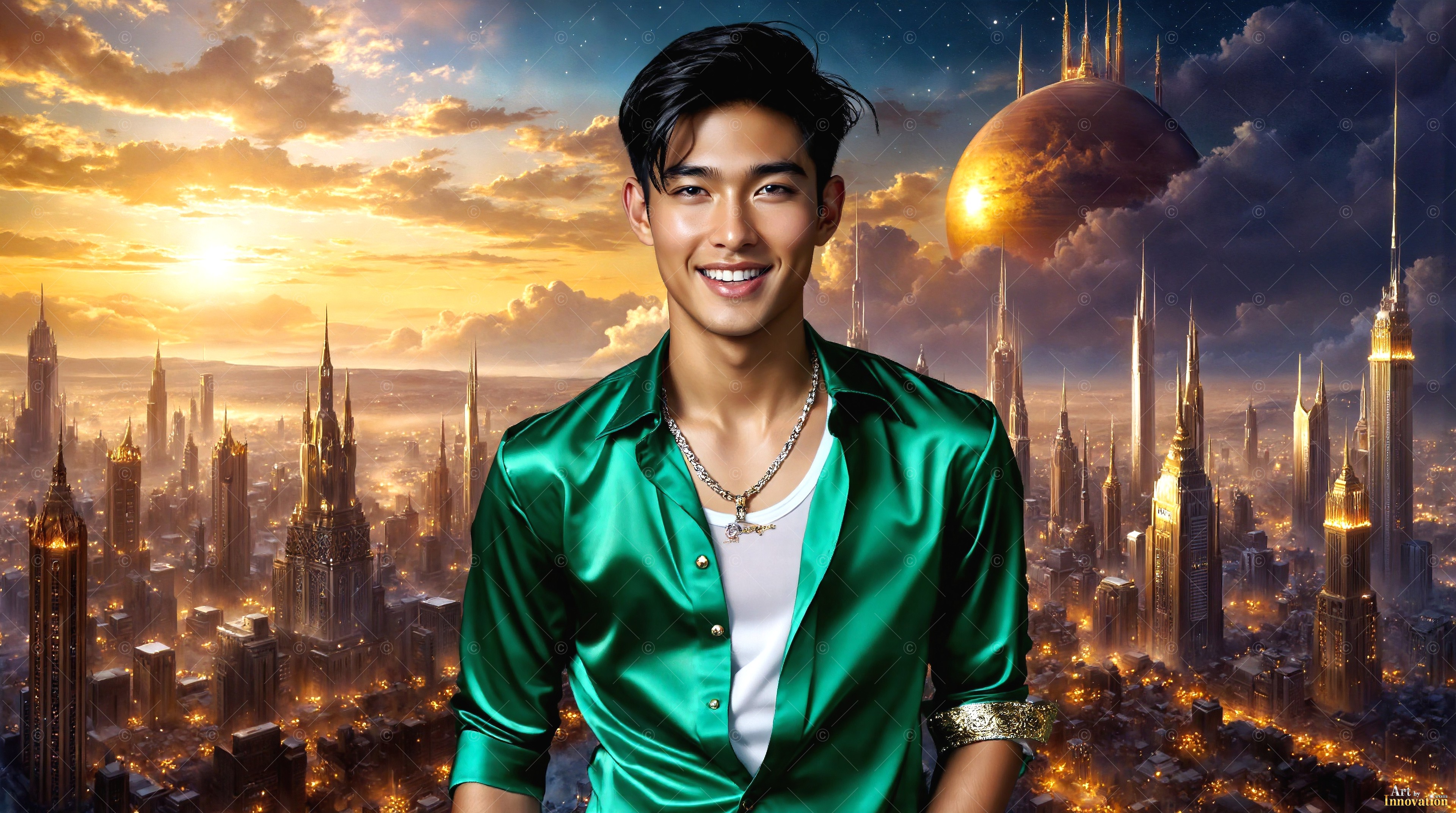 ByJDThe Beautiful Young Men of the Golden City, is a collection of AI generated images of sexy, glamorous, handsome guys in the heavens. In this fantasy photograph of a young men in their 20’s, on a balcony, overlooking a large golden city in the heavens. Generated to be as realistic as possible, in this this fantasy setting, with todays technology. Wearing jeans, an unbuttoned, vibrant, long-sleeve, button down shirt. The subject is enjoying a beautiful day outdoors. The mystical, galactic landscape, and the vibrant cosmic canopies, every detail, from the texture of the clouds, to the magnificent, majestic gothic architecture of the golden city, is crafted to create an atmosphere of reverence and divine glory. With a breathtaking scene of Salar de Uyuni at sunset, offering warm golden hour lighting. The heavenly landscape evokes a sense of freedom and tranquility, that is expresses through his facial features and smile, as day turns to night. The heavenly landscape evokes a sense of mysterious black space and light, with a vast galaxy that almost covers the image, the stars and constellations sparkle bright, in dark blue sky. On occasion the earth can be seen floating in the sky.