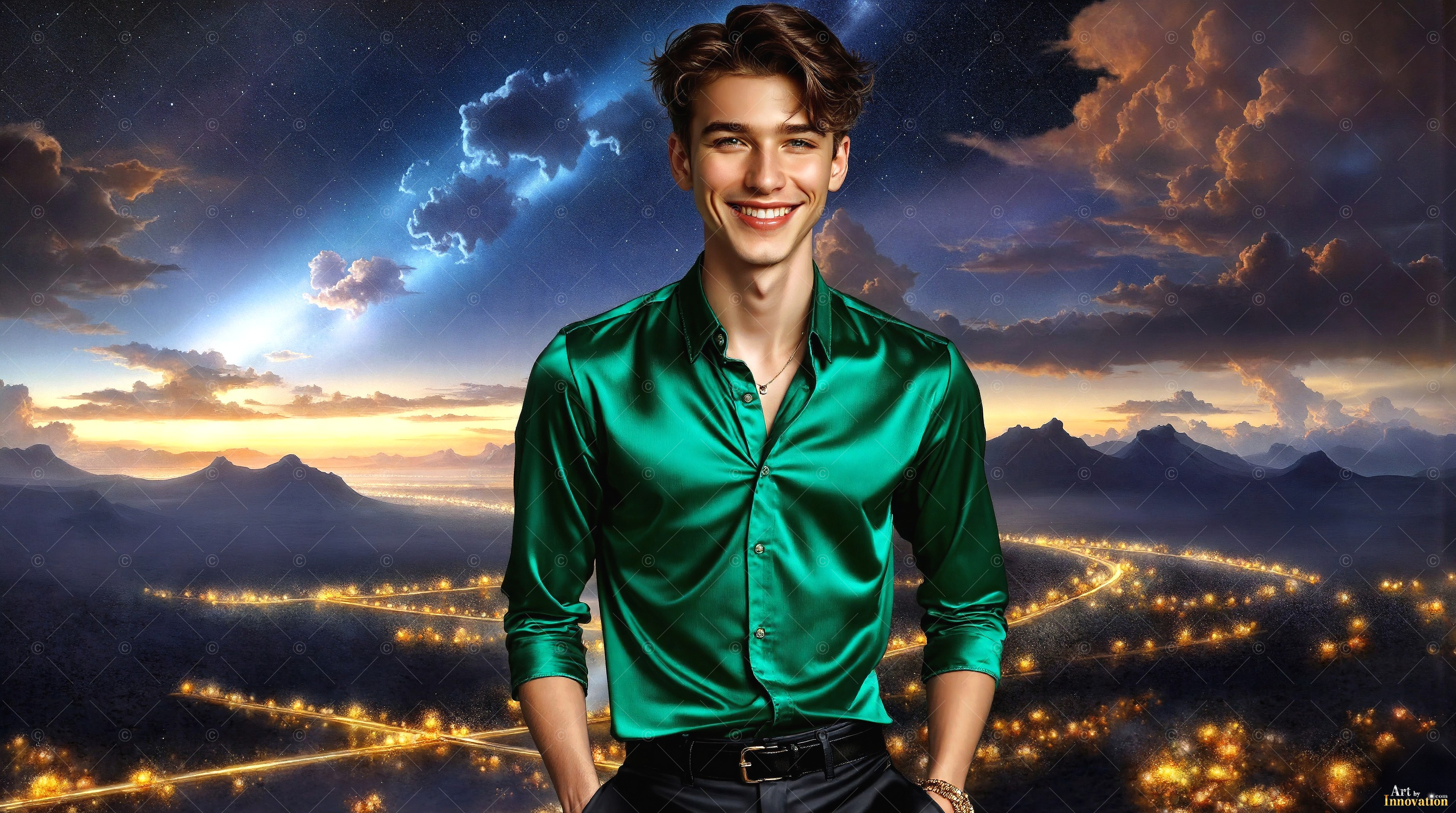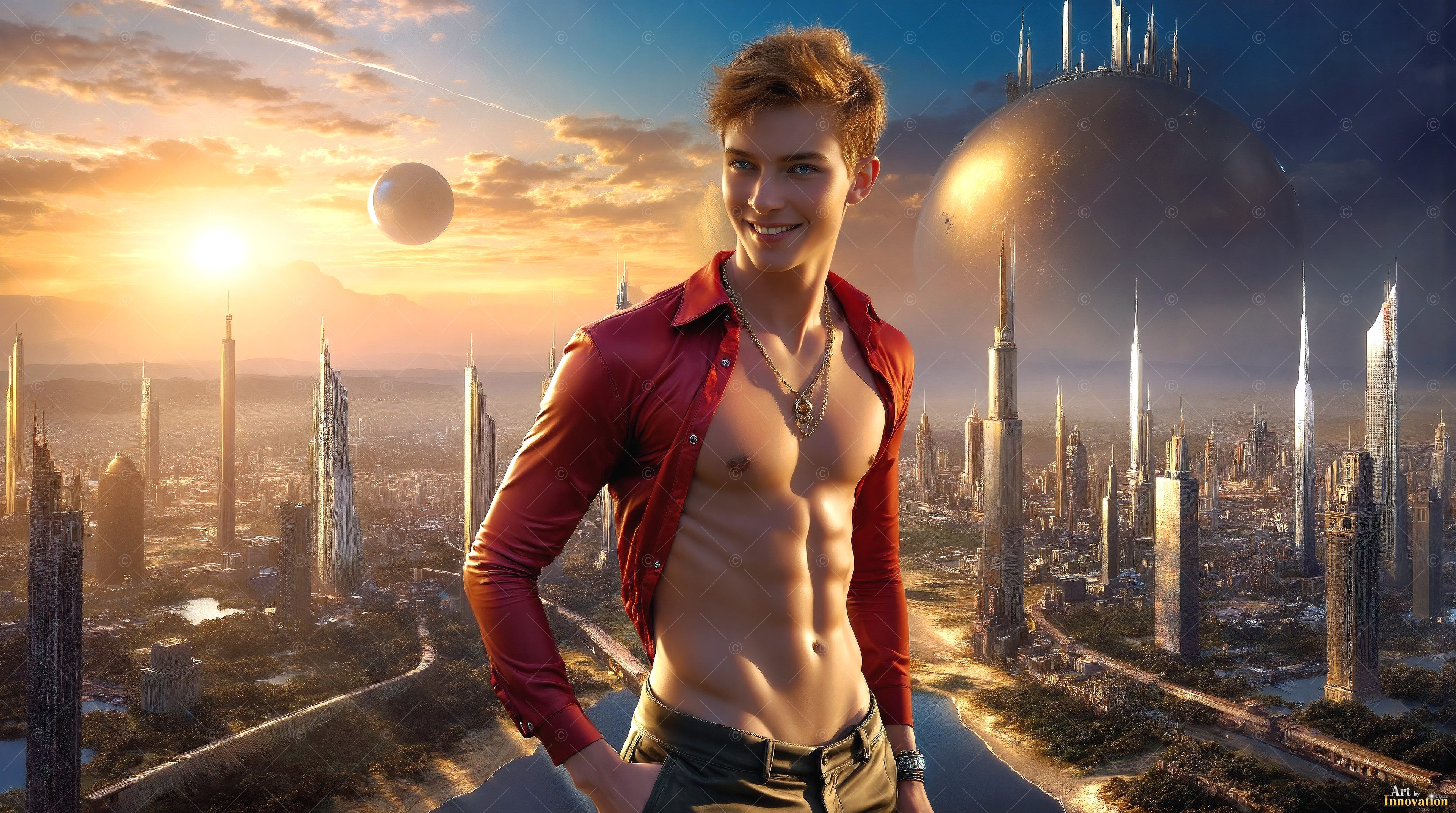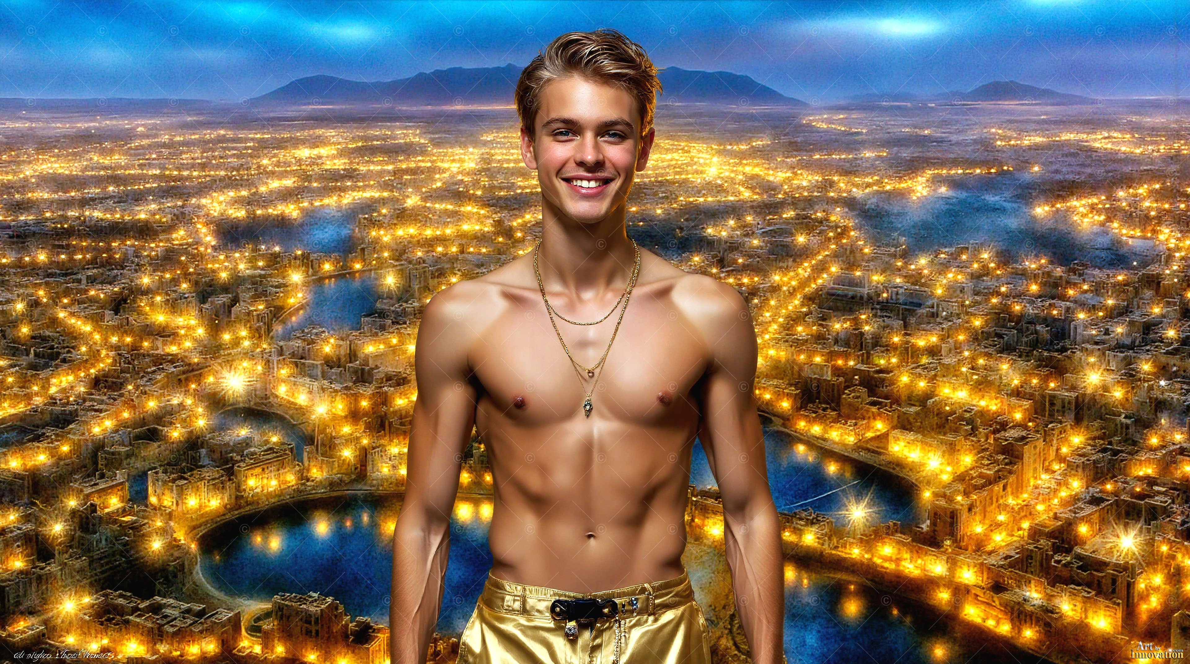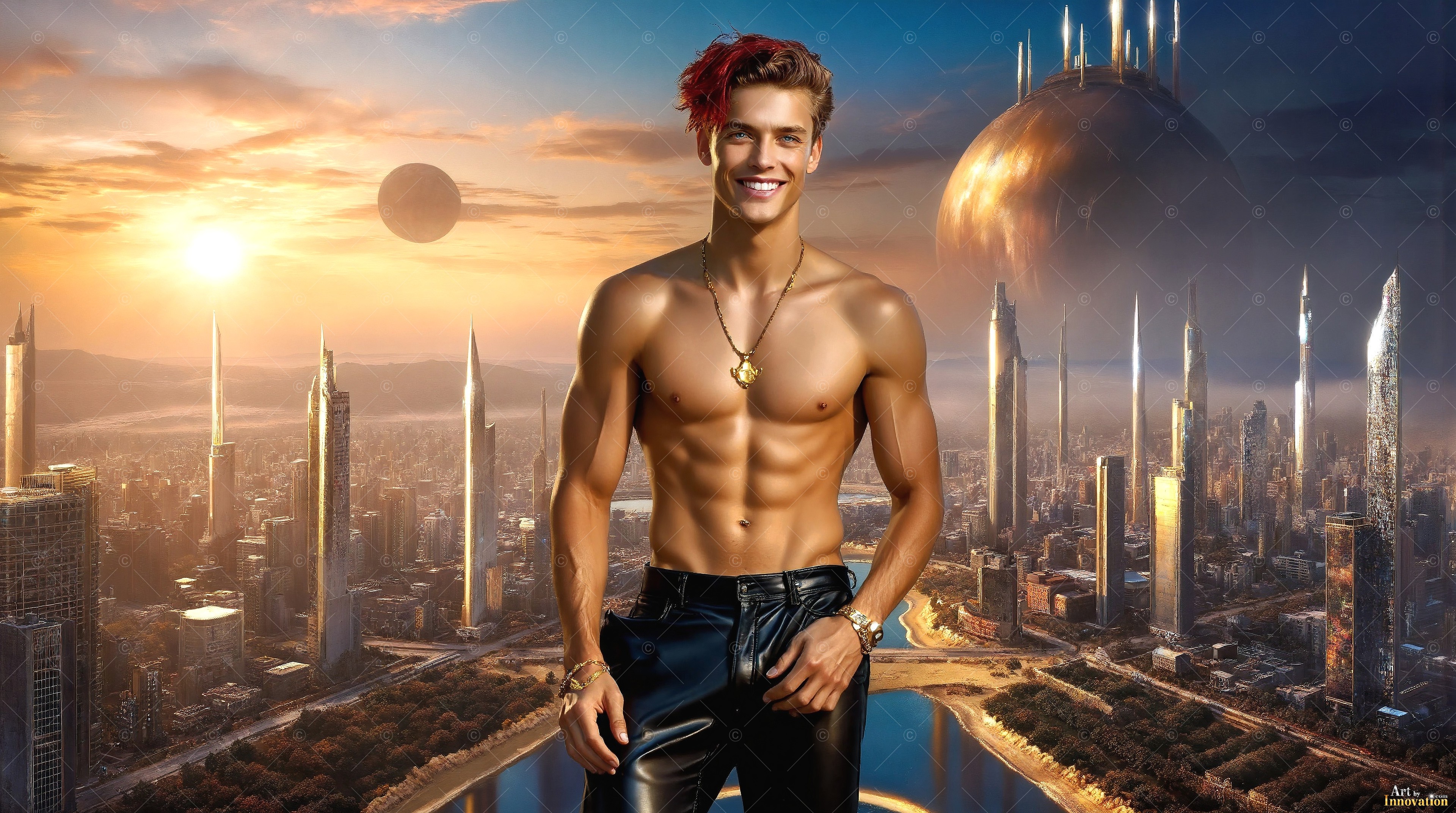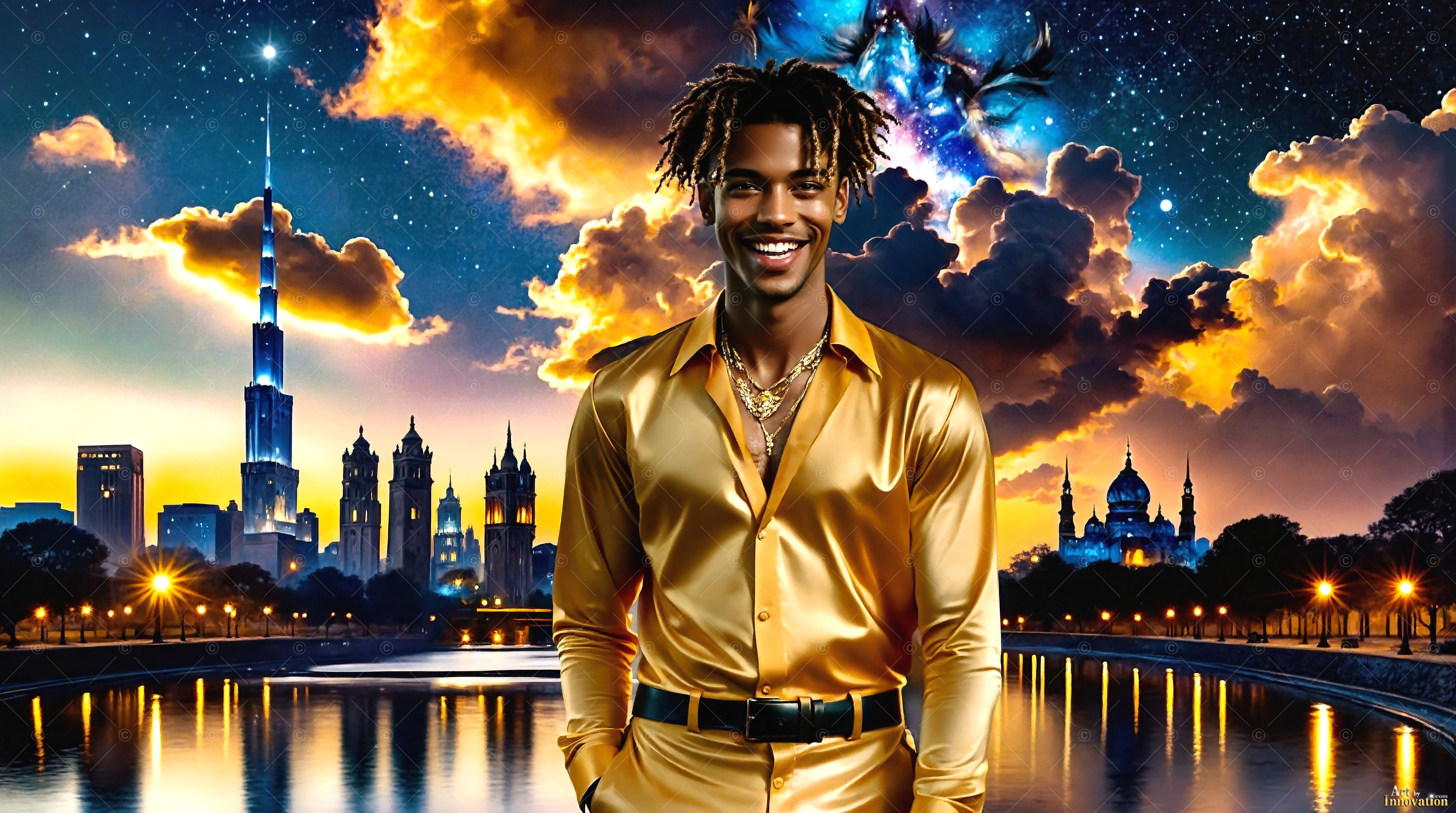 ByJDThe Beautiful Young Men of the Golden City, is a collection of AI generated images of sexy, glamorous, handsome guys in the heavens. In this fantasy photograph of a young men in their 20’s, on a balcony, overlooking a large golden city in the heavens. Generated to be as realistic as possible, in this this fantasy setting, with todays technology. Wearing jeans, an unbuttoned, vibrant, long-sleeve, button down shirt. The subject is enjoying a beautiful day outdoors. The mystical, galactic landscape, and the vibrant cosmic canopies, every detail, from the texture of the clouds, to the magnificent, majestic gothic architecture of the golden city, is crafted to create an atmosphere of reverence and divine glory. With a breathtaking scene of Salar de Uyuni at sunset, offering warm golden hour lighting. The heavenly landscape evokes a sense of freedom and tranquility, that is expresses through his facial features and smile, as day turns to night. The heavenly landscape evokes a sense of mysterious black space and light, with a vast galaxy that almost covers the image, the stars and constellations sparkle bright, in dark blue sky. On occasion the earth can be seen floating in the sky.