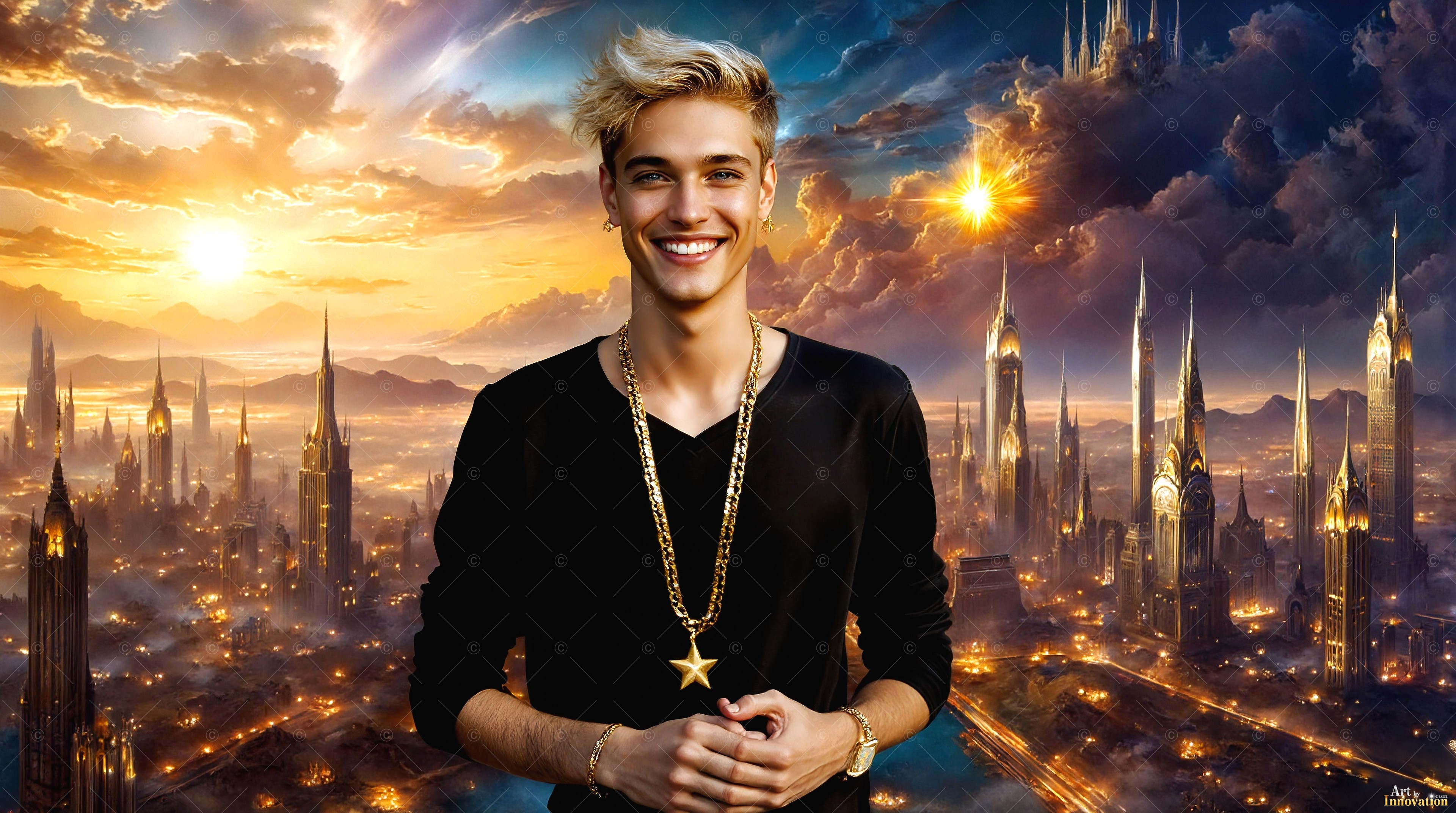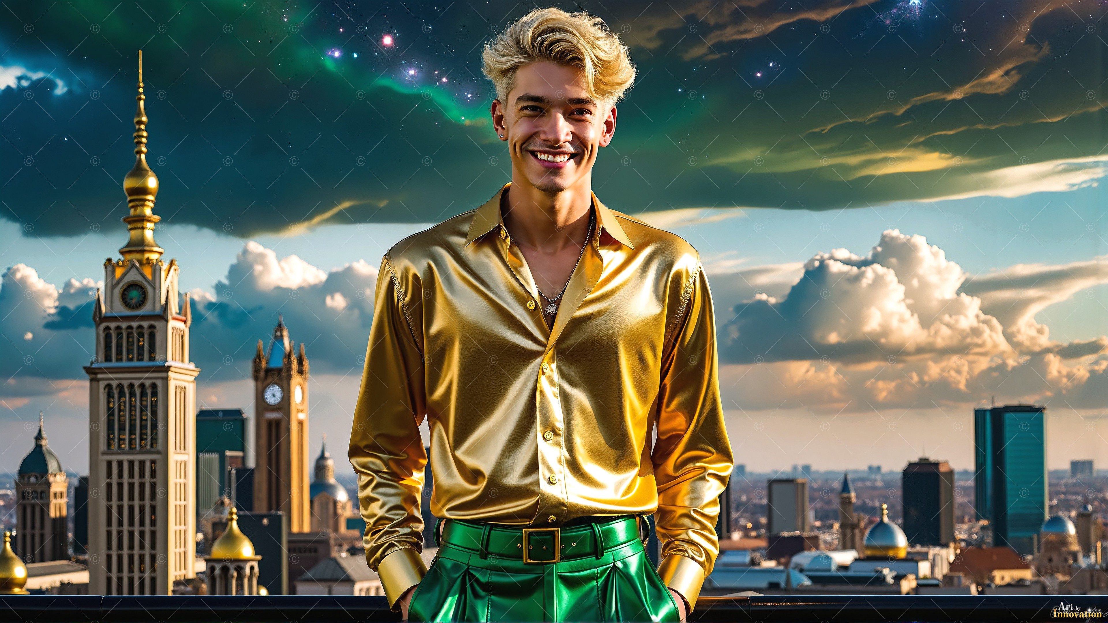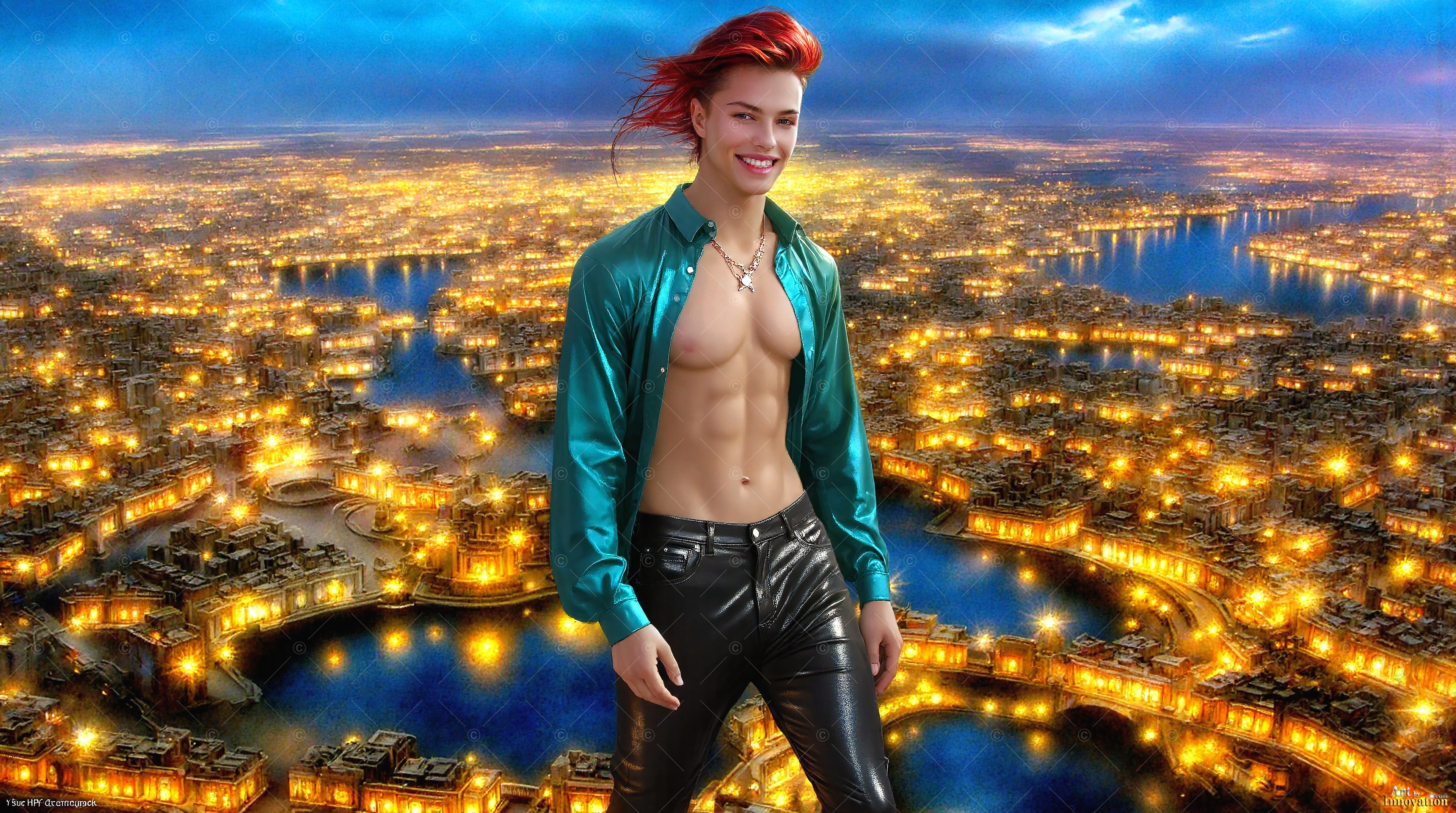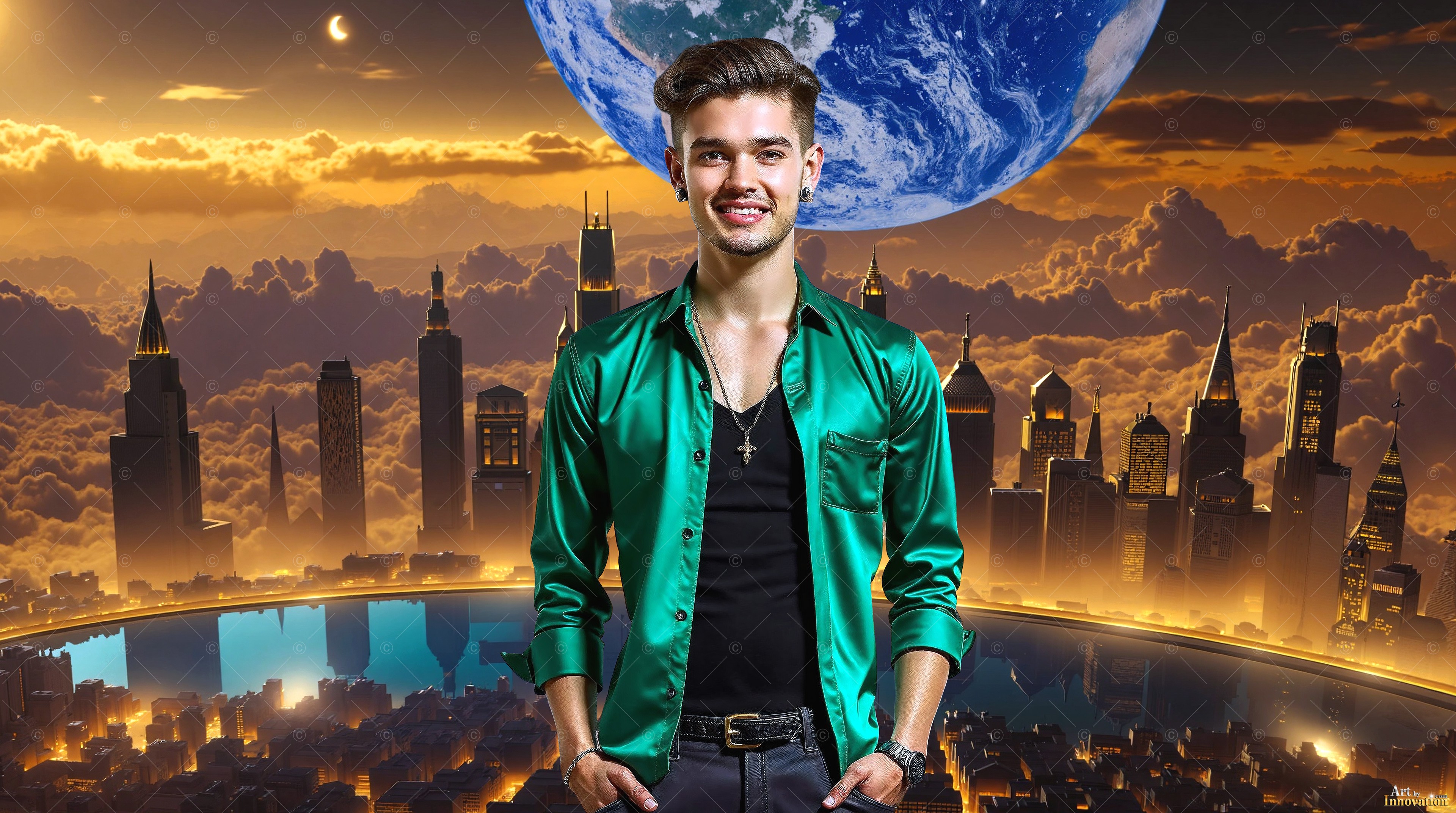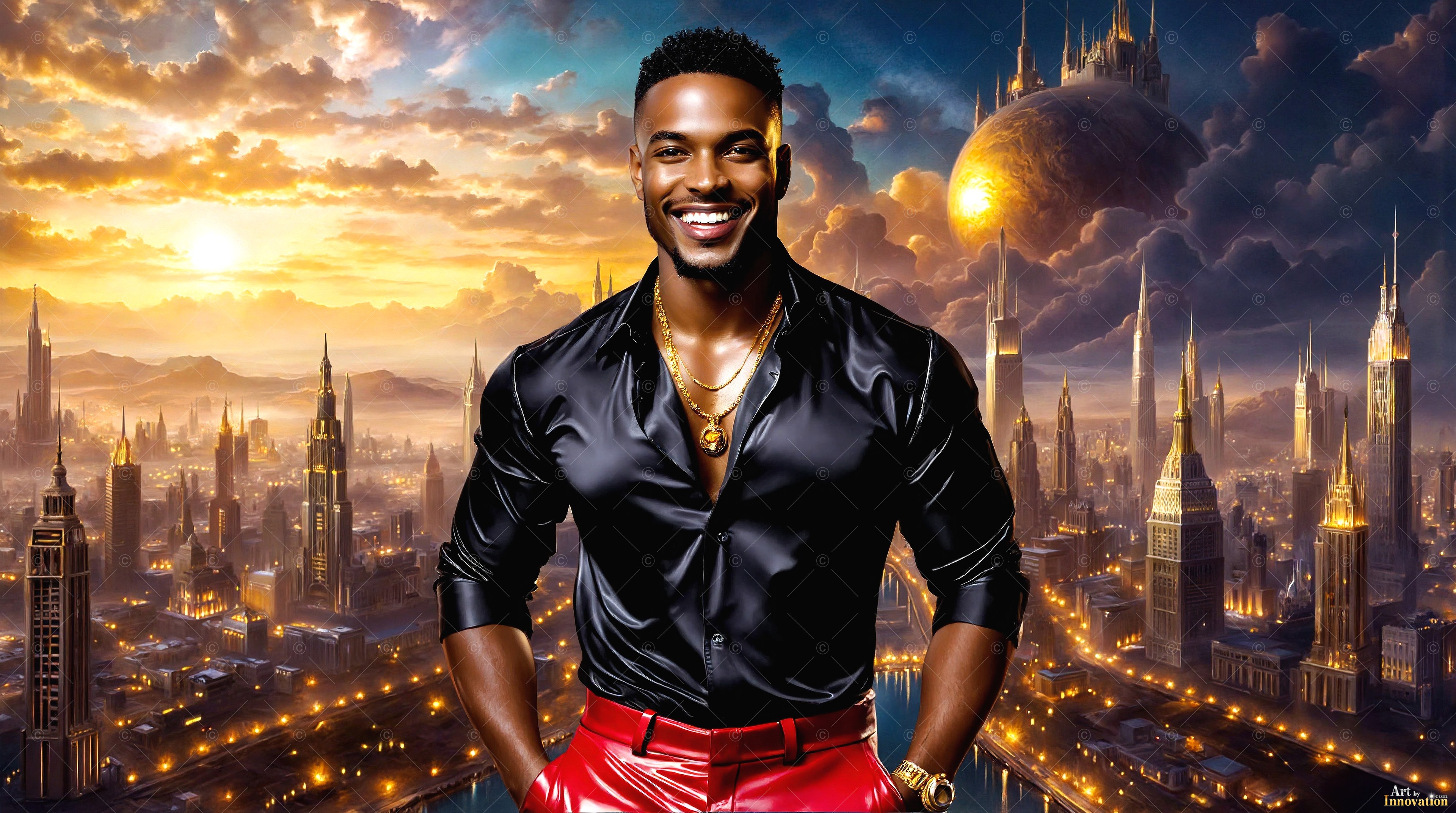 ByJDThe Beautiful Young Men of the Golden City, is a collection of AI generated images of sexy, glamorous, handsome guys in the heavens. In this fantasy photograph of a young men in their 20’s, on a balcony, overlooking a large golden city in the heavens. Generated to be as realistic as possible, in this this fantasy setting, with todays technology. Wearing jeans, an unbuttoned, vibrant, long-sleeve, button down shirt. The subject is enjoying a beautiful day outdoors. The mystical, galactic landscape, and the vibrant cosmic canopies, every detail, from the texture of the clouds, to the magnificent, majestic gothic architecture of the golden city, is crafted to create an atmosphere of reverence and divine glory. With a breathtaking scene of Salar de Uyuni at sunset, offering warm golden hour lighting. The heavenly landscape evokes a sense of freedom and tranquility, that is expresses through his facial features and smile, as day turns to night. The heavenly landscape evokes a sense of mysterious black space and light, with a vast galaxy that almost covers the image, the stars and constellations sparkle bright, in dark blue sky. On occasion the earth can be seen floating in the sky.
