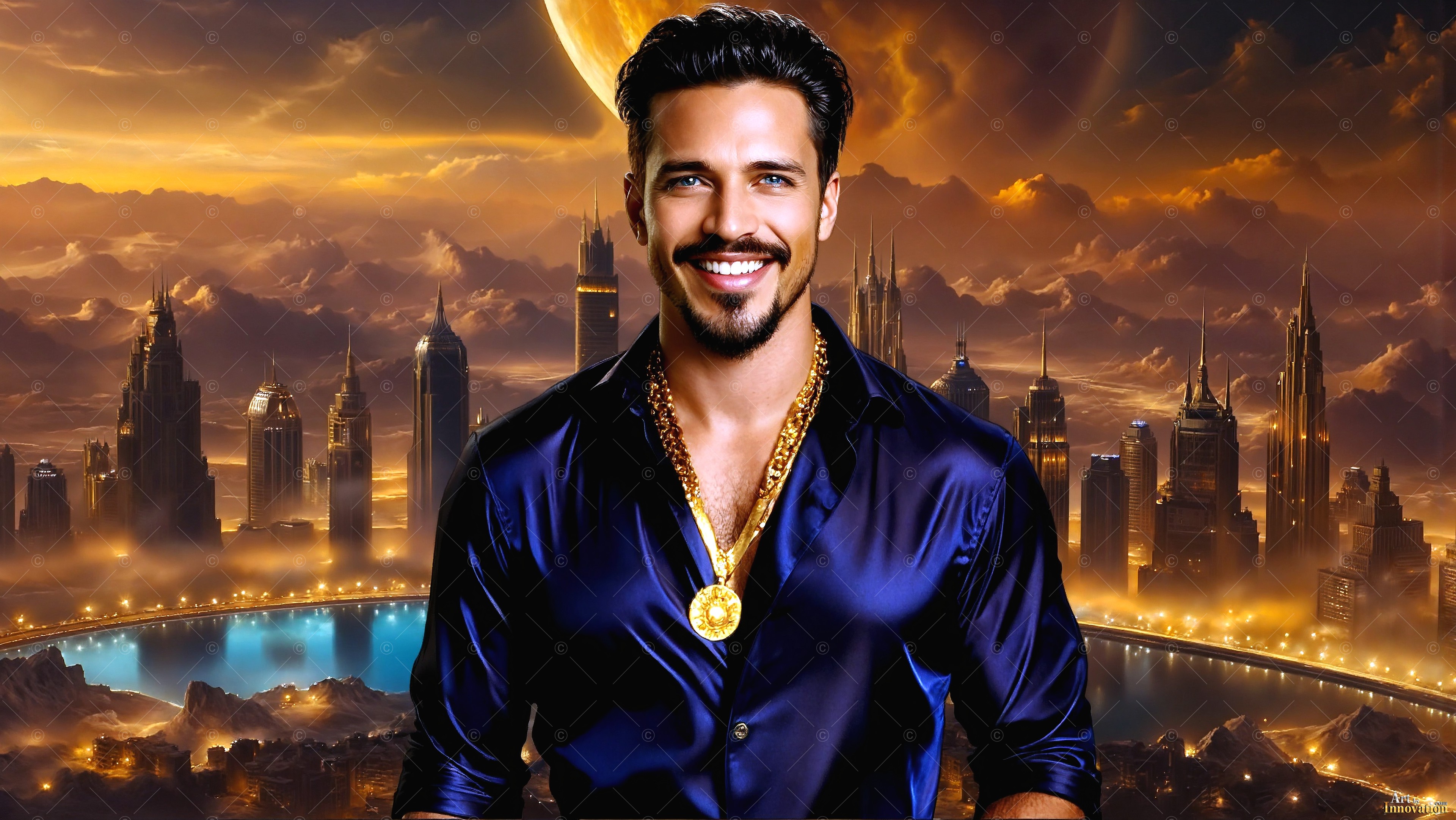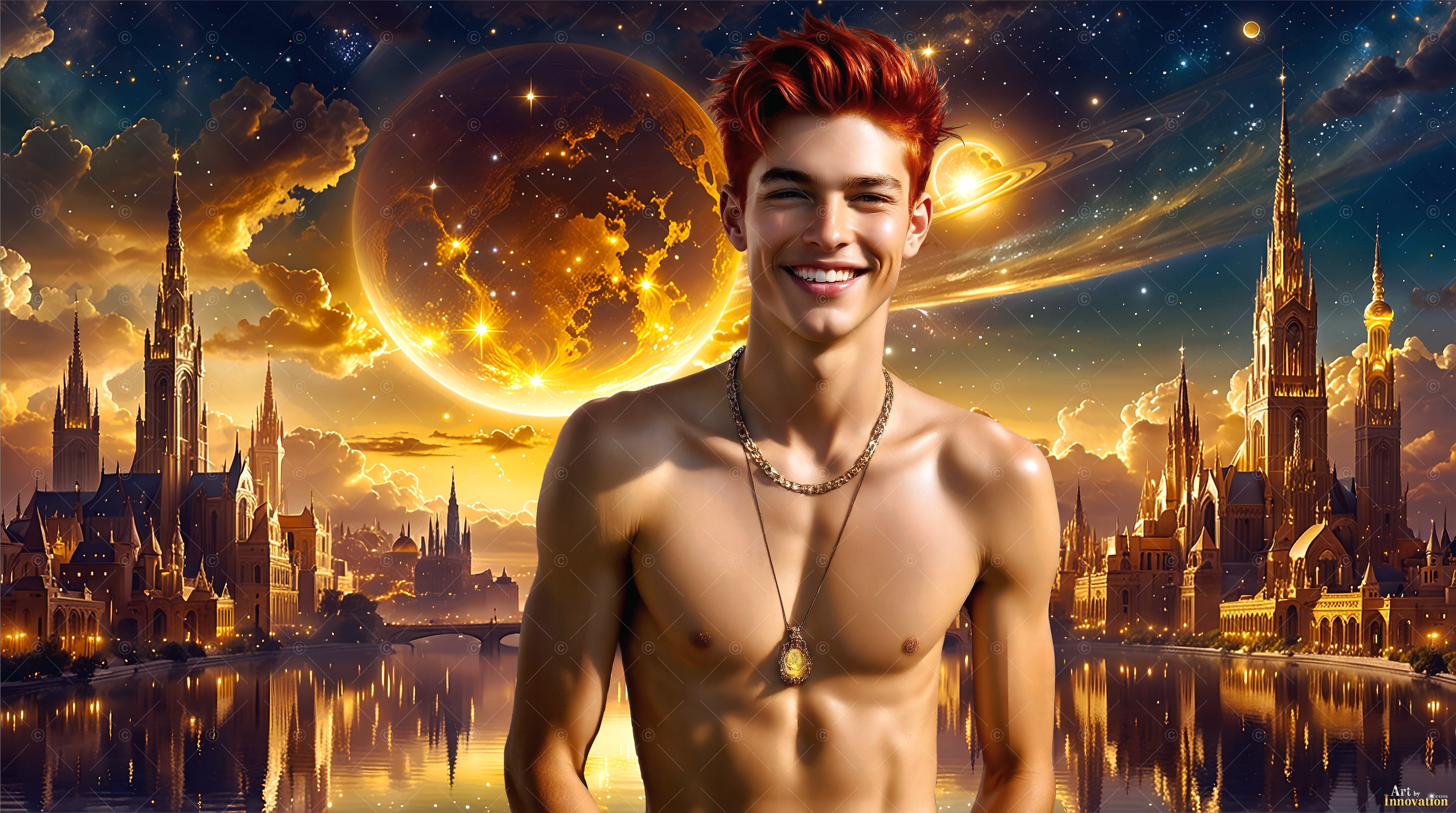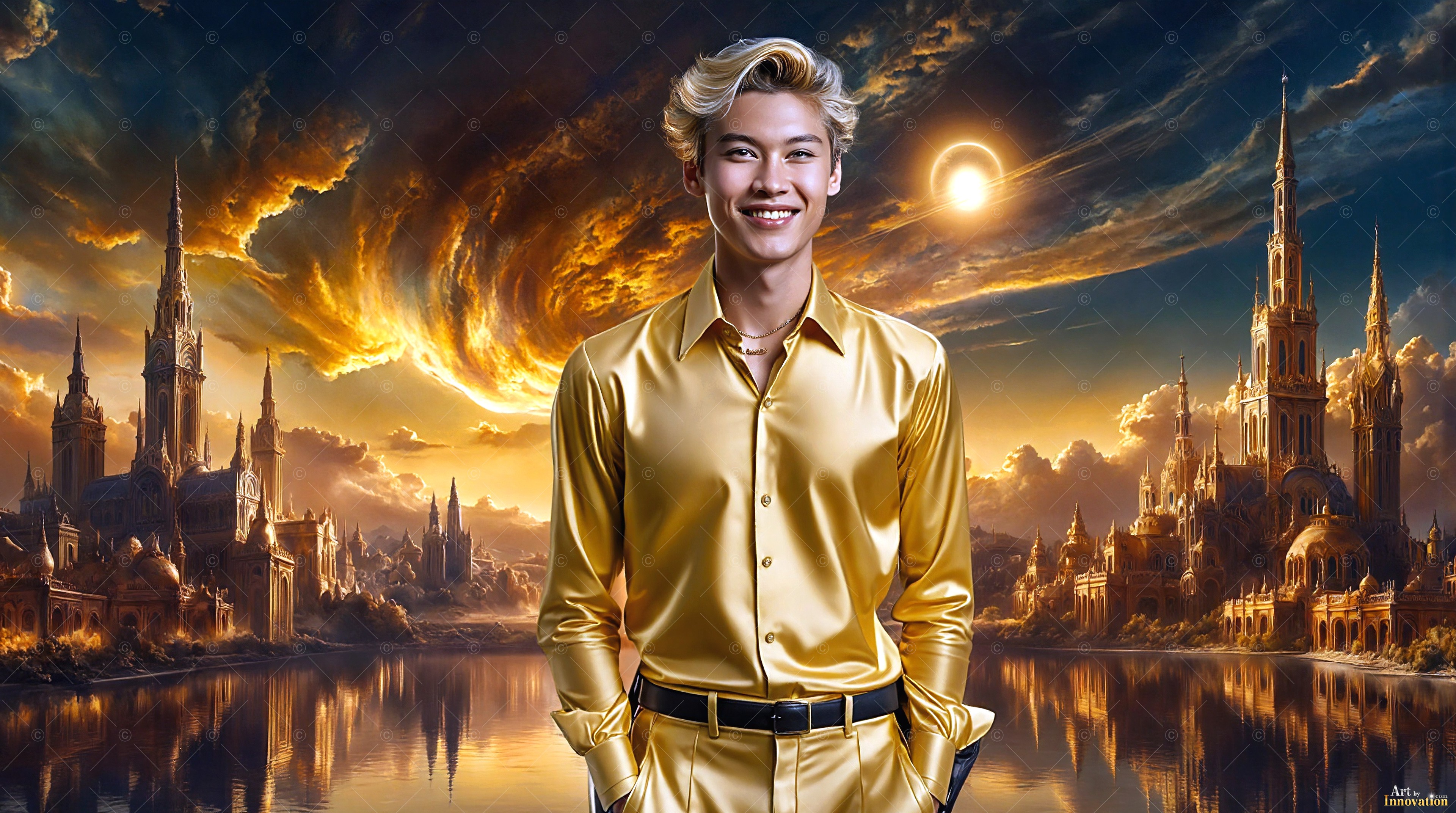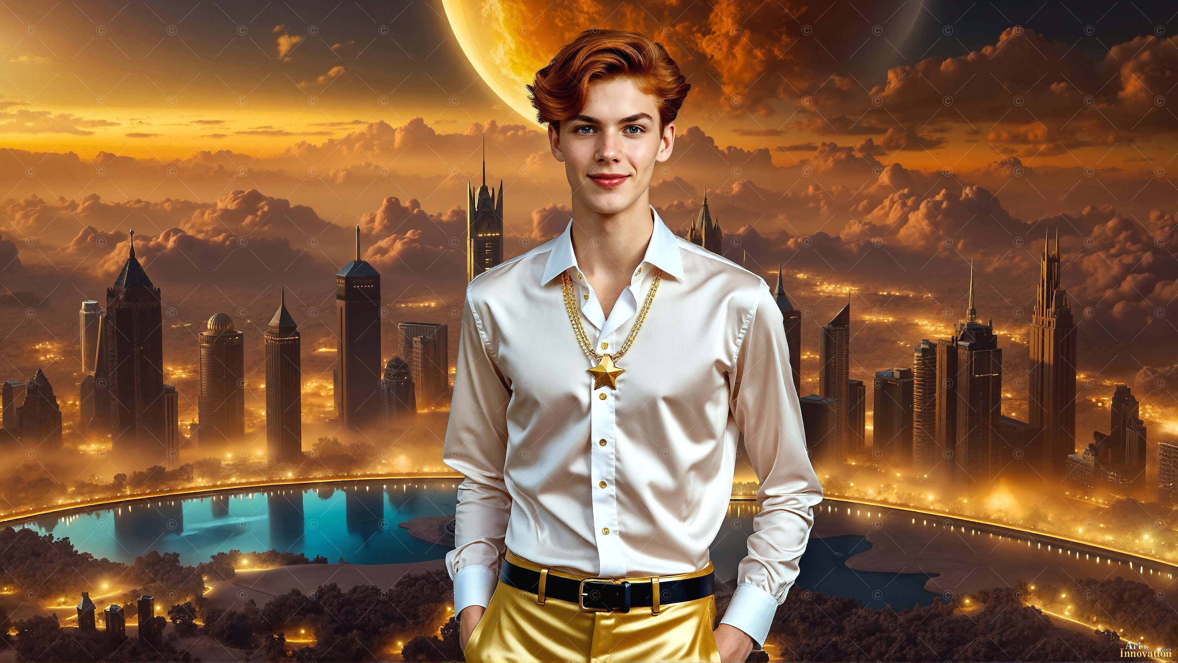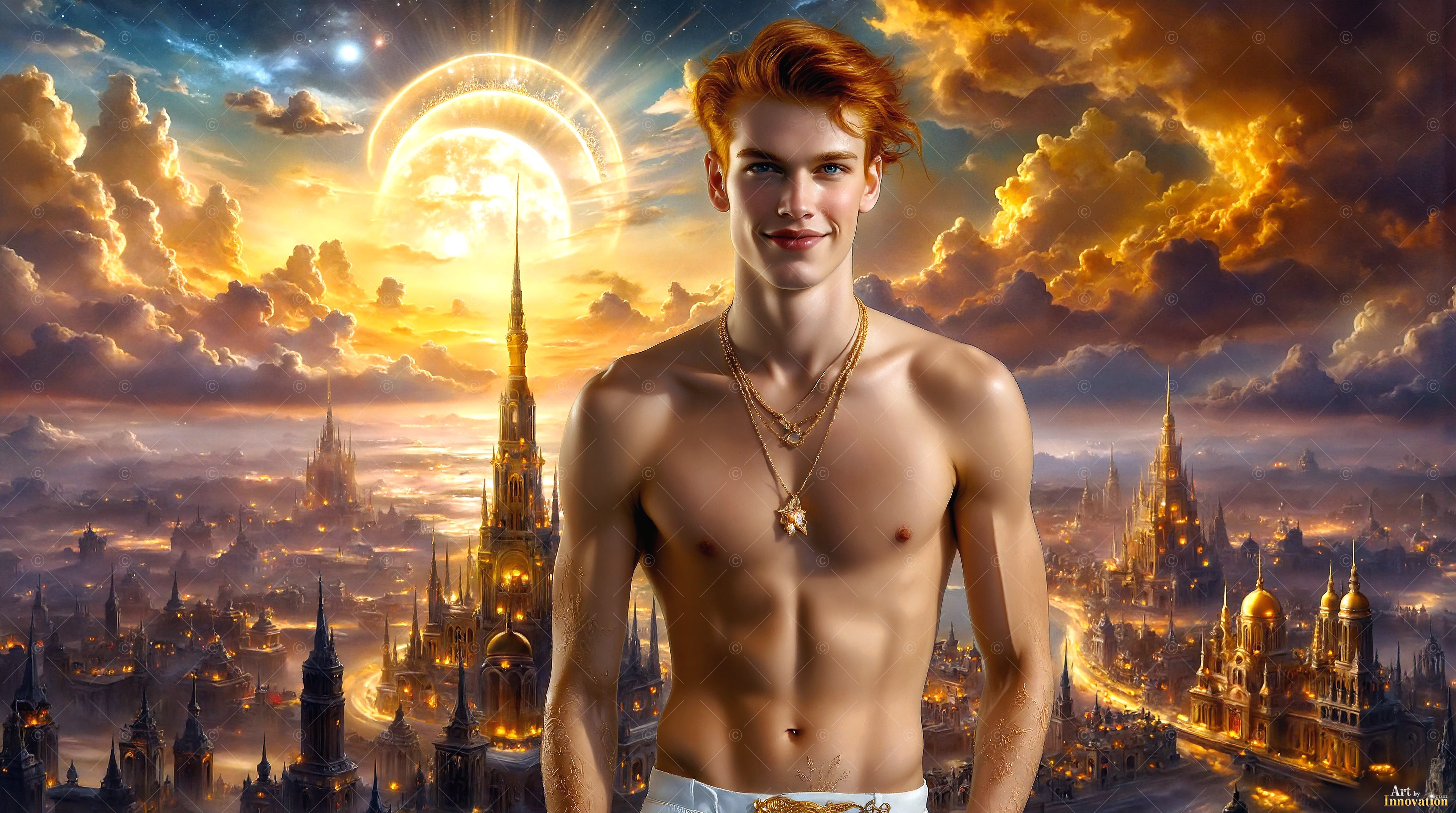 ByJDThe Beautiful Young Men of the Golden City, is a collection of AI generated images of sexy, glamorous, handsome guys in the heavens. In this fantasy photograph of a young men in their 20’s, on a balcony, overlooking a large golden city in the heavens. Generated to be as realistic as possible, in this this fantasy setting, with todays technology. Wearing jeans, an unbuttoned, vibrant, long-sleeve, button down shirt. The subject is enjoying a beautiful day outdoors. The mystical, galactic landscape, and the vibrant cosmic canopies, every detail, from the texture of the clouds, to the magnificent, majestic gothic architecture of the golden city, is crafted to create an atmosphere of reverence and divine glory. With a breathtaking scene of Salar de Uyuni at sunset, offering warm golden hour lighting. The heavenly landscape evokes a sense of freedom and tranquility, that is expresses through his facial features and smile, as day turns to night. The heavenly landscape evokes a sense of mysterious black space and light, with a vast galaxy that almost covers the image, the stars and constellations sparkle bright, in dark blue sky. On occasion the earth can be seen floating in the sky.