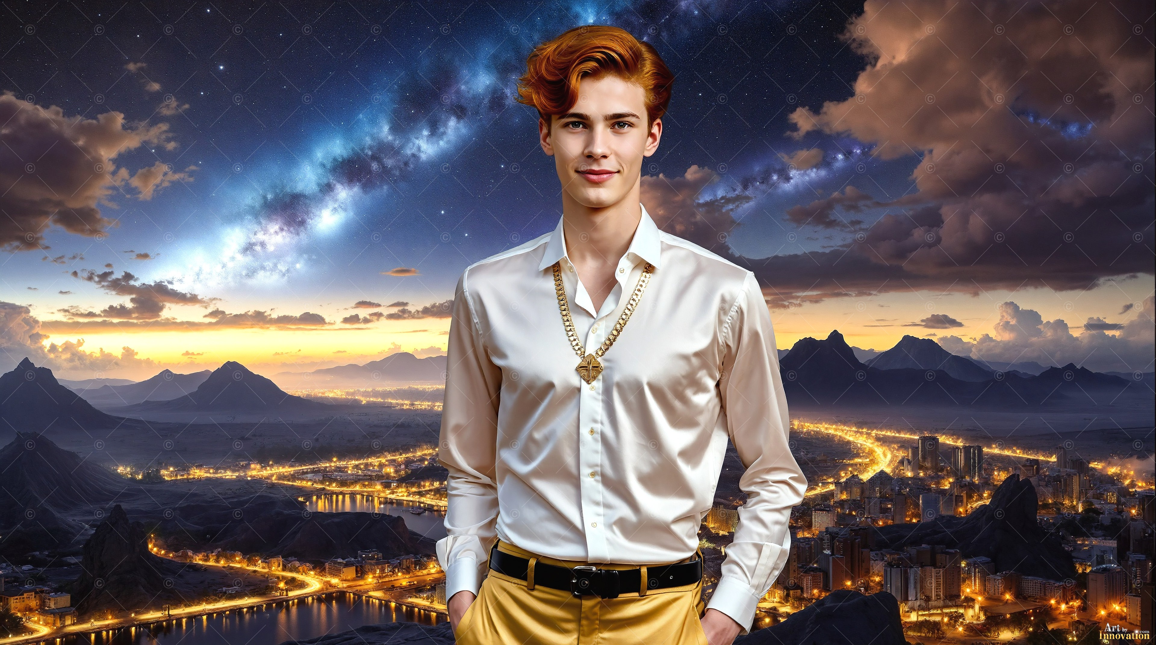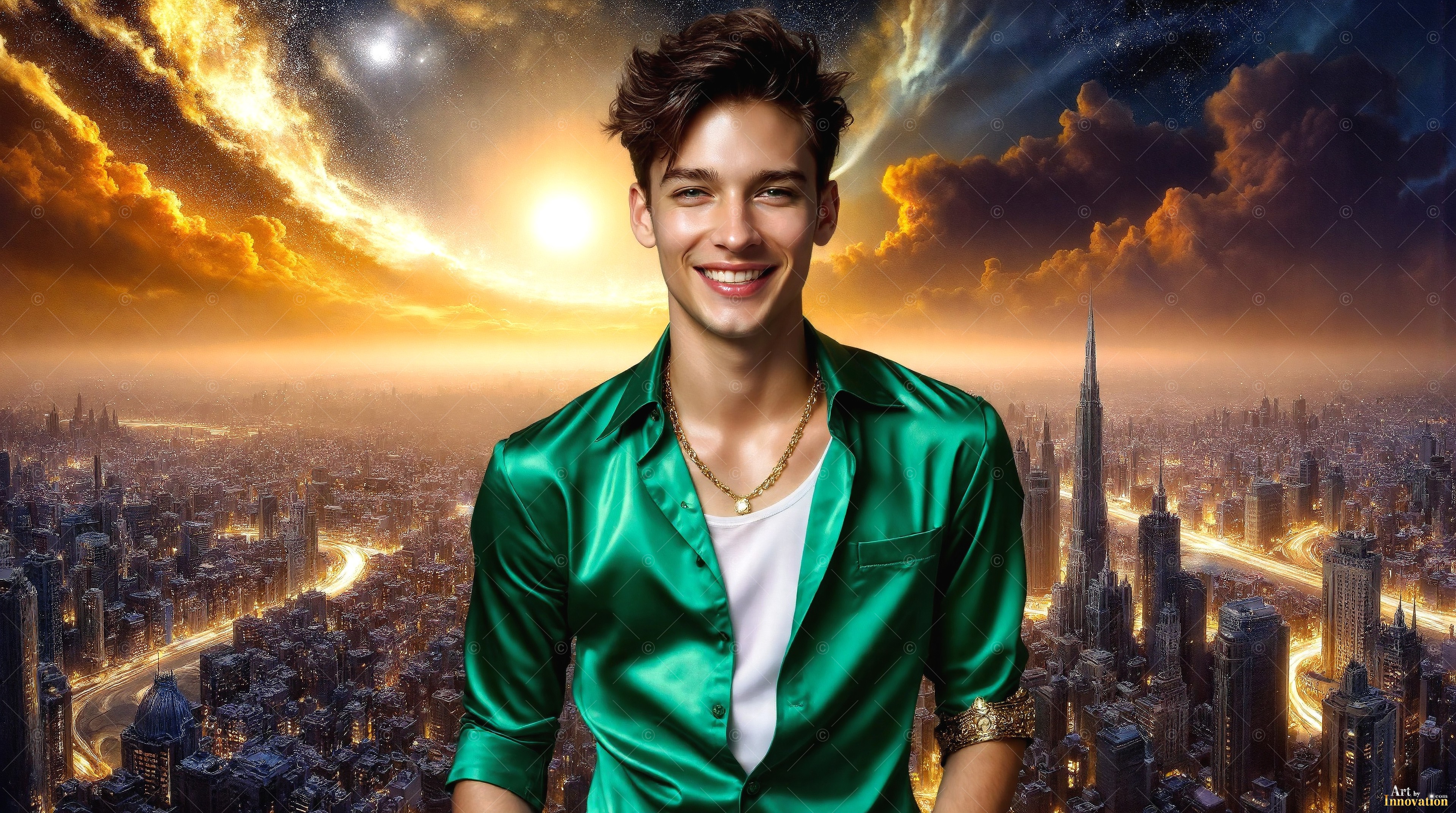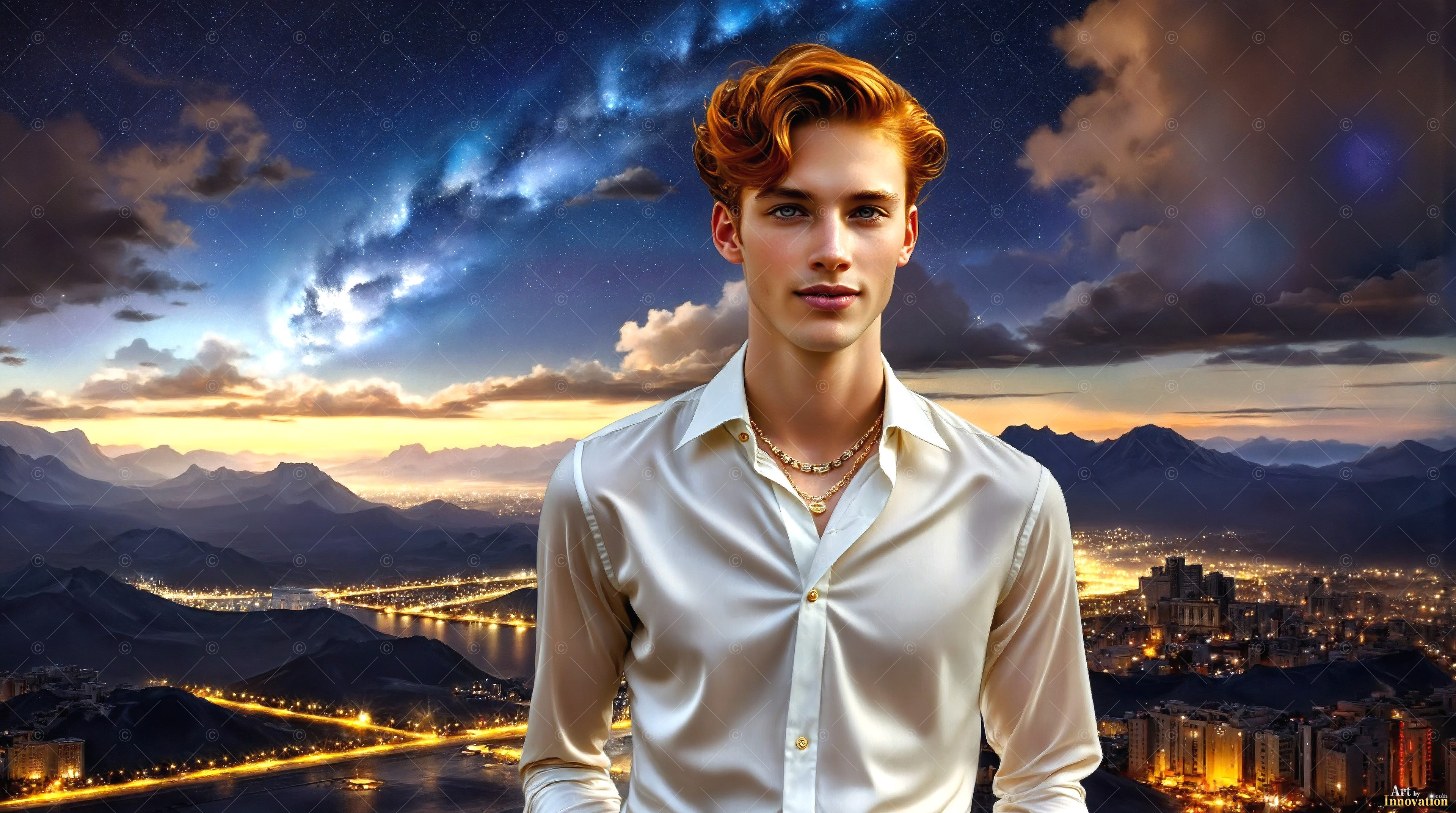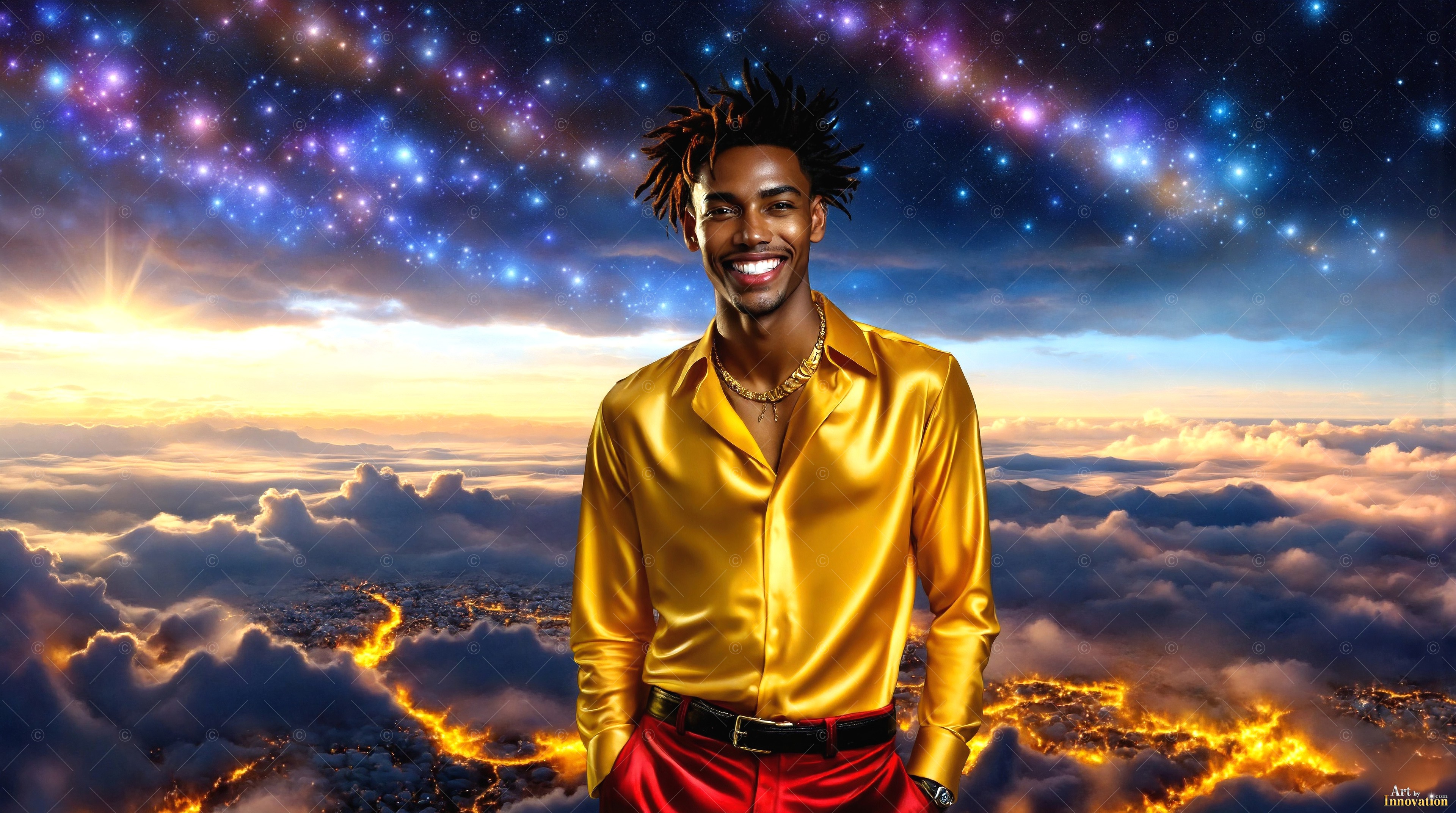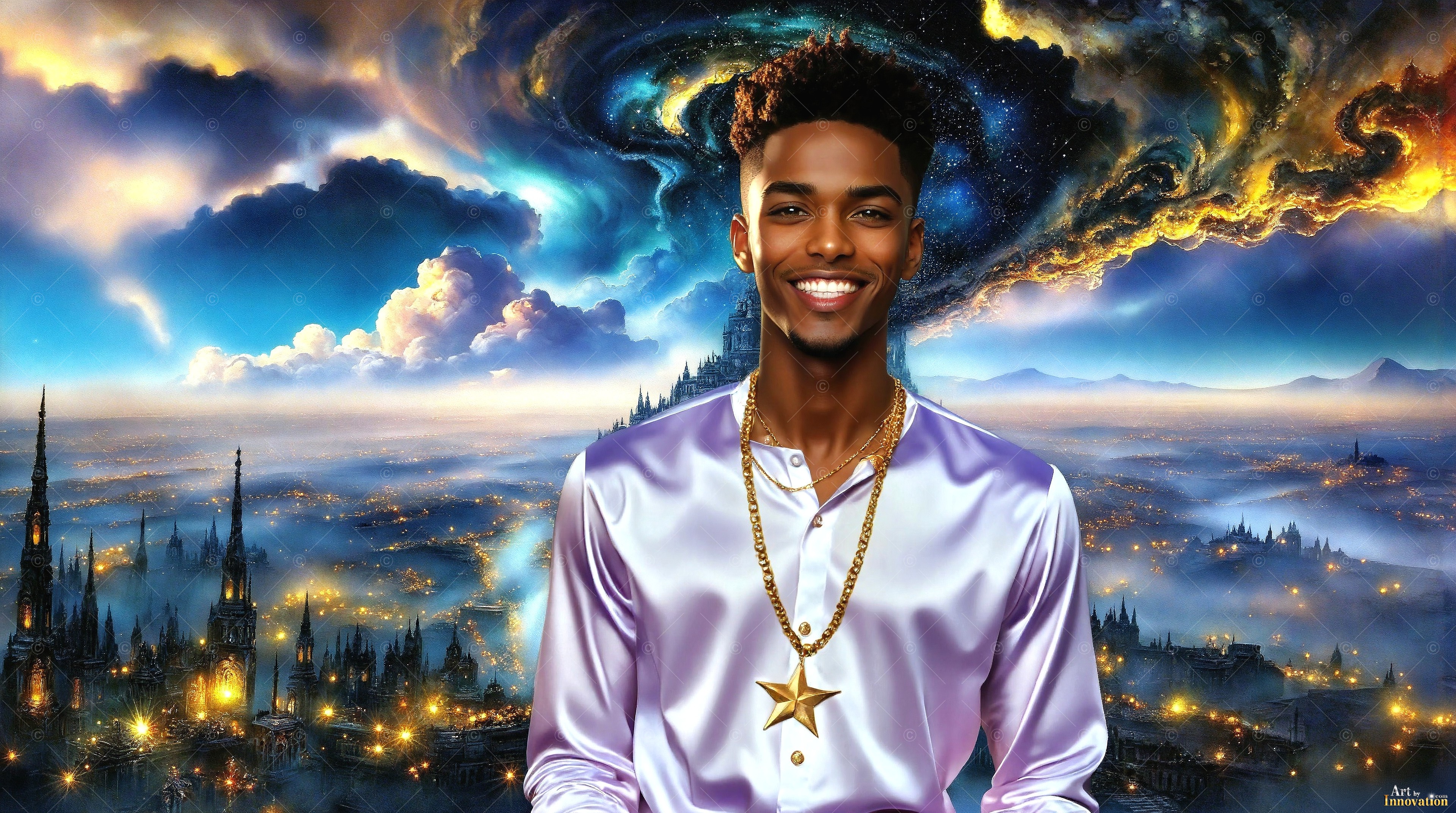 ByJDThe Beautiful Young Men of the Golden City, is a collection of AI generated images of sexy, glamorous, handsome guys in the heavens. In this fantasy photograph of a young men in their 20’s, on a balcony, overlooking a large golden city in the heavens. Generated to be as realistic as possible, in this this fantasy setting, with todays technology. Wearing jeans, an unbuttoned, vibrant, long-sleeve, button down shirt. The subject is enjoying a beautiful day outdoors. The mystical, galactic landscape, and the vibrant cosmic canopies, every detail, from the texture of the clouds, to the magnificent, majestic gothic architecture of the golden city, is crafted to create an atmosphere of reverence and divine glory. With a breathtaking scene of Salar de Uyuni at sunset, offering warm golden hour lighting. The heavenly landscape evokes a sense of freedom and tranquility, that is expresses through his facial features and smile, as day turns to night. The heavenly landscape evokes a sense of mysterious black space and light, with a vast galaxy that almost covers the image, the stars and constellations sparkle bright, in dark blue sky. On occasion the earth can be seen floating in the sky.