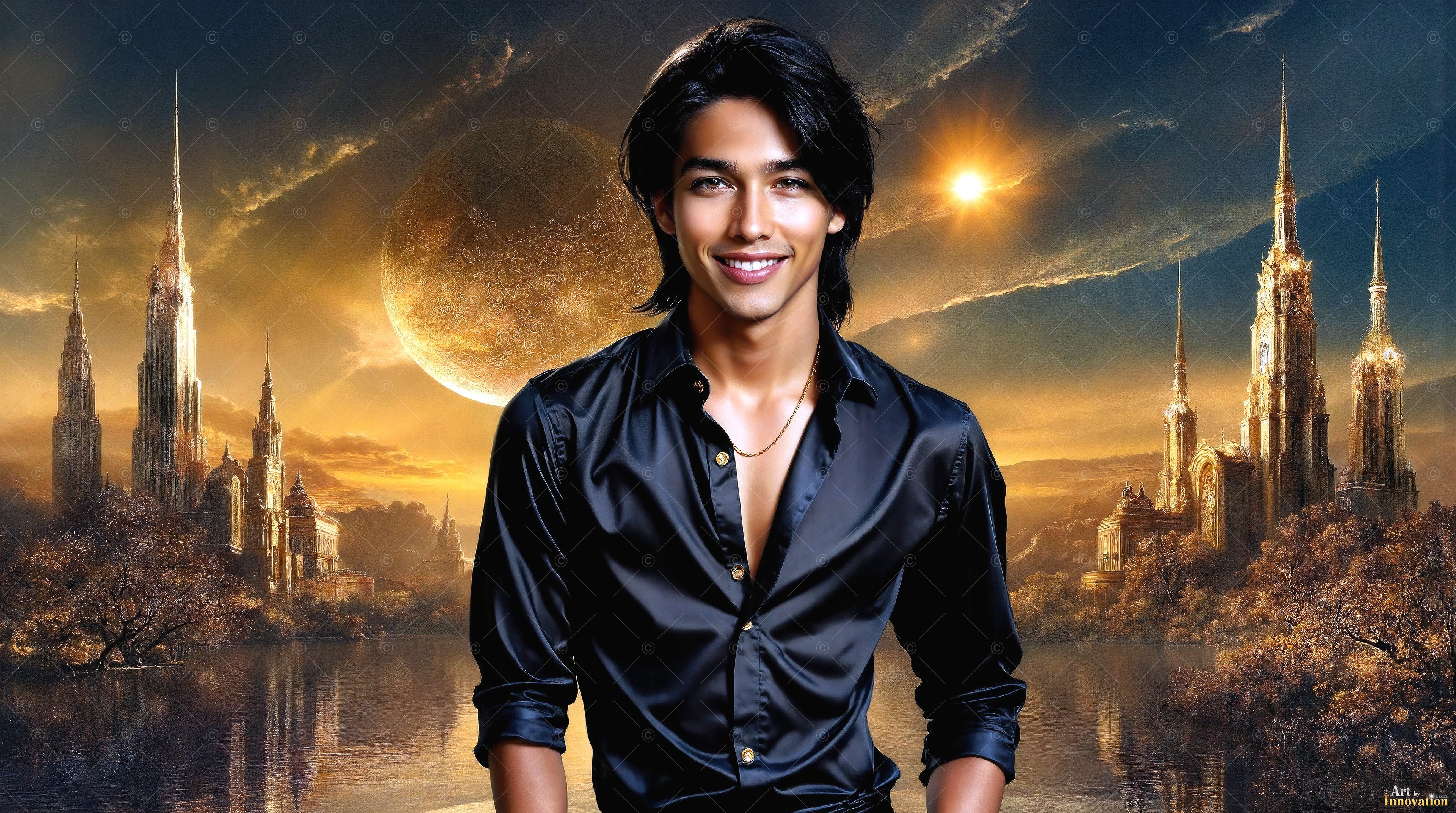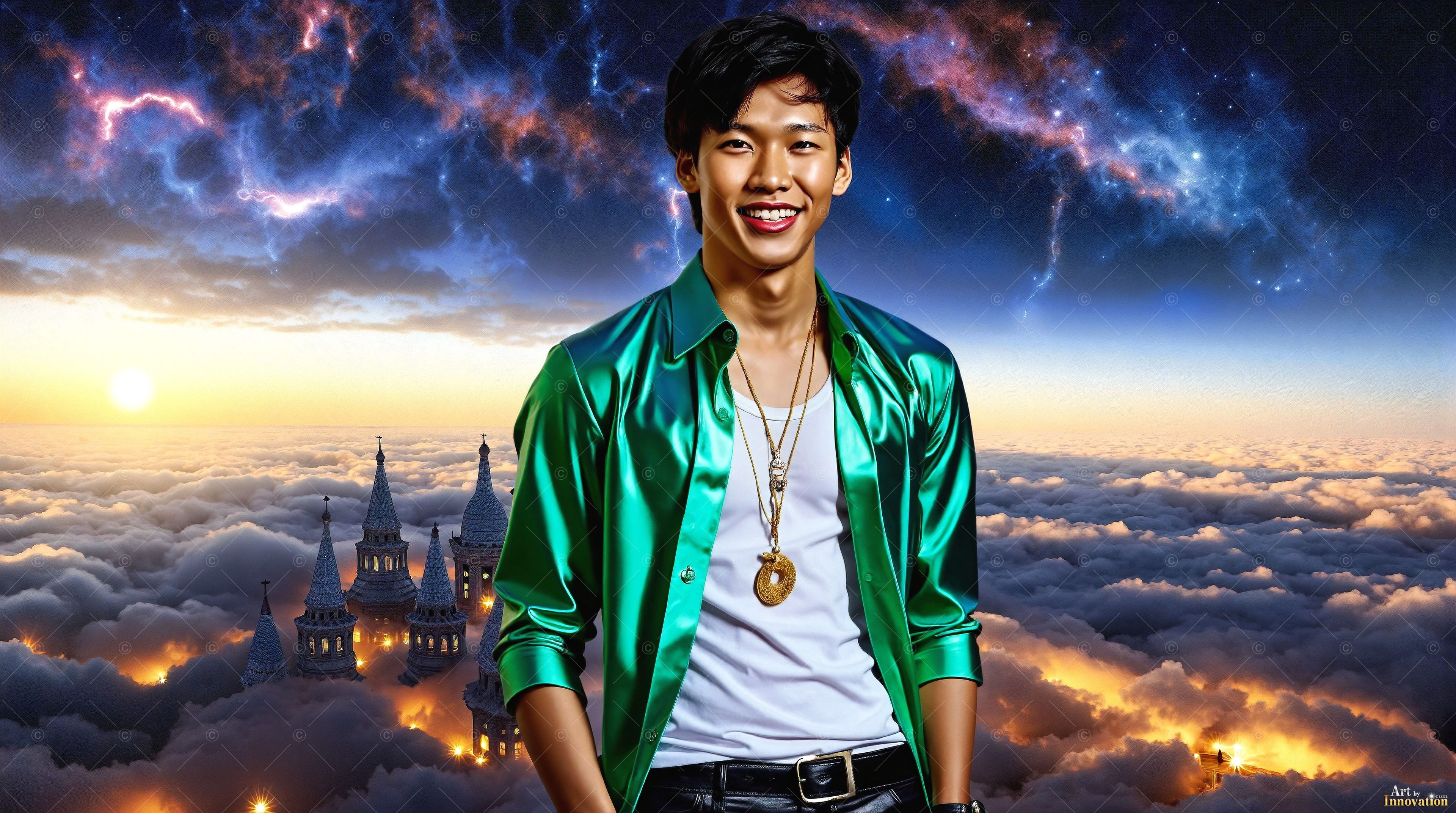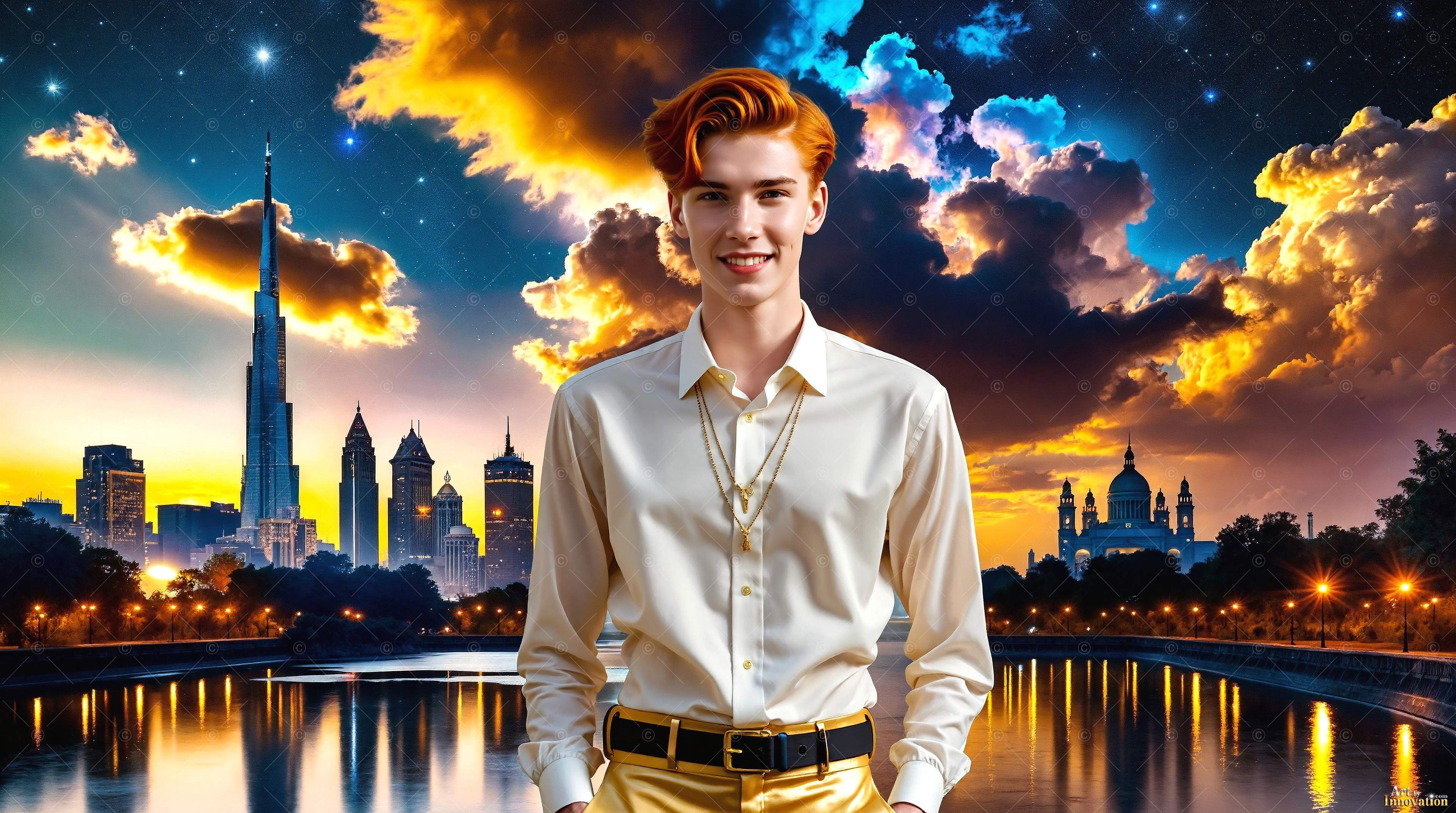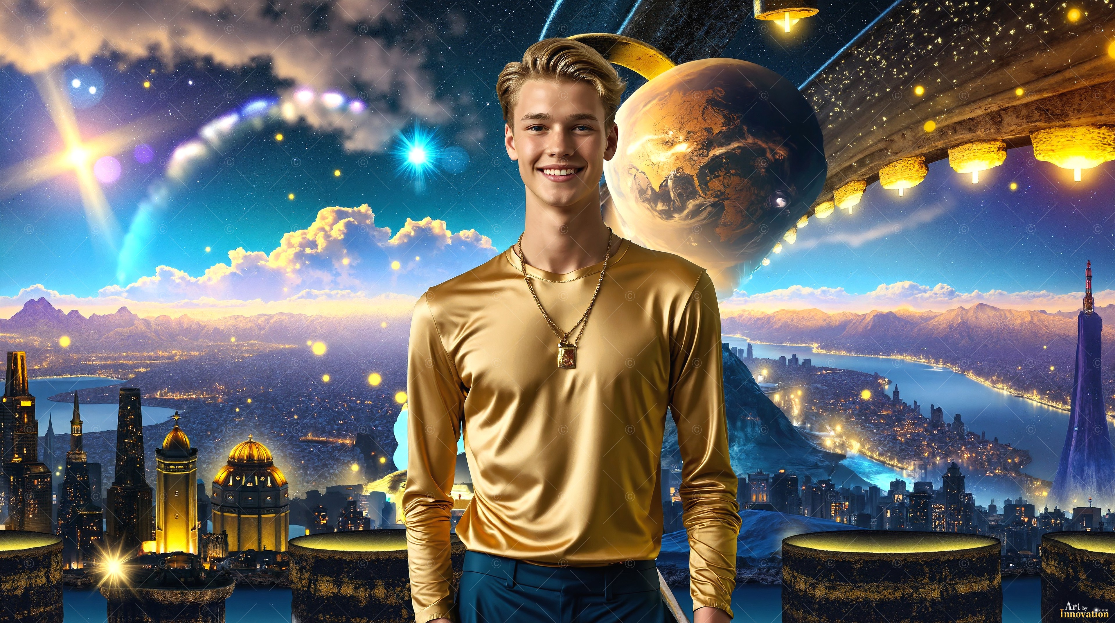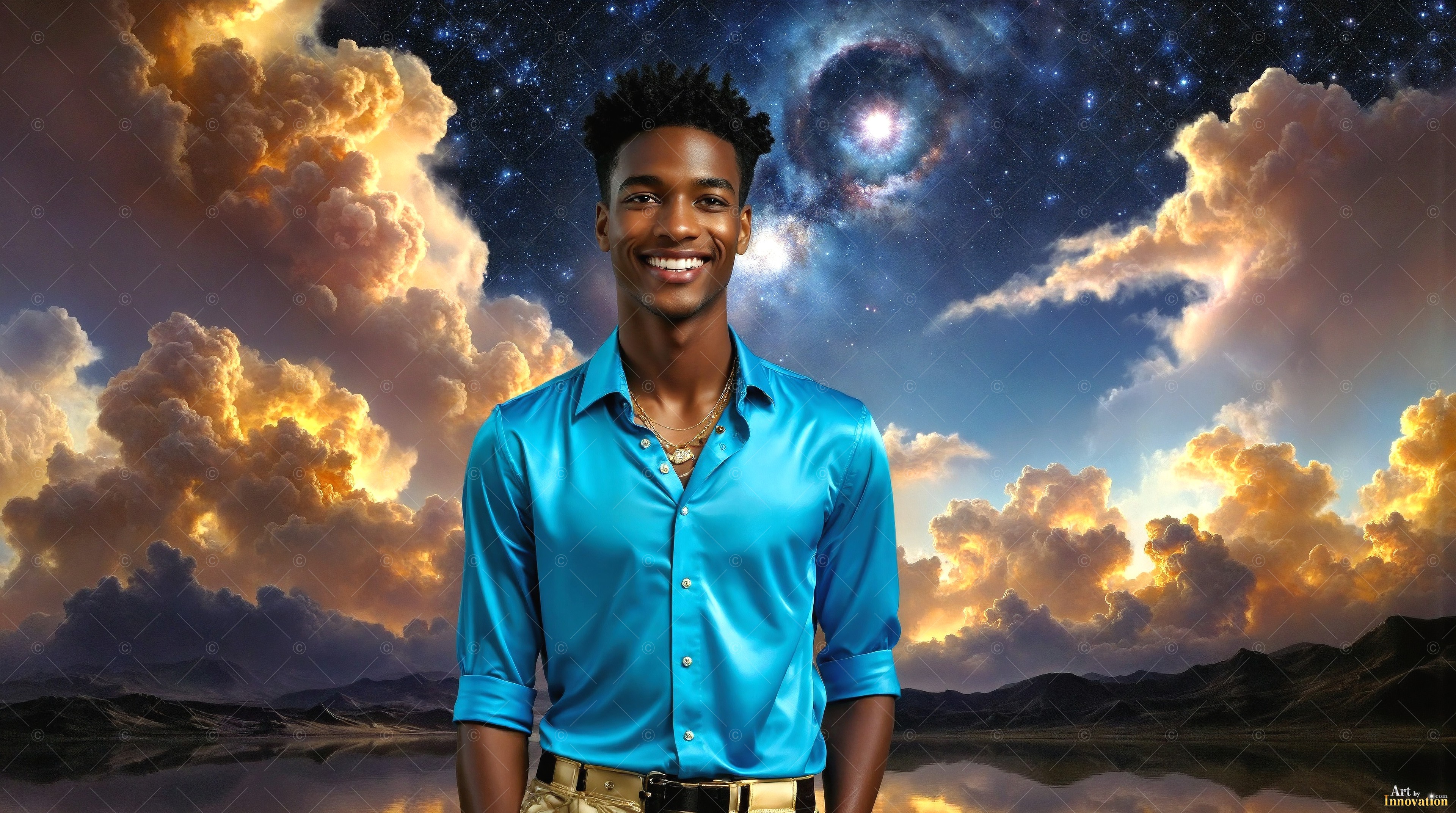 ByJDThe Beautiful Young Men of the Golden City, is a collection of AI generated images of sexy, glamorous, handsome guys in the heavens. In this fantasy photograph of a young men in their 20’s, on a balcony, overlooking a large golden city in the heavens. Generated to be as realistic as possible, in this this fantasy setting, with todays technology. Wearing jeans, an unbuttoned, vibrant, long-sleeve, button down shirt. The subject is enjoying a beautiful day outdoors. The mystical, galactic landscape, and the vibrant cosmic canopies, every detail, from the texture of the clouds, to the magnificent, majestic gothic architecture of the golden city, is crafted to create an atmosphere of reverence and divine glory. With a breathtaking scene of Salar de Uyuni at sunset, offering warm golden hour lighting. The heavenly landscape evokes a sense of freedom and tranquility, that is expresses through his facial features and smile, as day turns to night. The heavenly landscape evokes a sense of mysterious black space and light, with a vast galaxy that almost covers the image, the stars and constellations sparkle bright, in dark blue sky. On occasion the earth can be seen floating in the sky.