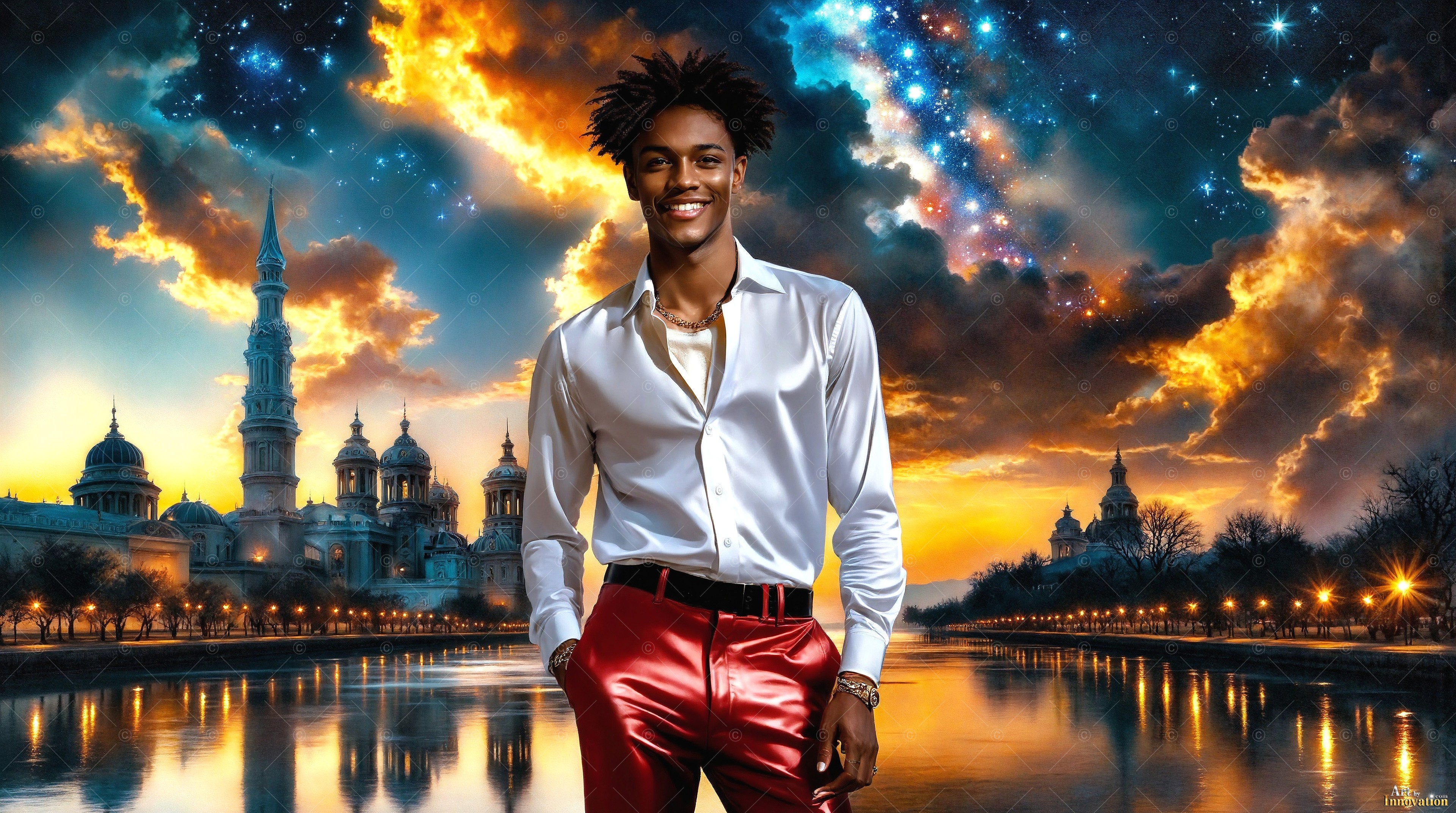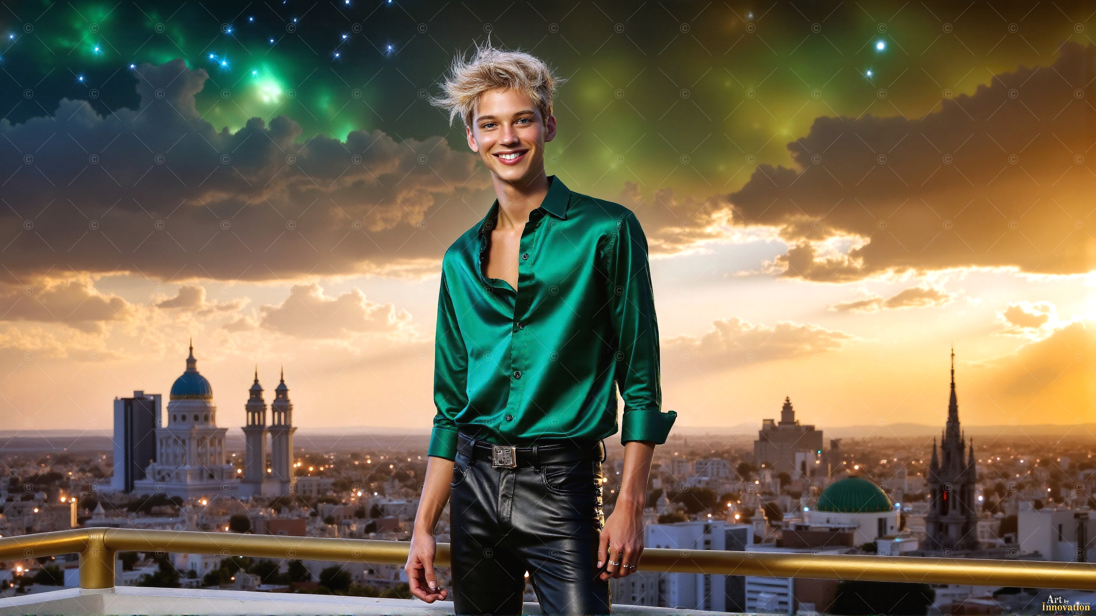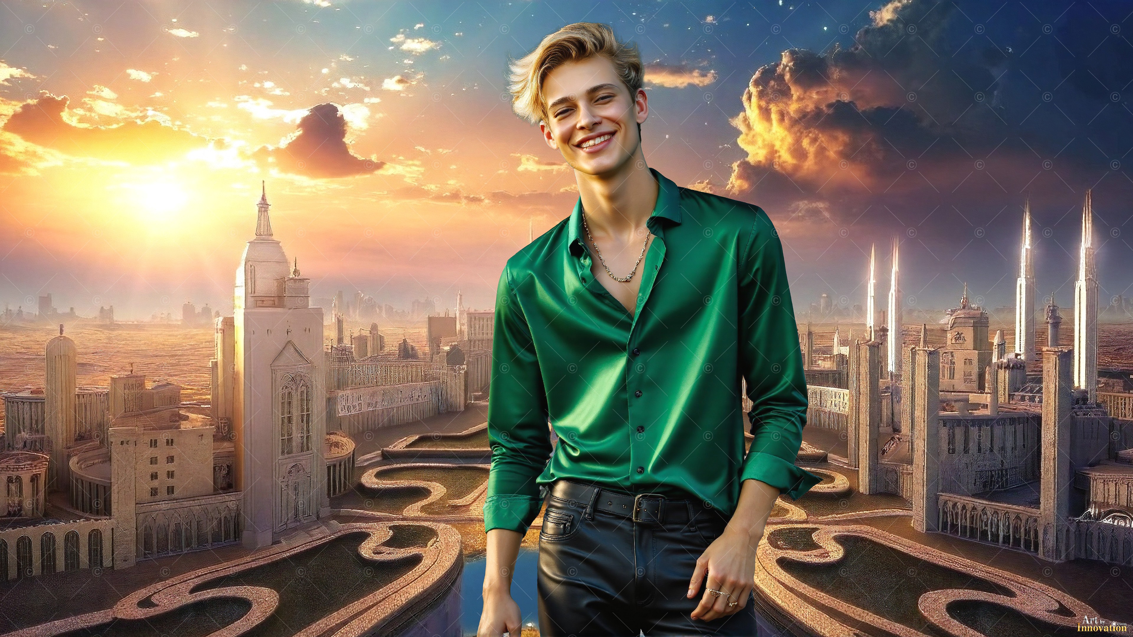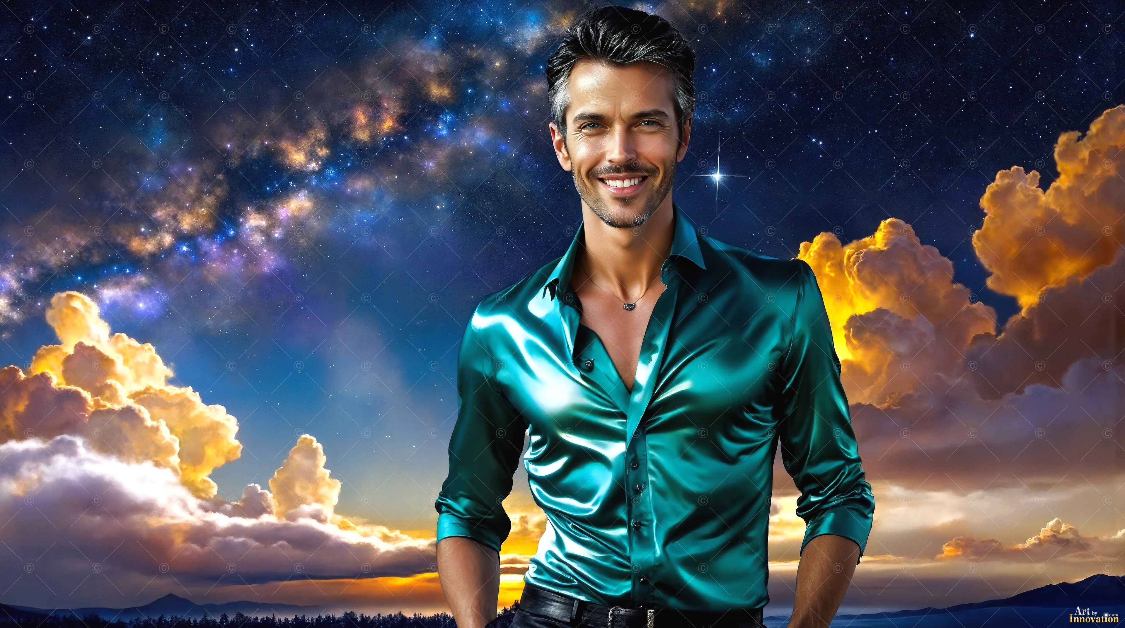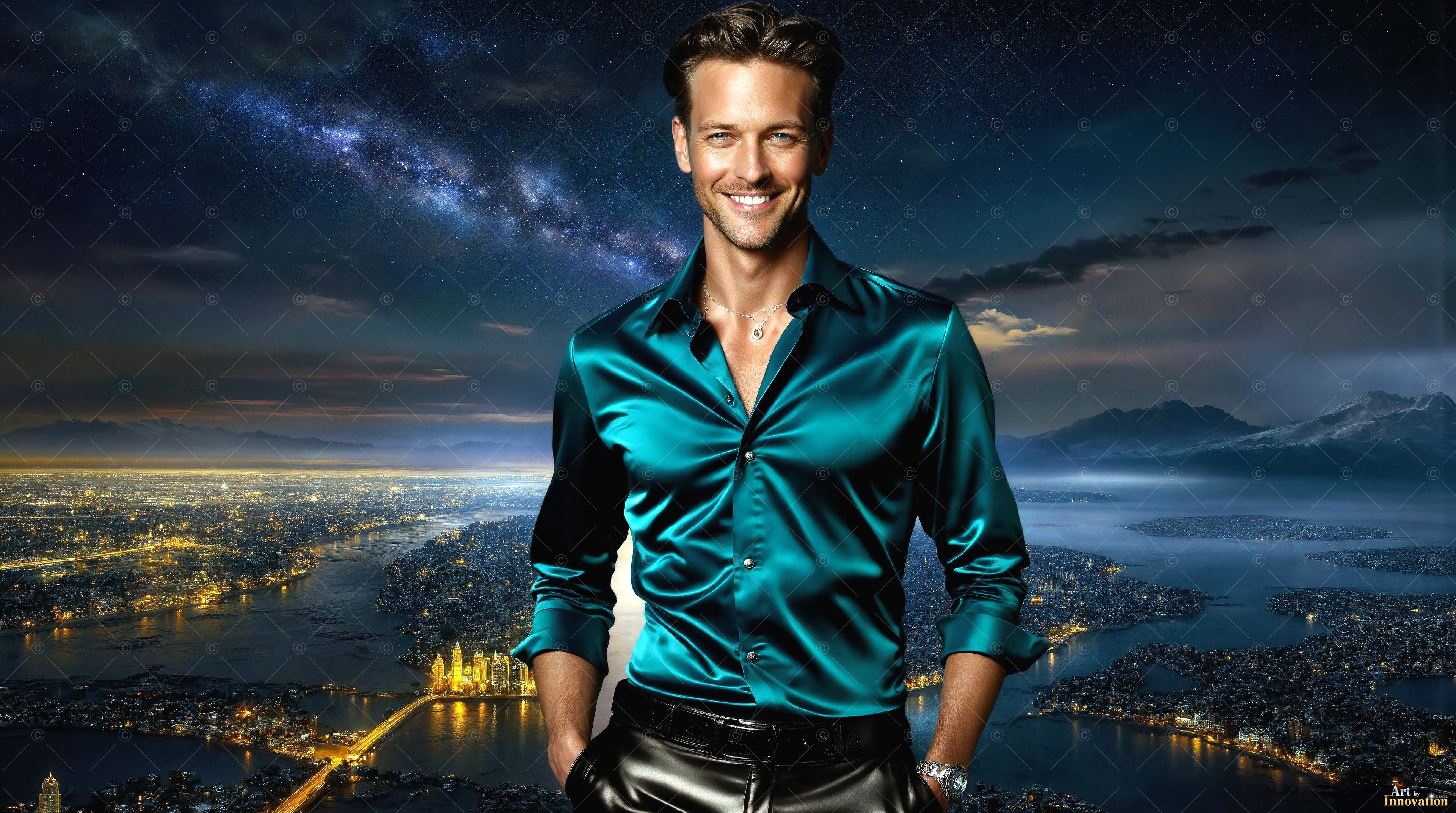 ByJDThe Beautiful Young Men of the Golden City, is a collection of AI generated images of sexy, glamorous, handsome guys in the heavens. In this fantasy photograph of a young men in their 20’s, on a balcony, overlooking a large golden city in the heavens. Generated to be as realistic as possible, in this this fantasy setting, with todays technology. Wearing jeans, an unbuttoned, vibrant, long-sleeve, button down shirt. The subject is enjoying a beautiful day outdoors. The mystical, galactic landscape, and the vibrant cosmic canopies, every detail, from the texture of the clouds, to the magnificent, majestic gothic architecture of the golden city, is crafted to create an atmosphere of reverence and divine glory. With a breathtaking scene of Salar de Uyuni at sunset, offering warm golden hour lighting. The heavenly landscape evokes a sense of freedom and tranquility, that is expresses through his facial features and smile, as day turns to night. The heavenly landscape evokes a sense of mysterious black space and light, with a vast galaxy that almost covers the image, the stars and constellations sparkle bright, in dark blue sky. On occasion the earth can be seen floating in the sky.