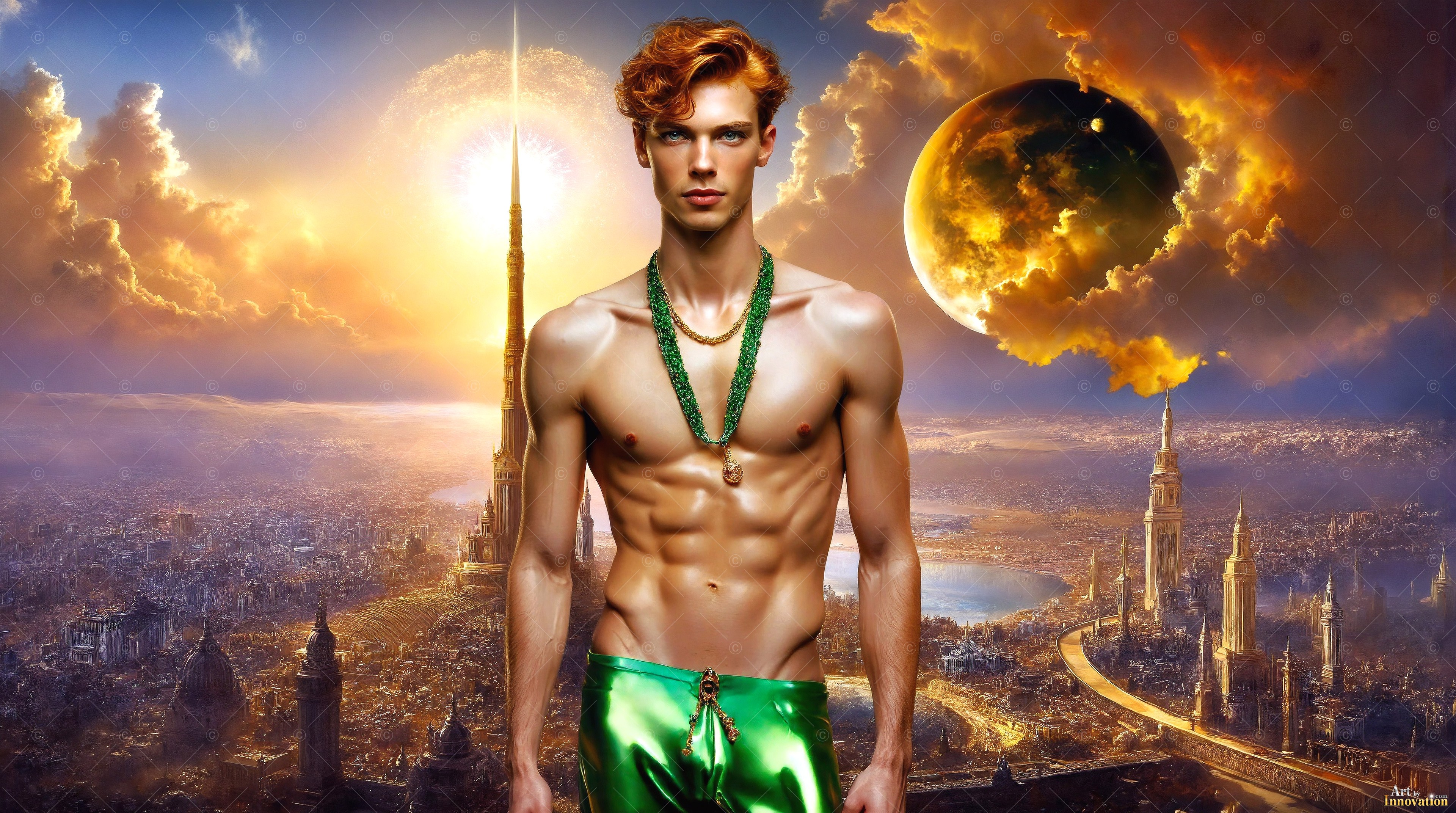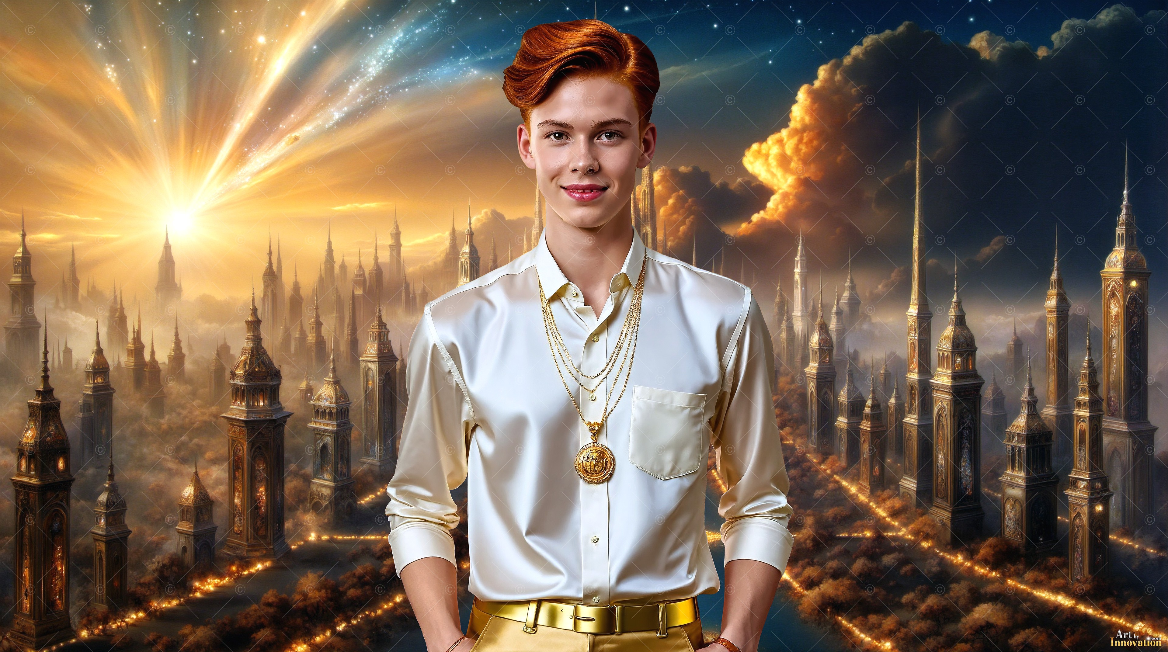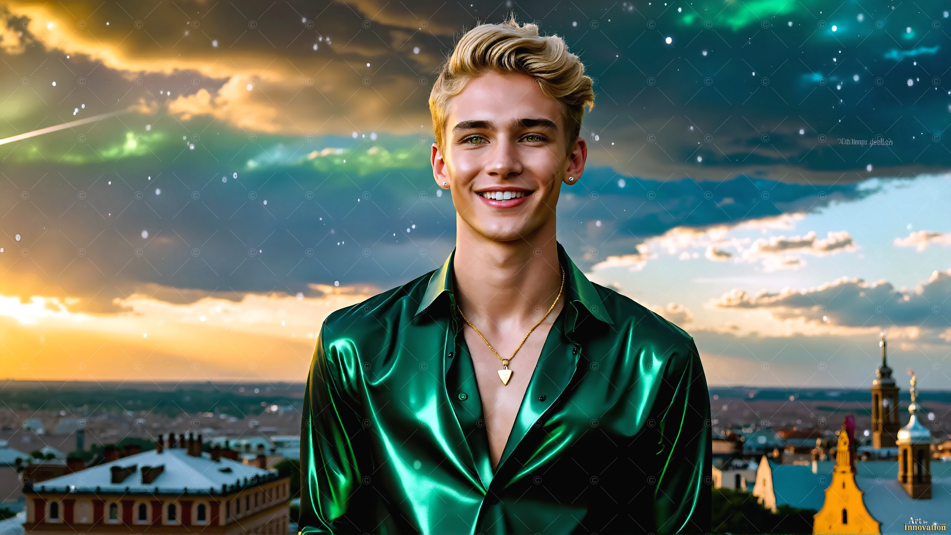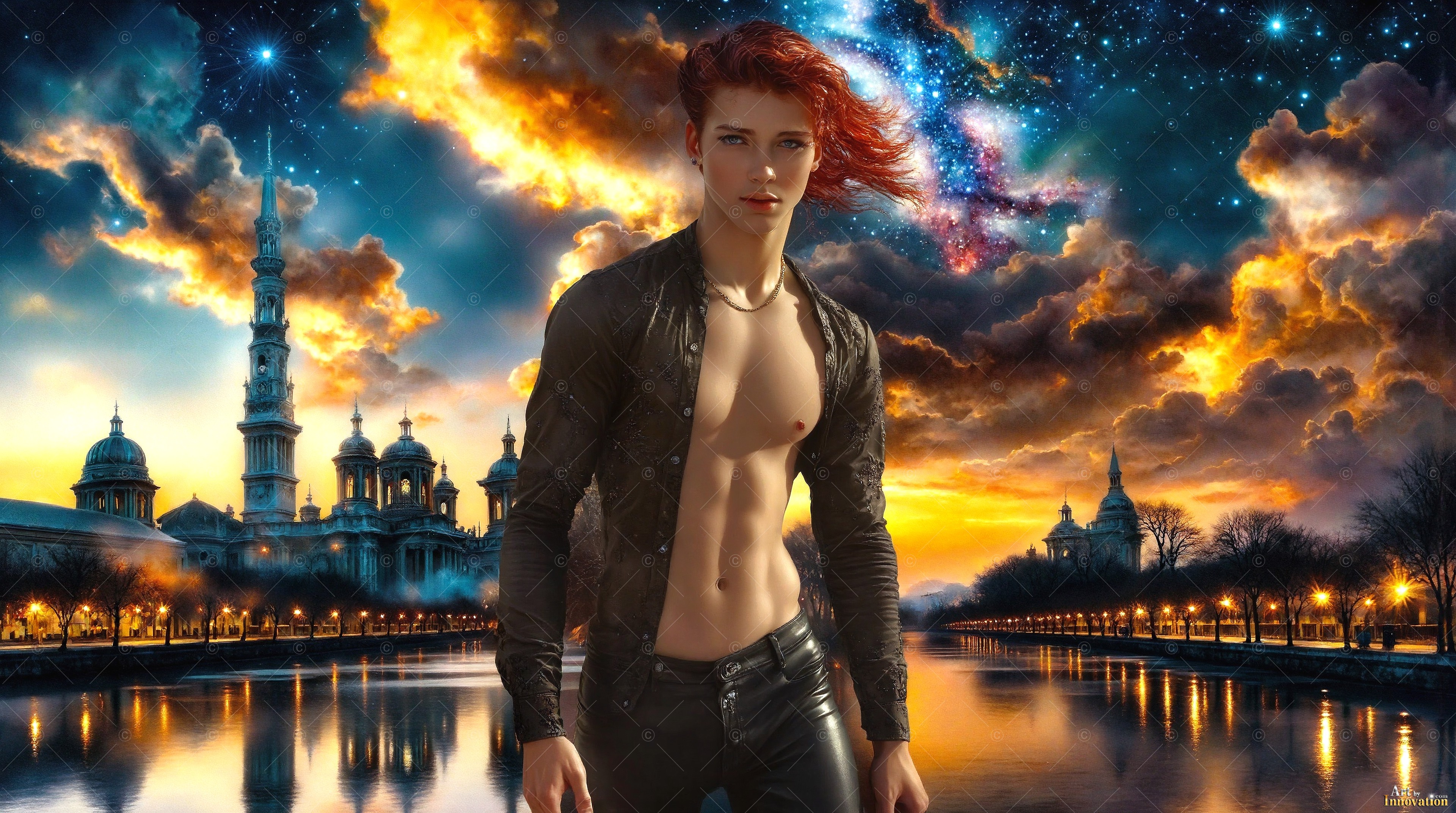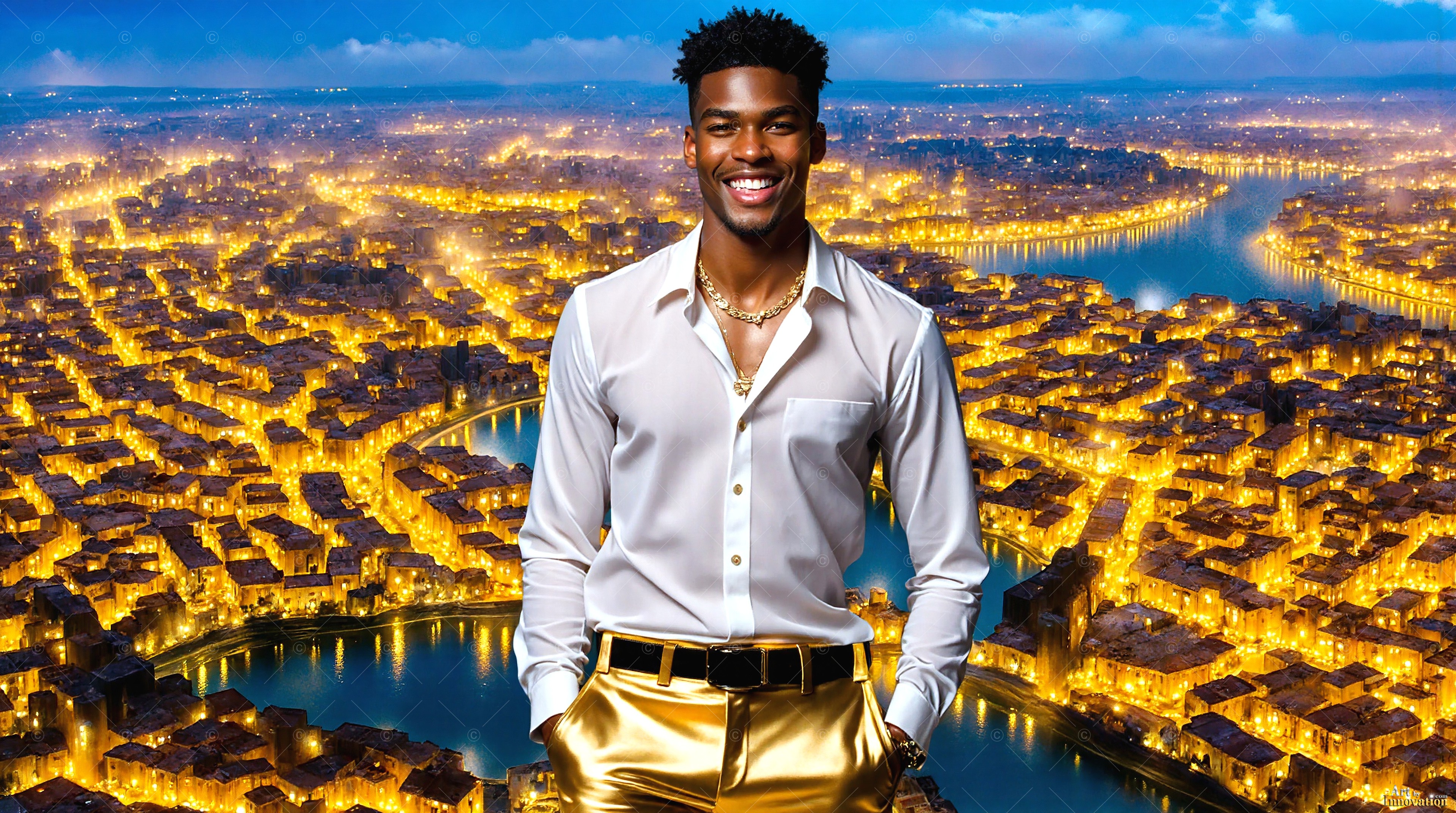 ByJDThe Beautiful Young Men of the Golden City, is a collection of AI generated images of sexy, glamorous, handsome guys in the heavens. In this fantasy photograph of a young men in their 20’s, on a balcony, overlooking a large golden city in the heavens. Generated to be as realistic as possible, in this this fantasy setting, with todays technology. Wearing jeans, an unbuttoned, vibrant, long-sleeve, button down shirt. The subject is enjoying a beautiful day outdoors. The mystical, galactic landscape, and the vibrant cosmic canopies, every detail, from the texture of the clouds, to the magnificent, majestic gothic architecture of the golden city, is crafted to create an atmosphere of reverence and divine glory. With a breathtaking scene of Salar de Uyuni at sunset, offering warm golden hour lighting. The heavenly landscape evokes a sense of freedom and tranquility, that is expresses through his facial features and smile, as day turns to night. The heavenly landscape evokes a sense of mysterious black space and light, with a vast galaxy that almost covers the image, the stars and constellations sparkle bright, in dark blue sky. On occasion the earth can be seen floating in the sky.