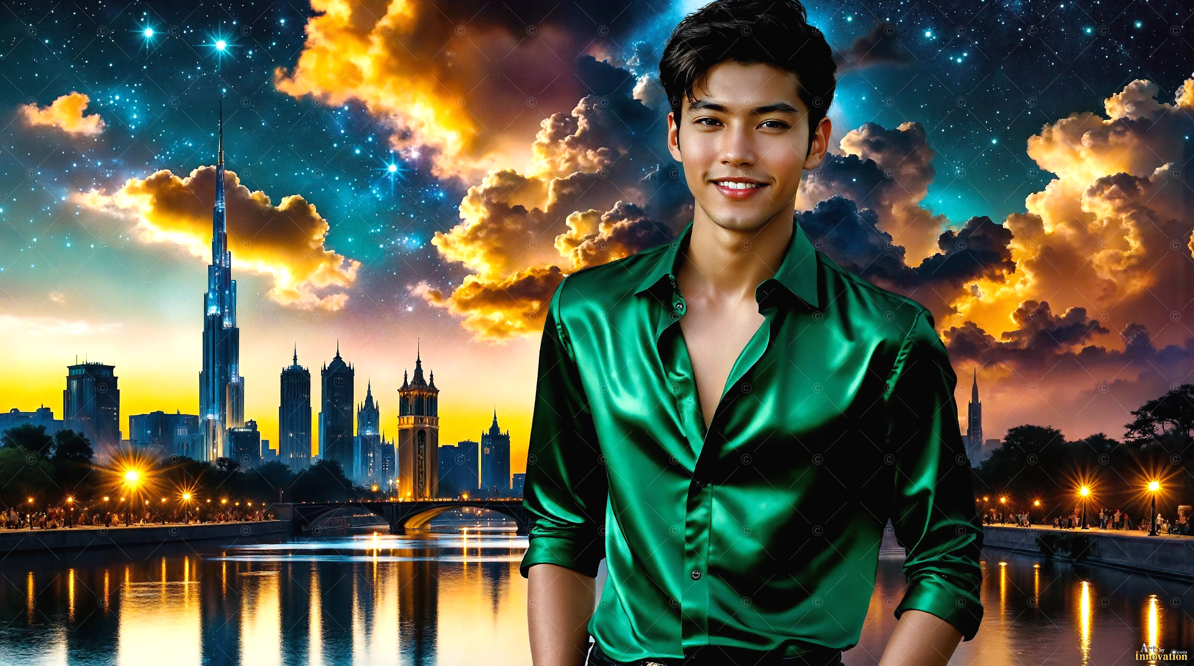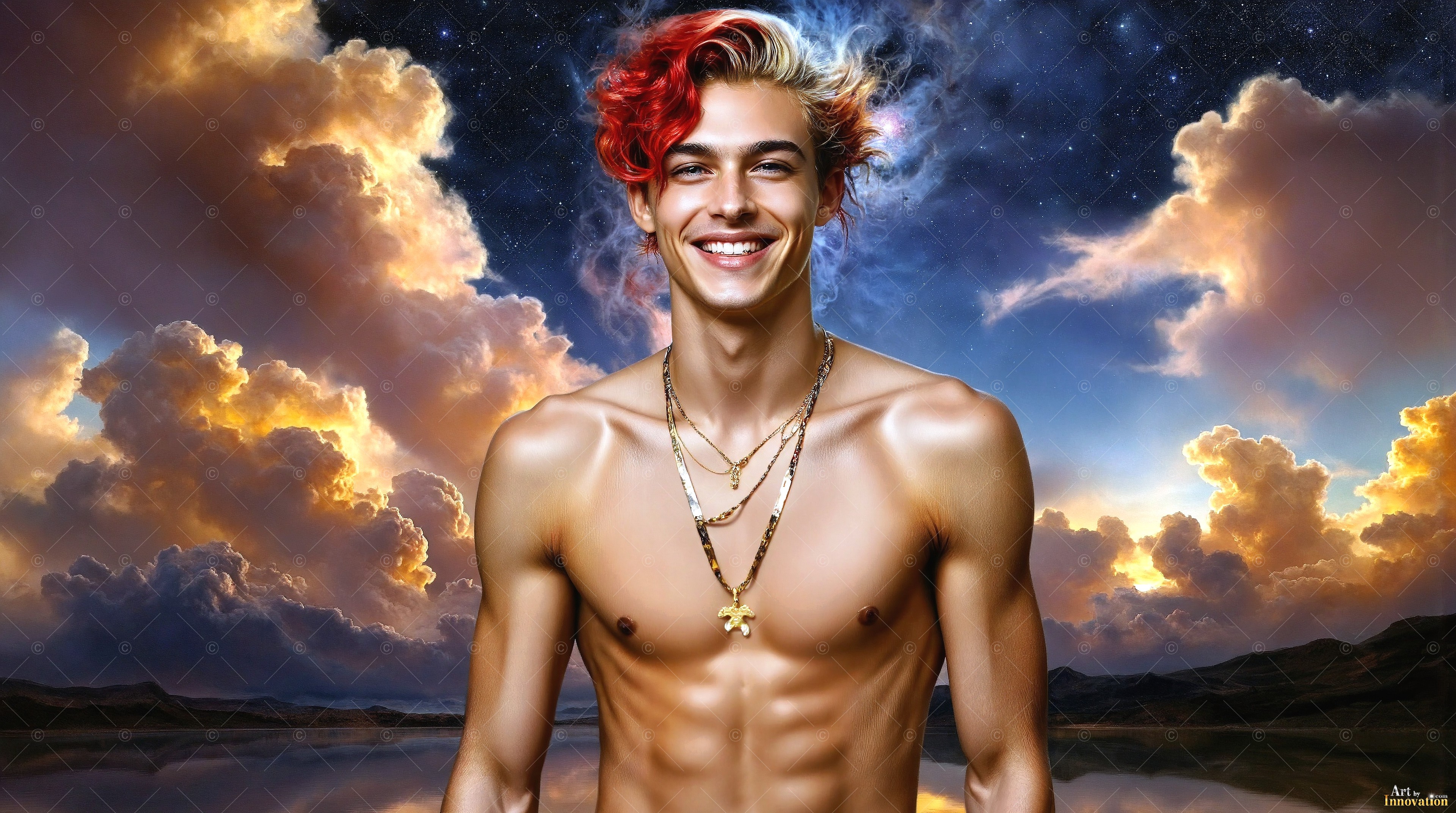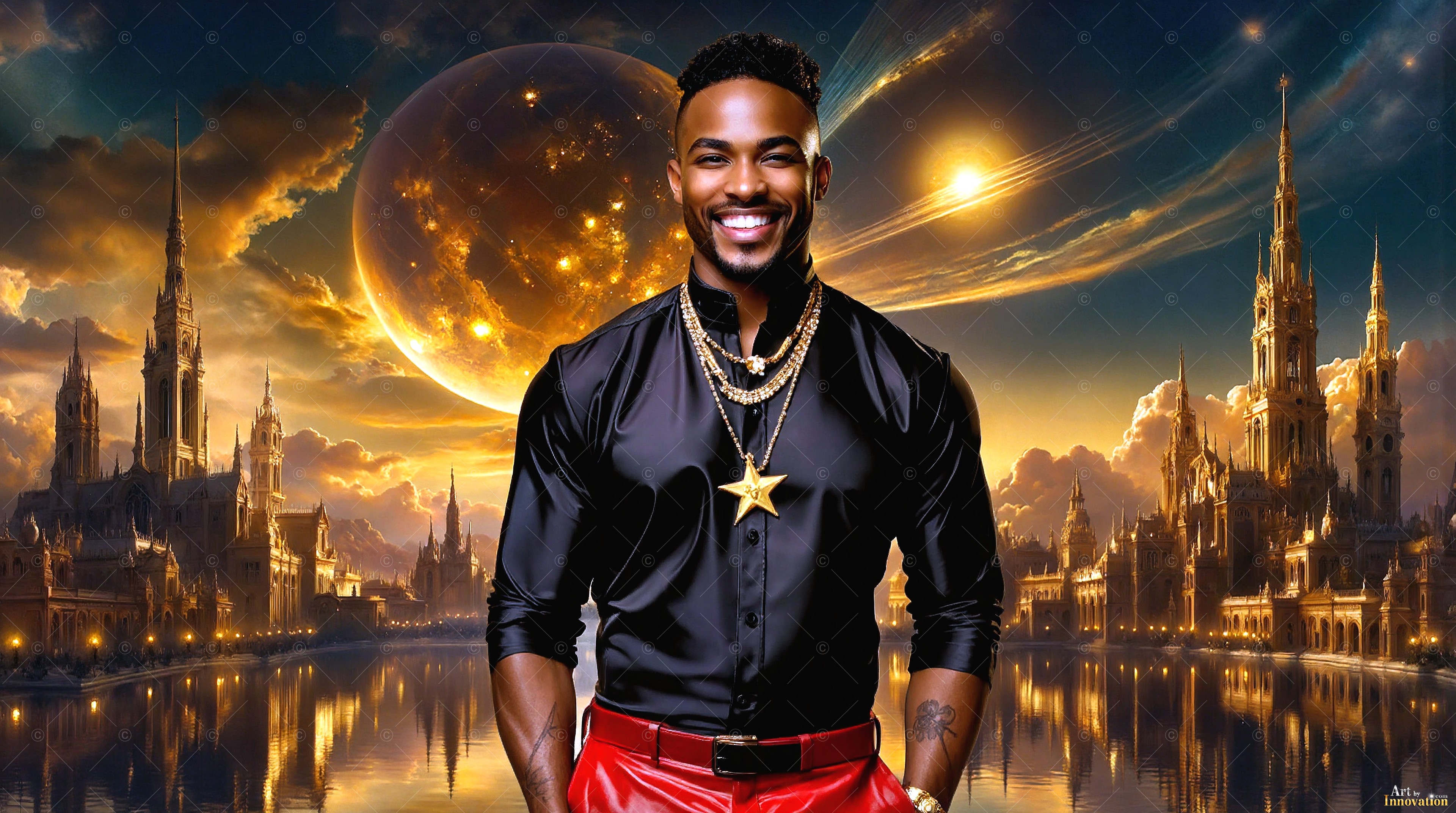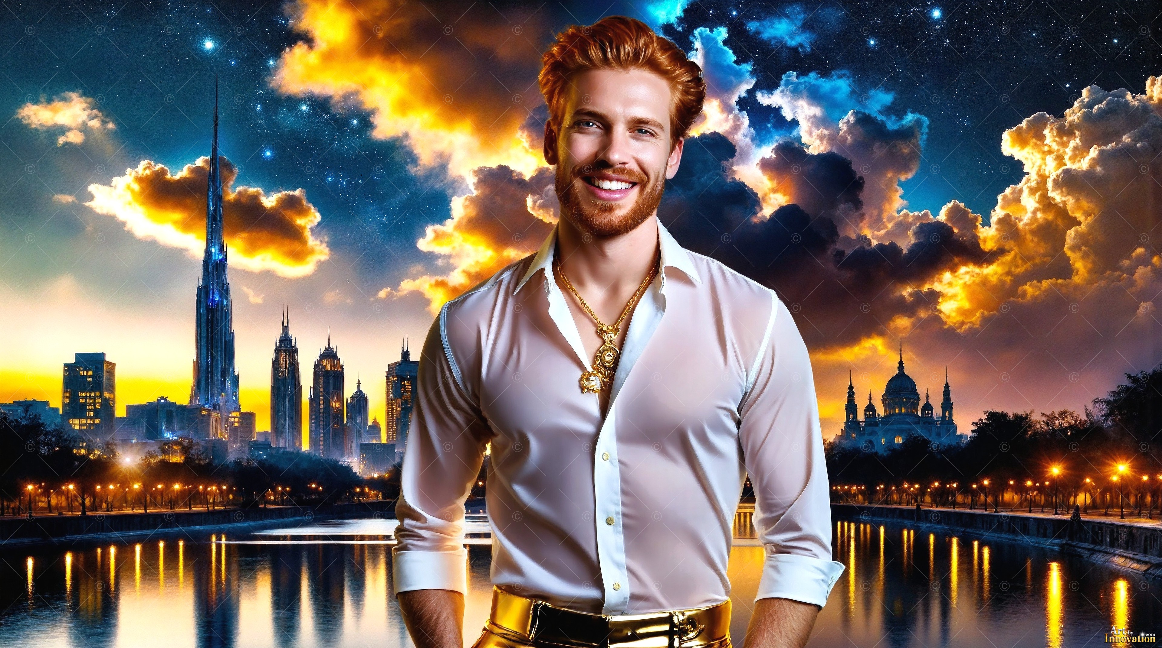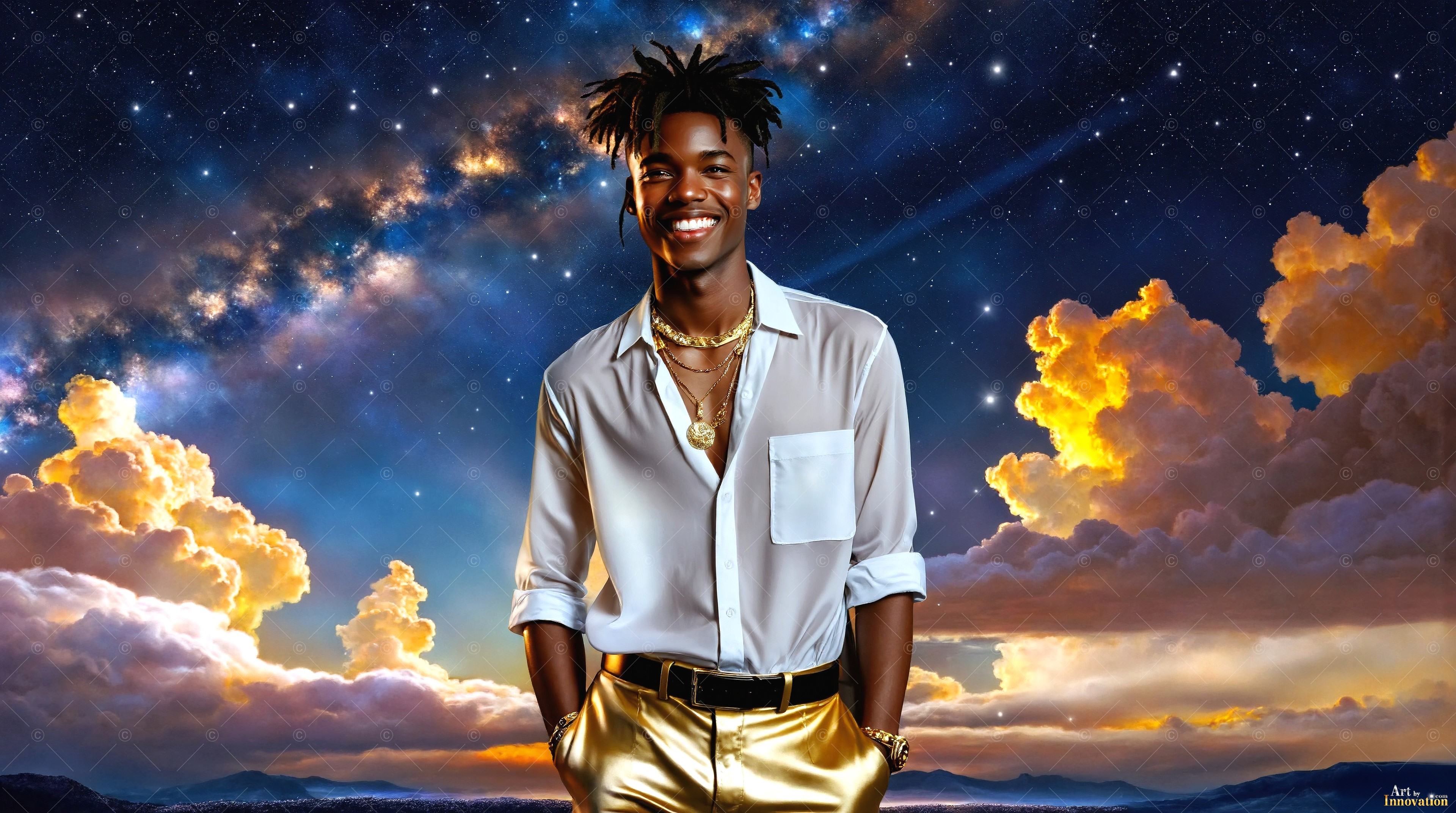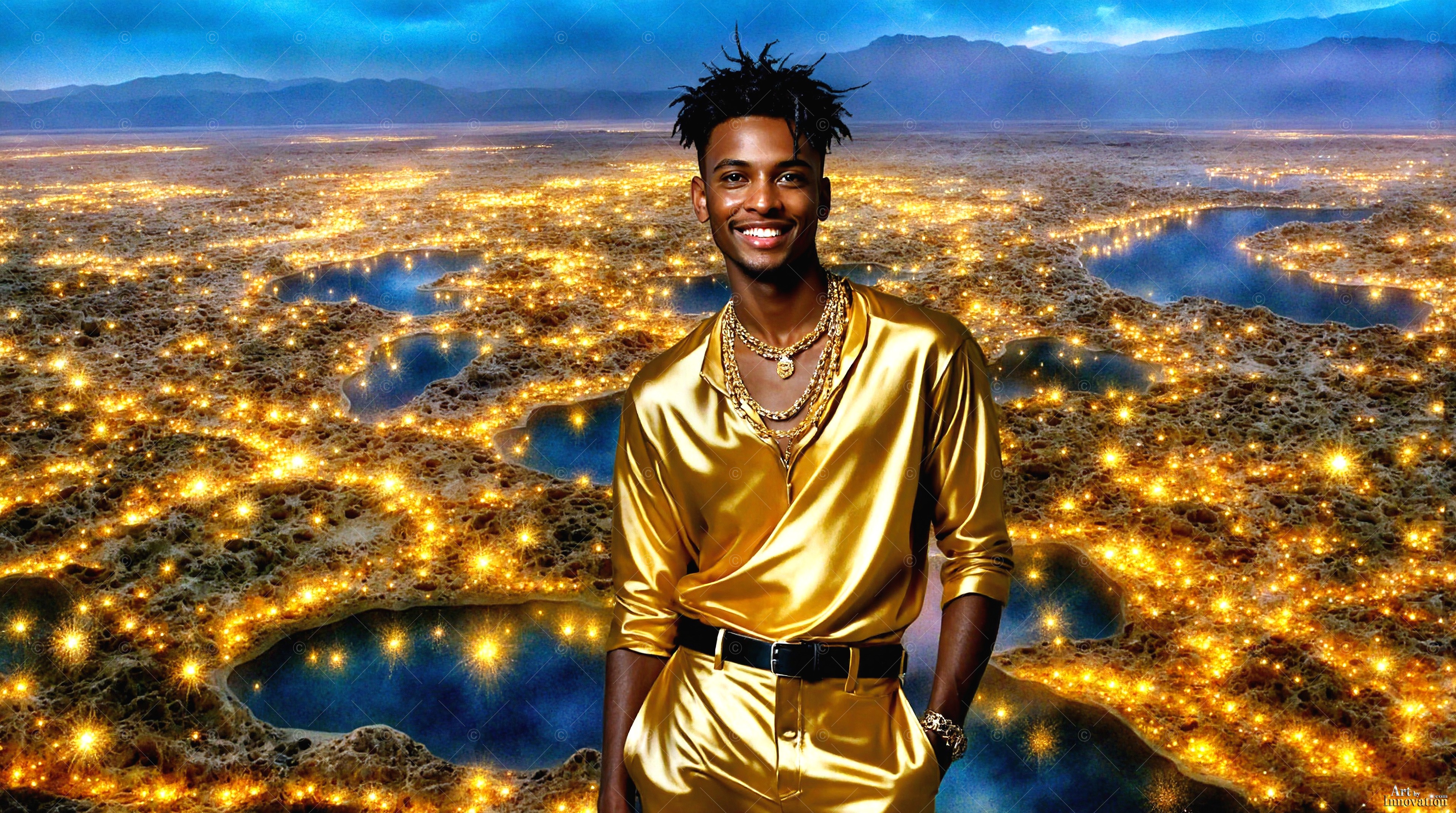 ByJDThe Beautiful Young Men of the Golden City, is a collection of AI generated images of sexy, glamorous, handsome guys in the heavens. In this fantasy photograph of a young men in their 20’s, on a balcony, overlooking a large golden city in the heavens. Generated to be as realistic as possible, in this this fantasy setting, with todays technology. Wearing jeans, an unbuttoned, vibrant, long-sleeve, button down shirt. The subject is enjoying a beautiful day outdoors. The mystical, galactic landscape, and the vibrant cosmic canopies, every detail, from the texture of the clouds, to the magnificent, majestic gothic architecture of the golden city, is crafted to create an atmosphere of reverence and divine glory. With a breathtaking scene of Salar de Uyuni at sunset, offering warm golden hour lighting. The heavenly landscape evokes a sense of freedom and tranquility, that is expresses through his facial features and smile, as day turns to night. The heavenly landscape evokes a sense of mysterious black space and light, with a vast galaxy that almost covers the image, the stars and constellations sparkle bright, in dark blue sky. On occasion the earth can be seen floating in the sky.