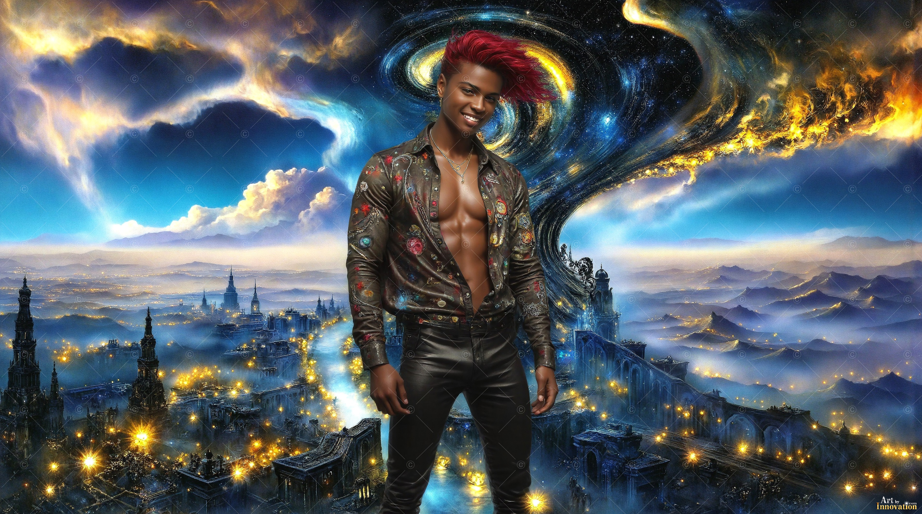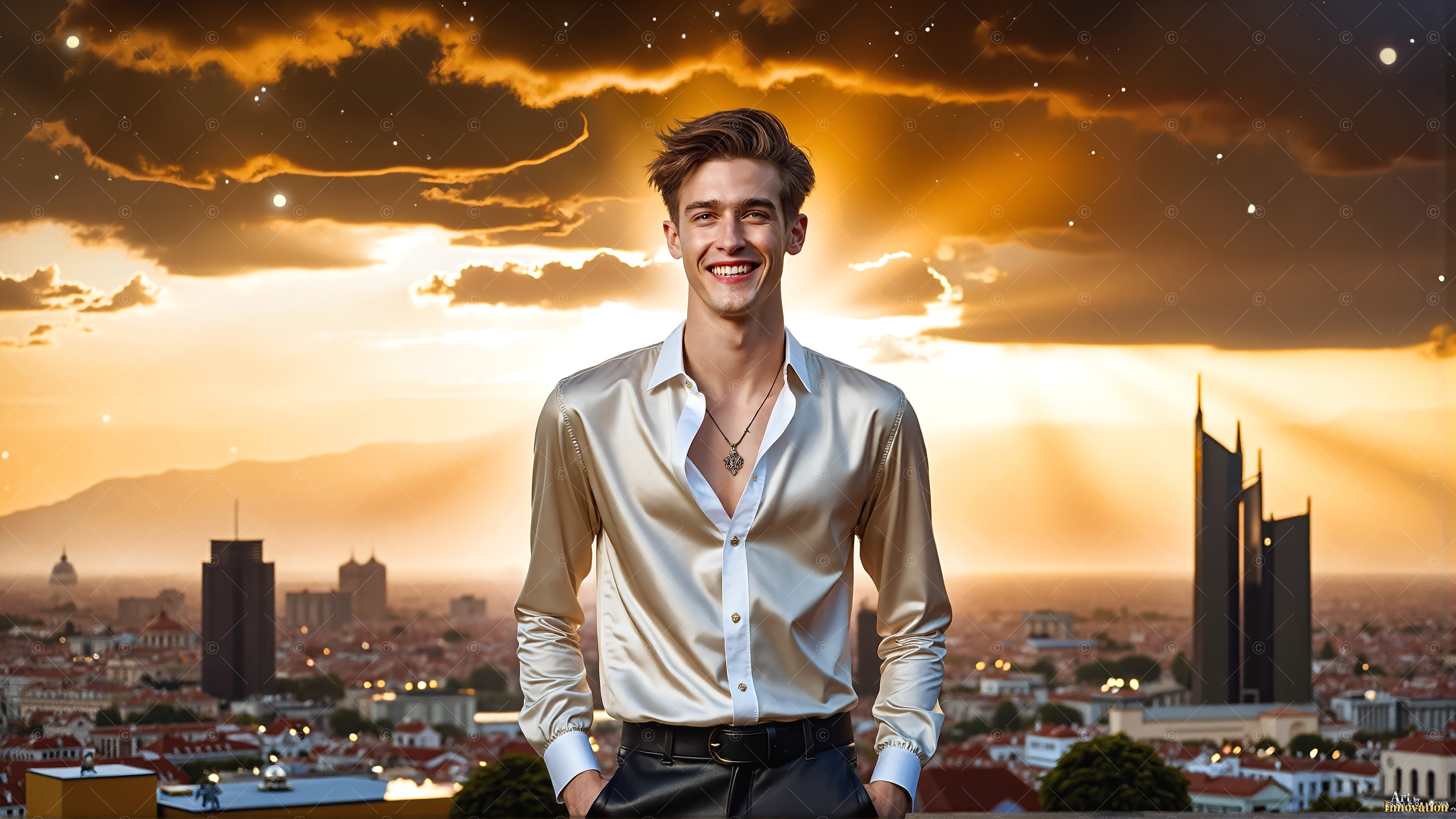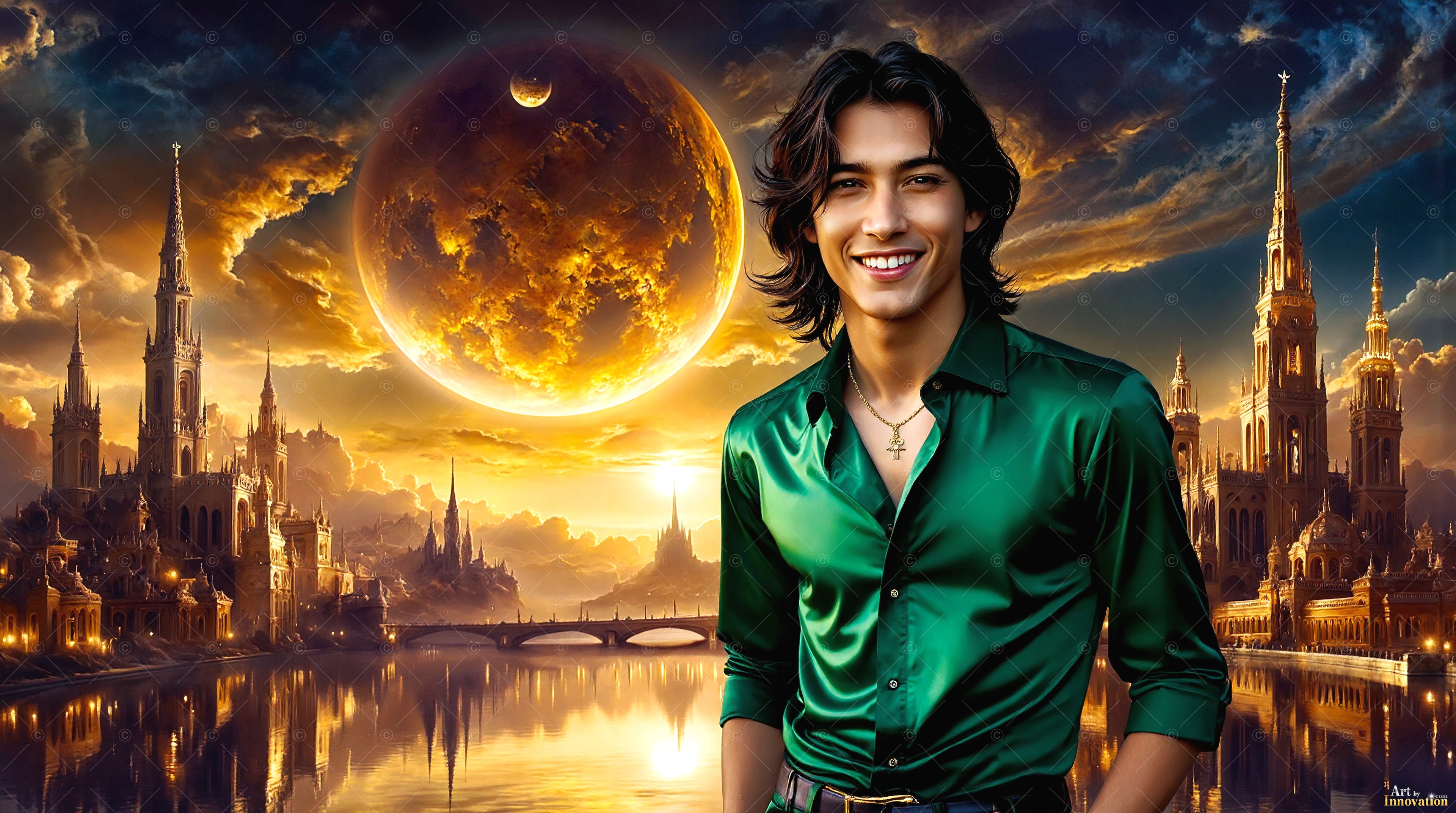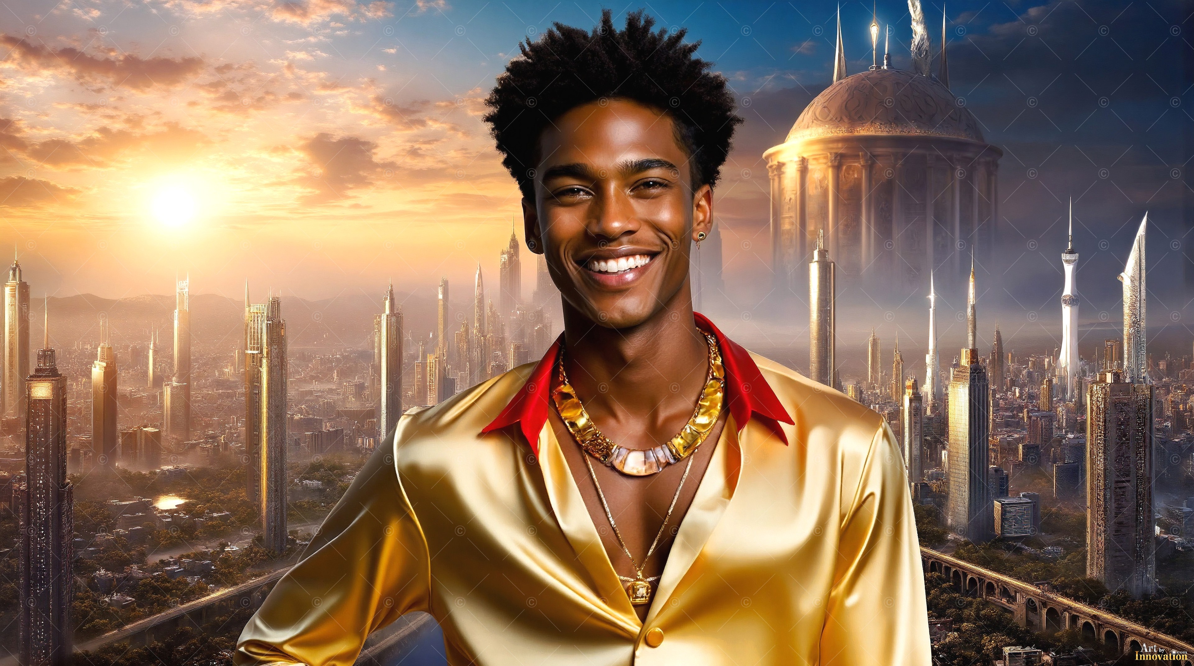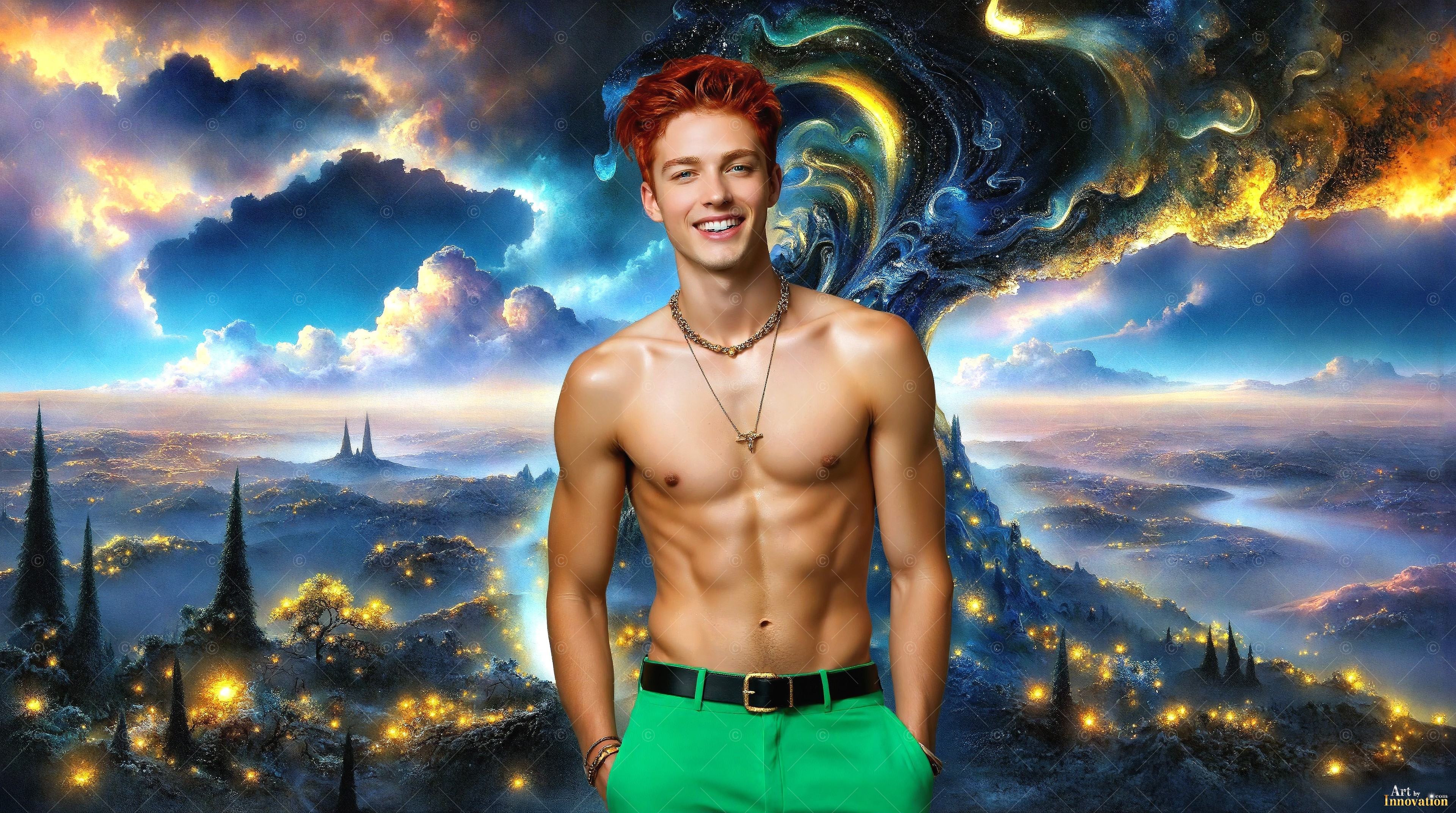 ByJDThe Beautiful Young Men of the Golden City, is a collection of AI generated images of sexy, glamorous, handsome guys in the heavens. In this fantasy photograph of a young men in their 20’s, on a balcony, overlooking a large golden city in the heavens. Generated to be as realistic as possible, in this this fantasy setting, with todays technology. Wearing jeans, an unbuttoned, vibrant, long-sleeve, button down shirt. The subject is enjoying a beautiful day outdoors. The mystical, galactic landscape, and the vibrant cosmic canopies, every detail, from the texture of the clouds, to the magnificent, majestic gothic architecture of the golden city, is crafted to create an atmosphere of reverence and divine glory. With a breathtaking scene of Salar de Uyuni at sunset, offering warm golden hour lighting. The heavenly landscape evokes a sense of freedom and tranquility, that is expresses through his facial features and smile, as day turns to night. The heavenly landscape evokes a sense of mysterious black space and light, with a vast galaxy that almost covers the image, the stars and constellations sparkle bright, in dark blue sky. On occasion the earth can be seen floating in the sky.