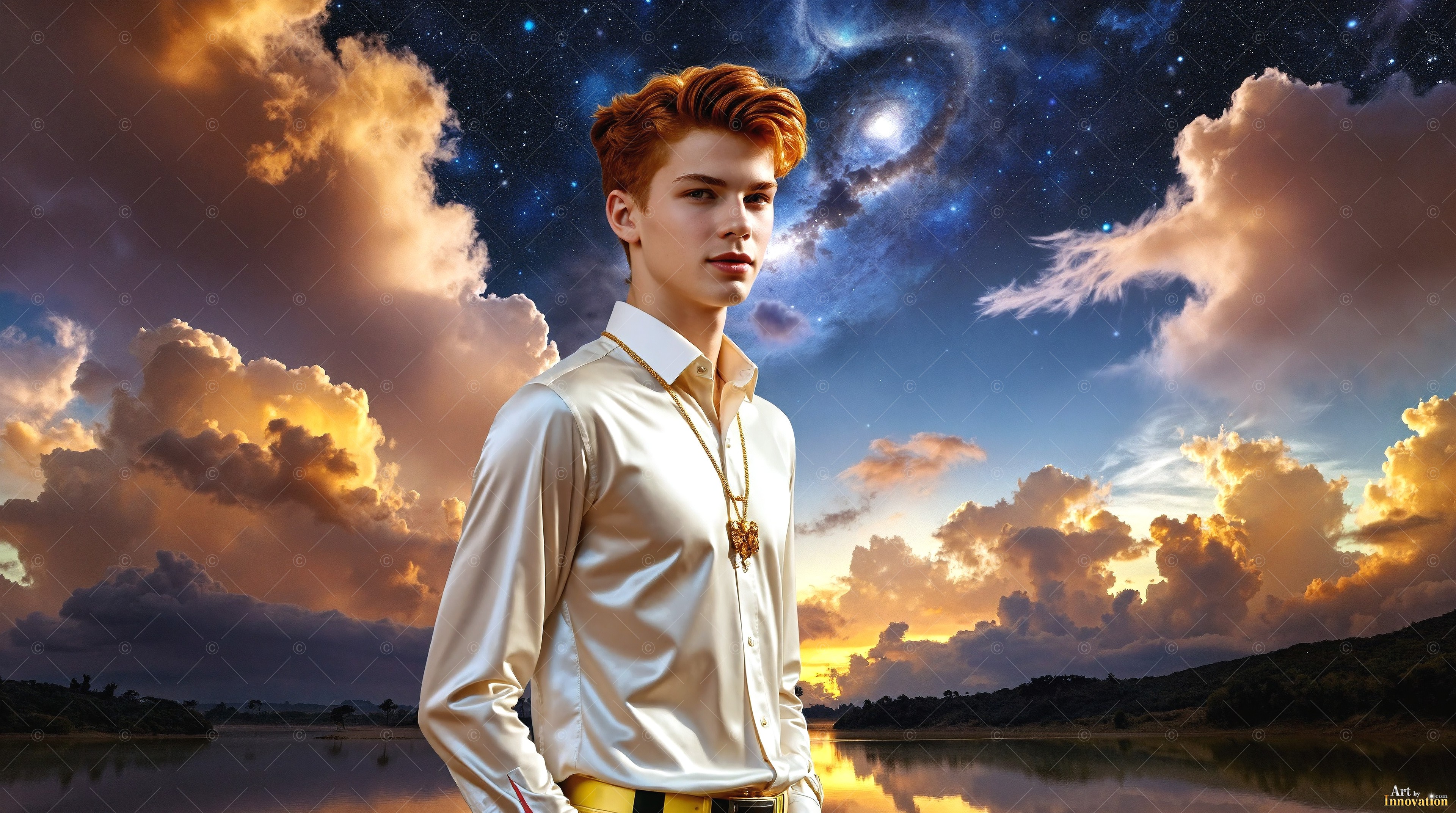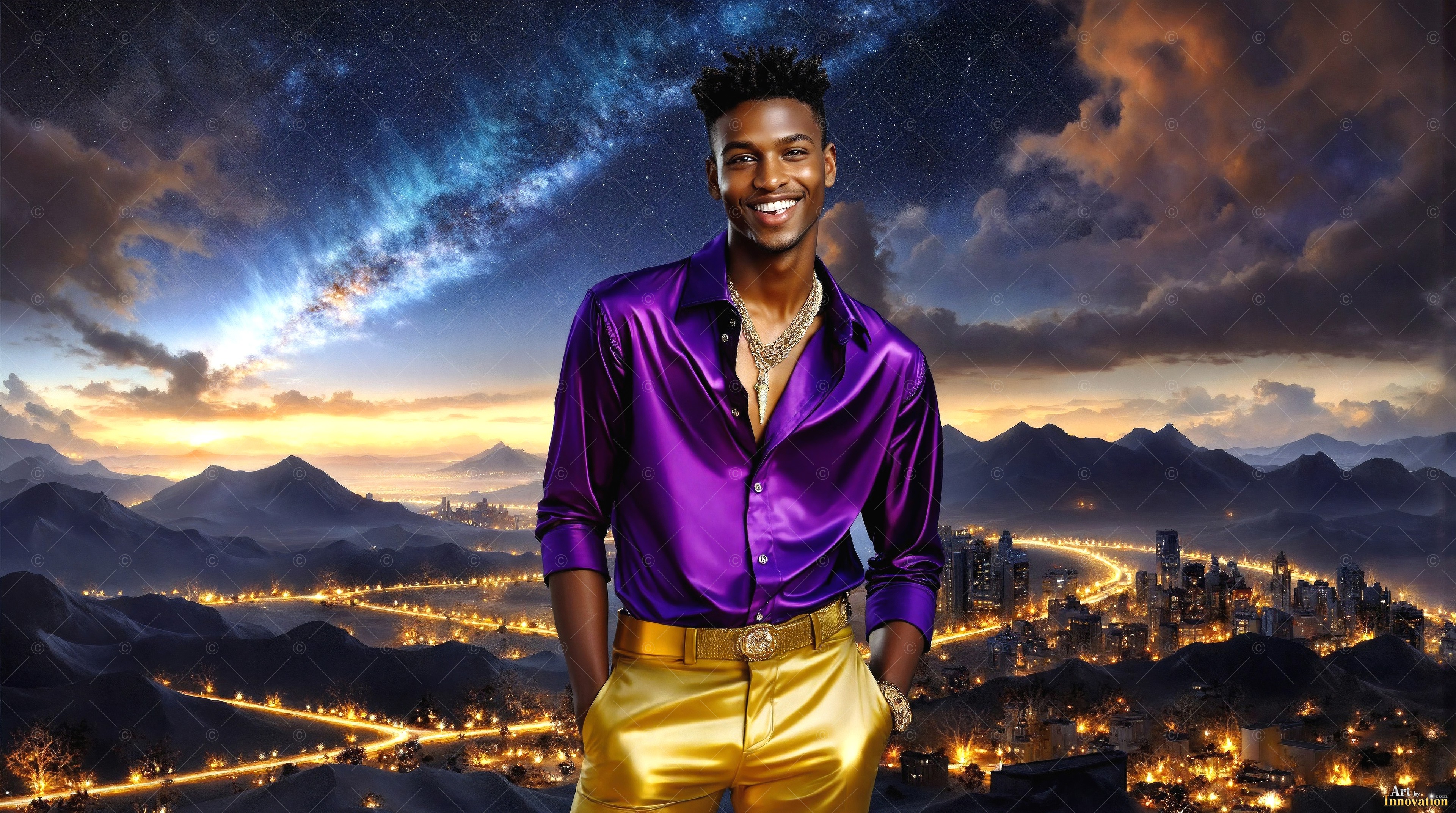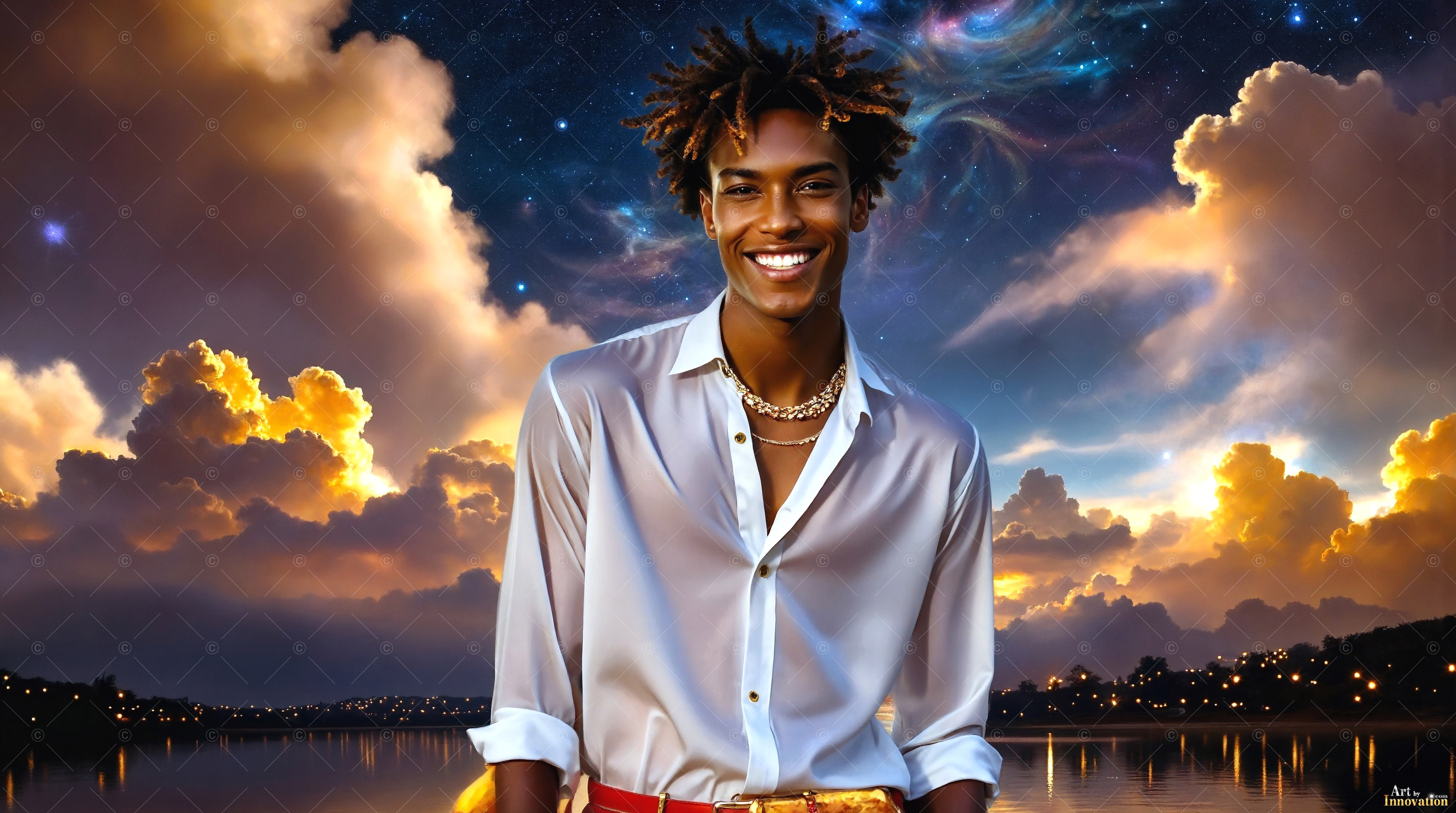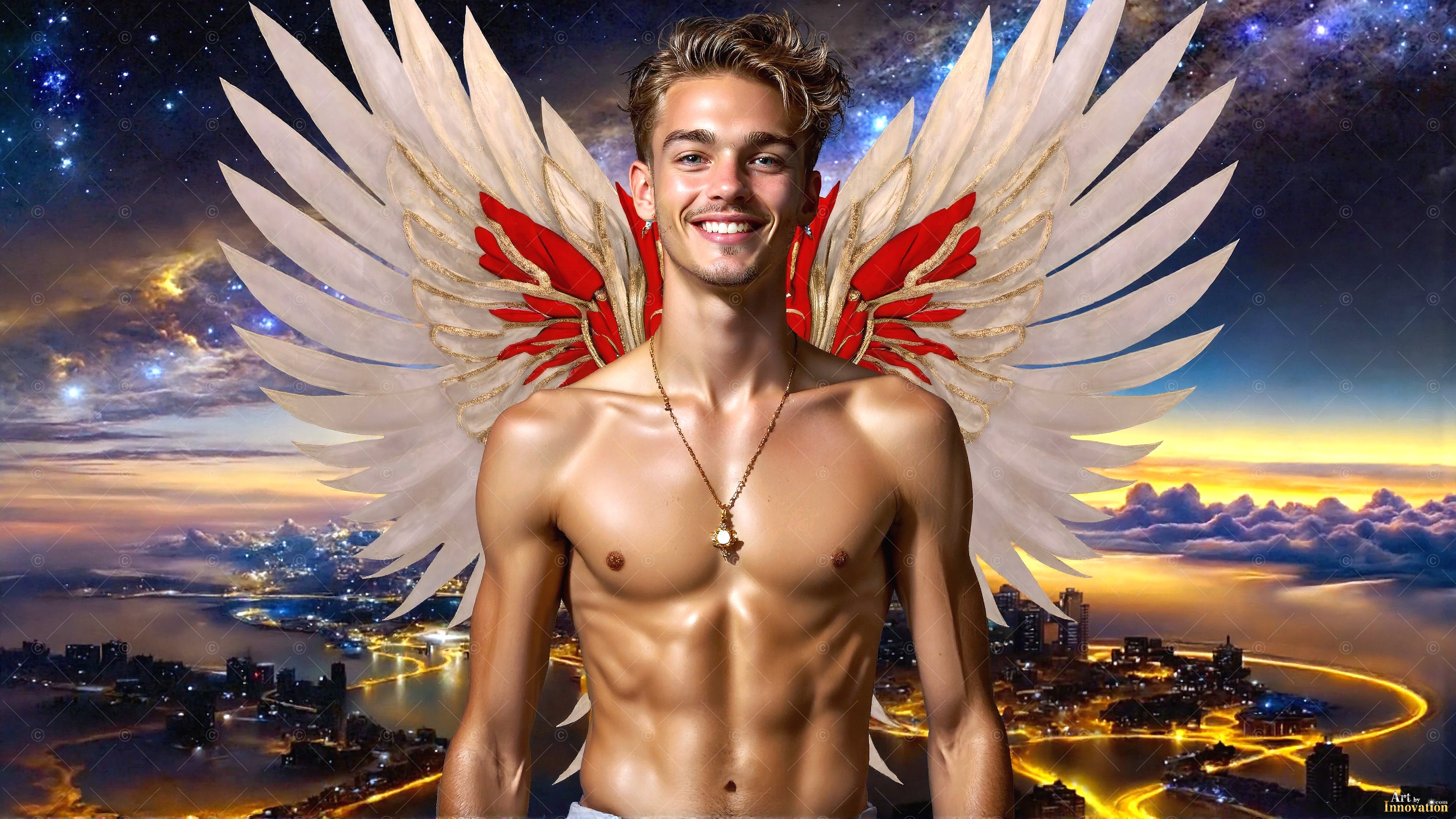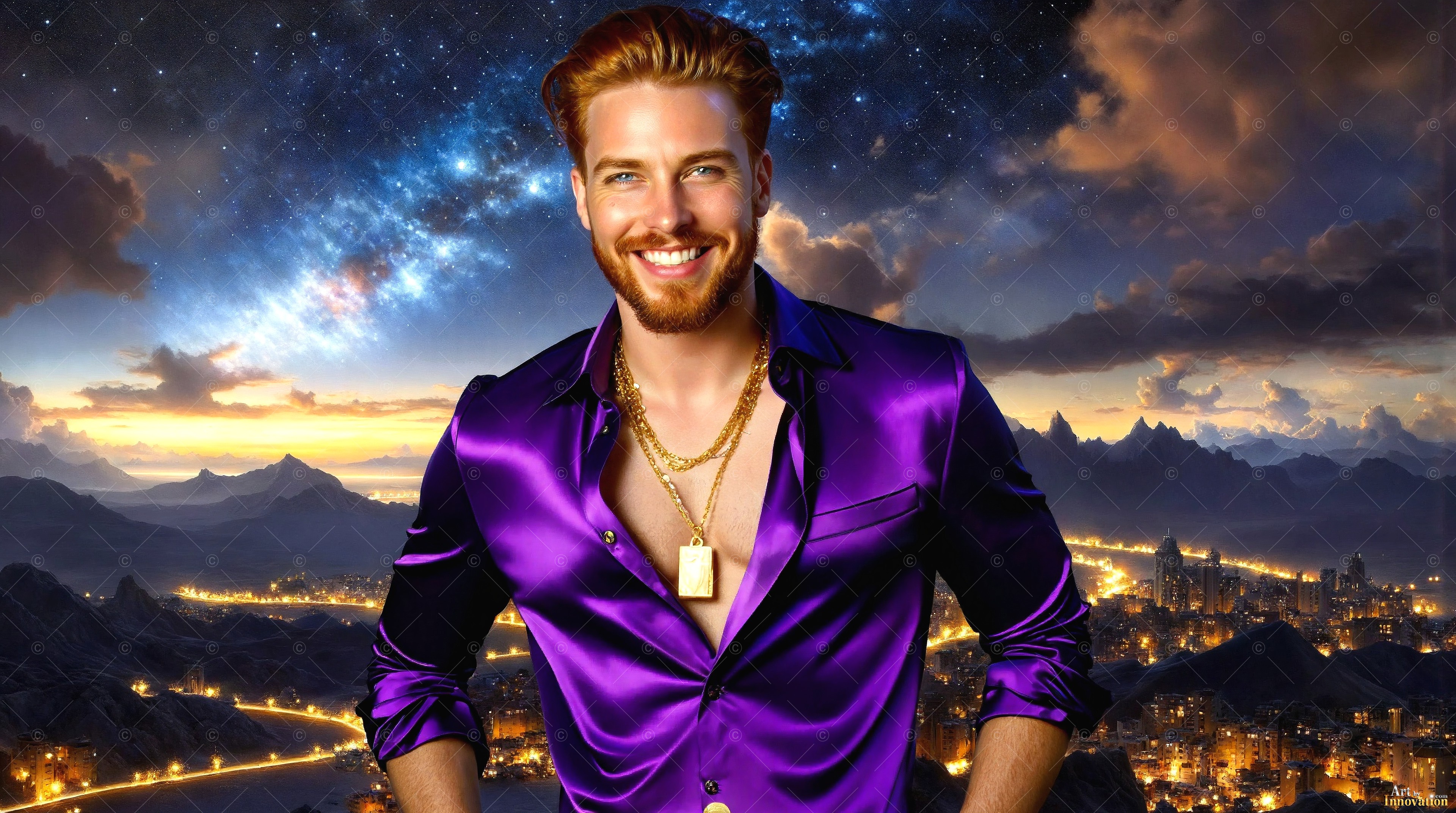 ByJDThe Beautiful Young Men of the Golden City, is a collection of AI generated images of sexy, glamorous, handsome guys in the heavens. In this fantasy photograph of a young men in their 20’s, on a balcony, overlooking a large golden city in the heavens. Generated to be as realistic as possible, in this this fantasy setting, with todays technology. Wearing jeans, an unbuttoned, vibrant, long-sleeve, button down shirt. The subject is enjoying a beautiful day outdoors. The mystical, galactic landscape, and the vibrant cosmic canopies, every detail, from the texture of the clouds, to the magnificent, majestic gothic architecture of the golden city, is crafted to create an atmosphere of reverence and divine glory. With a breathtaking scene of Salar de Uyuni at sunset, offering warm golden hour lighting. The heavenly landscape evokes a sense of freedom and tranquility, that is expresses through his facial features and smile, as day turns to night. The heavenly landscape evokes a sense of mysterious black space and light, with a vast galaxy that almost covers the image, the stars and constellations sparkle bright, in dark blue sky. On occasion the earth can be seen floating in the sky.