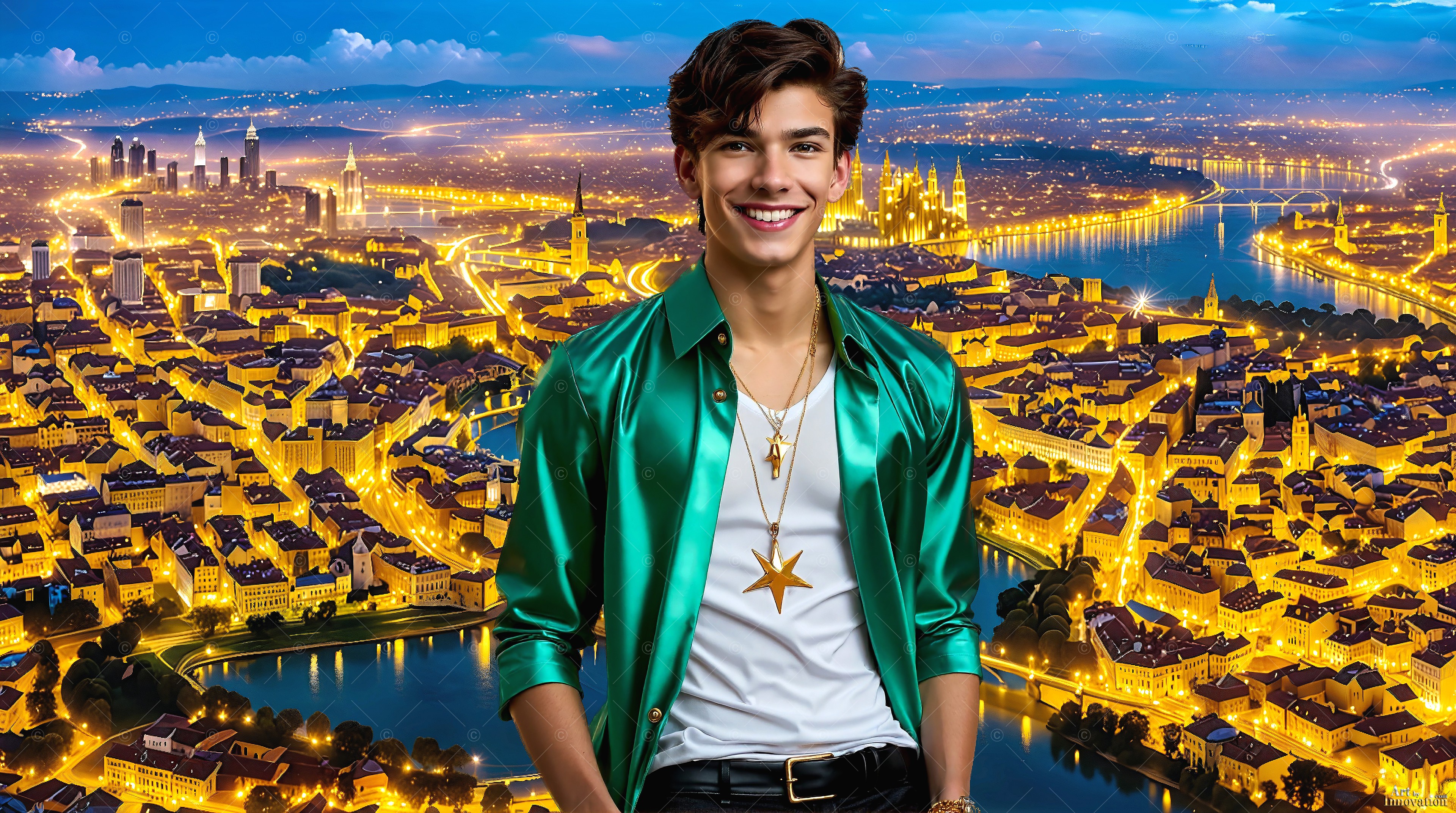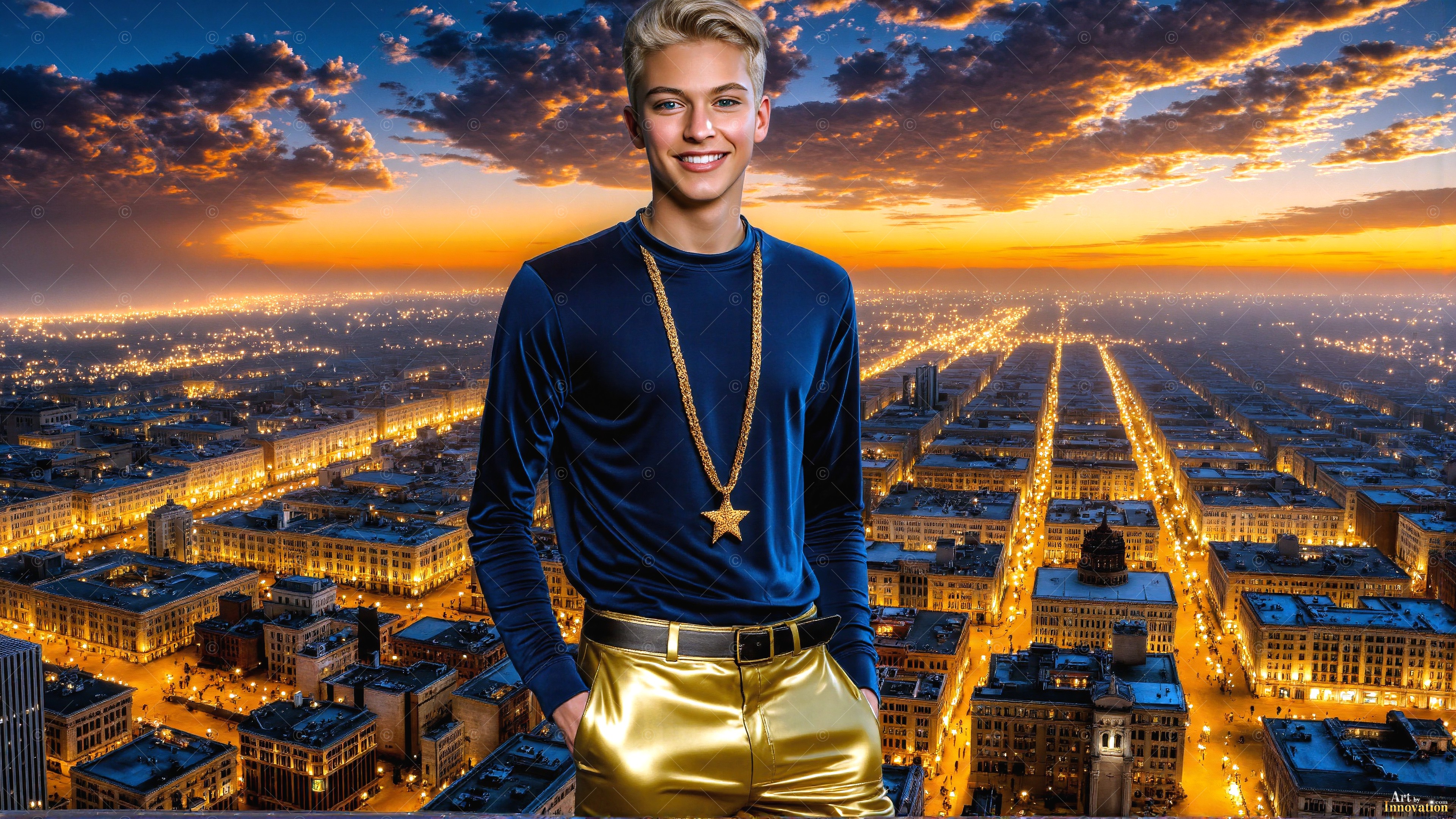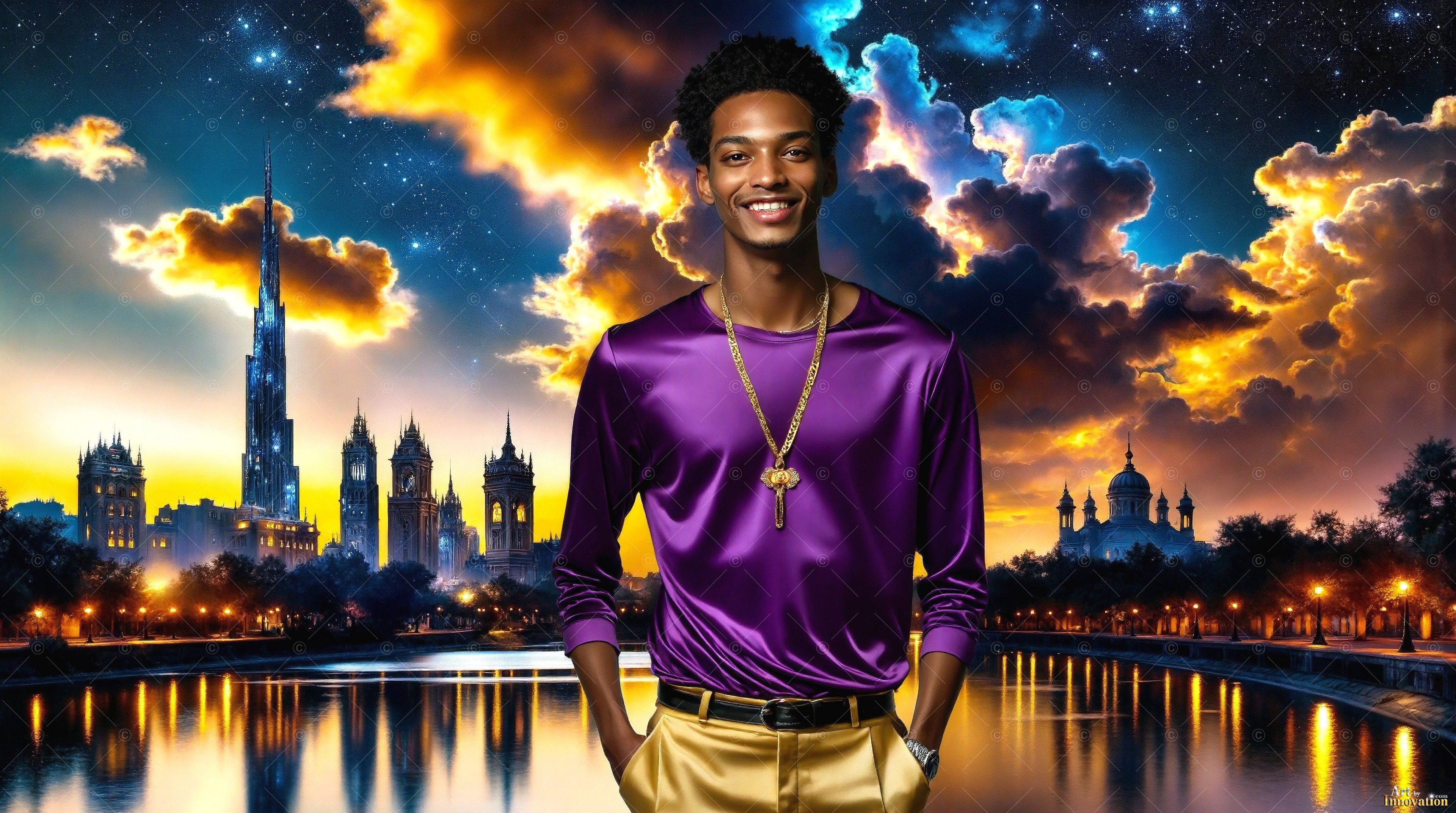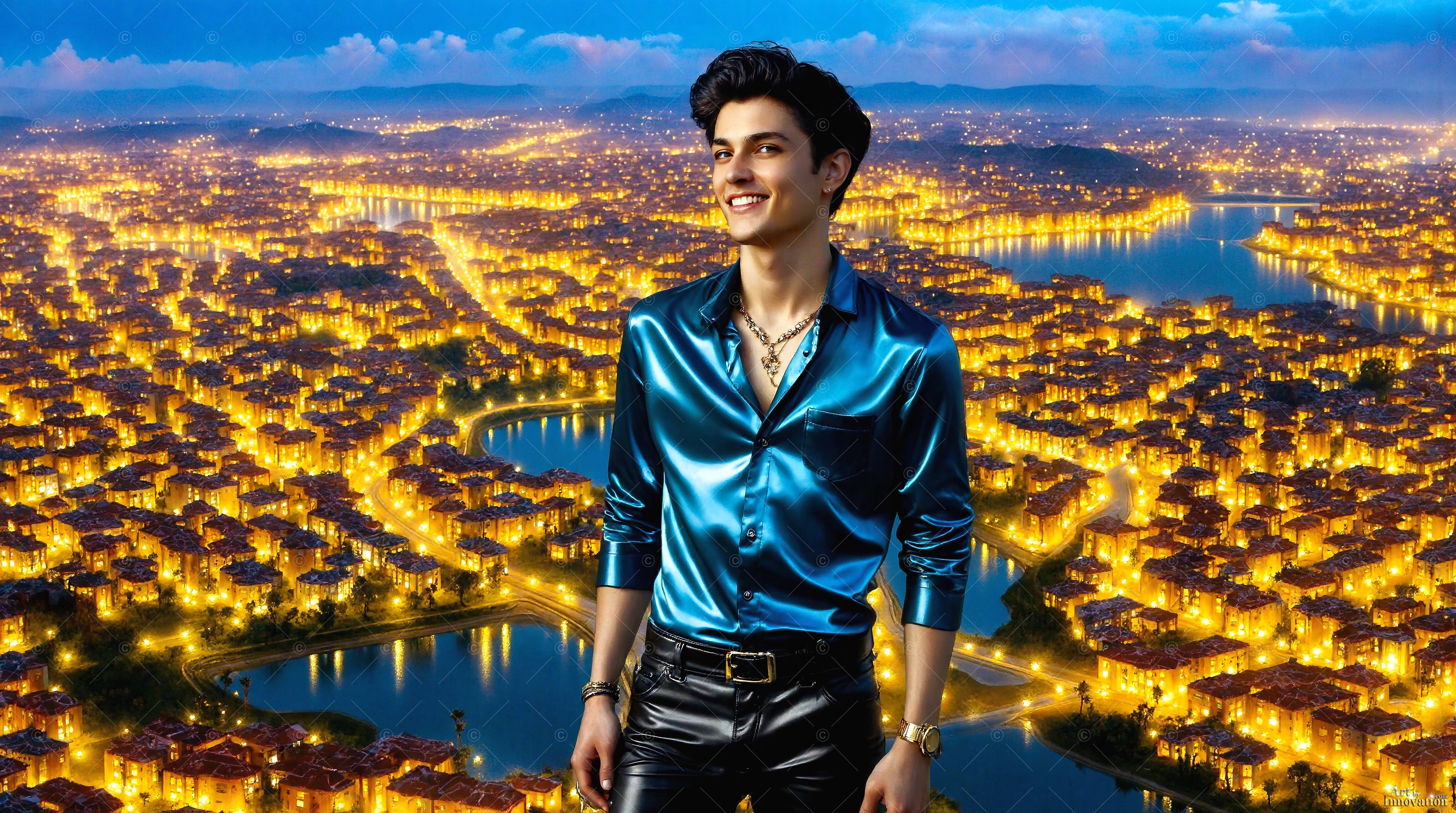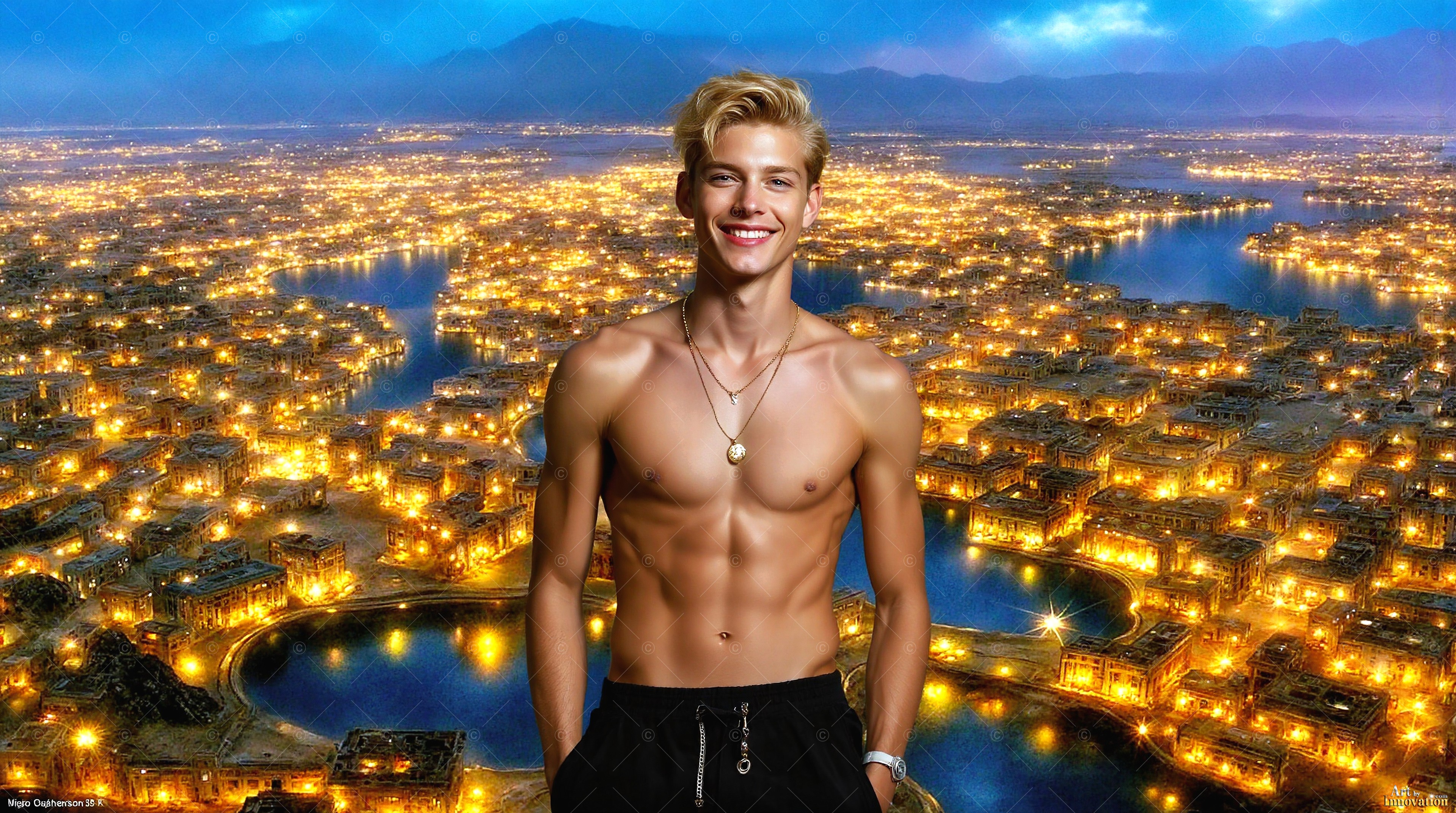 ByJDThe Beautiful Young Men of the Golden City, is a collection of AI generated images of sexy, glamorous, handsome guys in the heavens. In this fantasy photograph of a young men in their 20’s, on a balcony, overlooking a large golden city in the heavens. Generated to be as realistic as possible, in this this fantasy setting, with todays technology. Wearing jeans, an unbuttoned, vibrant, long-sleeve, button down shirt. The subject is enjoying a beautiful day outdoors. The mystical, galactic landscape, and the vibrant cosmic canopies, every detail, from the texture of the clouds, to the magnificent, majestic gothic architecture of the golden city, is crafted to create an atmosphere of reverence and divine glory. With a breathtaking scene of Salar de Uyuni at sunset, offering warm golden hour lighting. The heavenly landscape evokes a sense of freedom and tranquility, that is expresses through his facial features and smile, as day turns to night. The heavenly landscape evokes a sense of mysterious black space and light, with a vast galaxy that almost covers the image, the stars and constellations sparkle bright, in dark blue sky. On occasion the earth can be seen floating in the sky.