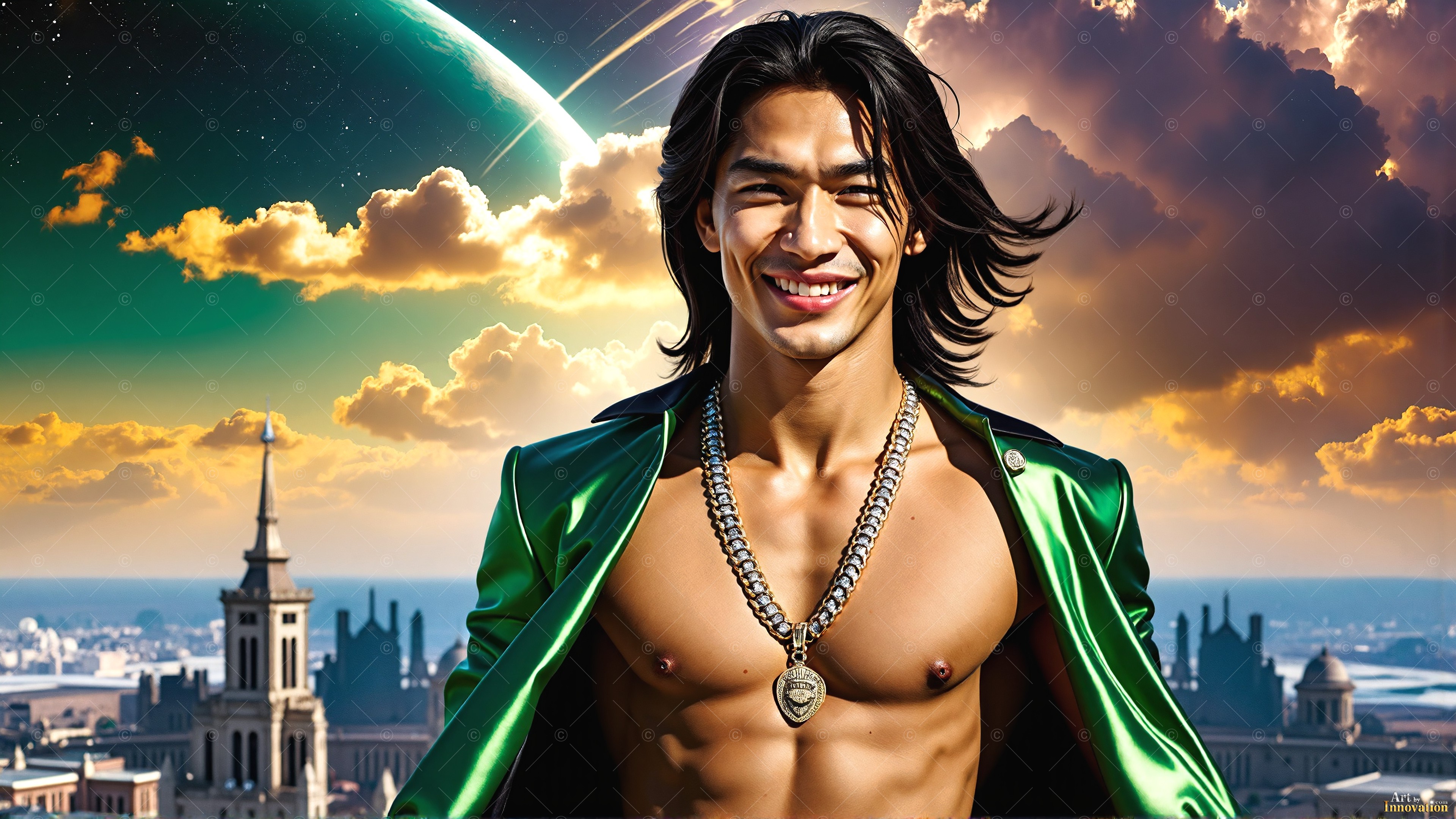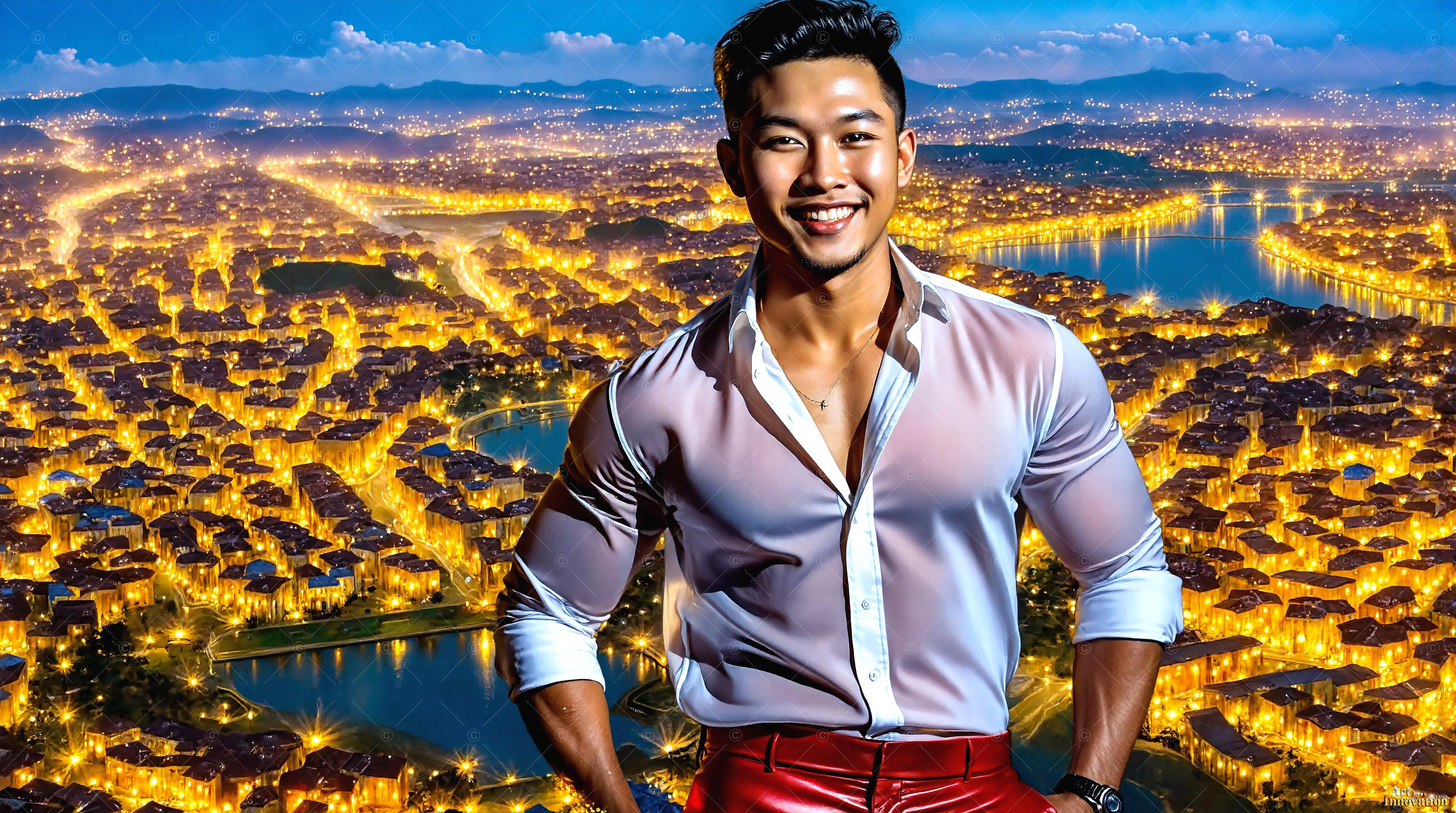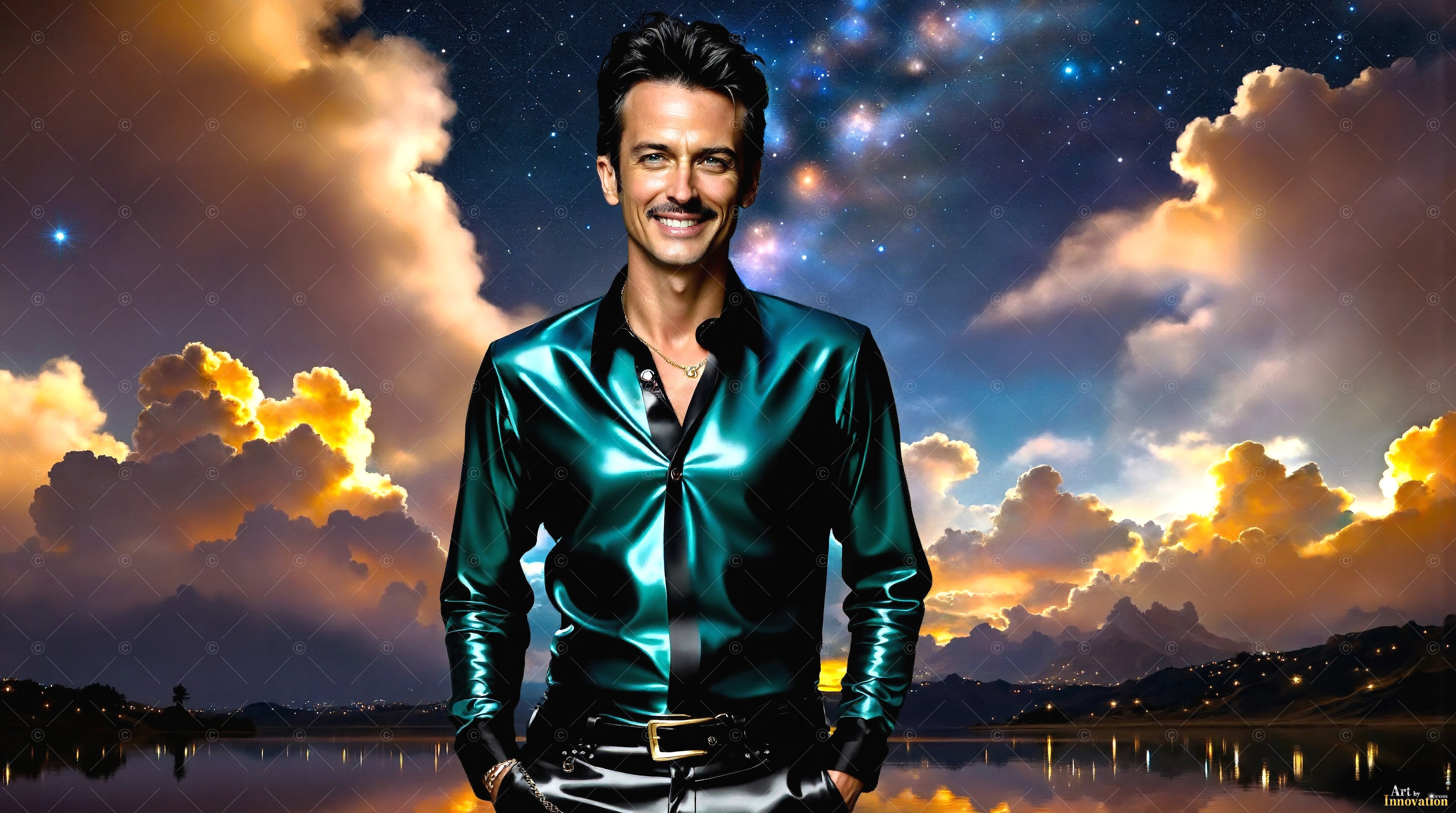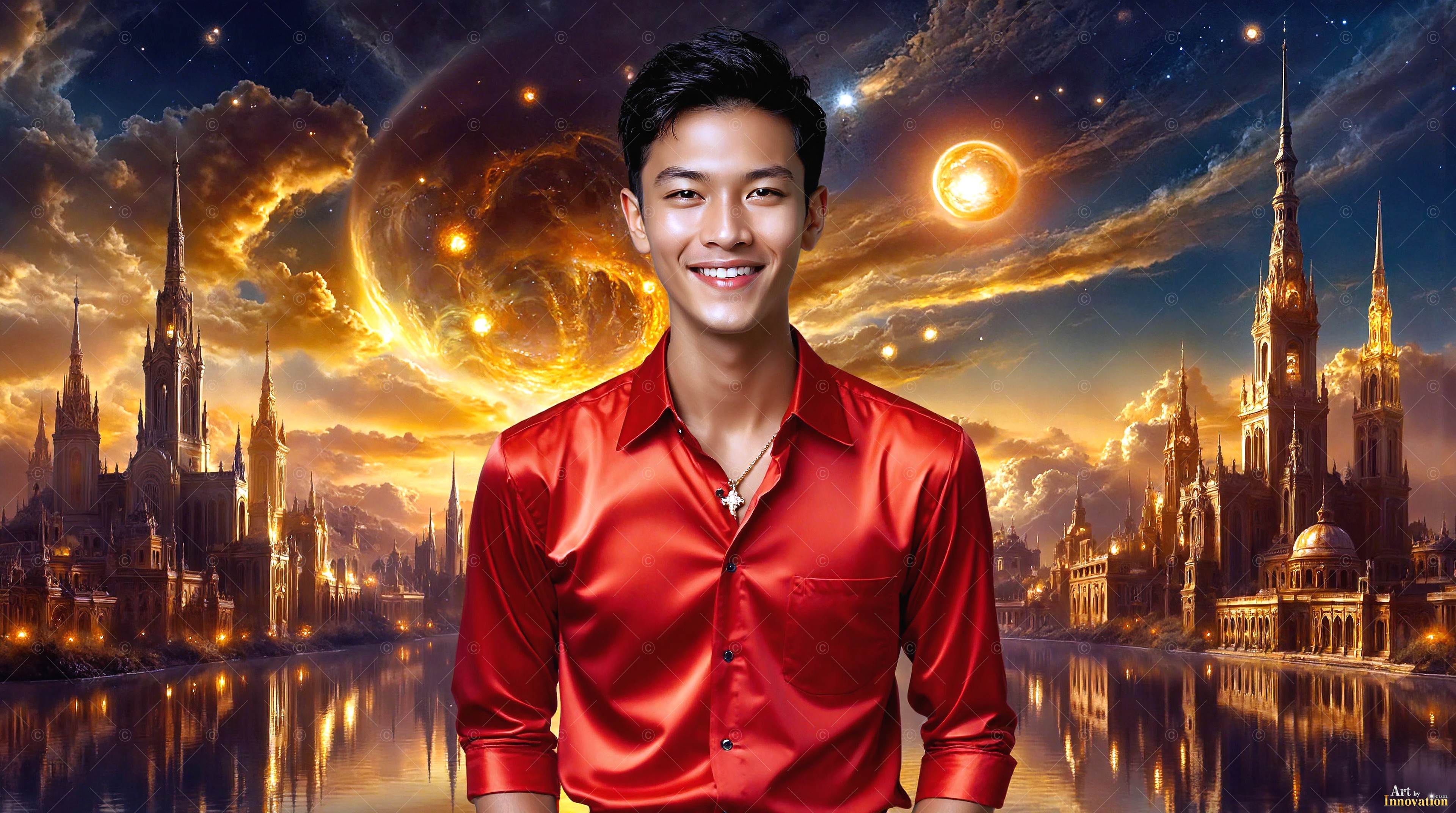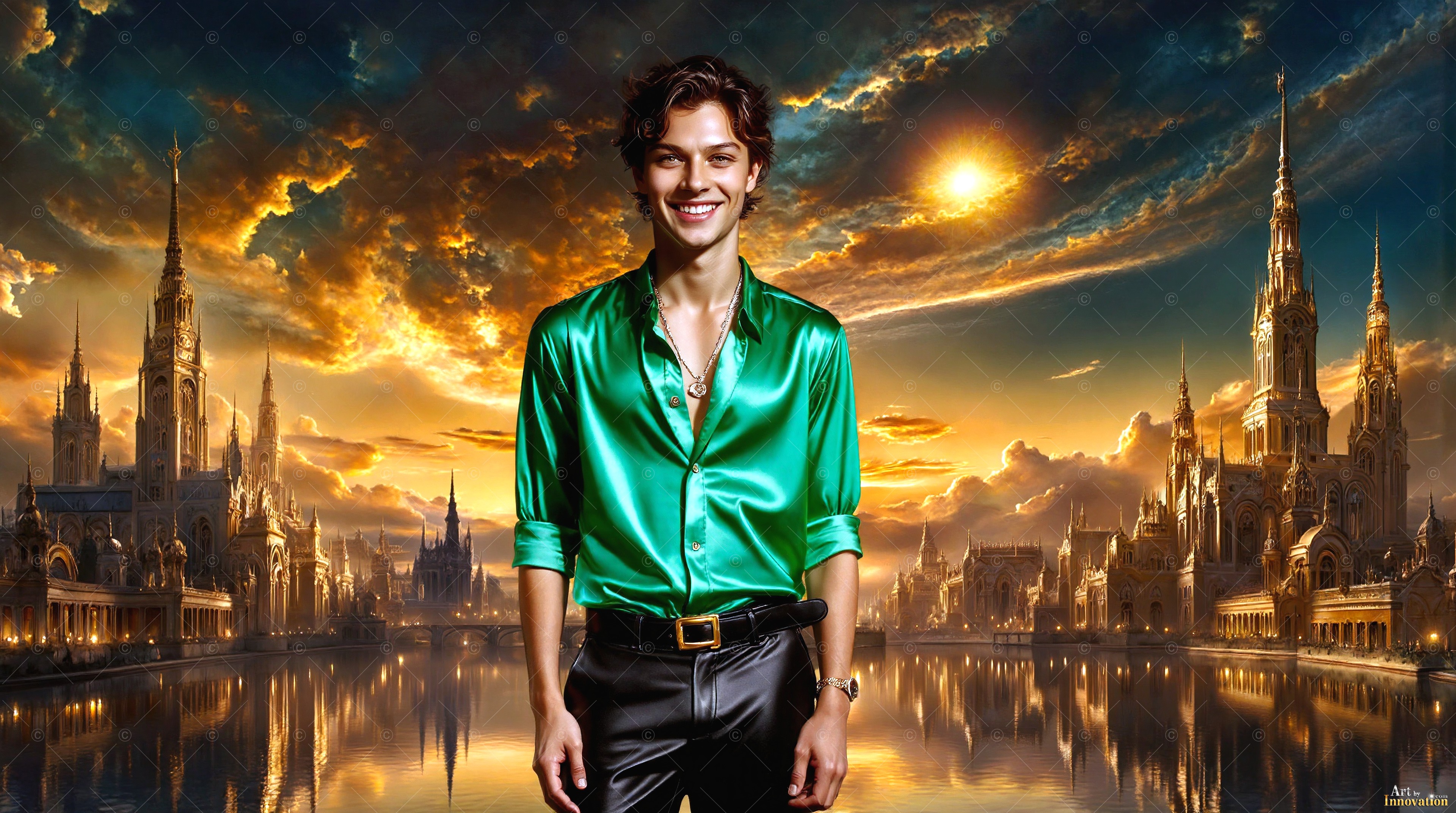 ByJDThe Beautiful Young Men of the Golden City, is a collection of AI generated images of sexy, glamorous, handsome guys in the heavens. In this fantasy photograph of a young men in their 20’s, on a balcony, overlooking a large golden city in the heavens. Generated to be as realistic as possible, in this this fantasy setting, with todays technology. Wearing jeans, an unbuttoned, vibrant, long-sleeve, button down shirt. The subject is enjoying a beautiful day outdoors. The mystical, galactic landscape, and the vibrant cosmic canopies, every detail, from the texture of the clouds, to the magnificent, majestic gothic architecture of the golden city, is crafted to create an atmosphere of reverence and divine glory. With a breathtaking scene of Salar de Uyuni at sunset, offering warm golden hour lighting. The heavenly landscape evokes a sense of freedom and tranquility, that is expresses through his facial features and smile, as day turns to night. The heavenly landscape evokes a sense of mysterious black space and light, with a vast galaxy that almost covers the image, the stars and constellations sparkle bright, in dark blue sky. On occasion the earth can be seen floating in the sky.