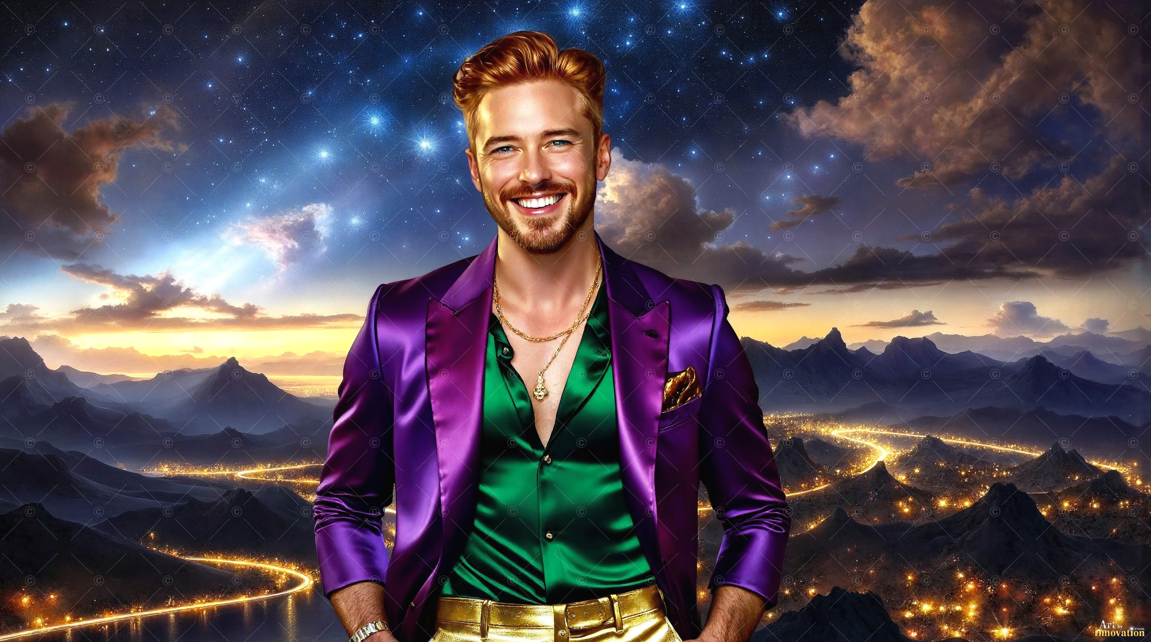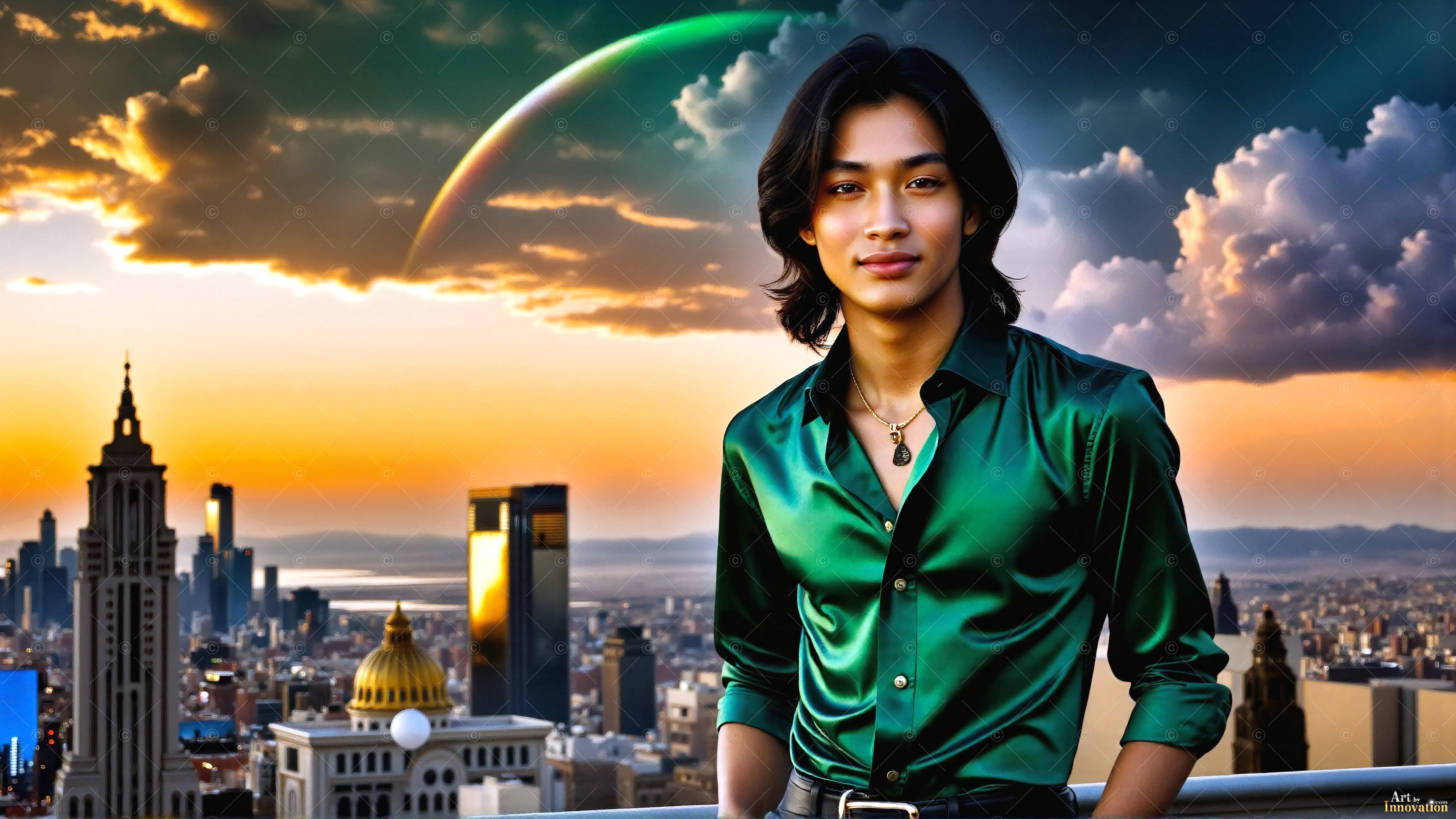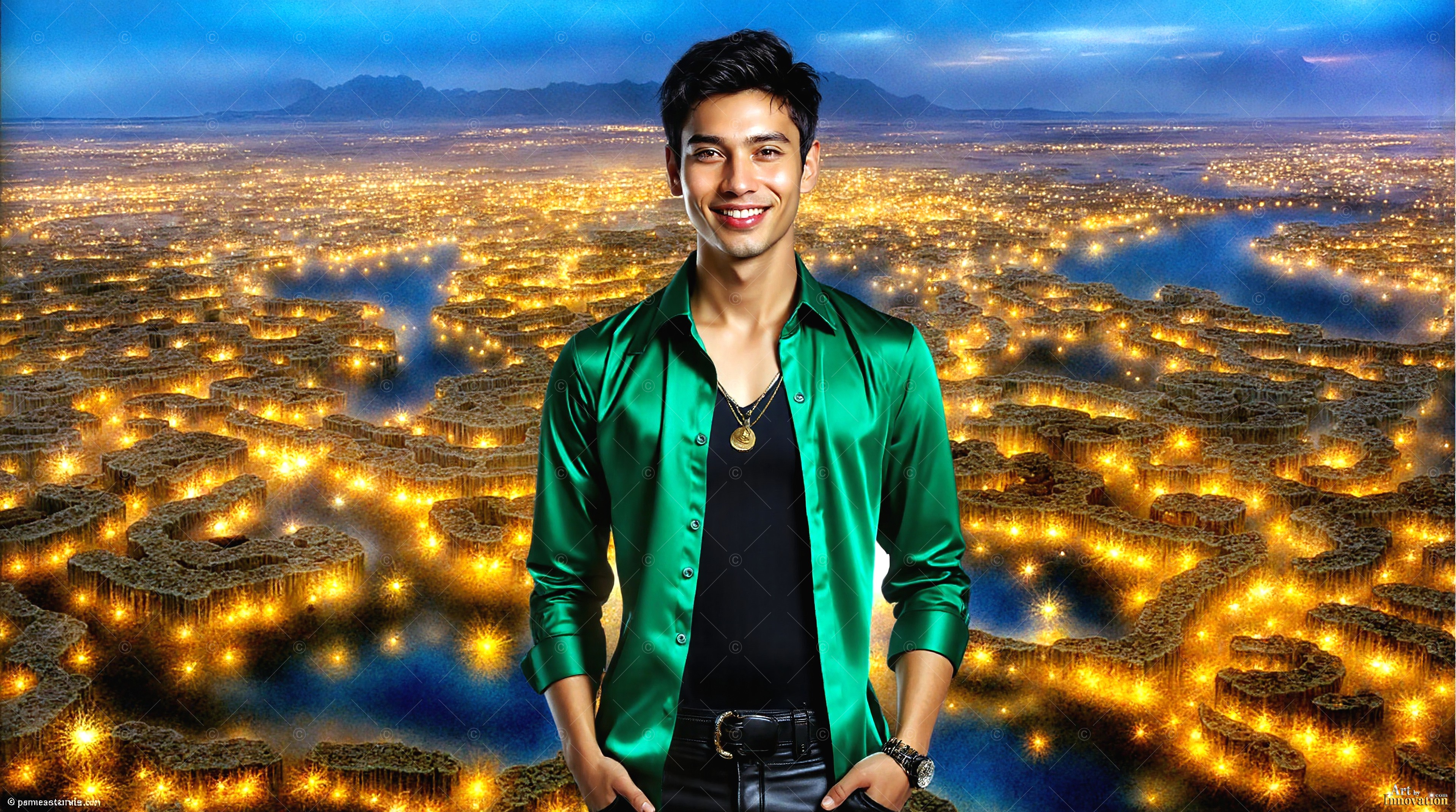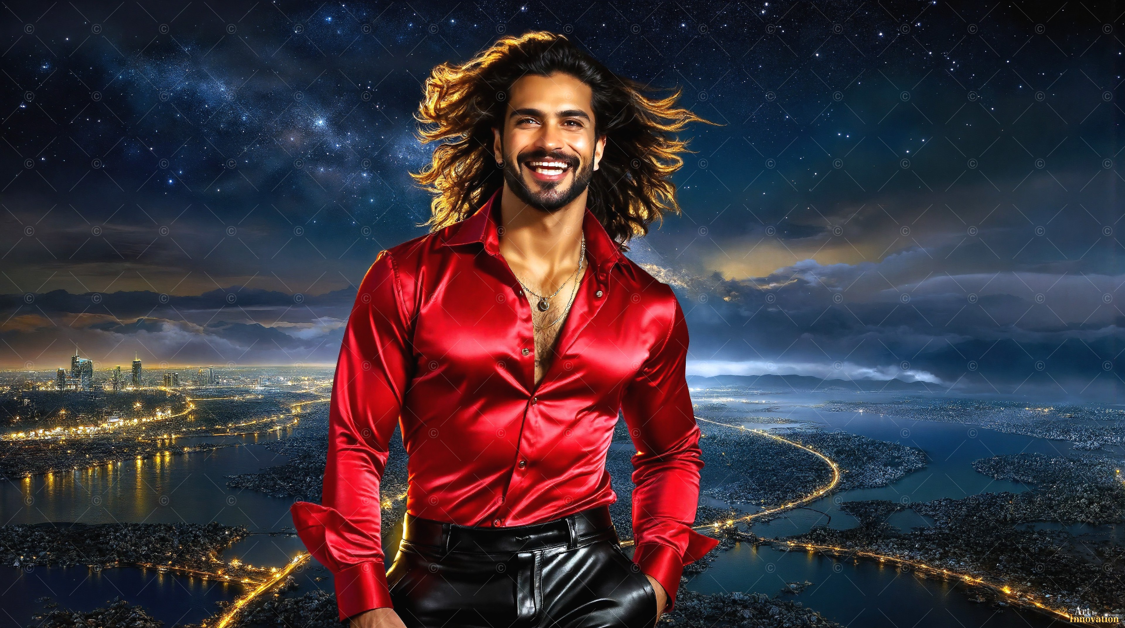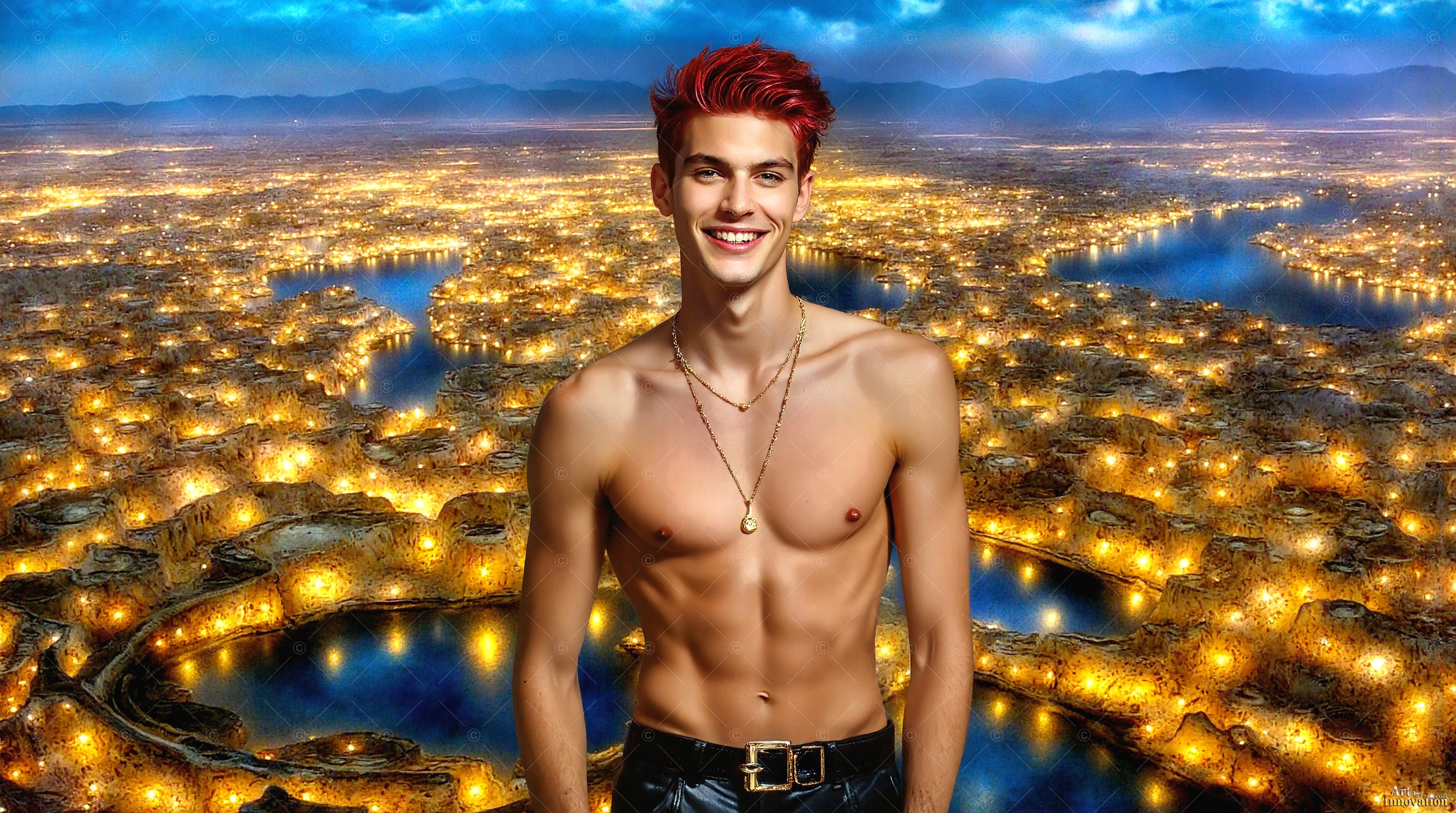 ByJDThe Beautiful Young Men of the Golden City, is a collection of AI generated images of sexy, glamorous, handsome guys in the heavens. In this fantasy photograph of a young men in their 20’s, on a balcony, overlooking a large golden city in the heavens. Generated to be as realistic as possible, in this this fantasy setting, with todays technology. Wearing jeans, an unbuttoned, vibrant, long-sleeve, button down shirt. The subject is enjoying a beautiful day outdoors. The mystical, galactic landscape, and the vibrant cosmic canopies, every detail, from the texture of the clouds, to the magnificent, majestic gothic architecture of the golden city, is crafted to create an atmosphere of reverence and divine glory. With a breathtaking scene of Salar de Uyuni at sunset, offering warm golden hour lighting. The heavenly landscape evokes a sense of freedom and tranquility, that is expresses through his facial features and smile, as day turns to night. The heavenly landscape evokes a sense of mysterious black space and light, with a vast galaxy that almost covers the image, the stars and constellations sparkle bright, in dark blue sky. On occasion the earth can be seen floating in the sky.