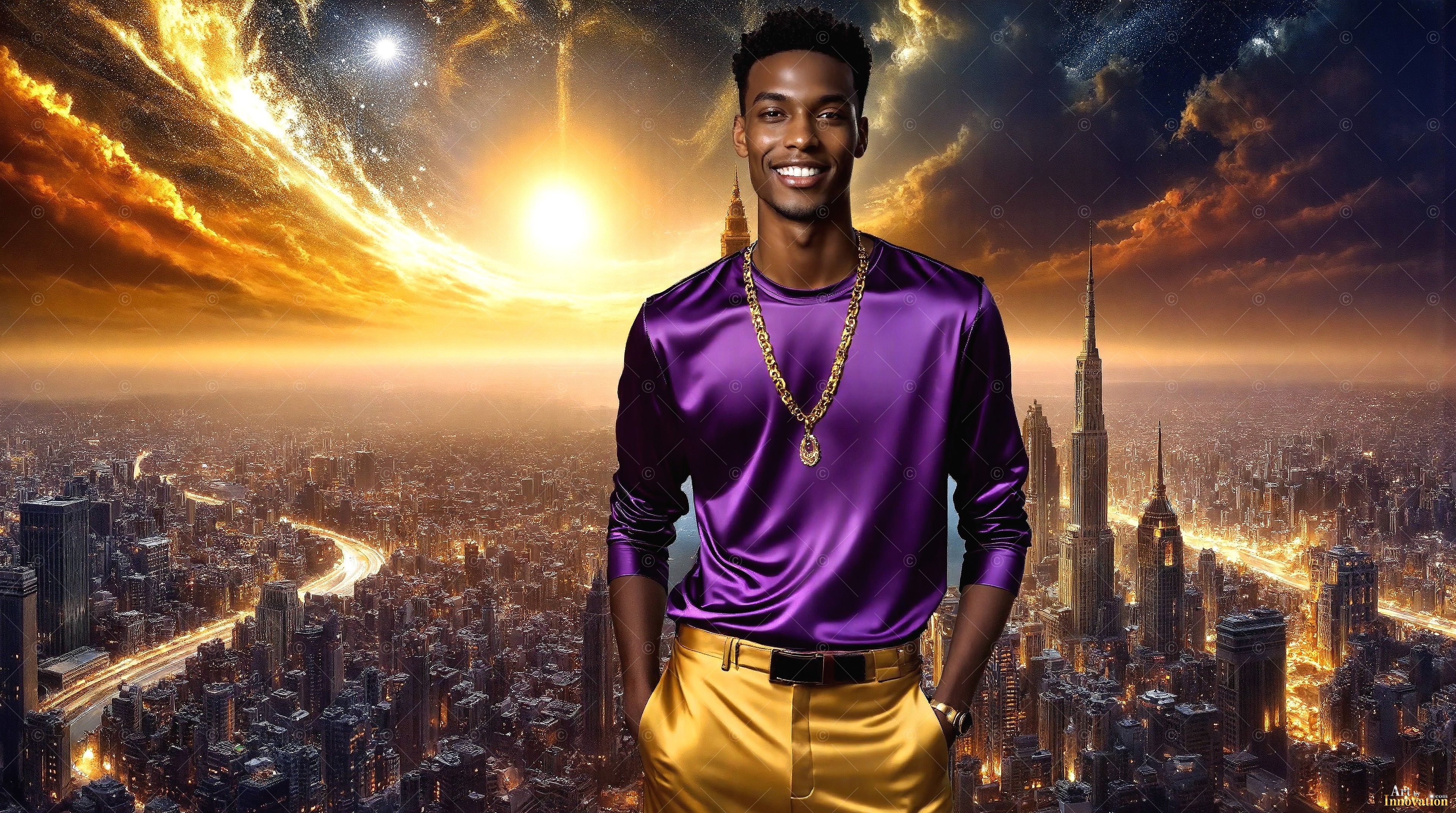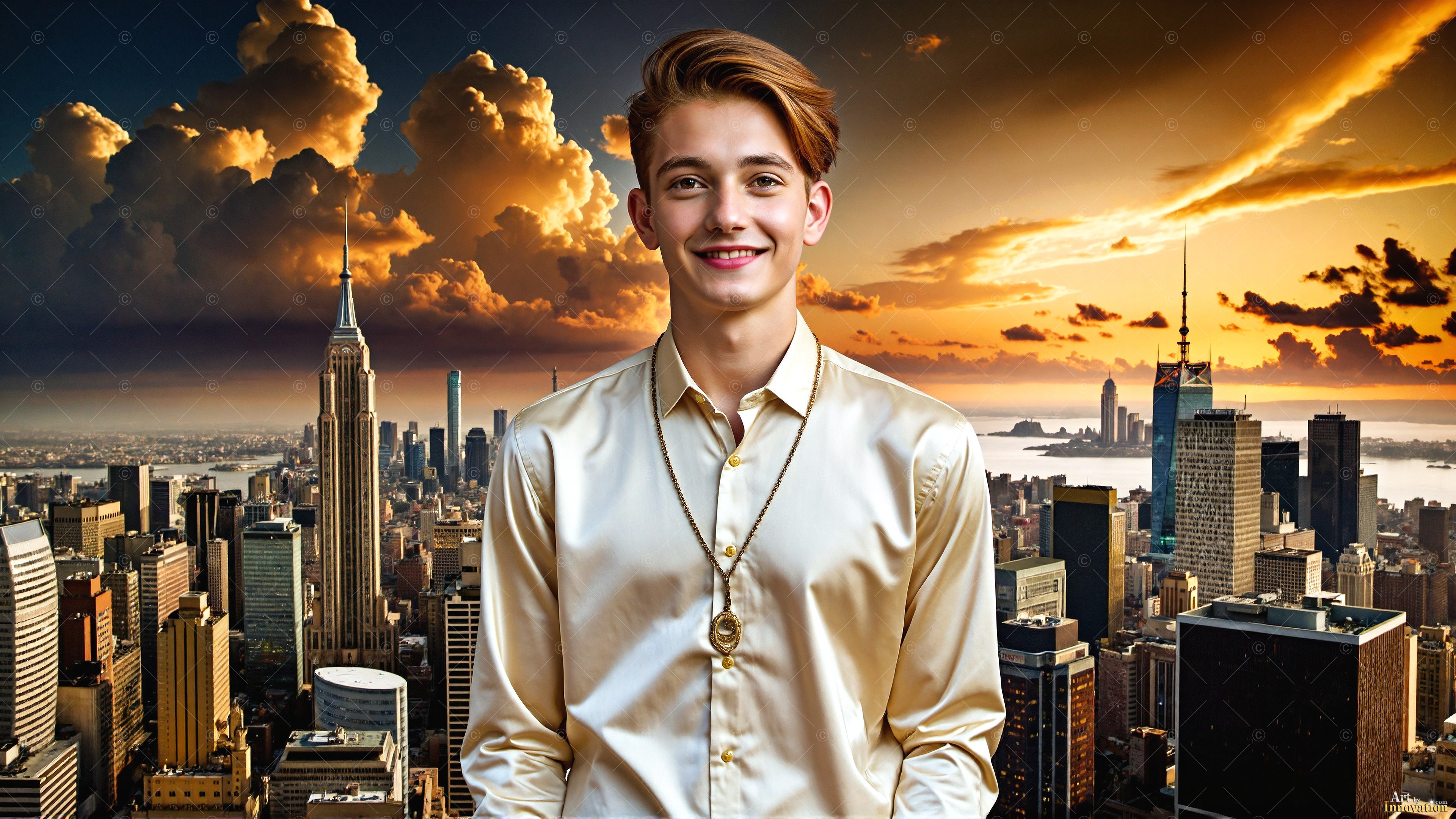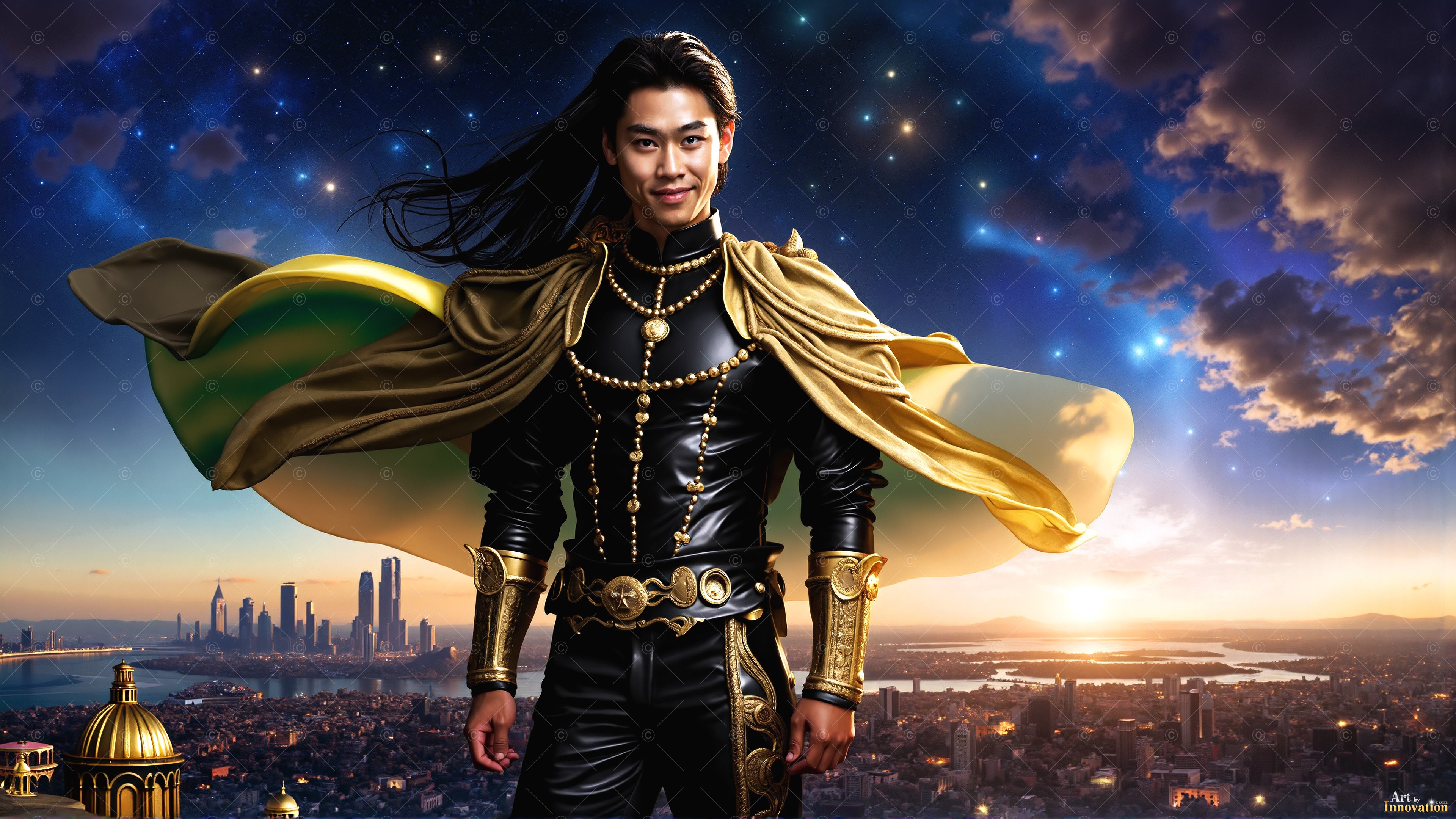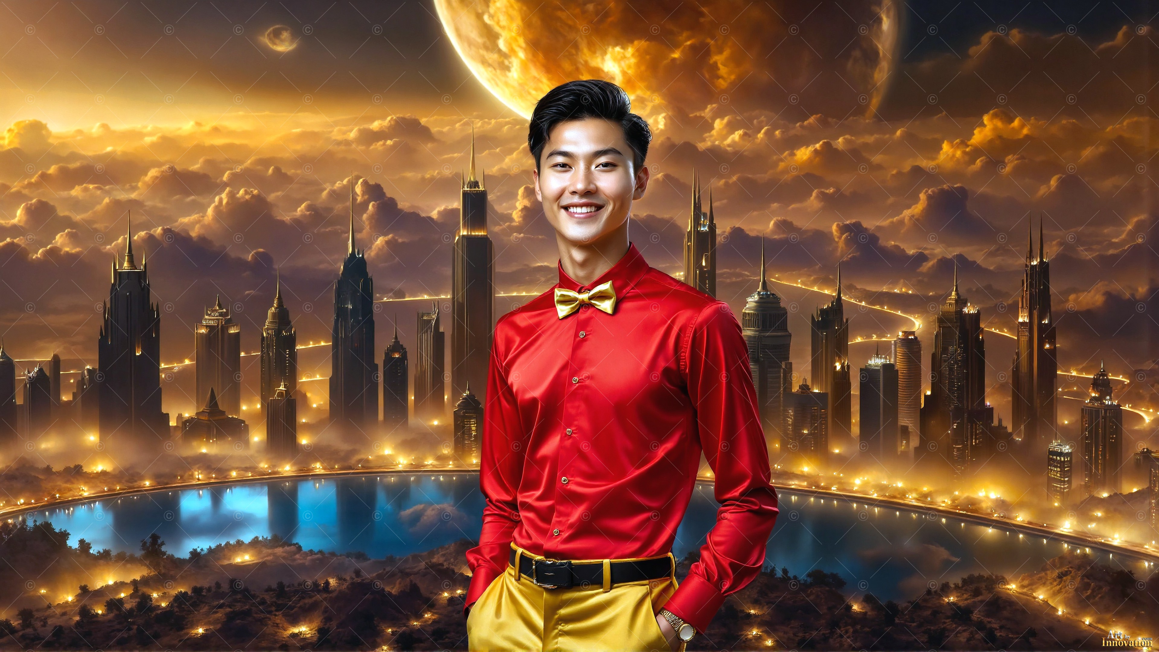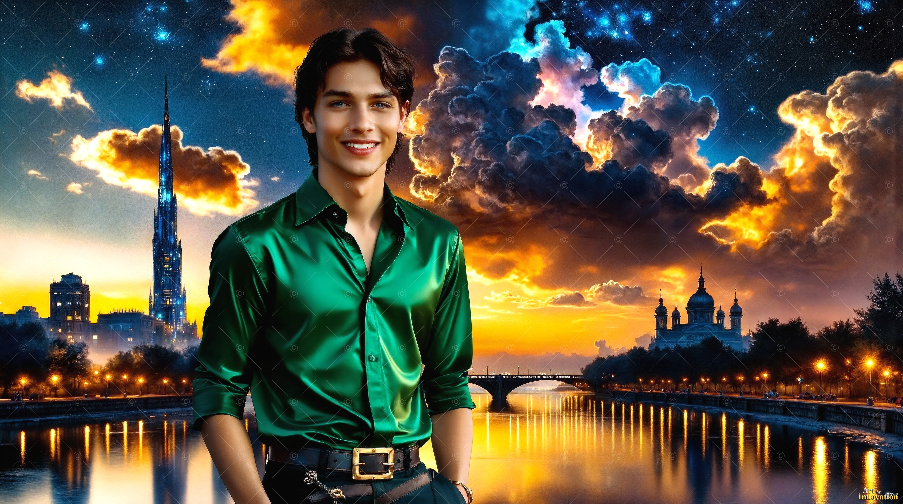 ByJDThe Beautiful Young Men of the Golden City, is a collection of AI generated images of sexy, glamorous, handsome guys in the heavens. In this fantasy photograph of a young men in their 20’s, on a balcony, overlooking a large golden city in the heavens. Generated to be as realistic as possible, in this this fantasy setting, with todays technology. Wearing jeans, an unbuttoned, vibrant, long-sleeve, button down shirt. The subject is enjoying a beautiful day outdoors. The mystical, galactic landscape, and the vibrant cosmic canopies, every detail, from the texture of the clouds, to the magnificent, majestic gothic architecture of the golden city, is crafted to create an atmosphere of reverence and divine glory. With a breathtaking scene of Salar de Uyuni at sunset, offering warm golden hour lighting. The heavenly landscape evokes a sense of freedom and tranquility, that is expresses through his facial features and smile, as day turns to night. The heavenly landscape evokes a sense of mysterious black space and light, with a vast galaxy that almost covers the image, the stars and constellations sparkle bright, in dark blue sky. On occasion the earth can be seen floating in the sky.