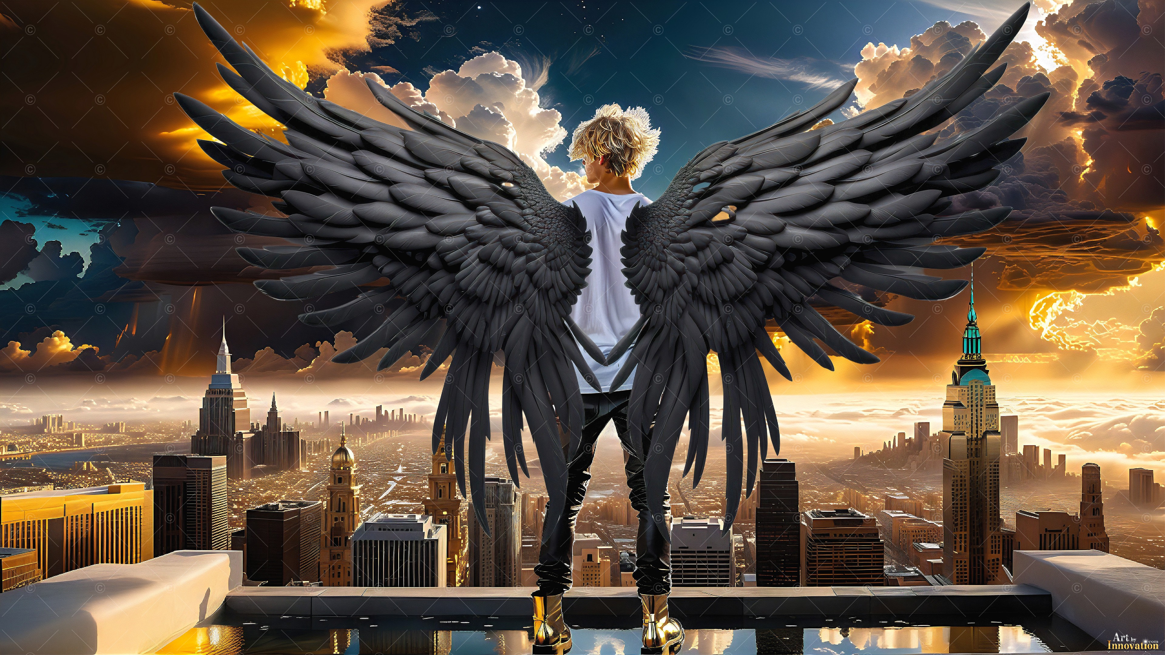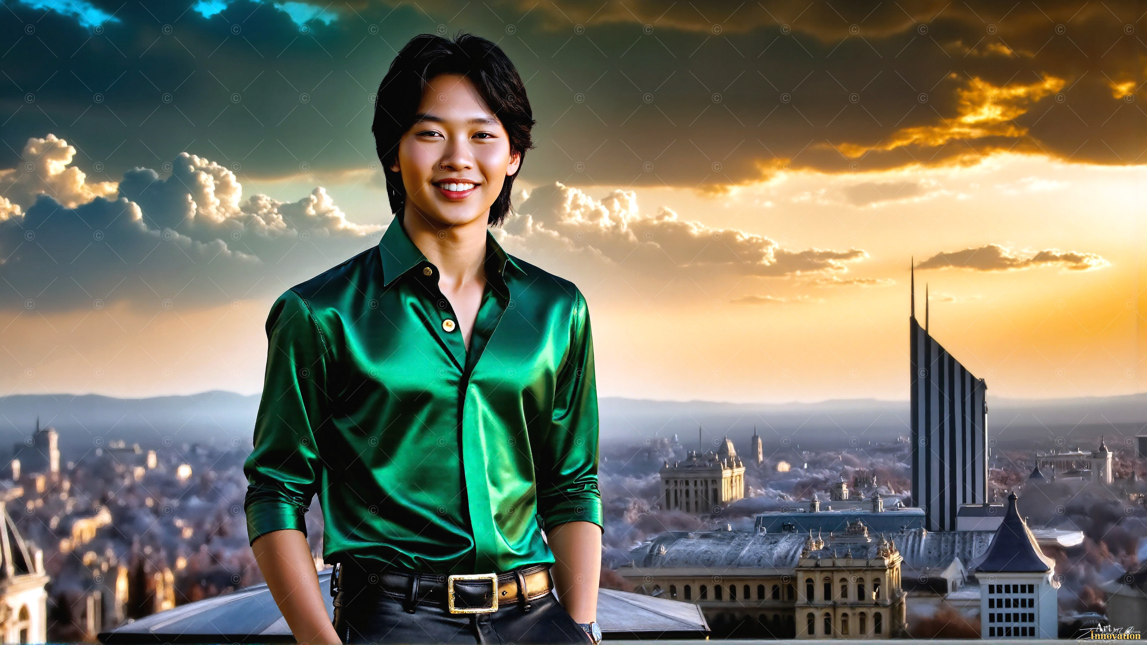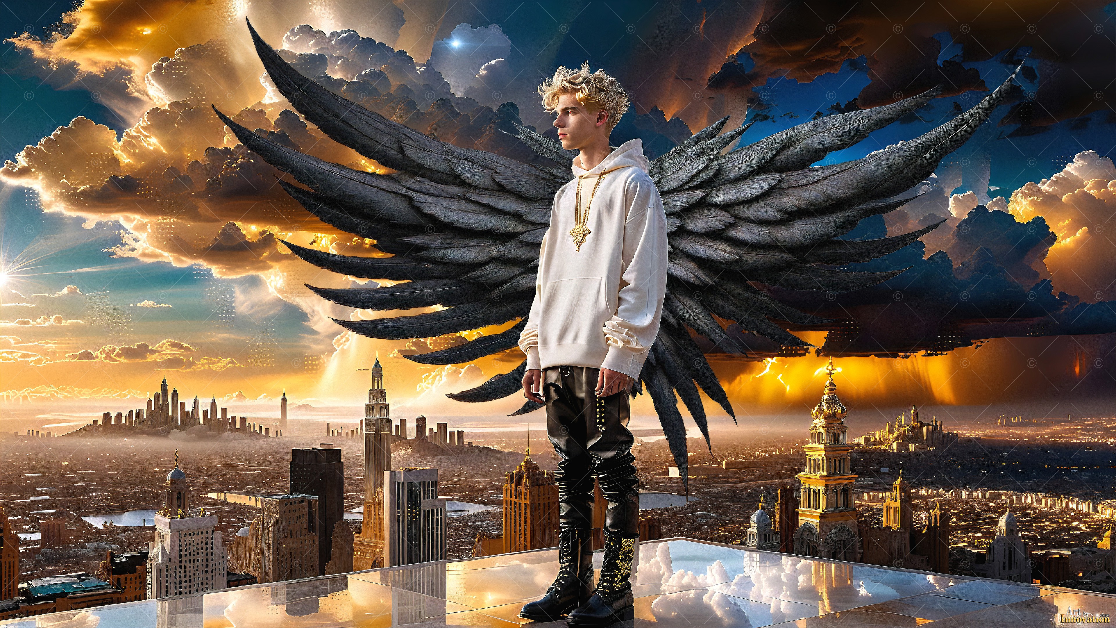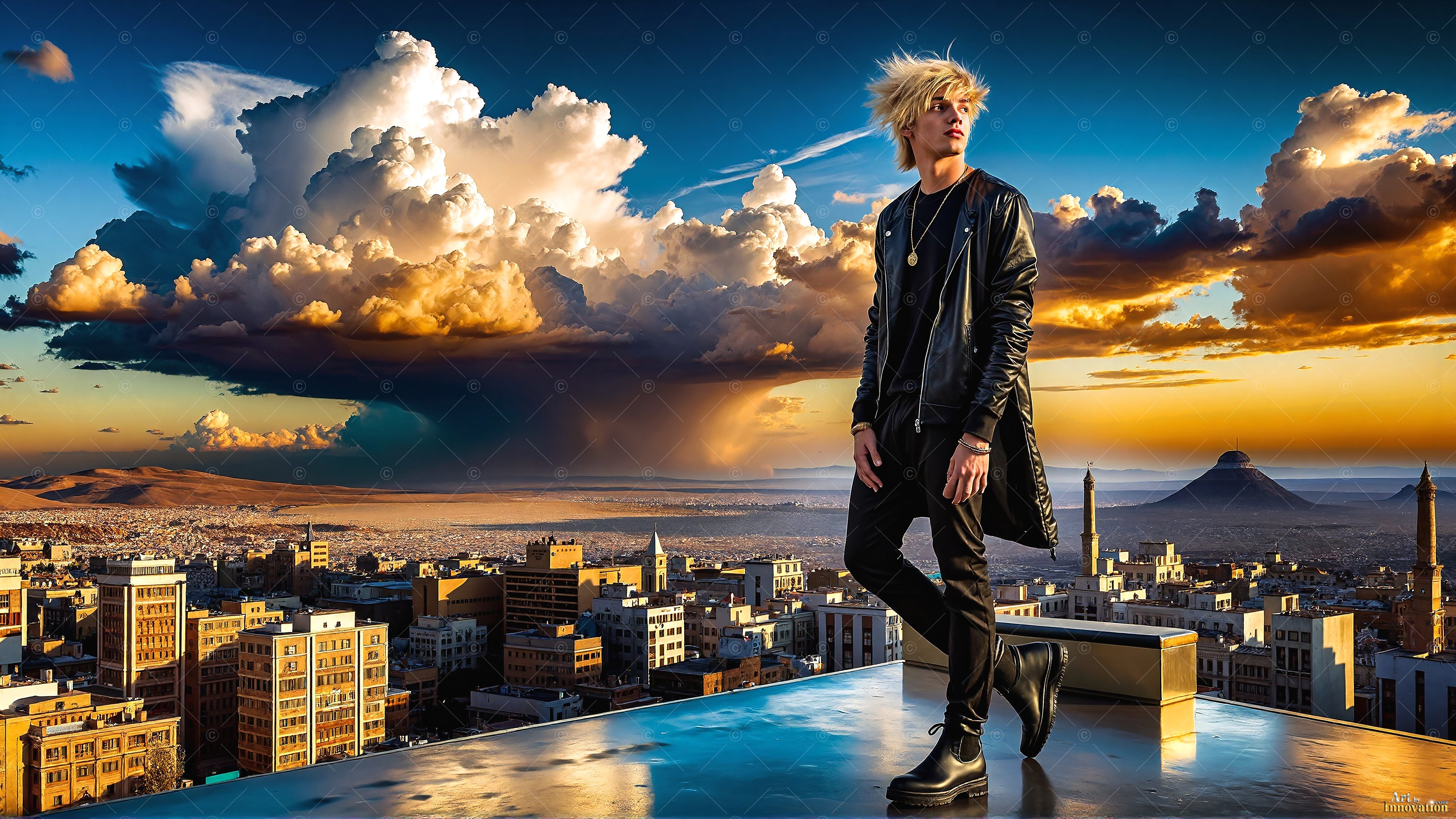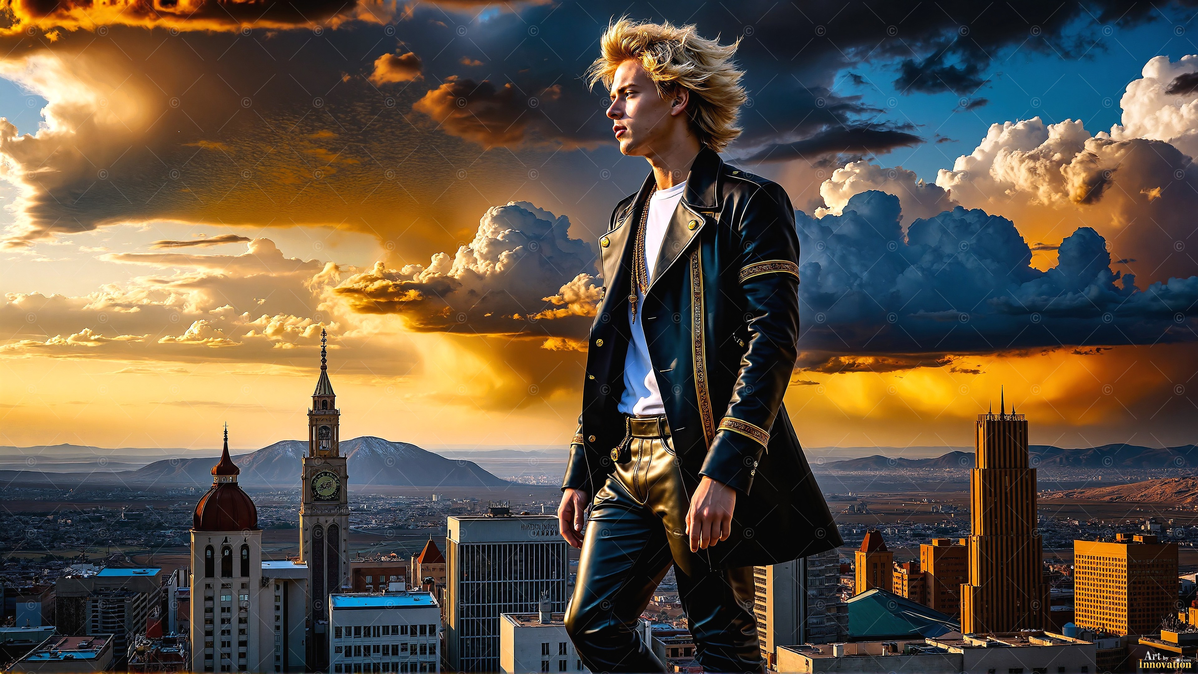 ByJDThe Beautiful Young Men of the Golden City, is a collection of AI generated images of sexy, glamorous, handsome guys in the heavens. In this fantasy photograph of a young men in their 20’s, on a balcony, overlooking a large golden city in the heavens. Generated to be as realistic as possible, in this this fantasy setting, with todays technology. Wearing jeans, an unbuttoned, vibrant, long-sleeve, button down shirt. The subject is enjoying a beautiful day outdoors. The mystical, galactic landscape, and the vibrant cosmic canopies, every detail, from the texture of the clouds, to the magnificent, majestic gothic architecture of the golden city, is crafted to create an atmosphere of reverence and divine glory. With a breathtaking scene of Salar de Uyuni at sunset, offering warm golden hour lighting. The heavenly landscape evokes a sense of freedom and tranquility, that is expresses through his facial features and smile, as day turns to night. The heavenly landscape evokes a sense of mysterious black space and light, with a vast galaxy that almost covers the image, the stars and constellations sparkle bright, in dark blue sky. On occasion the earth can be seen floating in the sky.