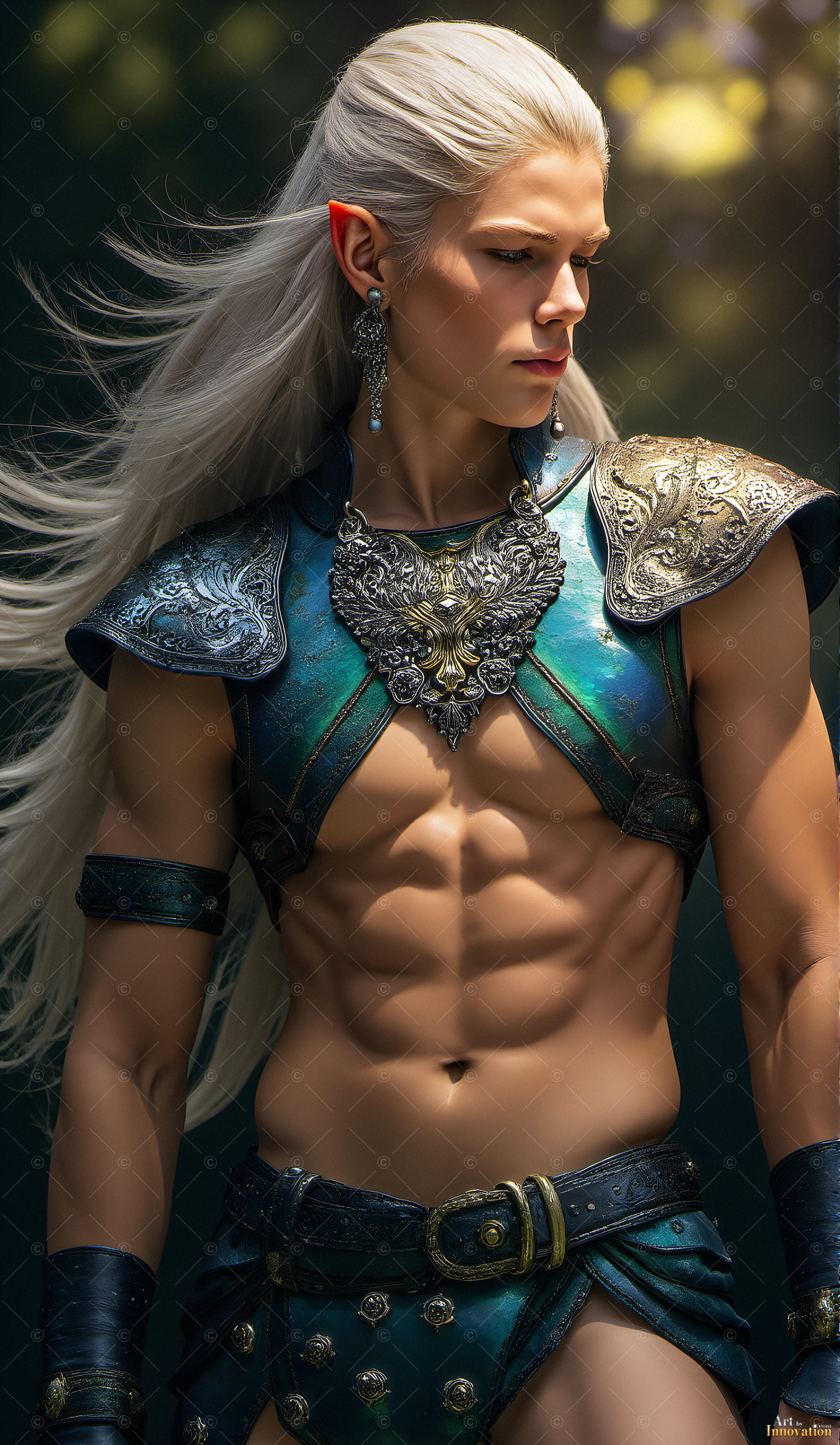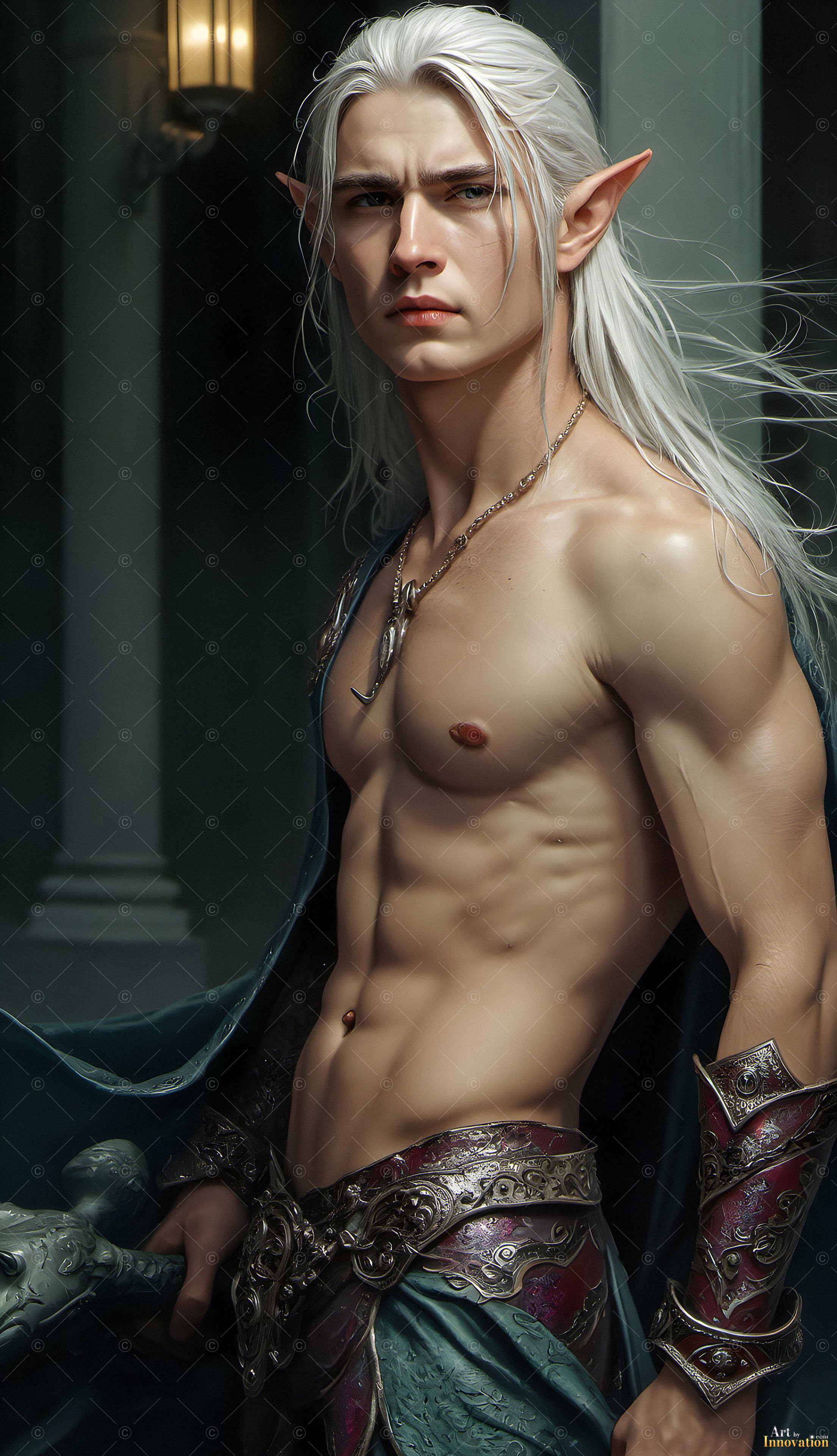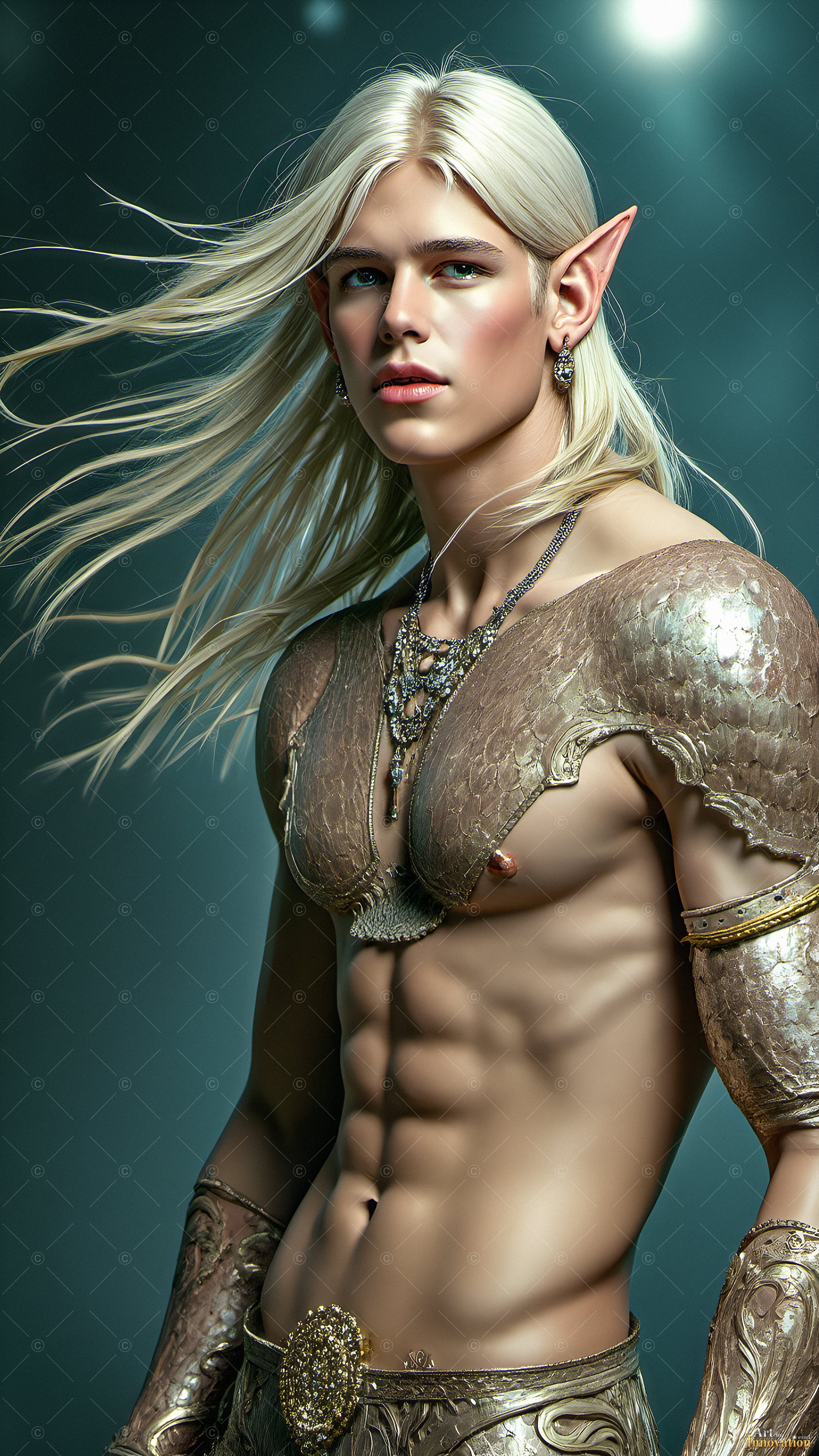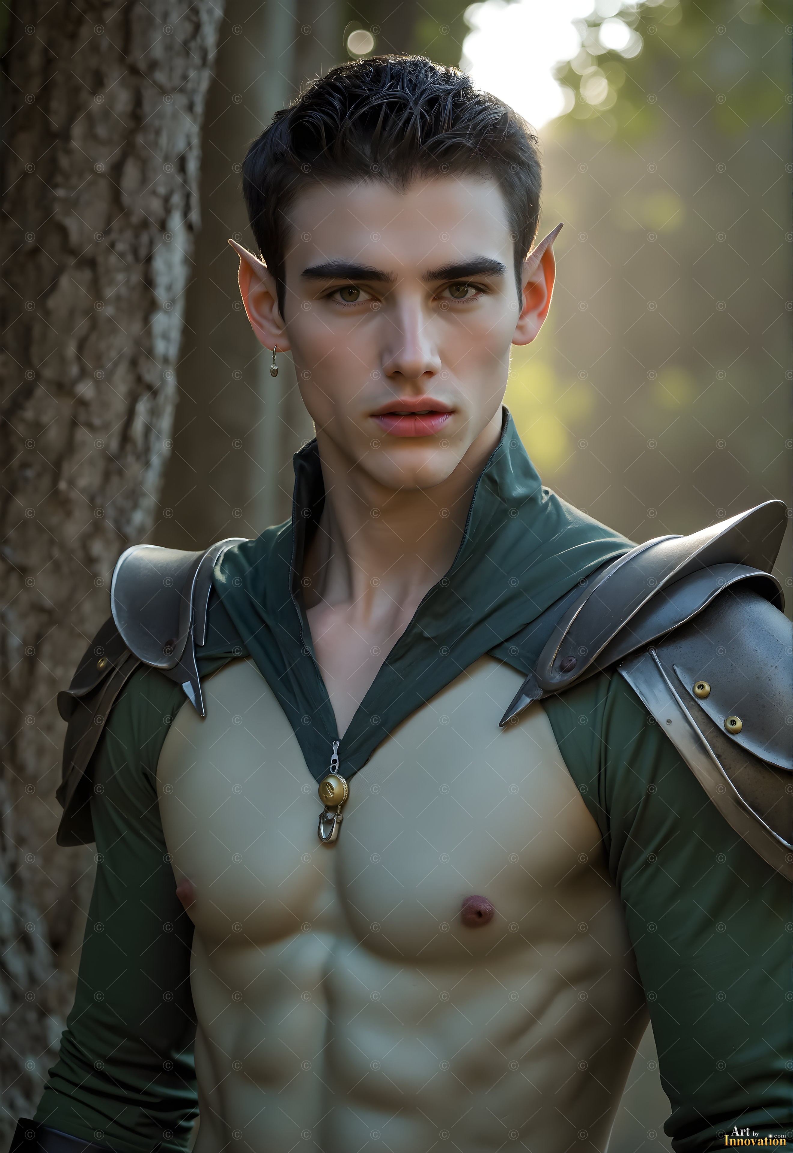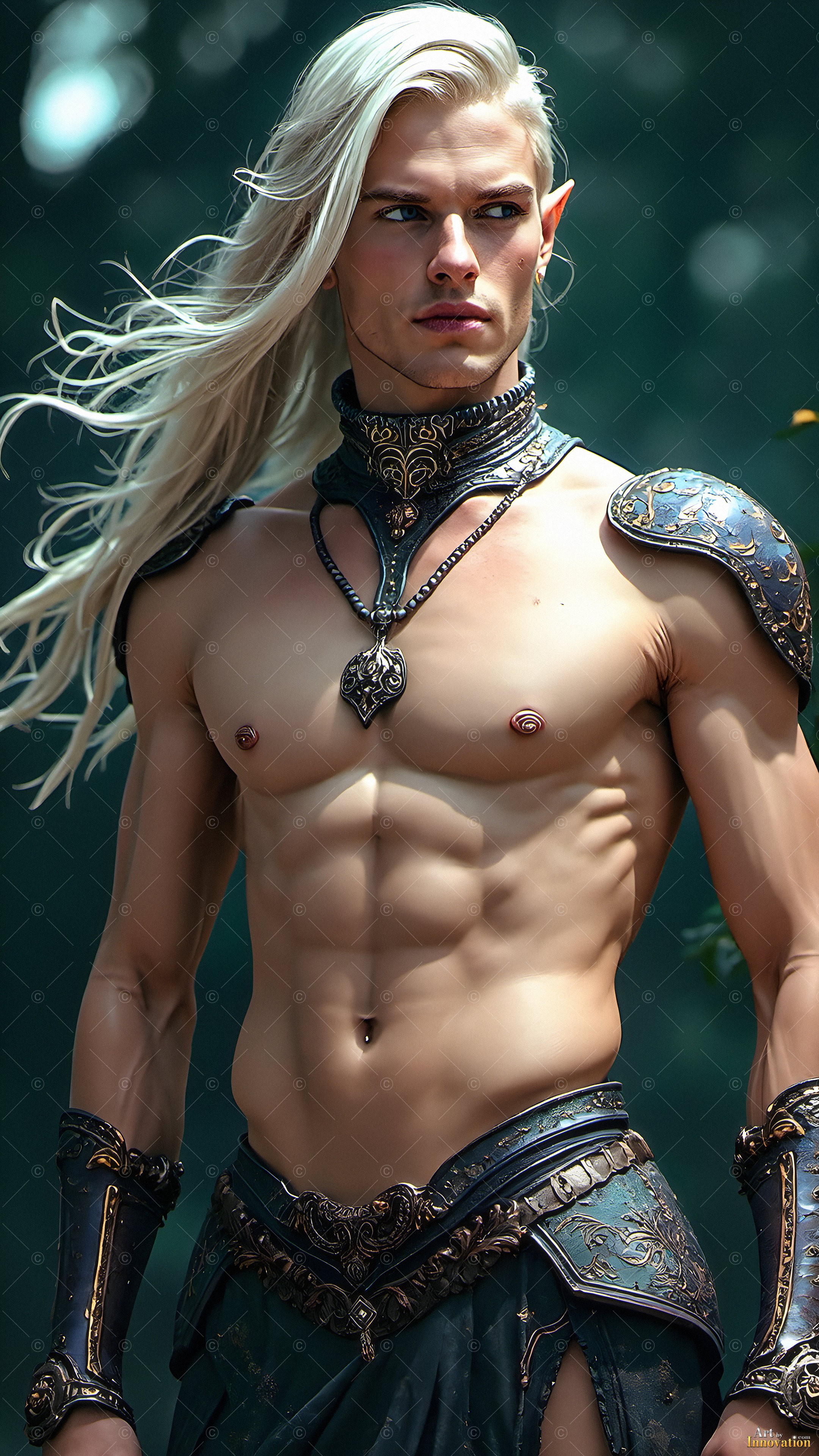 Handsome Male Elves, majestic young male elf standing in an elaborate elven background, in a dark ethereal realm. With pointed ears, wearing glamorous, luxurious, and fierce outfits is an Elven city, full of handsome, and sexy, shirtless elf men, that are adorned with shimmering, iridescent armor.