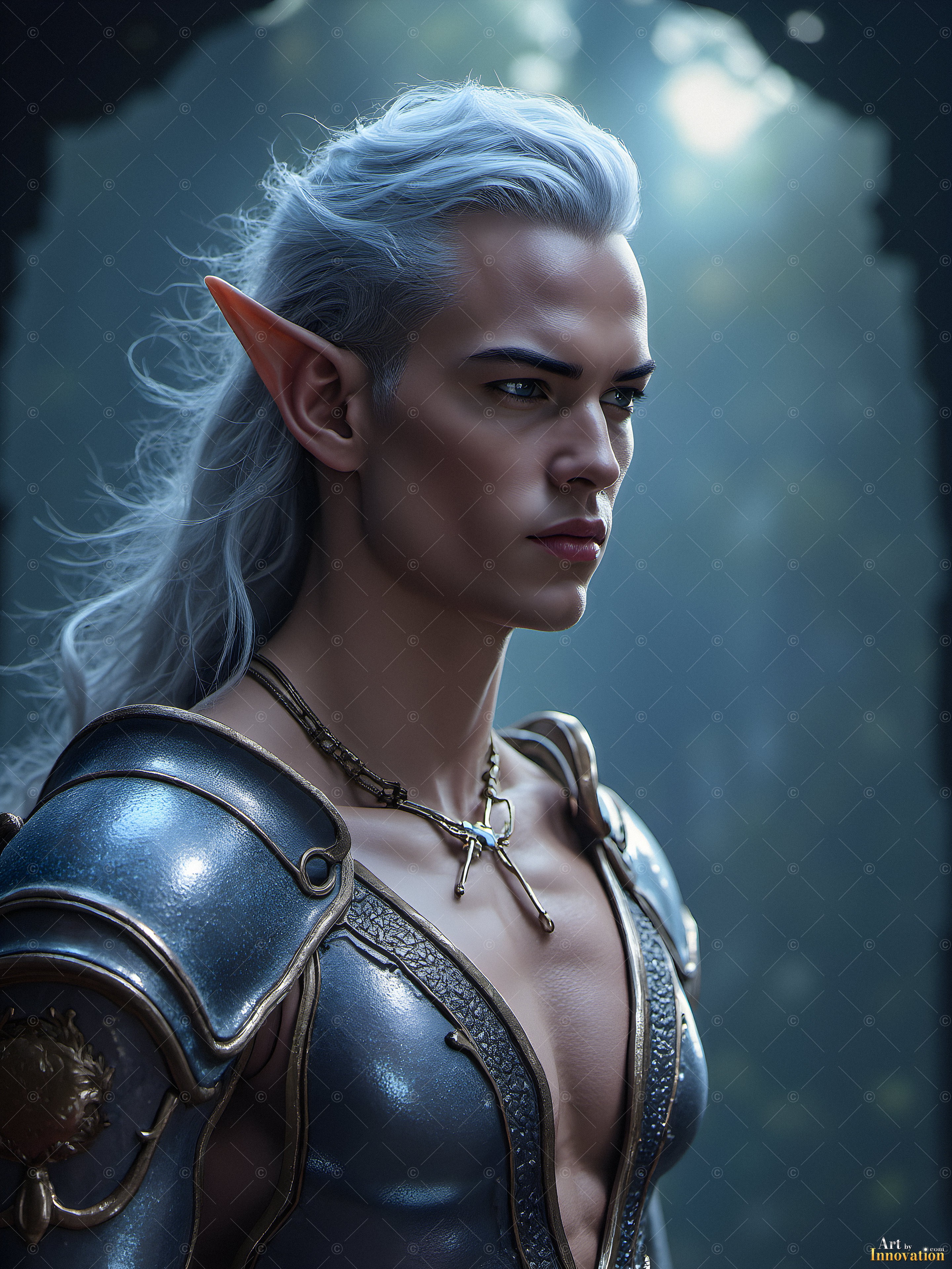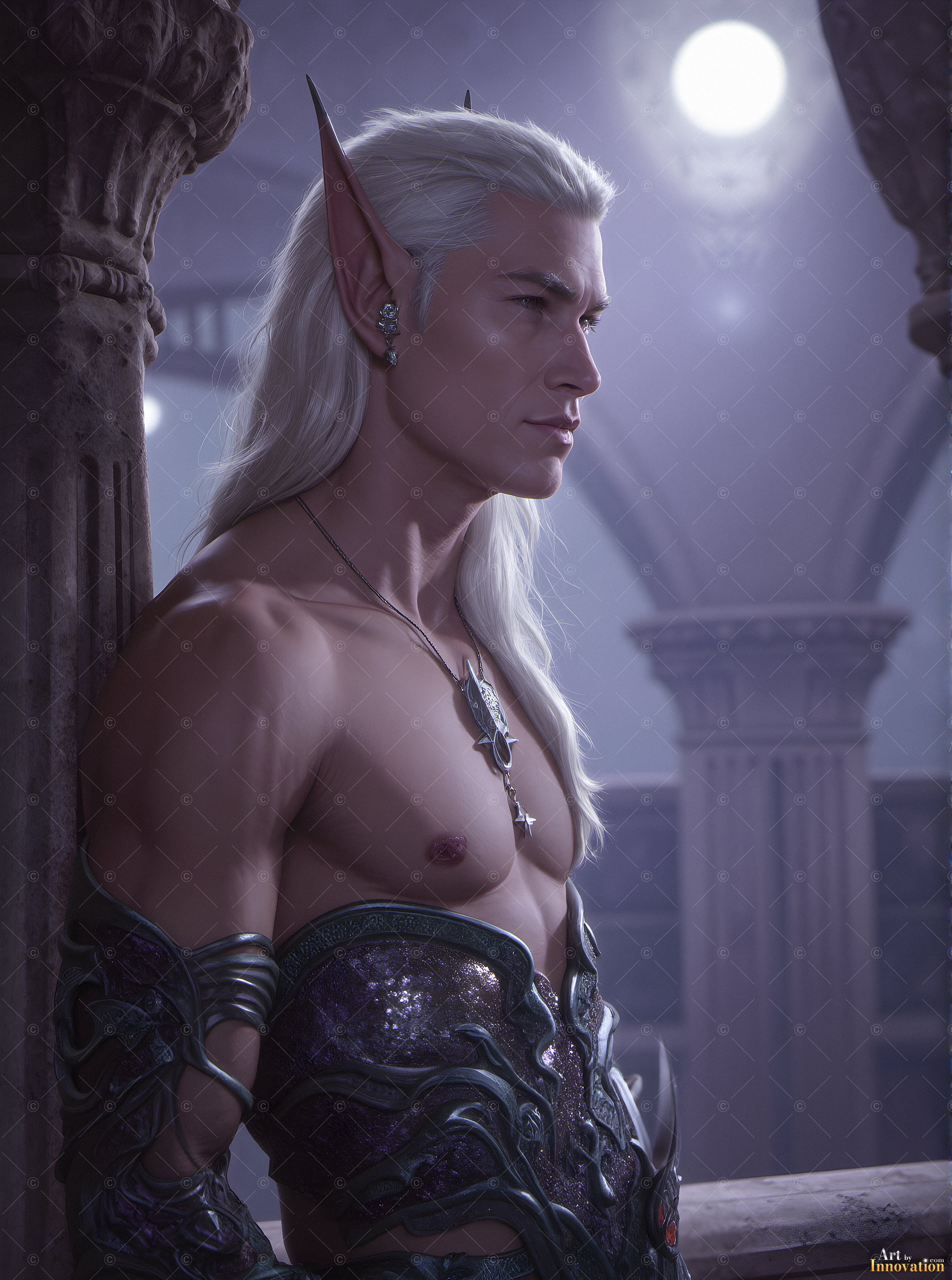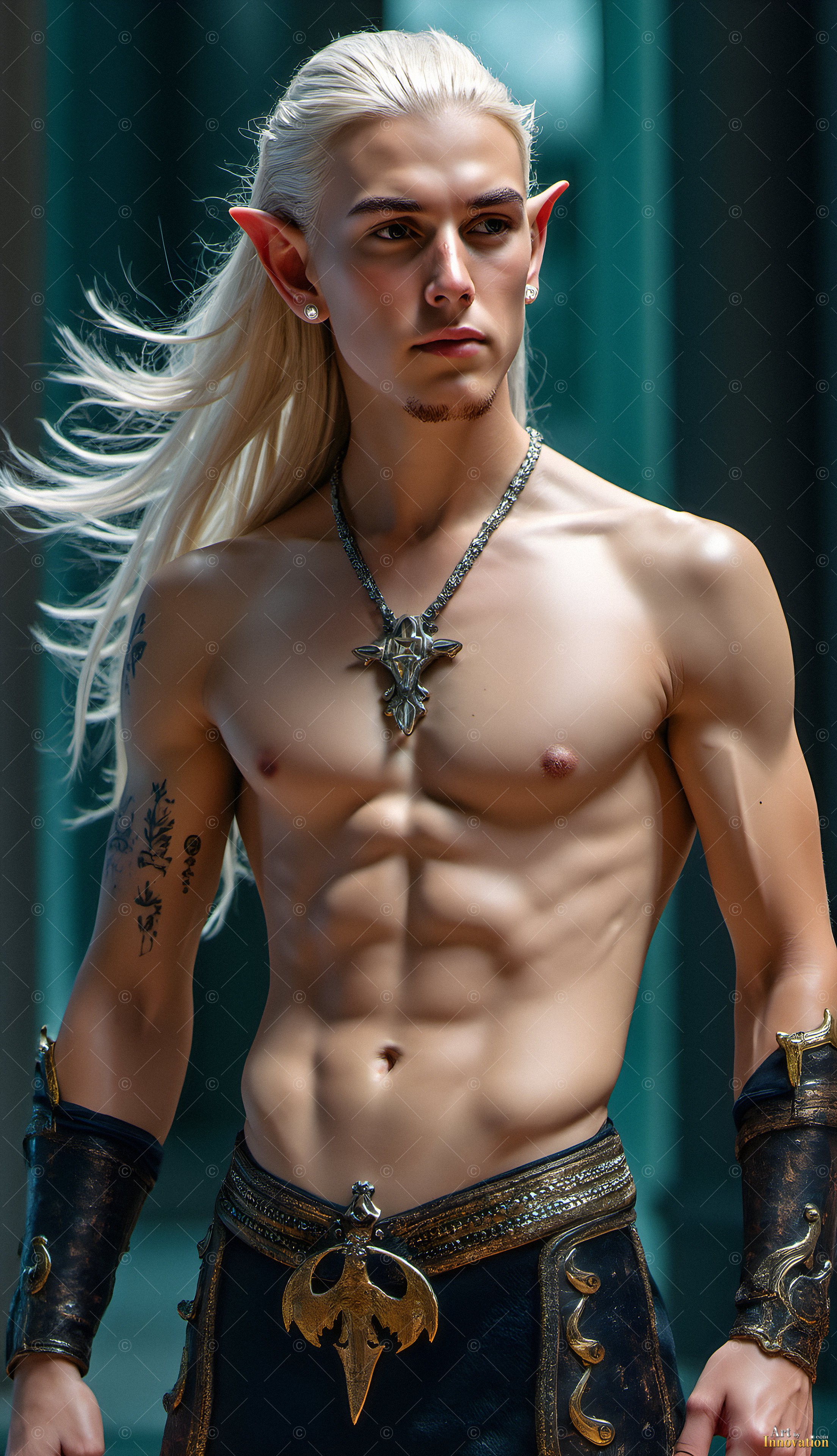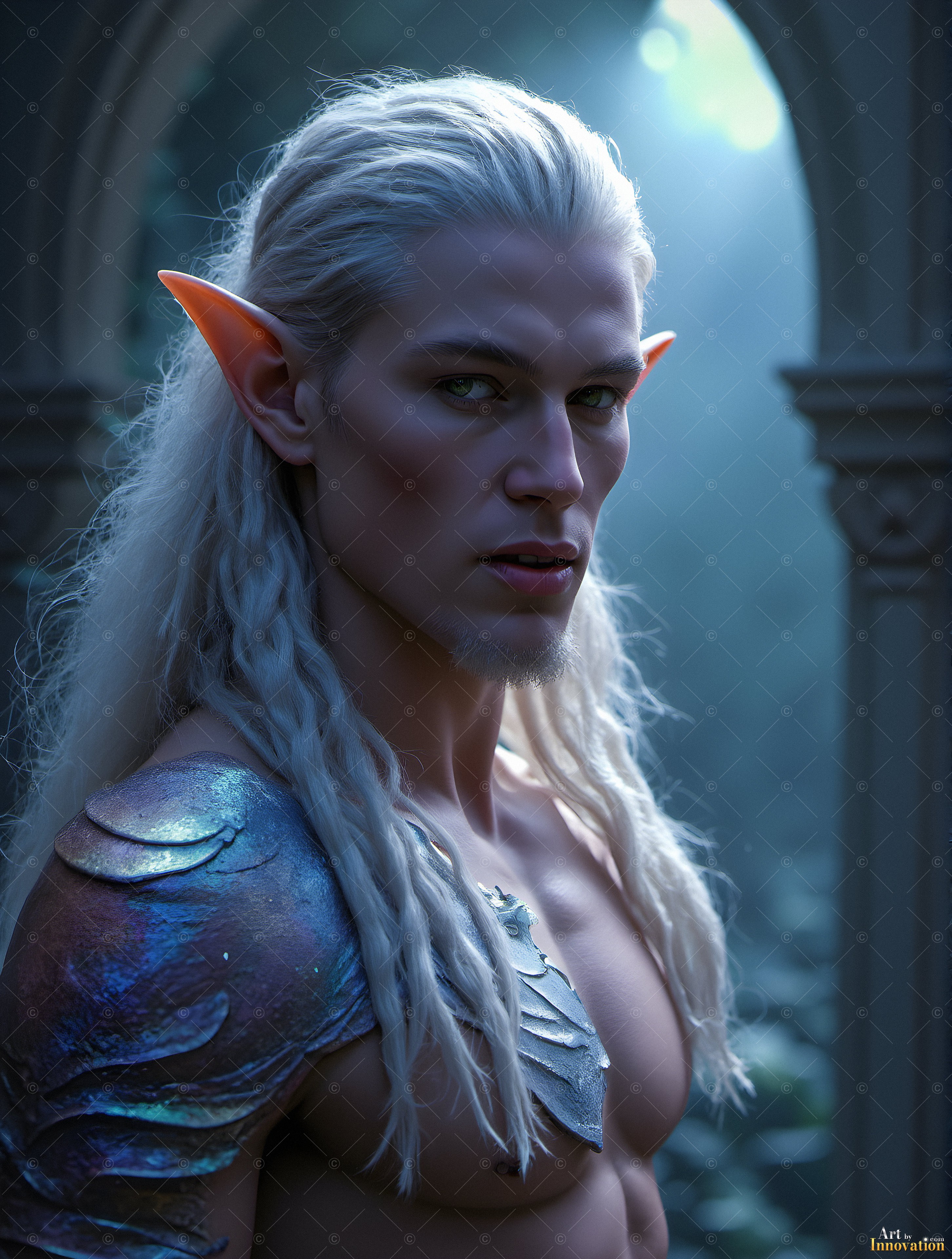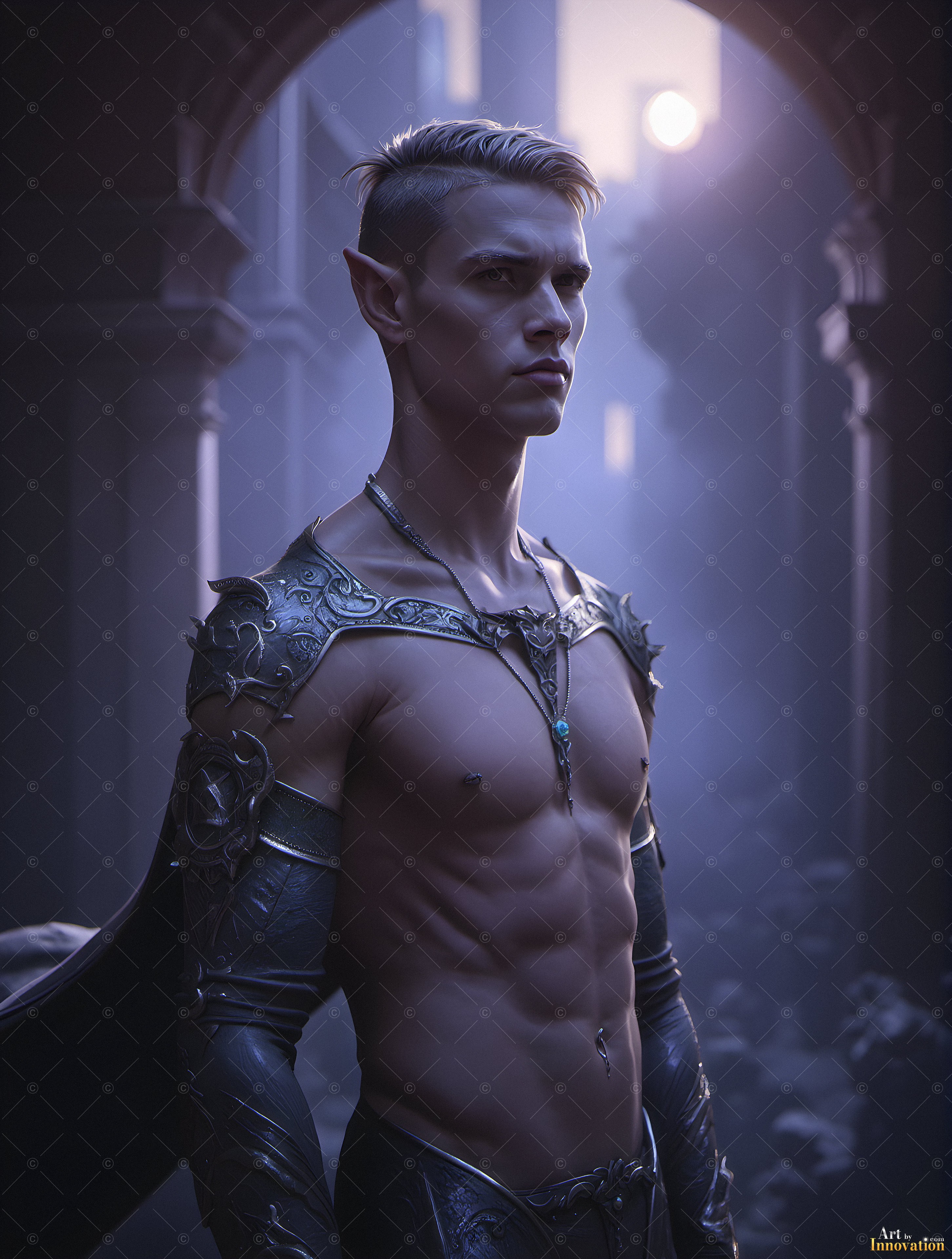 Handsome Male Elves, majestic young male elf standing in an elaborate elven background, in a dark ethereal realm. With pointed ears, wearing glamorous, luxurious, and fierce outfits is an Elven city, full of handsome, and sexy, shirtless elf men, that are adorned with shimmering, iridescent armor.