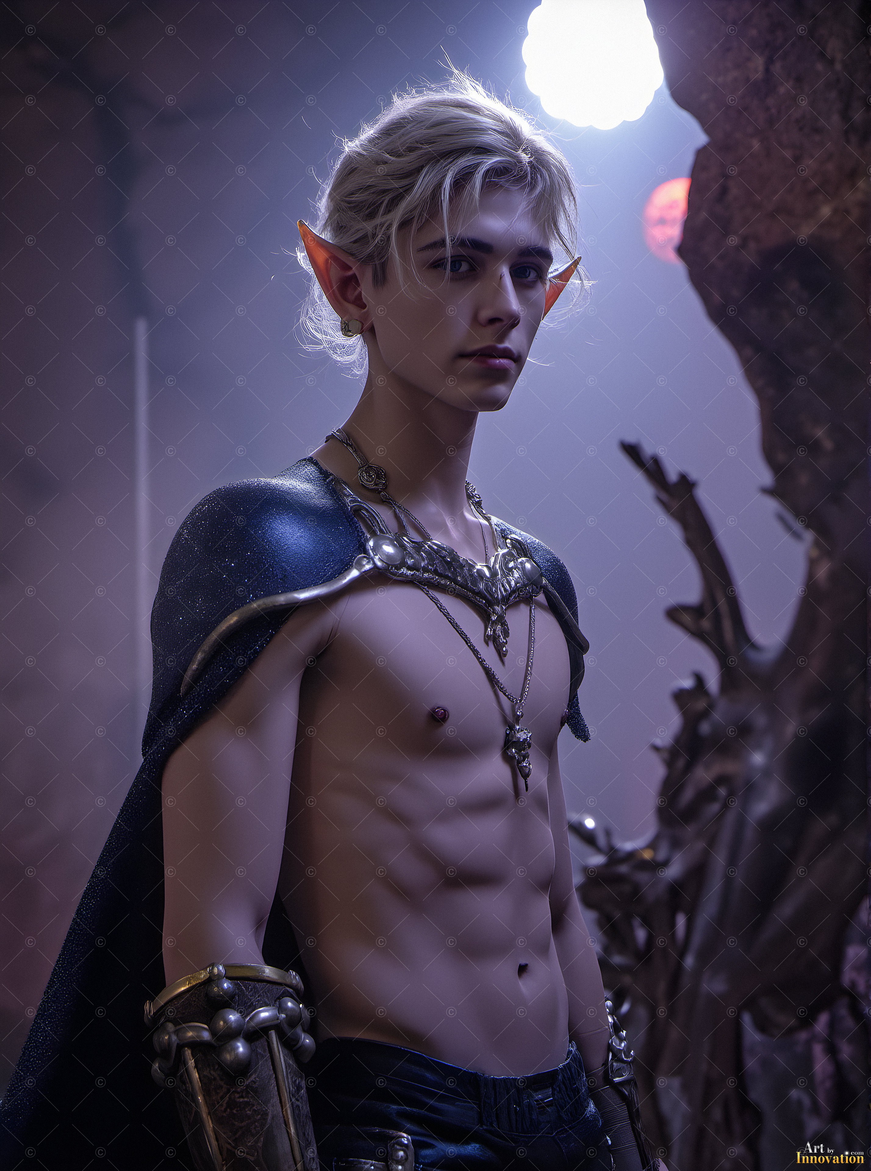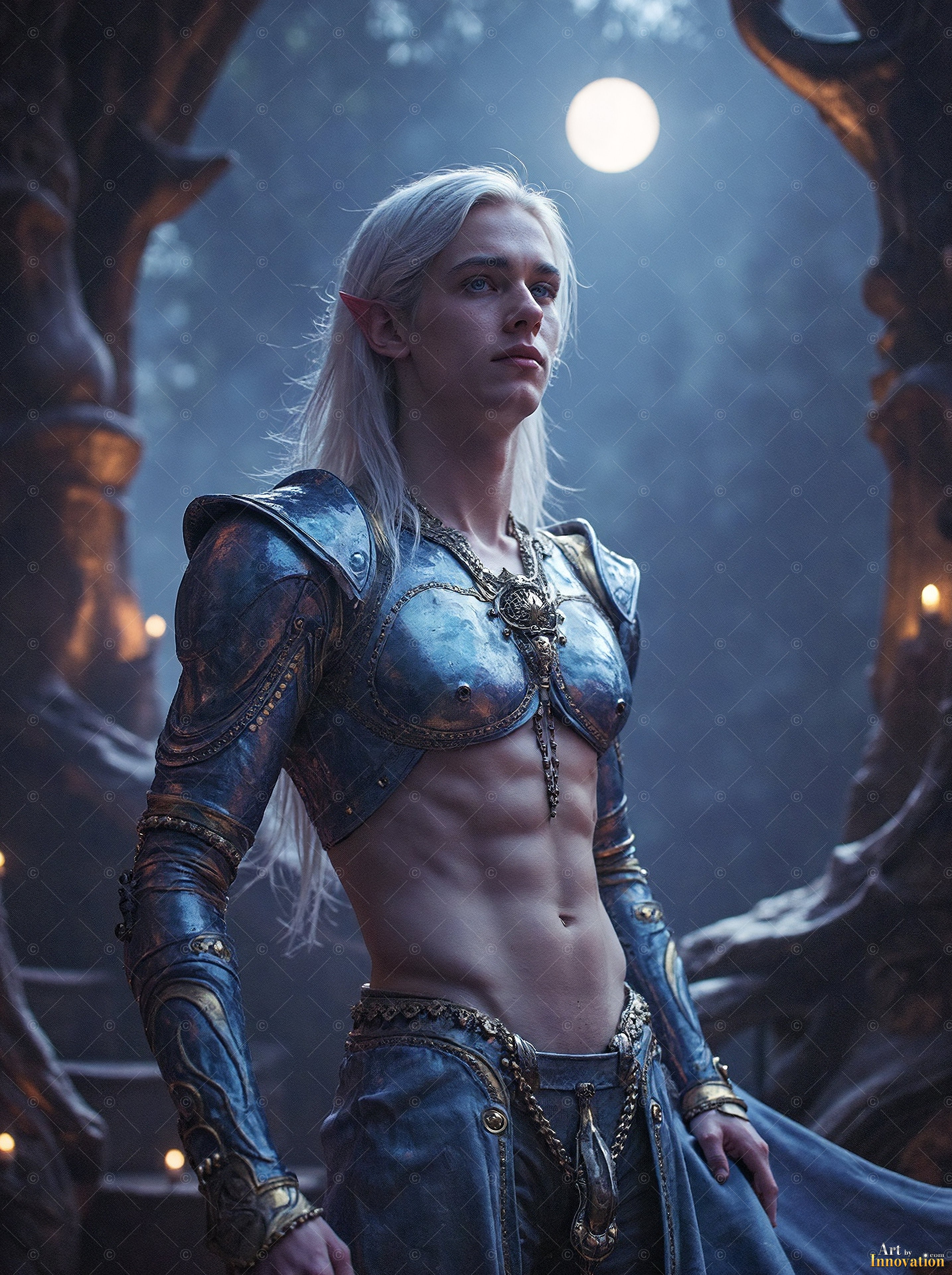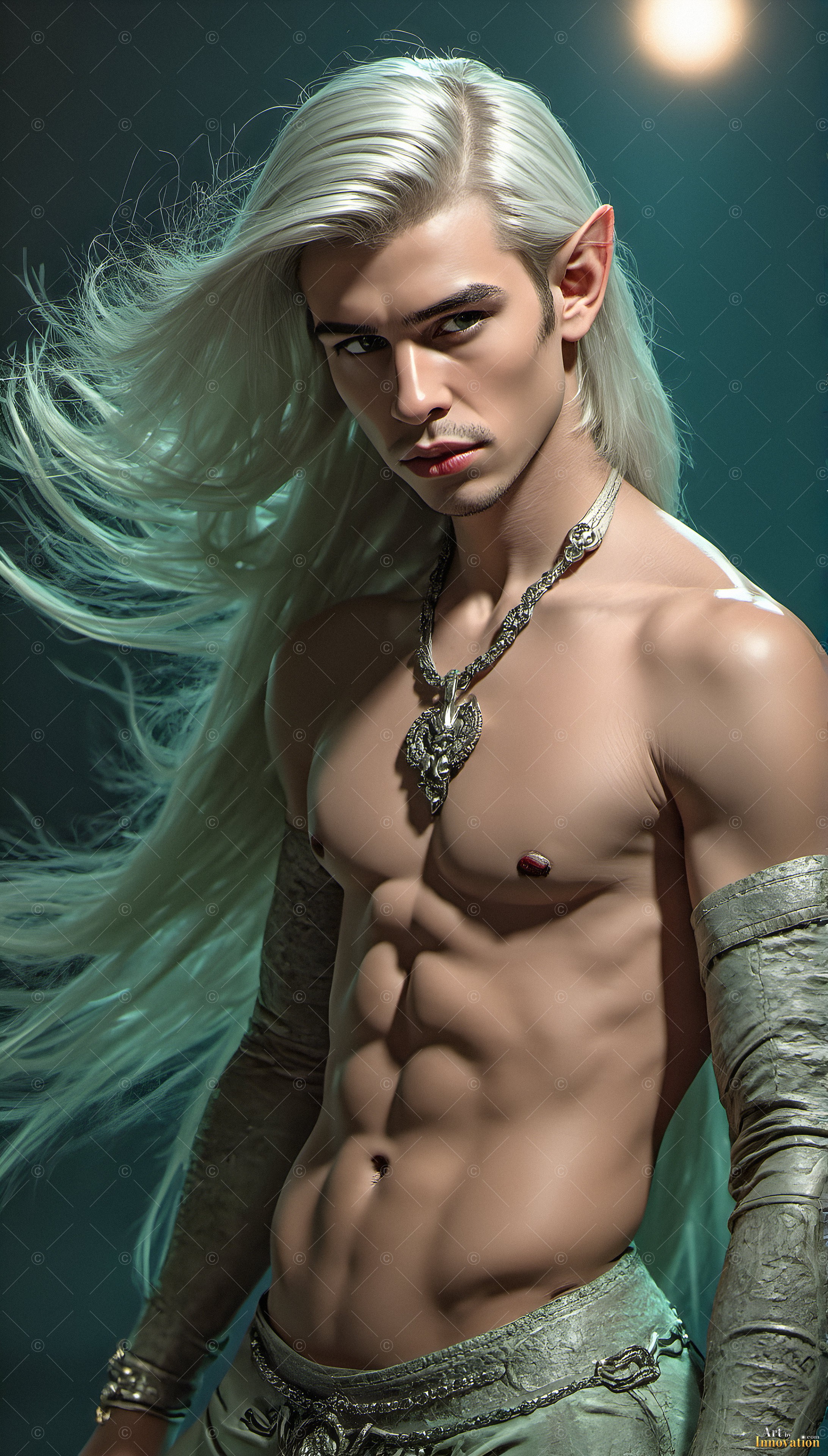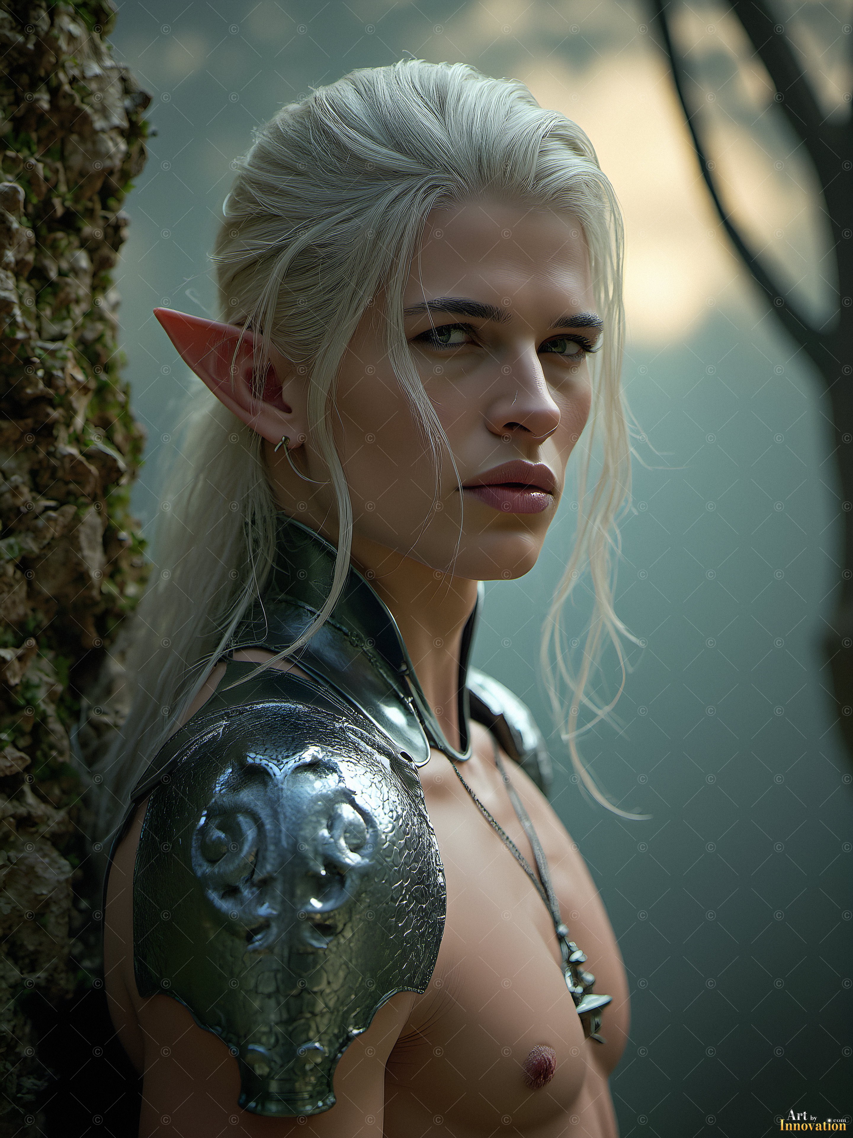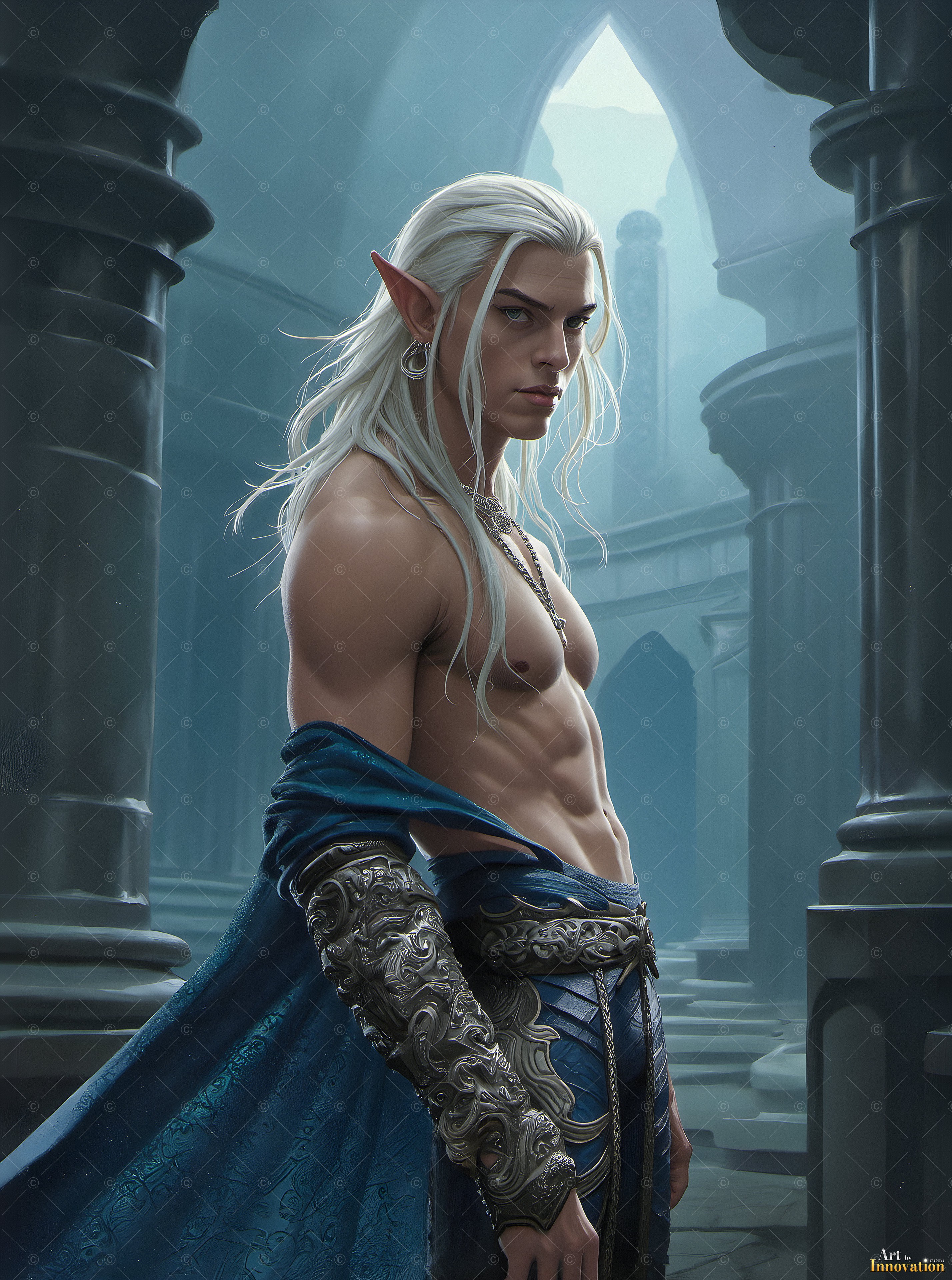 Handsome Male Elves, majestic young male elf standing in an elaborate elven background, in a dark ethereal realm. With pointed ears, wearing glamorous, luxurious, and fierce outfits is an Elven city, full of handsome, and sexy, shirtless elf men, that are adorned with shimmering, iridescent armor.