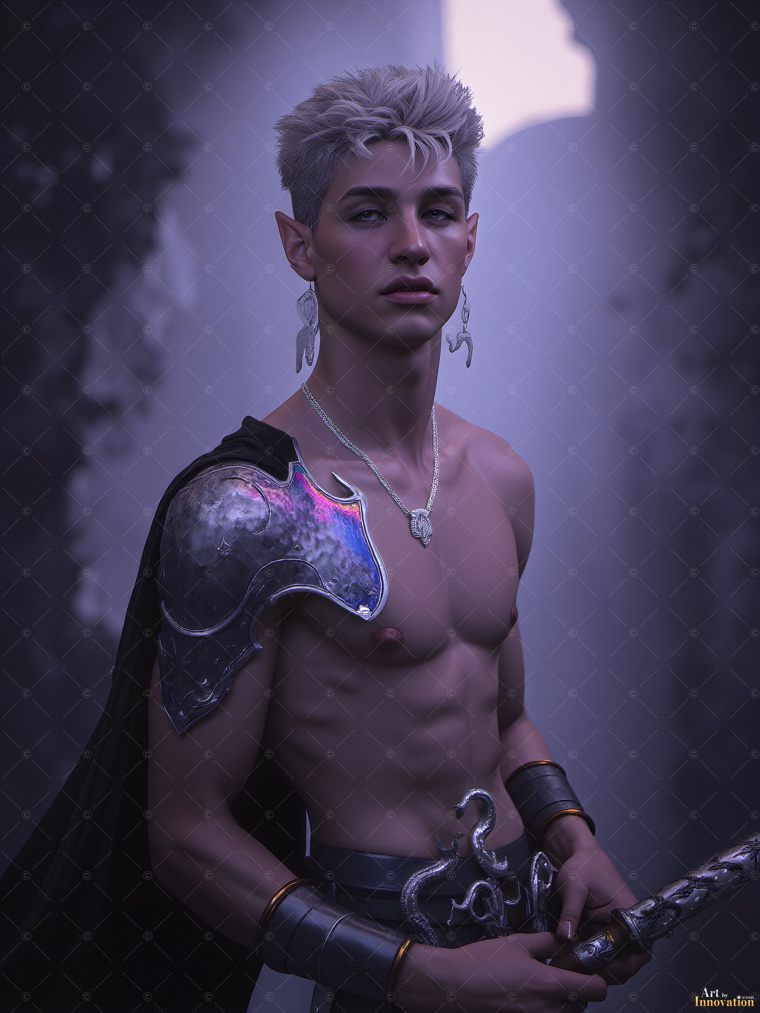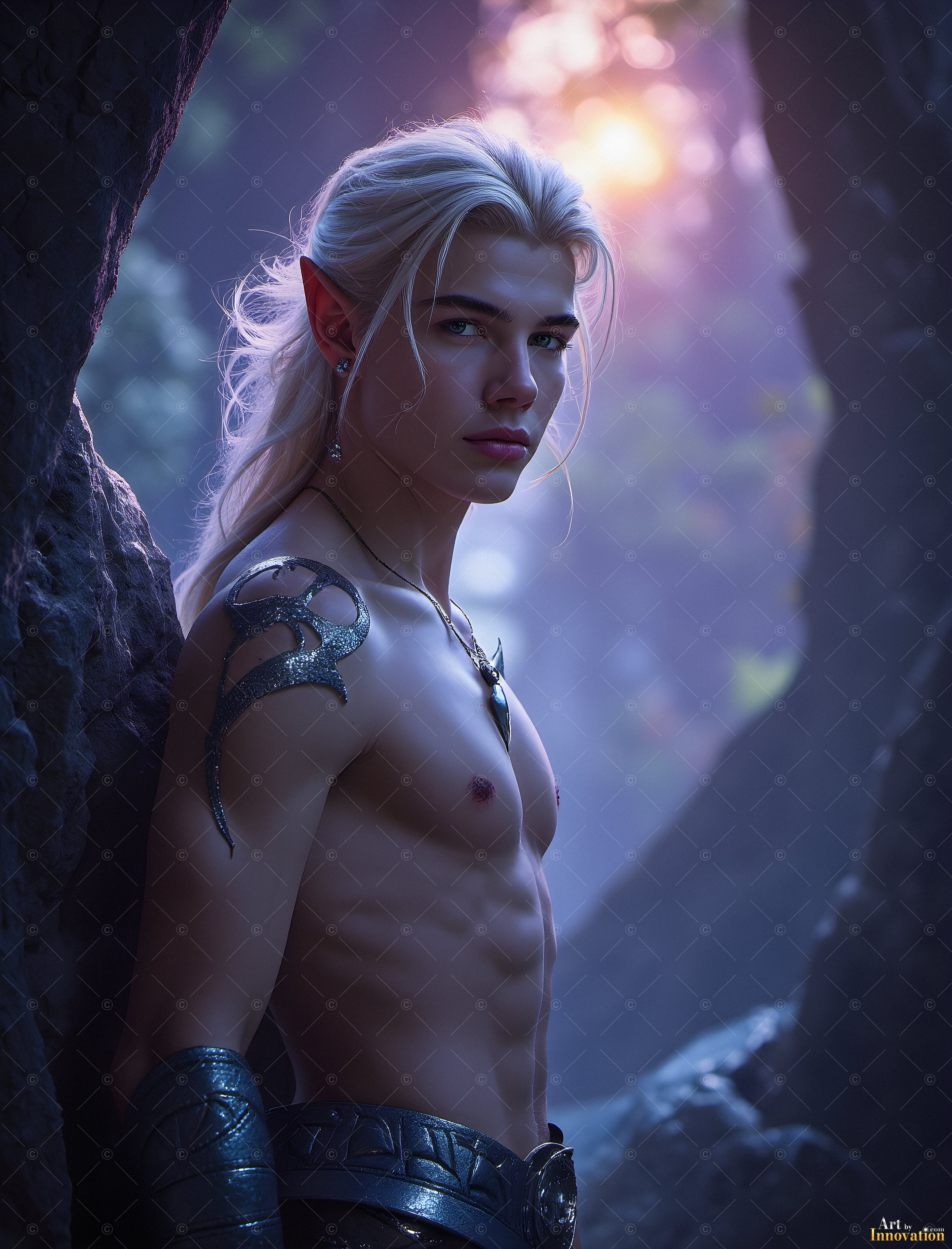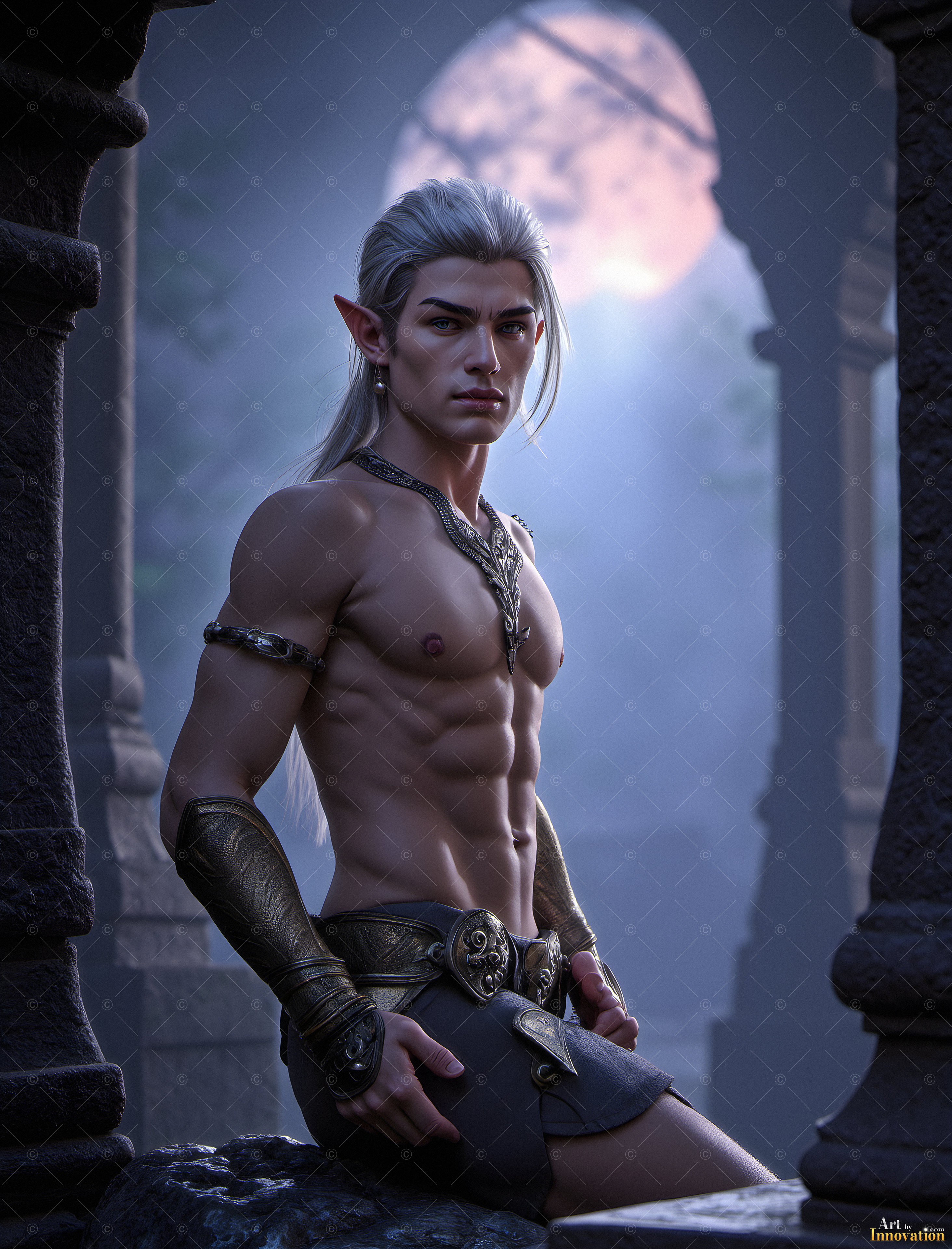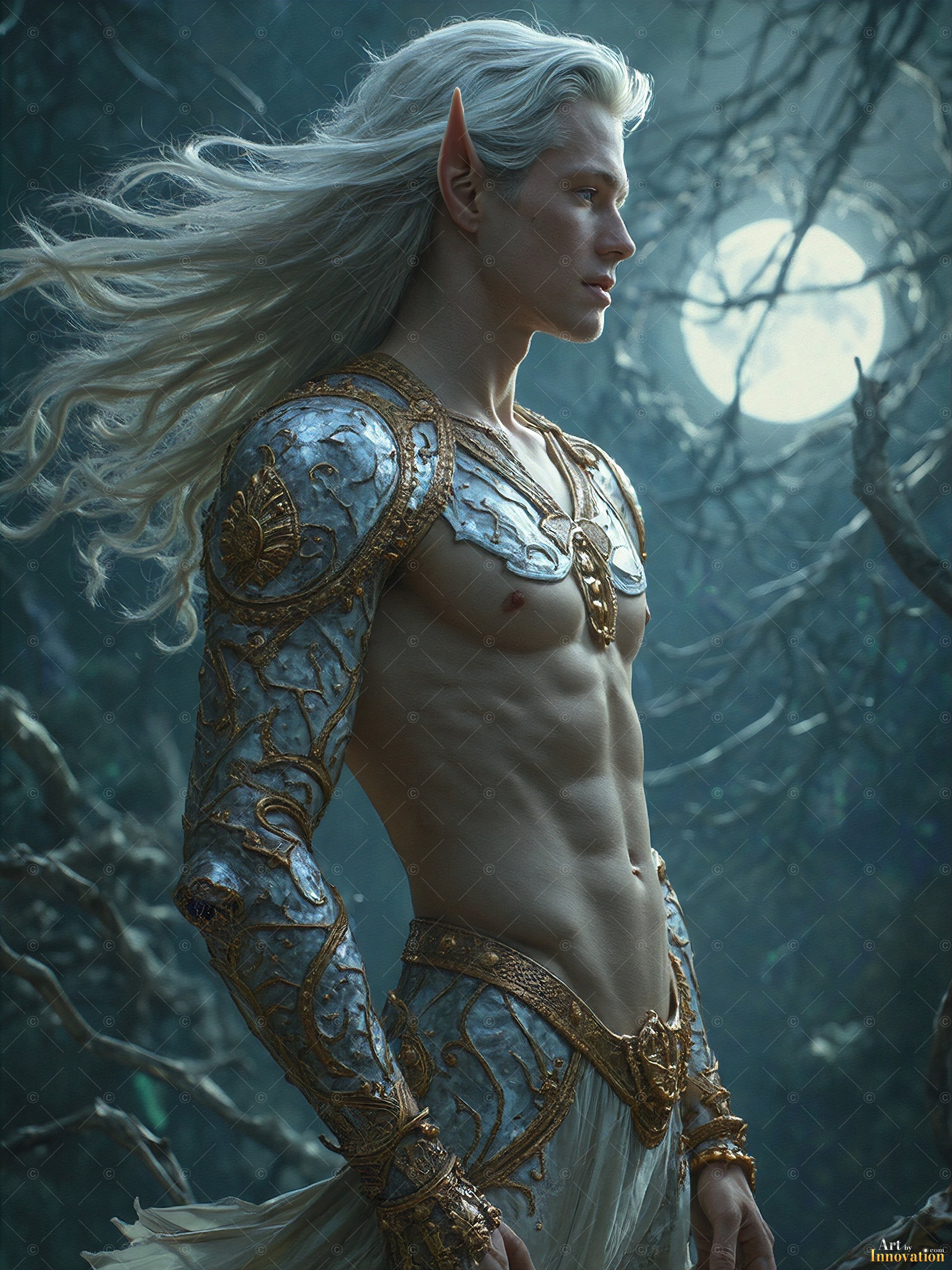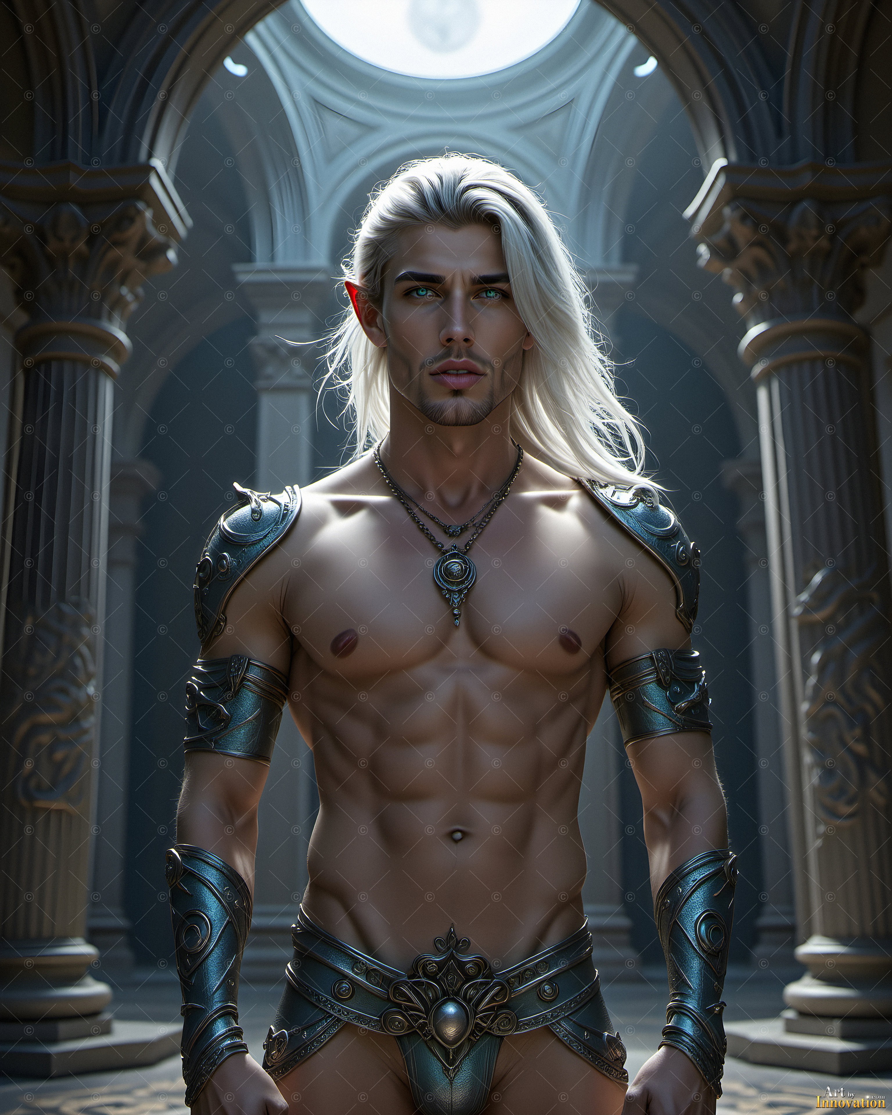 Handsome Male Elves, majestic young male elf standing in an elaborate elven background, in a dark ethereal realm. With pointed ears, wearing glamorous, luxurious, and fierce outfits is an Elven city, full of handsome, and sexy, shirtless elf men, that are adorned with shimmering, iridescent armor.