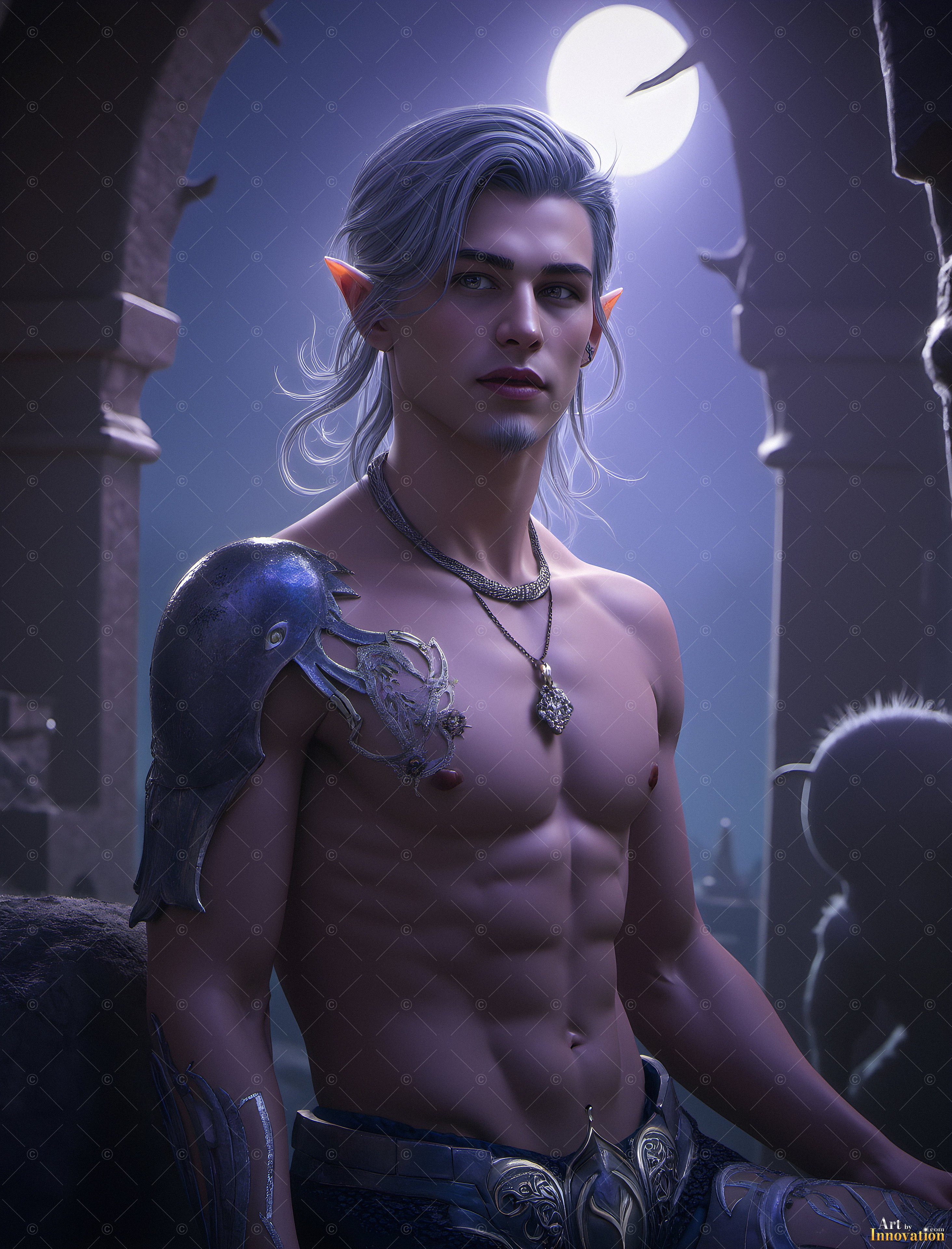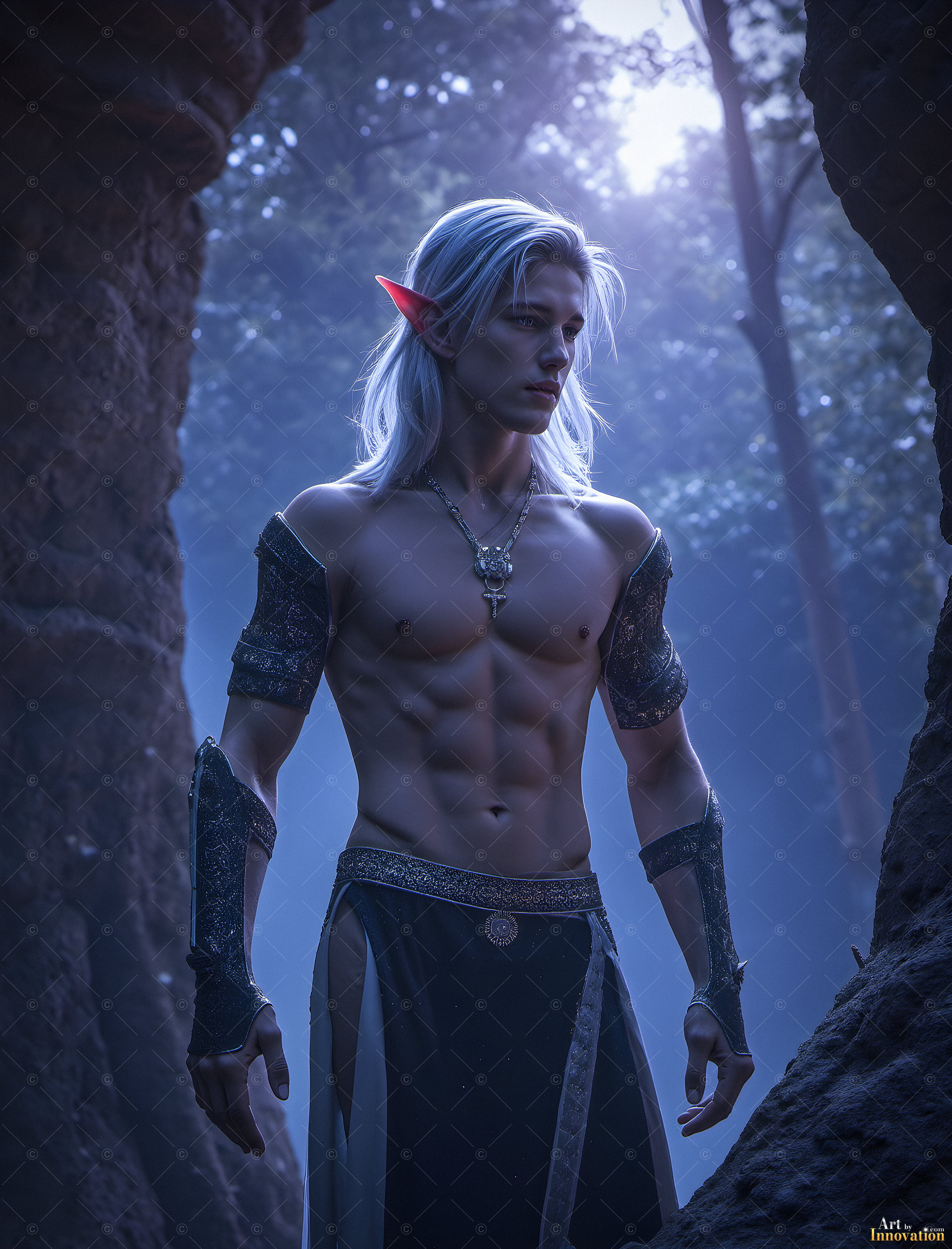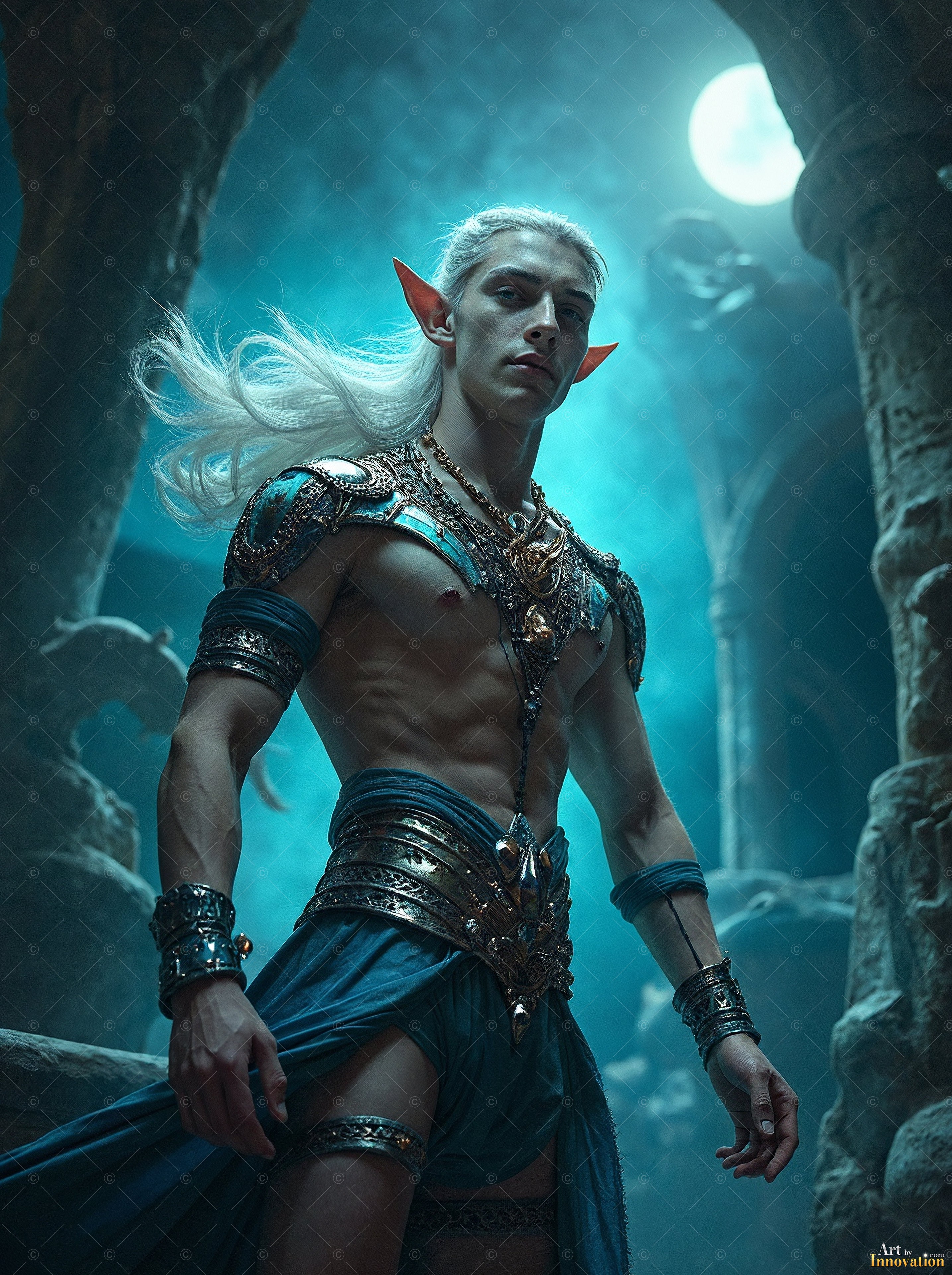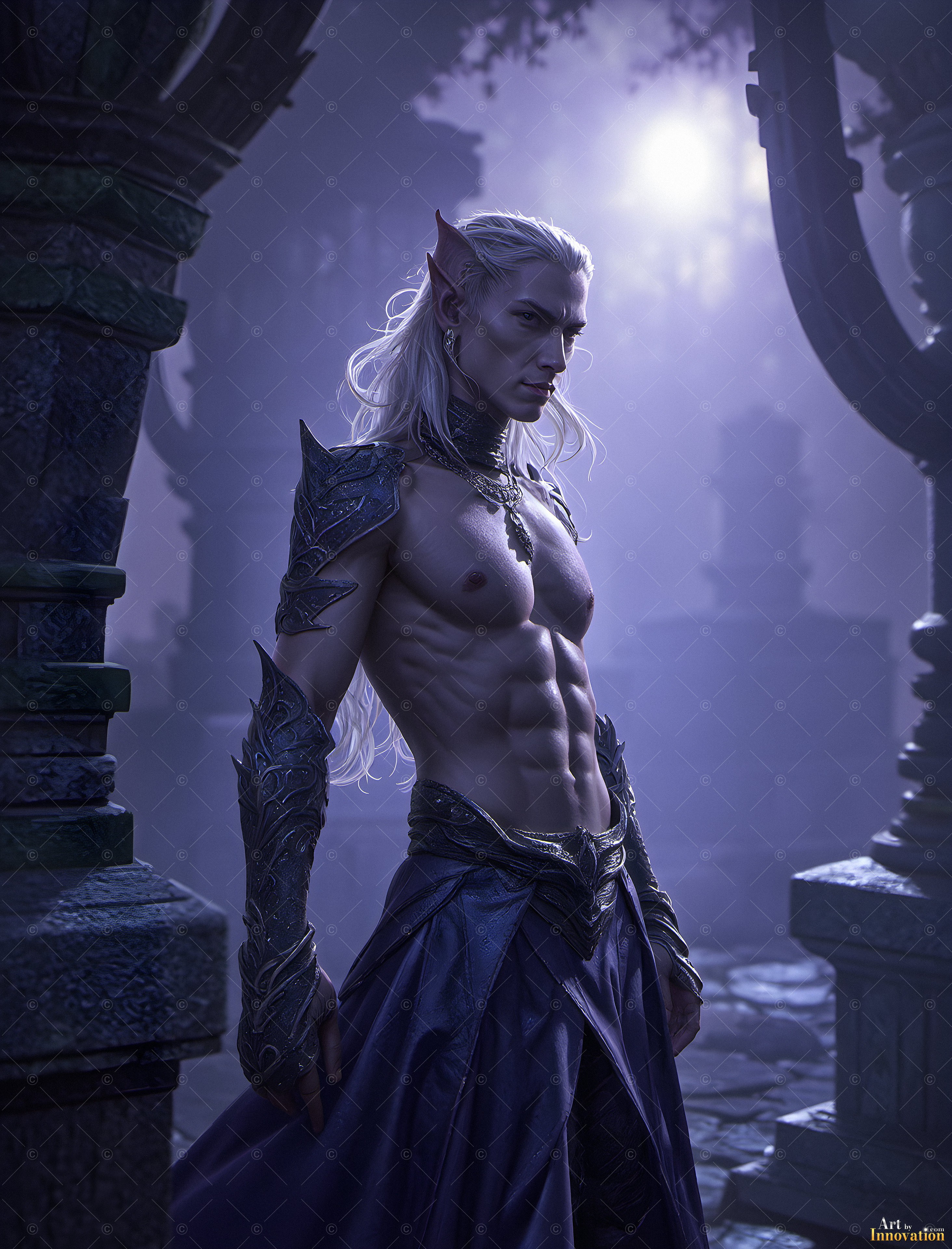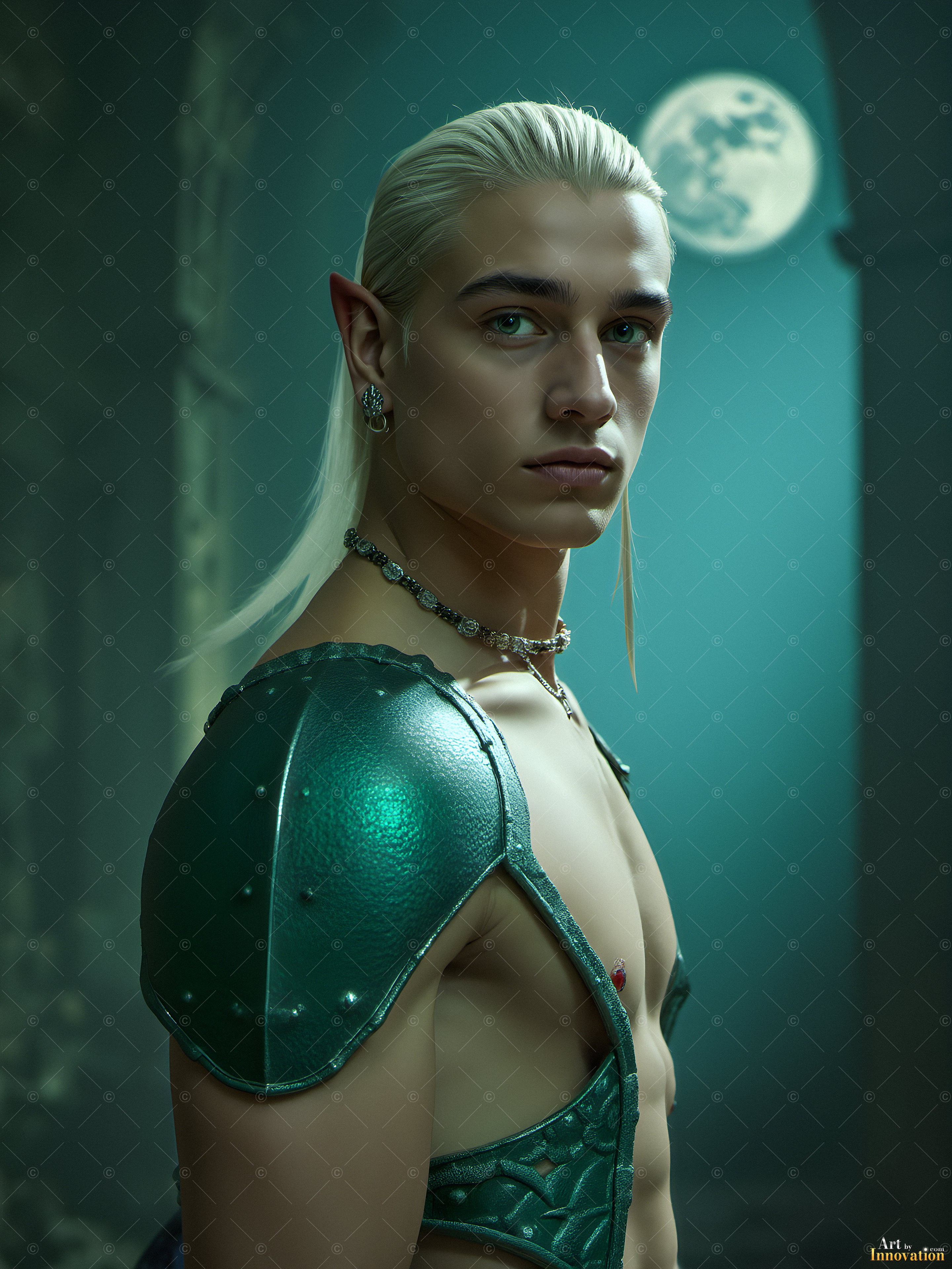Handsome Male Elves, majestic young male elf standing in an elaborate elven background, in a dark ethereal realm. With pointed ears, wearing glamorous, luxurious, and fierce outfits is an Elven city, full of handsome, and sexy, shirtless elf men, that are adorned with shimmering, iridescent armor.