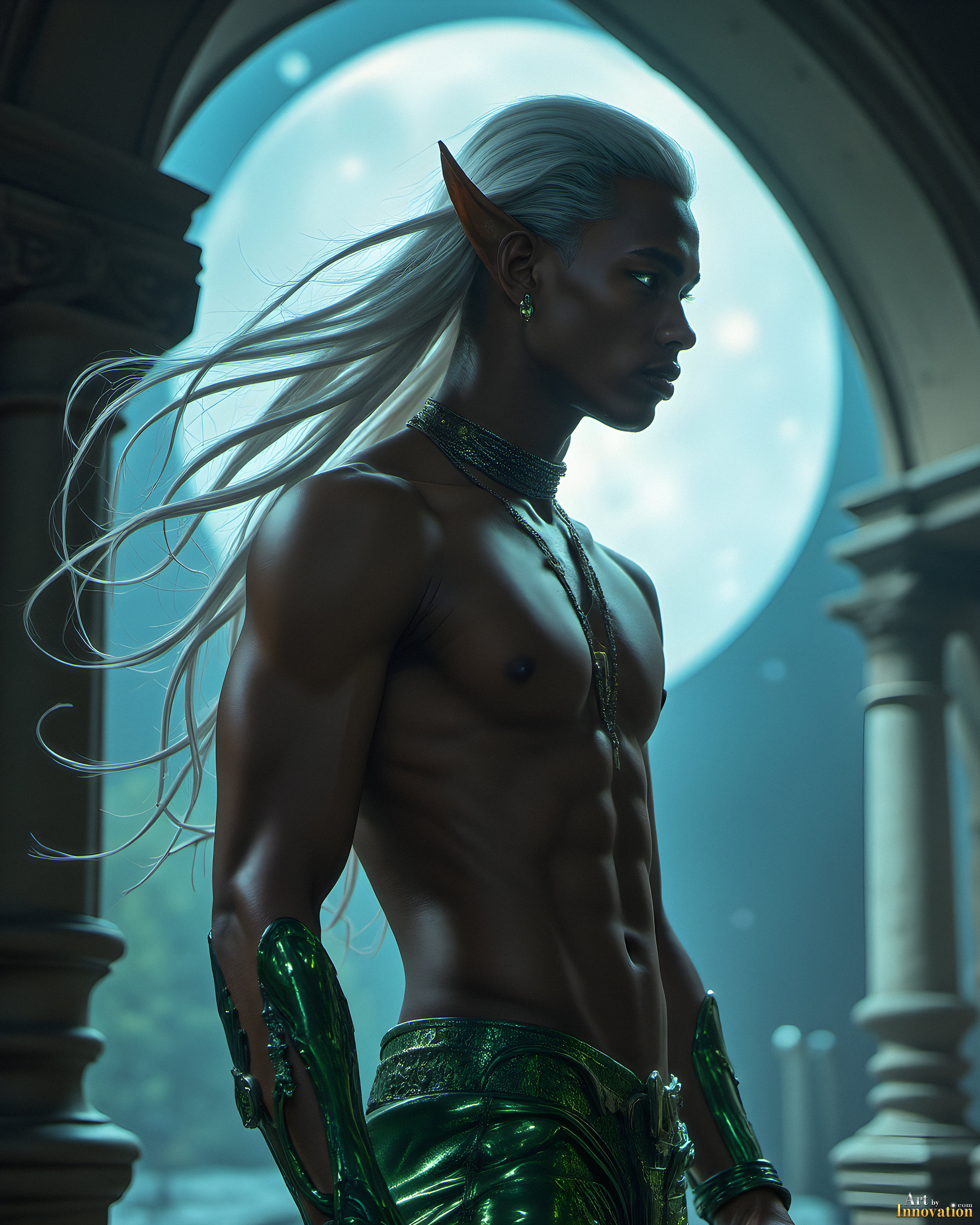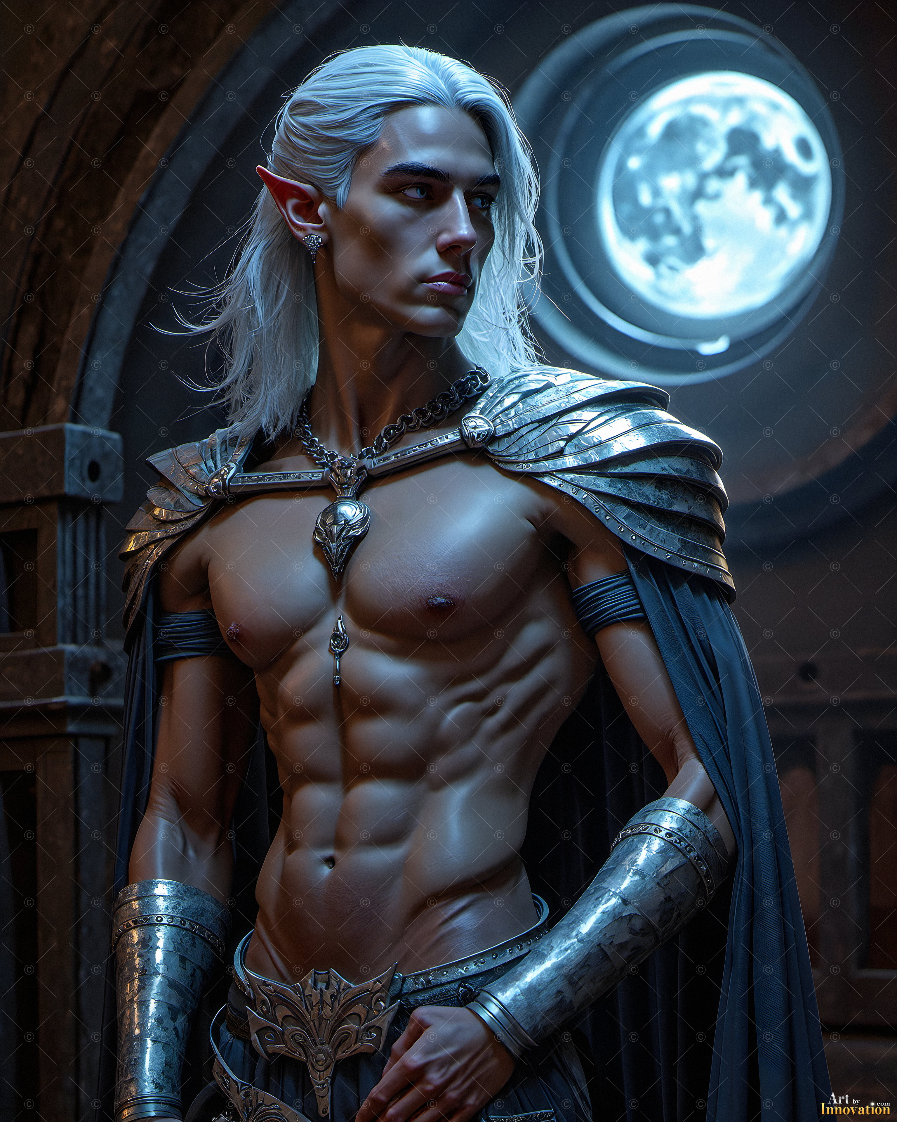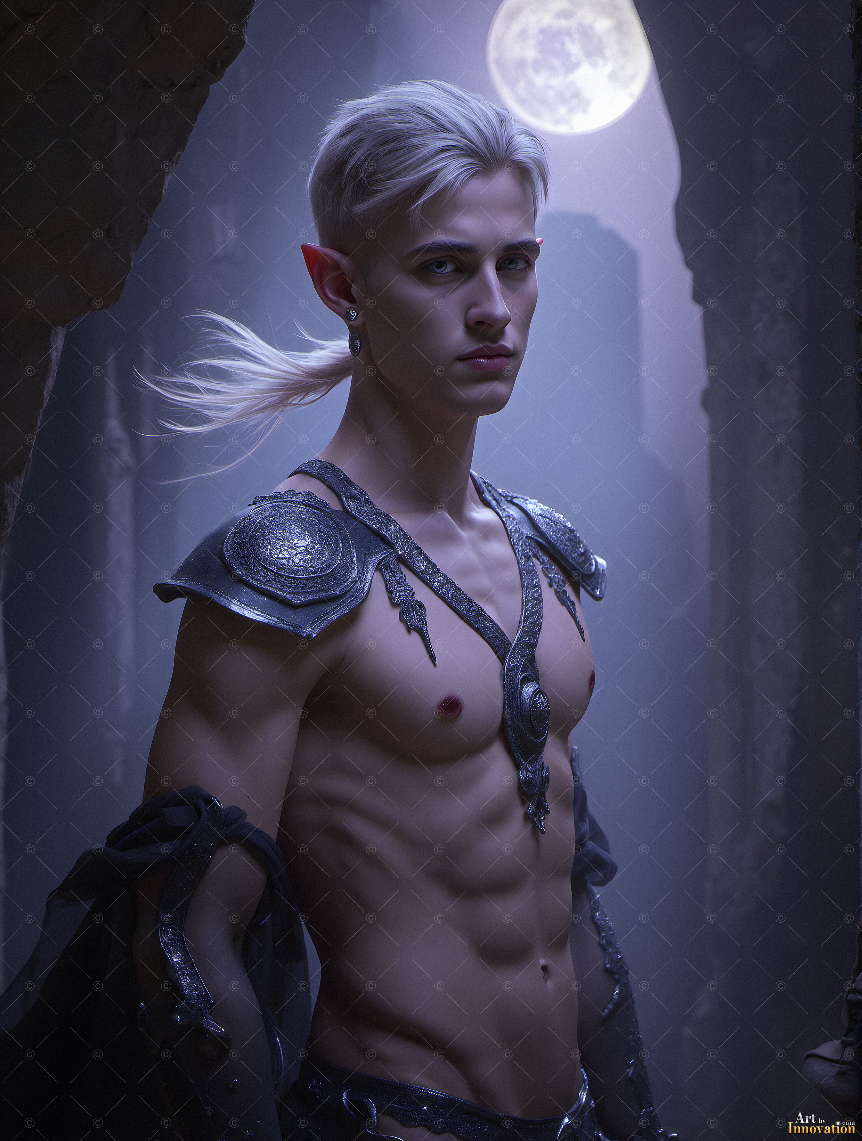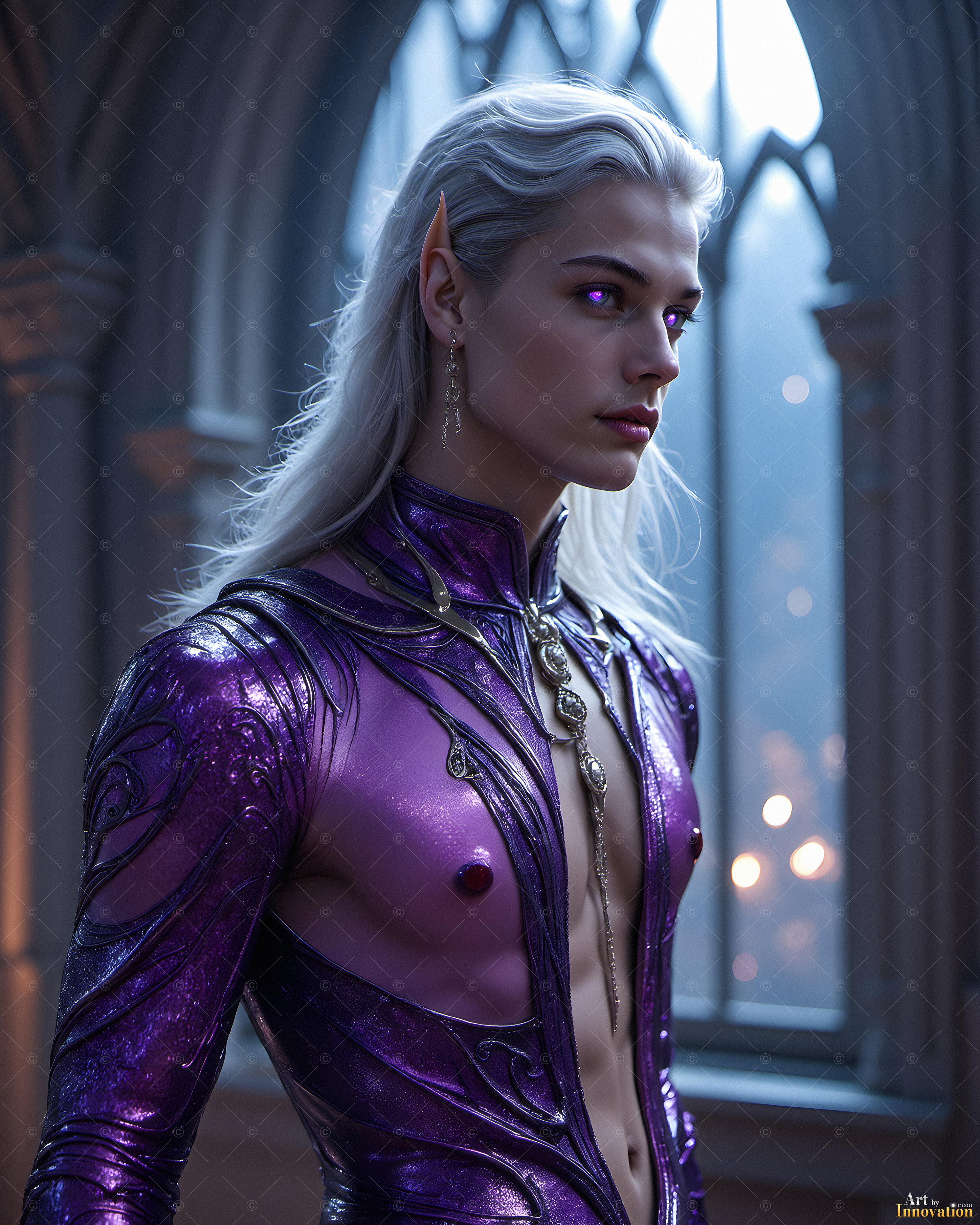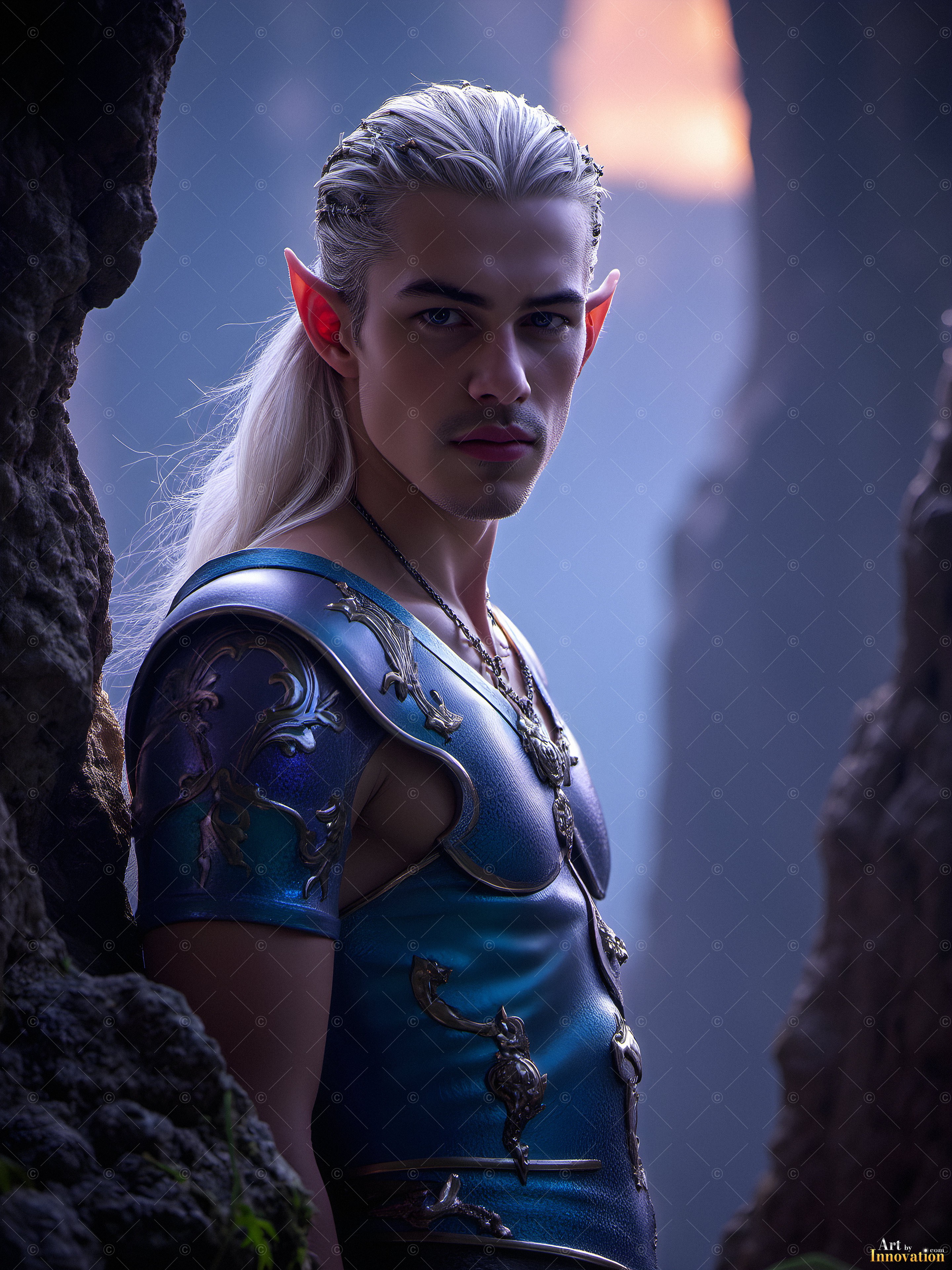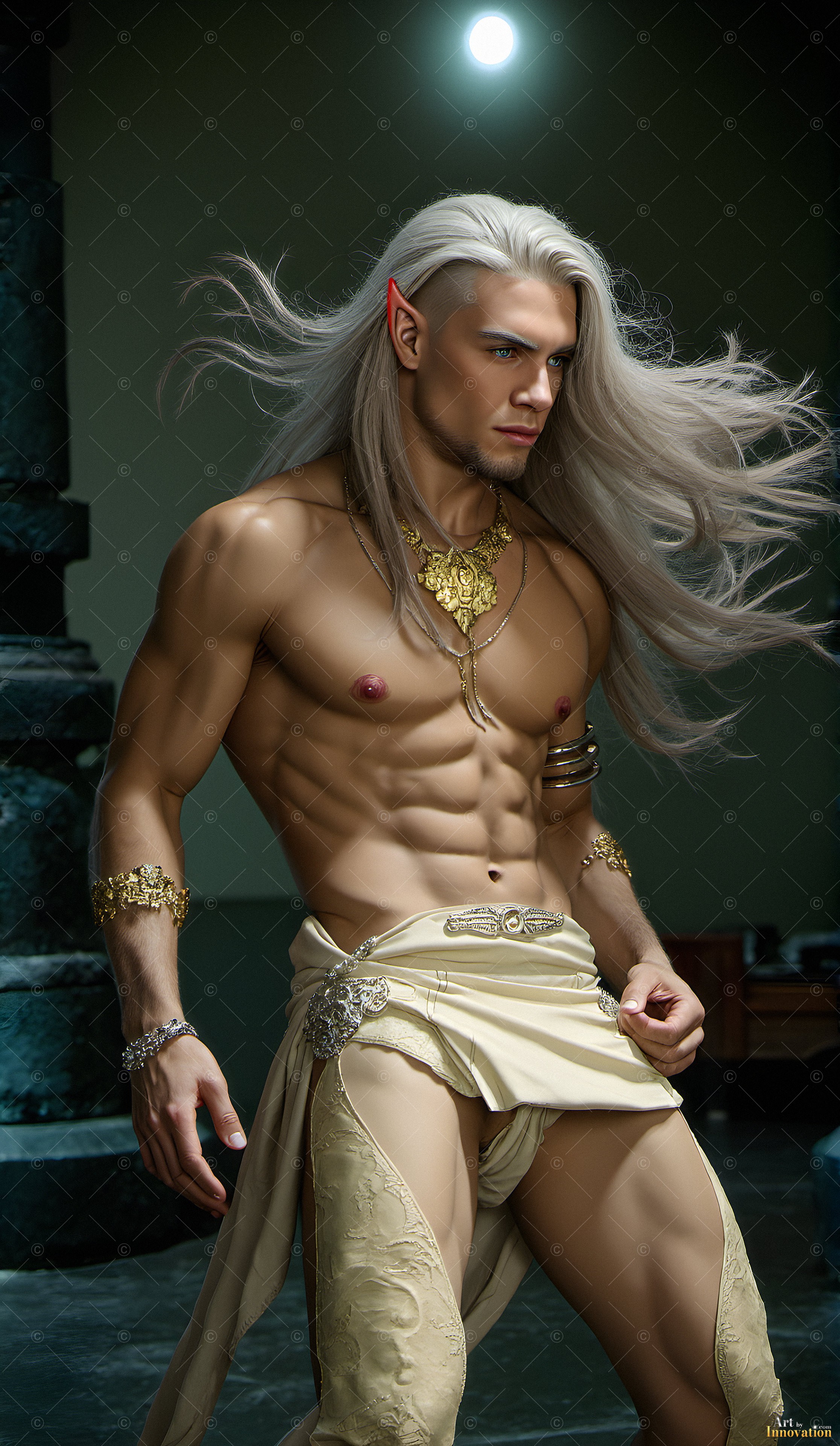 Handsome Male Elves, majestic young male elf standing in an elaborate elven background, in a dark ethereal realm. With pointed ears, wearing glamorous, luxurious, and fierce outfits is an Elven city, full of handsome, and sexy, shirtless elf men, that are adorned with shimmering, iridescent armor.