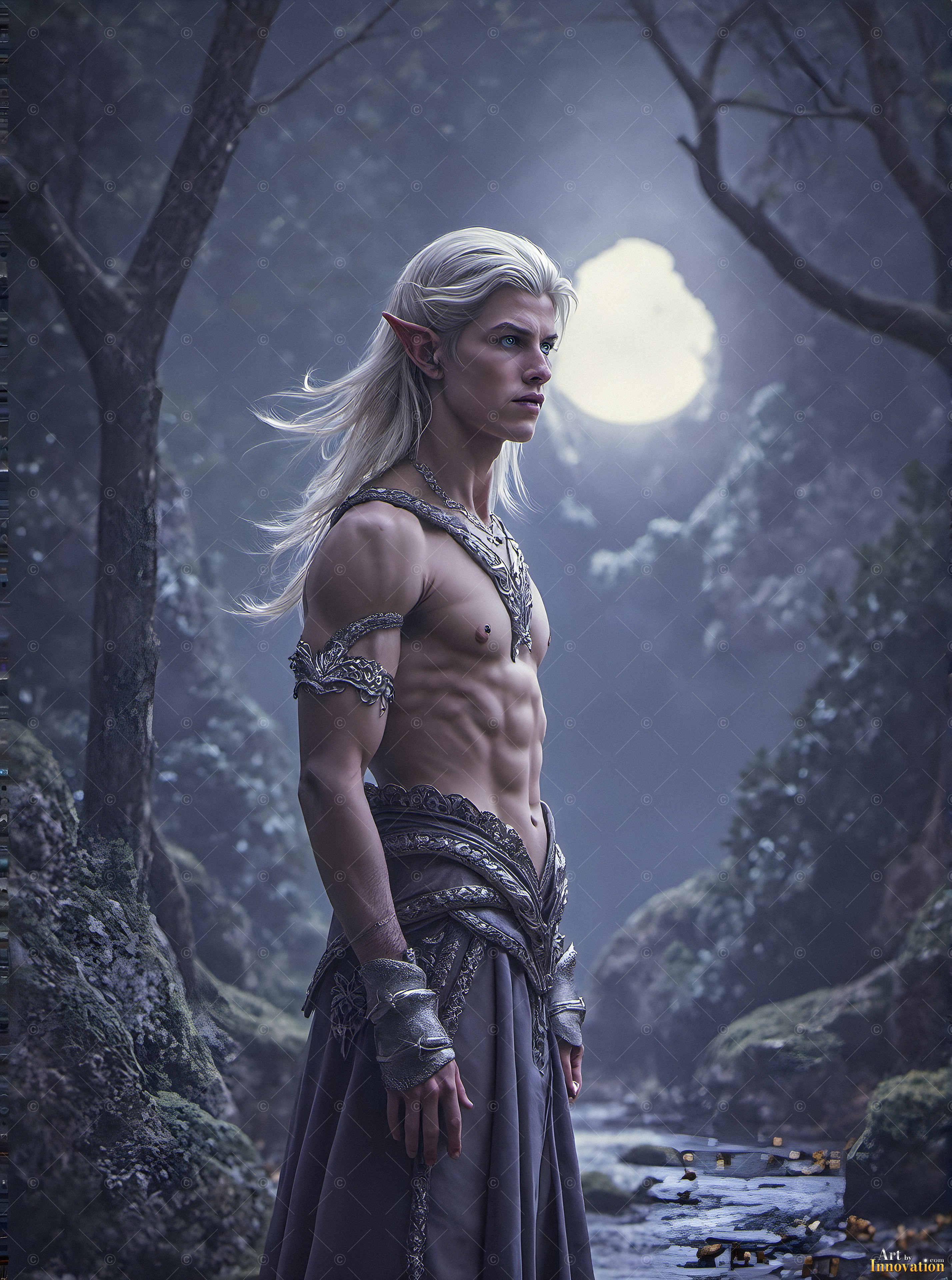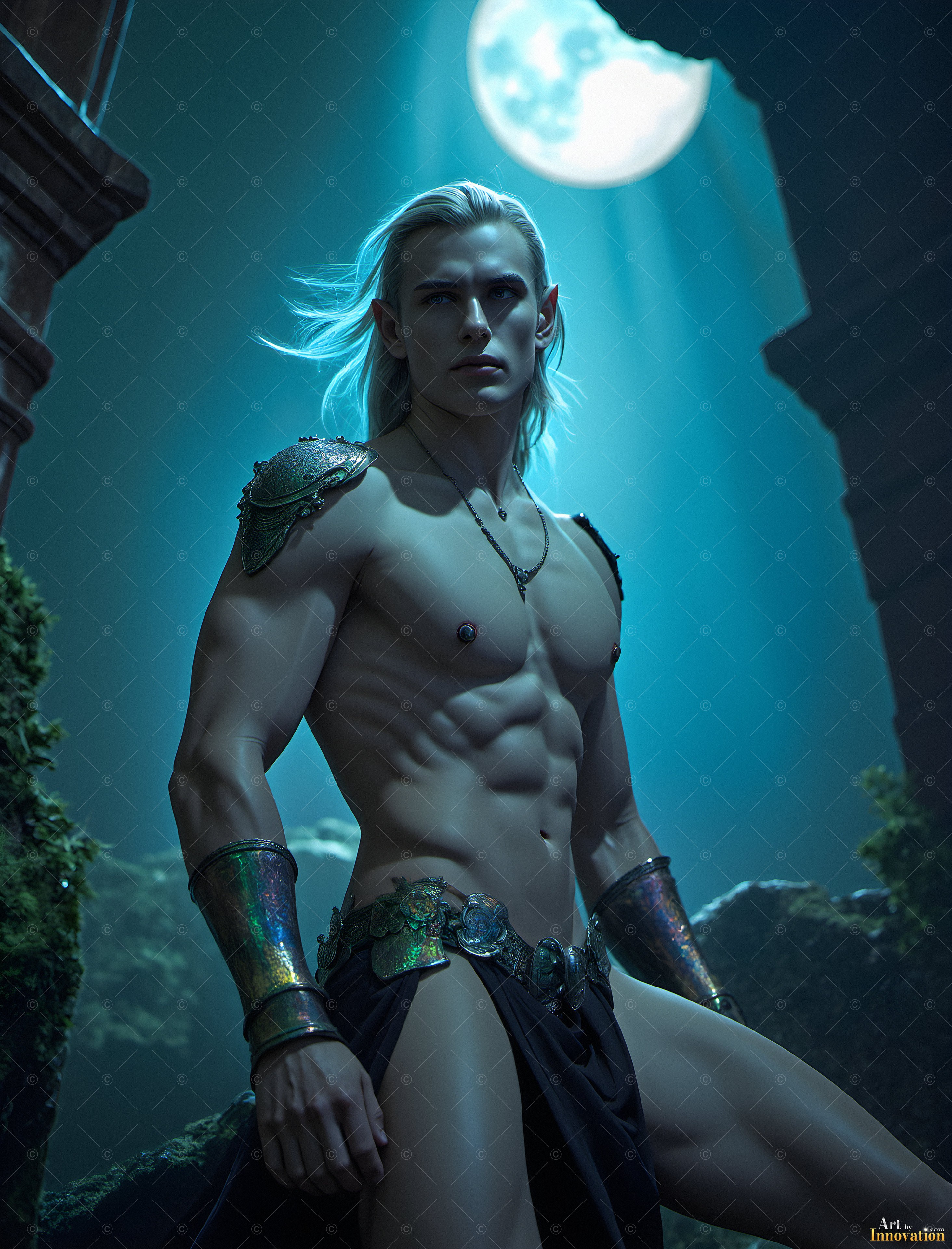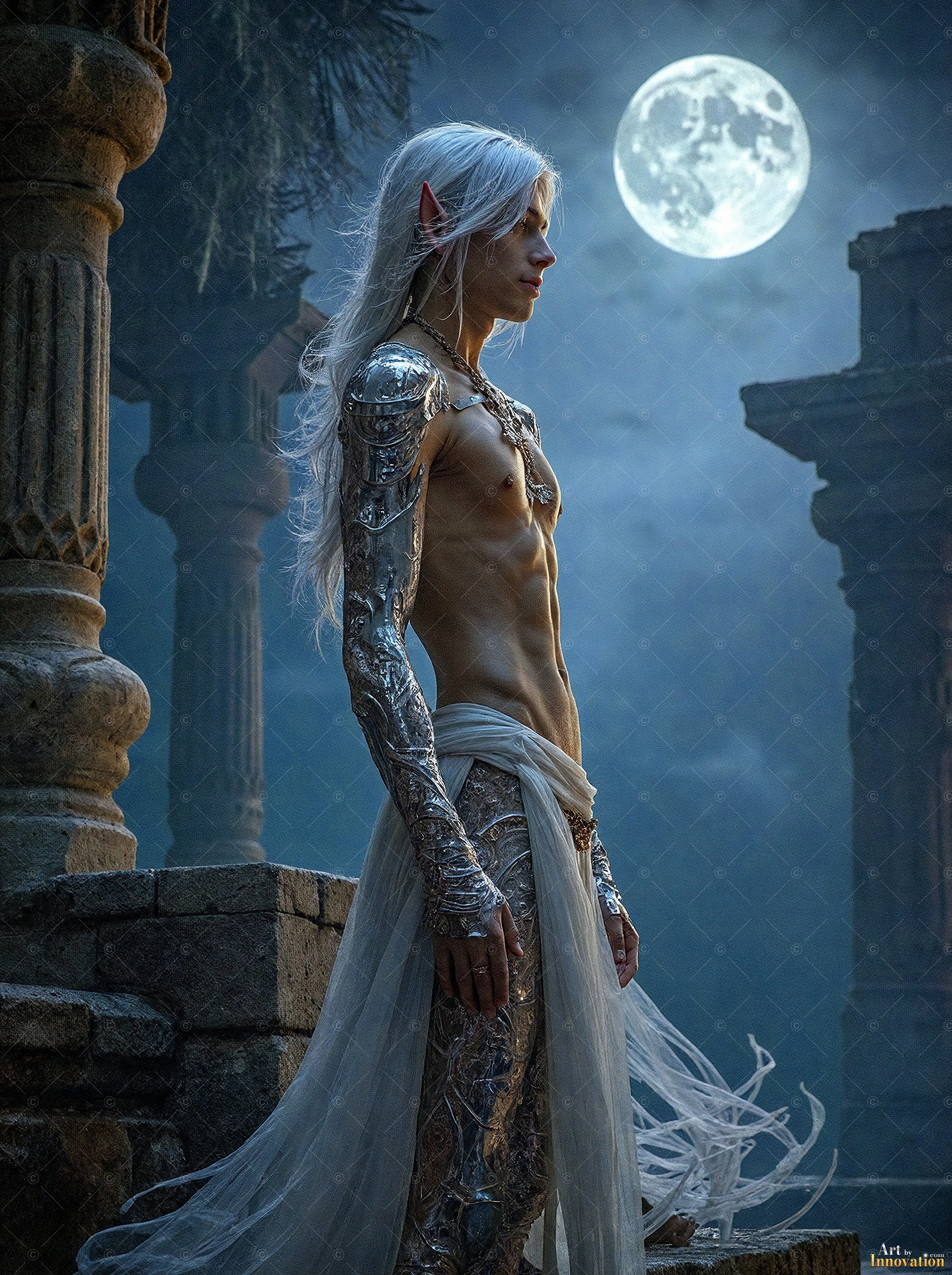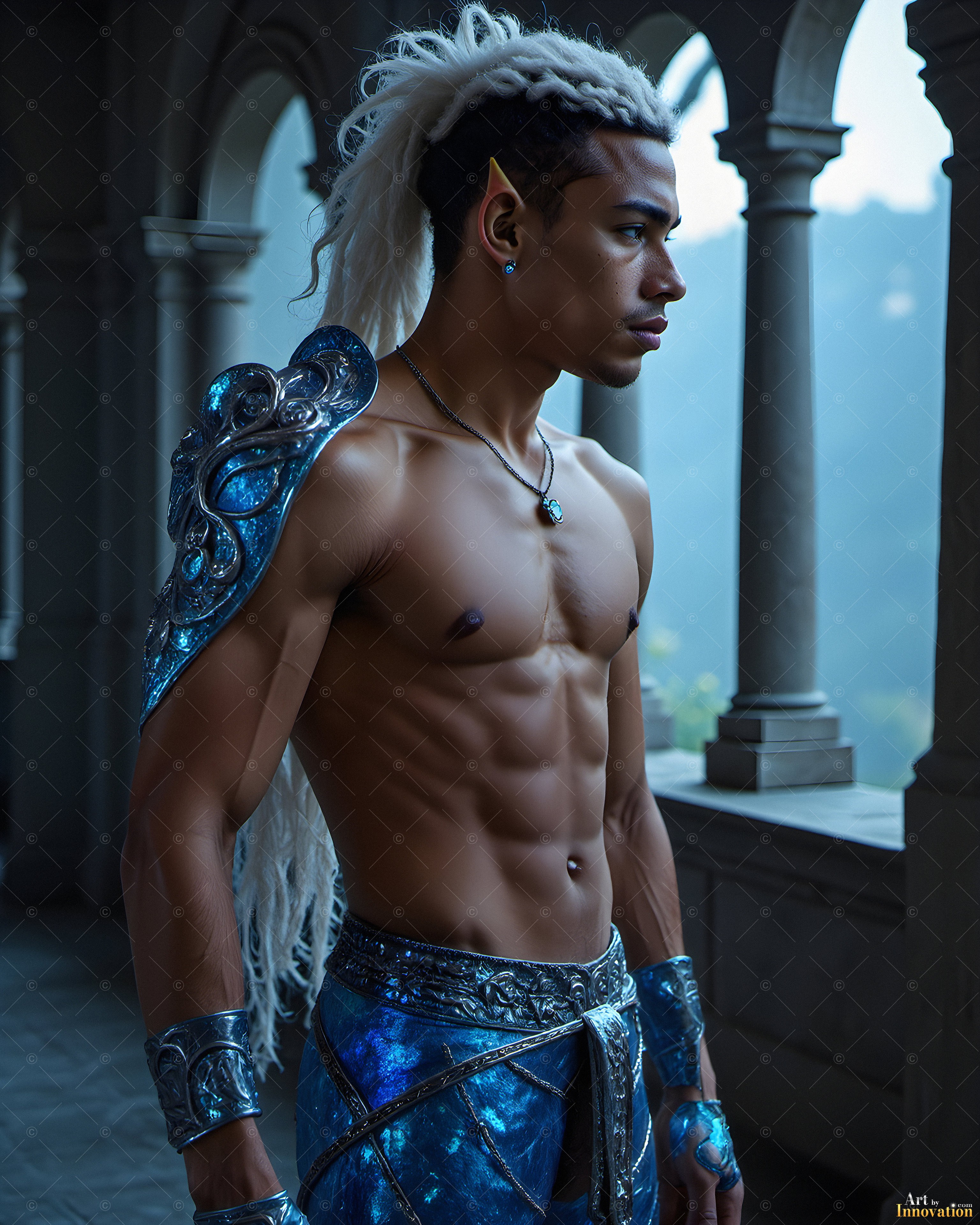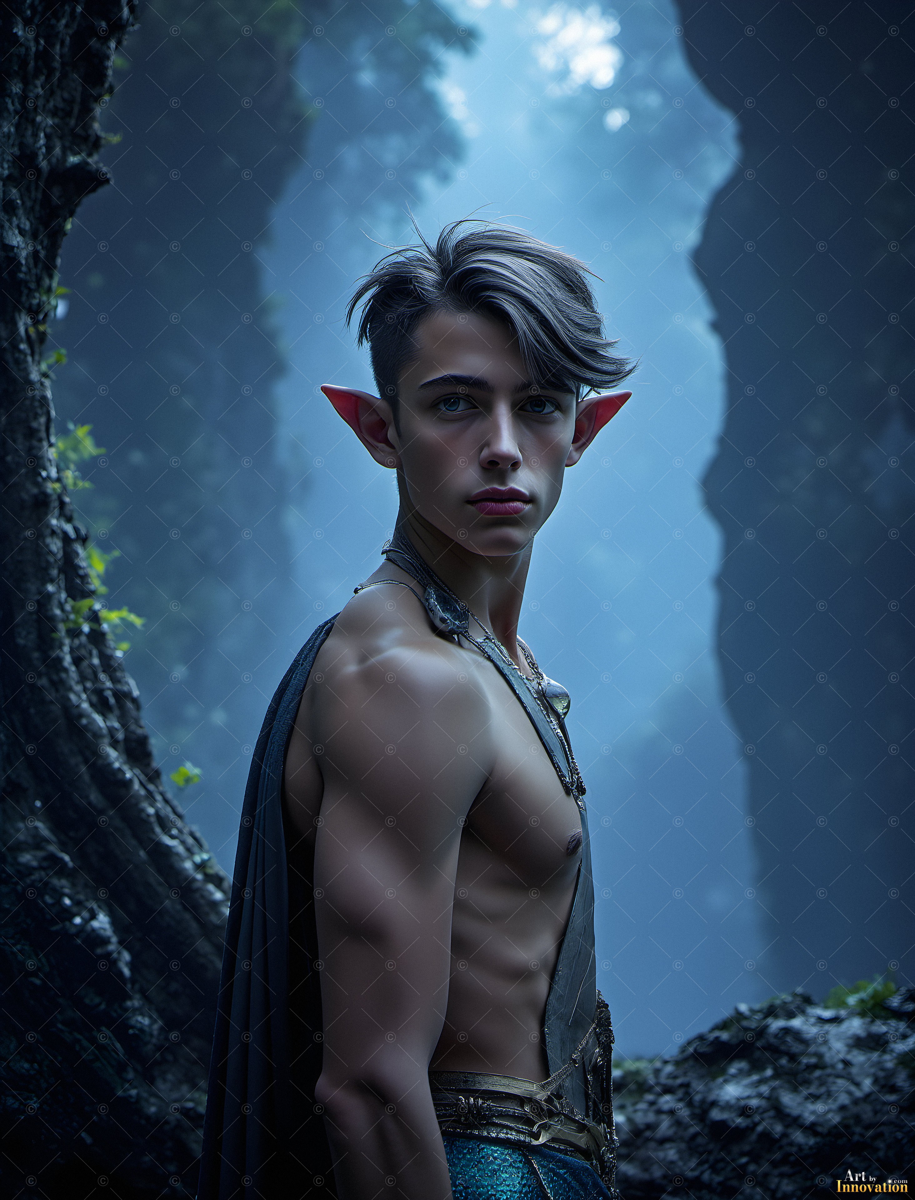 Handsome Male Elves, majestic young male elf standing in an elaborate elven background, in a dark ethereal realm. With pointed ears, wearing glamorous, luxurious, and fierce outfits is an Elven city, full of handsome, and sexy, shirtless elf men, that are adorned with shimmering, iridescent armor.